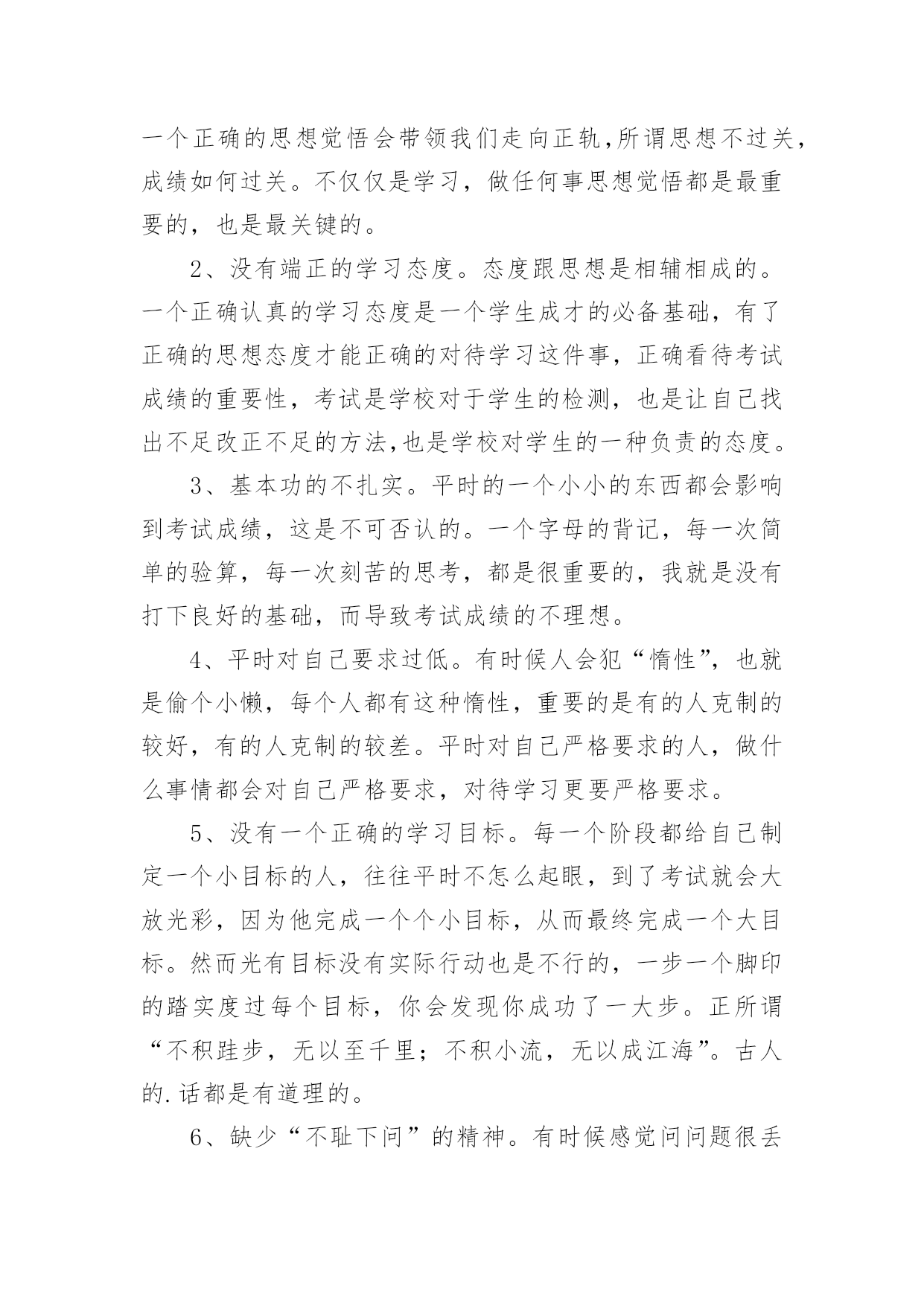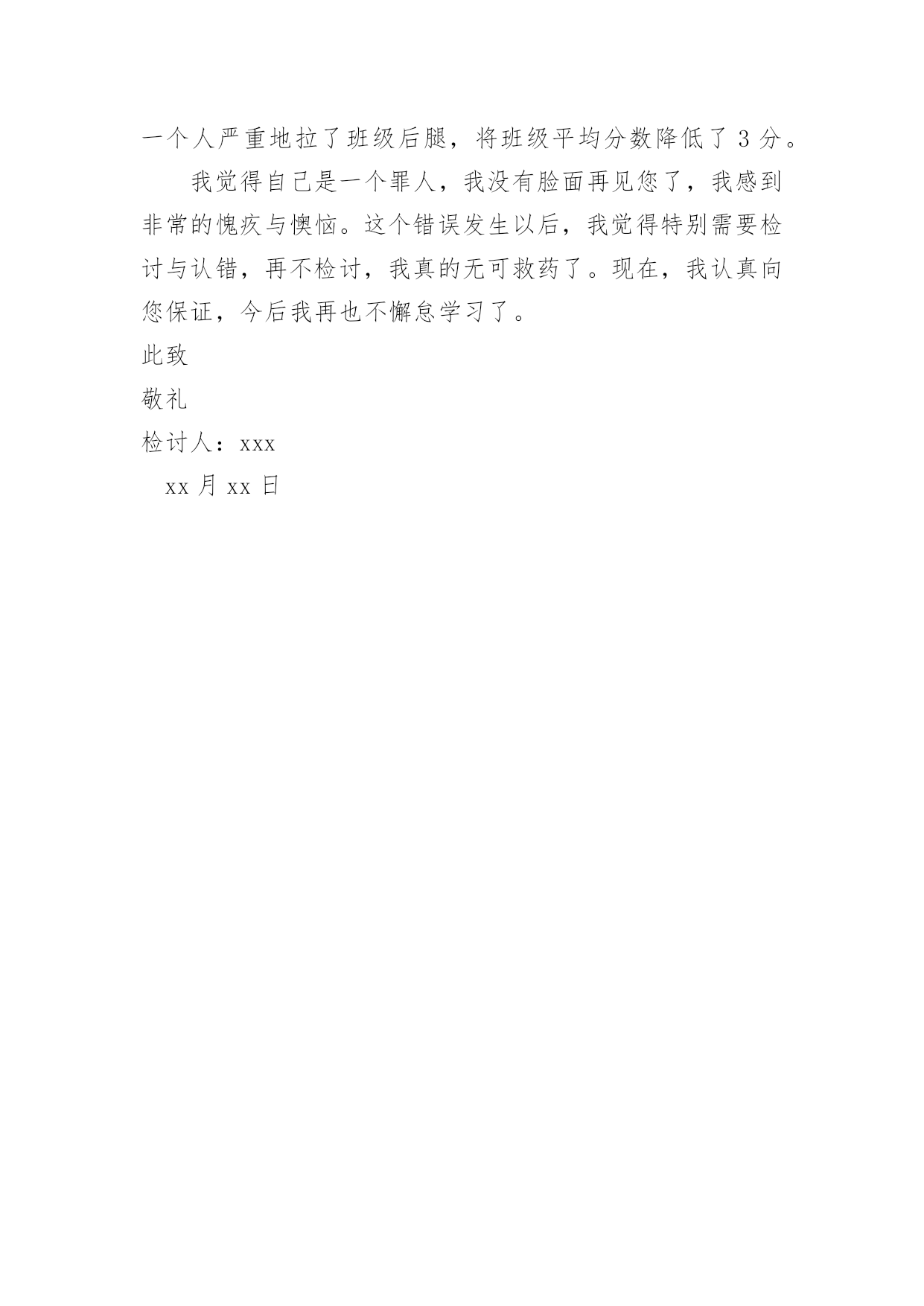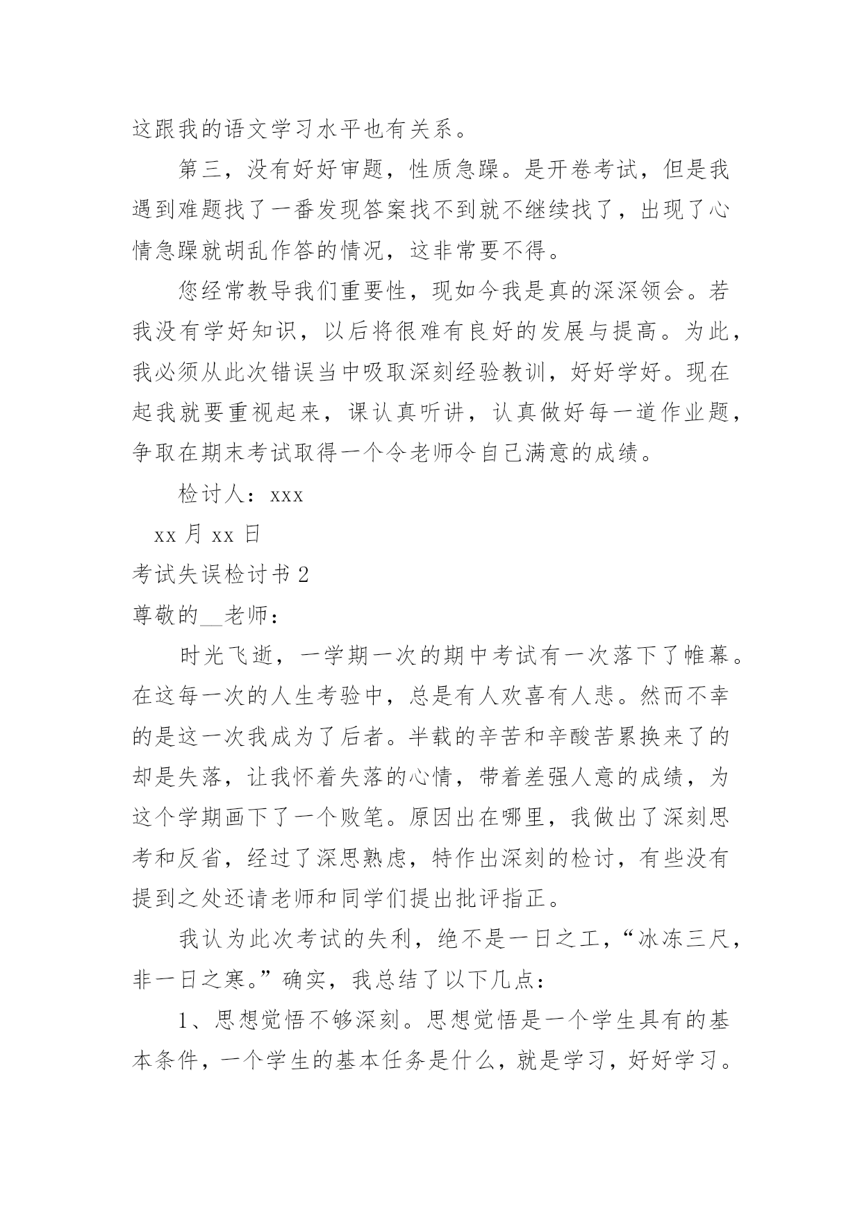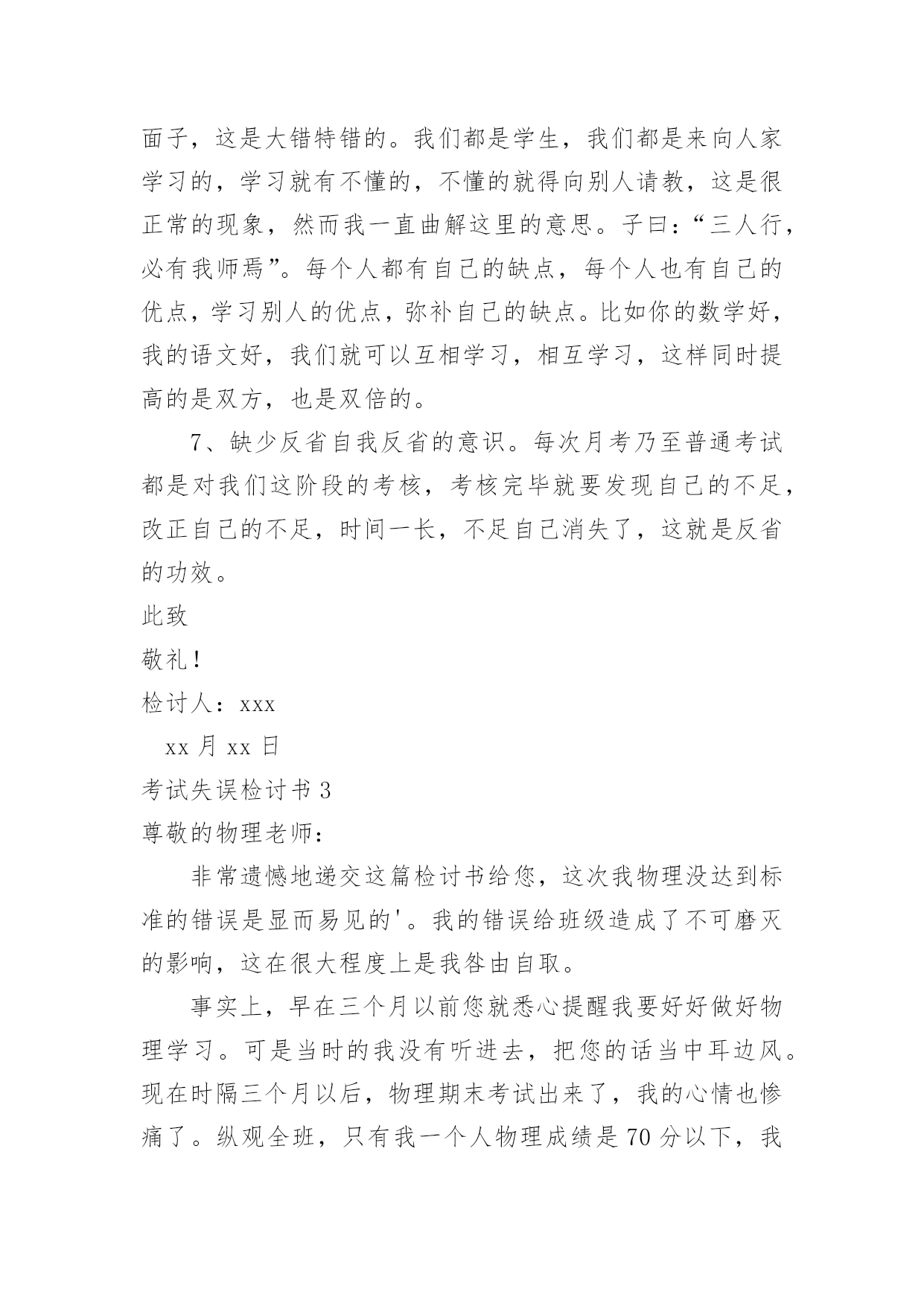 考试失误检讨书考试失误检讨书当我们做某件事,出现了失误后,我们常常被要求写检讨书,以对出现的过错进行反省,请注意写检讨书的心态要端正。来参考自己需要的检讨书吧!以下是小编为大家收集的考试失误检讨书,欢迎大家分享。考试失误检讨书1尊敬的老师:您好!现在我满怀懊悔愧疚的心情向您递交这份检讨书,以深刻反省自身错误。本次期中考试,我的成绩是全班倒数的,严重拉低了班级平均分,我感到难辞其咎,痛苦万分。经过您的批评教育,我对于错误有了深刻反省与认识,也发现了自身之所以没有考好原因:第一,平时没有好好看书,没很好领会知识结构。是一门需要综合知识结构的学科,不是单单背诵一条信息,记住一些知识就可以学好的。虽然我没有足够的时间去“行万里路”,但是目前在学校里好好看书,领会书中知识却是可以的'。第二,缺少足够的语言表达能力。很多答题我都没有把思路很清晰得写出来,这充分说明了我的书面表达能力不强,这跟我的语文学习水平也有关系。第三,没有好好审题,性质急躁。是开卷考试,但是我遇到难题找了一番发现答案找不到就不继续找了,出现了心情急躁就胡乱作答的情况,这非常要不得。您经常教导我们重要性,现如今我是真的深深领会。若我没有学好知识,以后将很难有良好的发展与提高。为此,我必须从此次错误当中吸取深刻经验教训,好好学好。现在起我就要重视起来,课认真听讲,认真做好每一道作业题,争取在期末考试取得一个令老师令自己满意的成绩。检讨人:xxxxx月xx日考试失误检讨书2尊敬的__老师:时光飞逝,一学期一次的期中考试有一次落下了帷幕。在这每一次的人生考验中,总是有人欢喜有人悲。然而不幸的是这一次我成为了后者。半载的辛苦和辛酸苦累换来了的却是失落,让我怀着失落的心情,带着差强人意的成绩,为这个学期画下了一个败笔。原因出在哪里,我做出了深刻思考和反省,经过了深思熟虑,特作出深刻的检讨,有些没有提到之处还请老师和同学们提出批评指正。我认为此次考试的失利,绝不是一日之工,“冰冻三尺,非一日之寒。”确实,我总结了以下几点:1、思想觉悟不够深刻。思想觉悟是一个学生具有的基本条件,一个学生的基本任务是什么,就是学习,好好学习。一个正确的思想觉悟会带领我们走向正轨,所谓思想不过关,成绩如何过关。不仅仅是学习,做任何事思想觉悟都是最重要的,也是最关键的。2、没有端正的学习态度。态度跟思想是相辅相成的。一个正确认真的学习态度是一个学生成才的必备基础,有了正确的思想态度才能正确的对待学习这件事,正确看待考试成绩的重要性,考试是学校对于学生的检测,也是让自己找出不足改正不足的方法,也是学校对学生的一种负责的态度。3、基本功的不扎实。平时的一个小小的东西都会影响到考试成绩,这是不可否认的。一个字母的背记,每一次简单的验算,每一次刻苦的思考,都是很重要的,我就是没有打下良好的基础,而导致考试成绩的不理想。4、平时对自己要求过低。有时候人会犯“惰性”,也就是偷个小懒,每个人都有这种惰性,重要的是有的人克制的较好,有的人克制的较差。平时对自己严格要求的人,做什么事情都会对自己严格要求,对待学习更要严格要求。5、没有一个正确的学习目标。每一个阶段都给自己制定一个小目标的人,往往平时不怎么起眼,到了考试就会大放光彩,因为他完成一个个小目标,从而最终完成一个大目标。然而光有目标没有实际行动也是不行的,一步一个脚印的踏实度过每个目标,你会发现你成功了一大步。正所谓“不积跬步,无以至千里;不积小流,无以成江海”。古人的.话都是有道理的。6、缺少“不耻下问”的精神。有时候感觉问问题很丢面子,这是大错特错的。我们都是学生,我们都是来向人家学习的,学习就有不懂的,不懂的就得向别人请教,这是很正常的现象,然而我一直曲解这里的意思。子曰:“三人行,必有我师焉”。每个人都有自己的缺点,每个人也有自己的优点,学习别人的优点,弥补自己的缺点。比如你的数学好,我的语文好,我们就可以互相学习,相互学习,这样同时提高的是双方,也是双倍的。7、缺少反省自我反省的意识。每次月考乃至普通考试都是对我们这阶段的考核,考核完毕就要发现自己的不足,改正自己的不足,时间一长,不足自己消失了,这就是反省的功效。此致敬礼!检讨人:xxxxx月xx日考试失误检讨书3尊敬的物理老师:非常遗憾地递交这篇检讨书给您,这次我物理没达到标准的错误是显而易见的'。我的错误给班级造成了不可磨灭的影响,这在很大程度上是我咎由自取。事实上,早在三个月以前您就悉心提醒我要好好做好物理学习。可是当时的我没有听进去,把您的话当中耳边风。现在时隔三个月以后,物理期末考试出来了,我的心情也惨痛了。纵观全班,只有我一个人物理成绩是70分以下,我一个人严重地拉了班级后腿,将班级平均分数降低了3分。我觉得自己是一个罪人,我没有脸面再见您了,我感到非常的愧疚与懊恼。这个错误发生以后,我