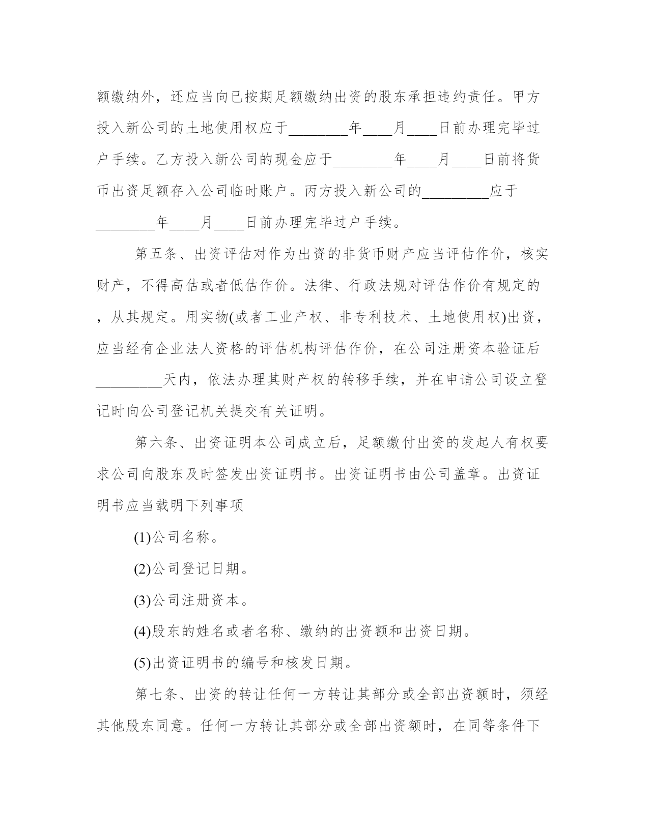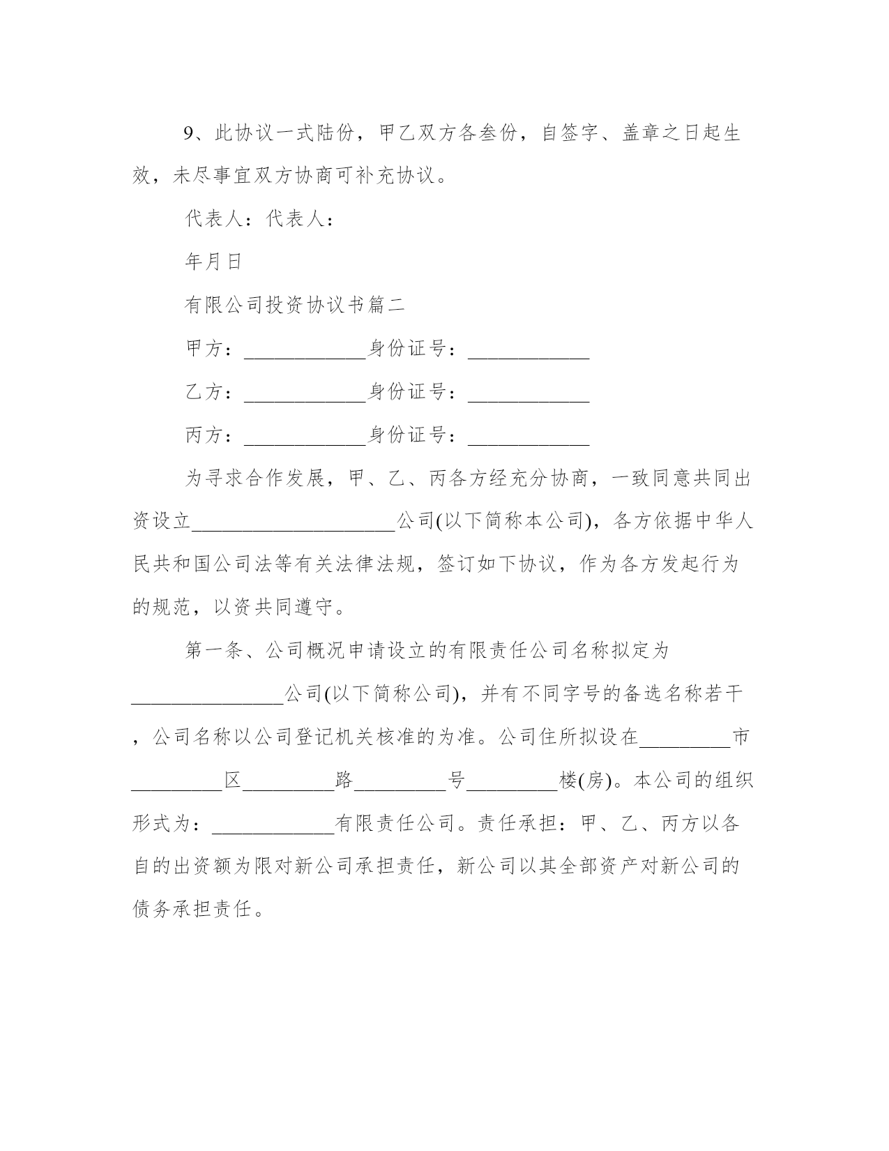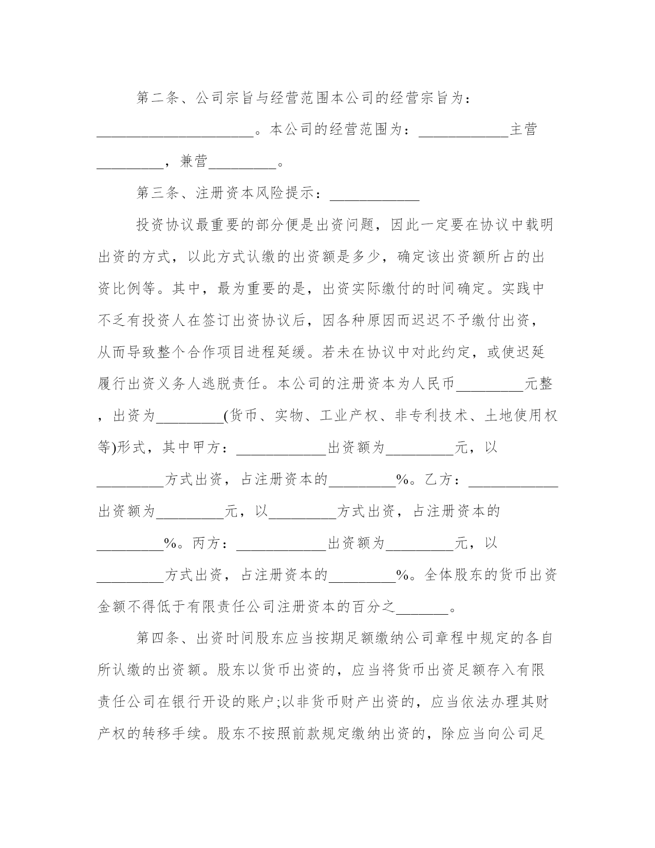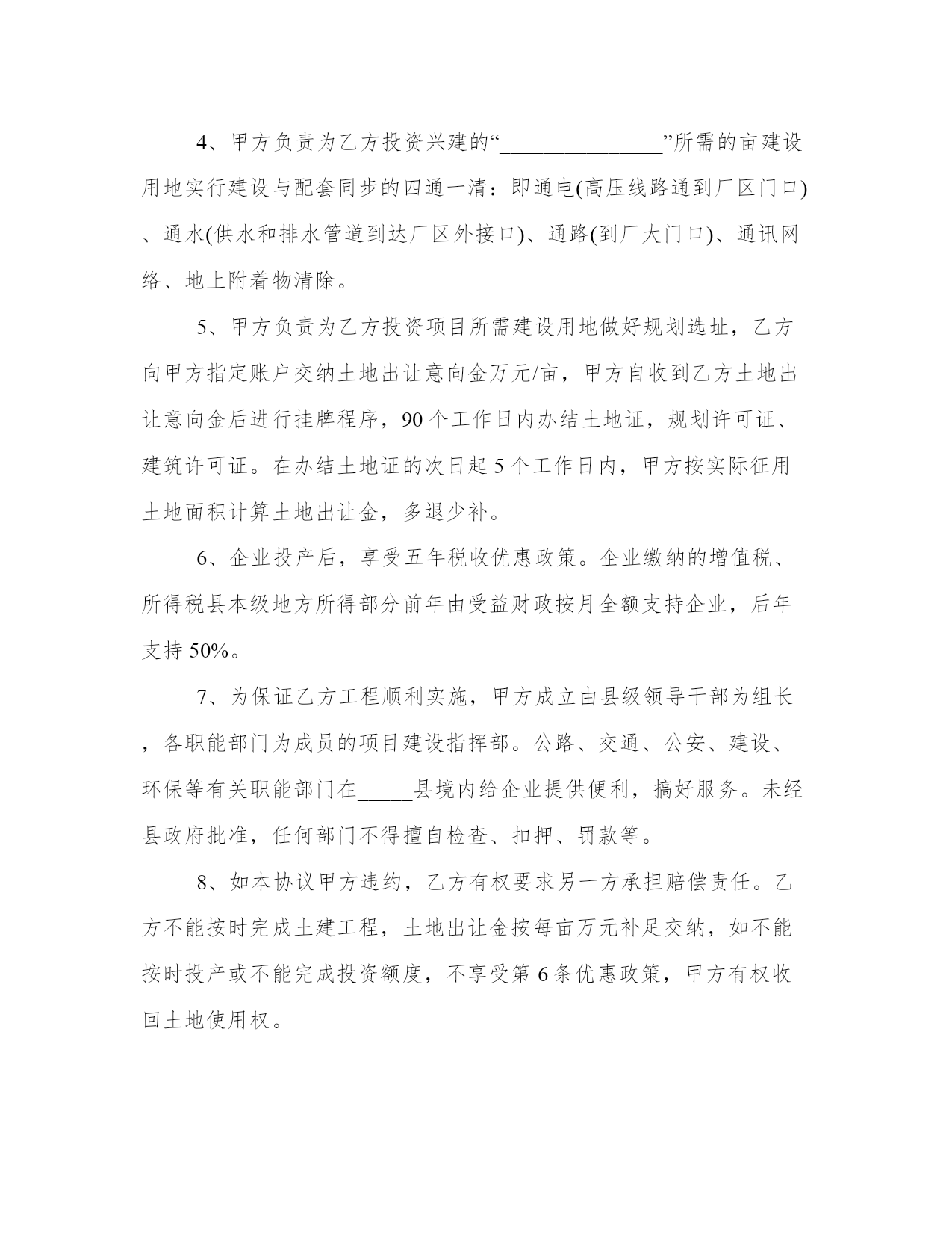 有限公司投资协议书(3篇)在日常学习、工作或生活中,大家总少不了接触作文或者范文吧,通过文章可以把我们那些零零散散的思想,聚集在一块。相信许多人会觉得范文很难写?下面我给大家整理了一些优秀范文,希望能够帮助到大家,我们一起来看一看吧。有限公司投资协议书篇一经甲乙双方友好协商。在平等互惠的基础上,就乙方在_____县产业集聚区兴建“_____”相关事宜,双方达成如下协议:1、乙方在县设立独立法人资格的企业,投资_____万元兴建“__________”,占地_____亩,位于__________,具体面积以实际征地面积为准。预计每年可实现产值_____万元,实现利税_____万元。2、乙方在签订协议后十个工作日内将该地出让意向金_____万元付至甲方指定账户上,乙方取得土地和规划许可、准建等手续后,_____内土建按图纸完工,投产时间为_____。3、乙方投资项目必须符合国家有关产业政策,且投资强度每亩万元以上(即固定资产投资_____万元),基建工程从奠基之日起内完成,建筑密度_____以上,容积率,绿化率15-20%。项目入驻前,乙方需向甲方提供项目的可行性报告、厂区规划设计方案和投资计划书,甲方帮助乙方办理项目环评、立项、工商、税务、机构代码、安全生产、注册登记、报建等手续,费用由乙方承担。4、甲方负责为乙方投资兴建的“_______________”所需的亩建设用地实行建设与配套同步的四通一清:即通电(高压线路通到厂区门口)、通水(供水和排水管道到达厂区外接口)、通路(到厂大门口)、通讯网络、地上附着物清除。5、甲方负责为乙方投资项目所需建设用地做好规划选址,乙方向甲方指定账户交纳土地出让意向金万元/亩,甲方自收到乙方土地出让意向金后进行挂牌程序,90个工作日内办结土地证,规划许可证、建筑许可证。在办结土地证的次日起5个工作日内,甲方按实际征用土地面积计算土地出让金,多退少补。6、企业投产后,享受五年税收优惠政策。企业缴纳的增值税、所得税县本级地方所得部分前年由受益财政按月全额支持企业,后年支持50%。7、为保证乙方工程顺利实施,甲方成立由县级领导干部为组长,各职能部门为成员的项目建设指挥部。公路、交通、公安、建设、环保等有关职能部门在_____县境内给企业提供便利,搞好服务。未经县政府批准,任何部门不得擅自检查、扣押、罚款等。8、如本协议甲方违约,乙方有权要求另一方承担赔偿责任。乙方不能按时完成土建工程,土地出让金按每亩万元补足交纳,如不能按时投产或不能完成投资额度,不享受第6条优惠政策,甲方有权收回土地使用权。9、此协议一式陆份,甲乙双方各叁份,自签字、盖章之日起生效,未尽事宜双方协商可补充协议。代表人:代表人:年月日有限公司投资协议书篇二甲方:____________身份证号:____________乙方:____________身份证号:____________丙方:____________身份证号:____________为寻求合作发展,甲、乙、丙各方经充分协商,一致同意共同出资设立____________________公司(以下简称本公司),各方依据中华人民共和国公司法等有关法律法规,签订如下协议,作为各方发起行为的规范,以资共同遵守。第一条、公司概况申请设立的有限责任公司名称拟定为_______________公司(以下简称公司),并有不同字号的备选名称若干,公司名称以公司登记机关核准的为准。公司住所拟设在_________市_________区_________路_________号_________楼(房)。本公司的组织形式为:____________有限责任公司。责任承担:甲、乙、丙方以各自的出资额为限对新公司承担责任,新公司以其全部资产对新公司的债务承担责任。第二条、公司宗旨与经营范围本公司的经营宗旨为:_____________________。本公司的经营范围为:____________主营_________,兼营_________。第三条、注册资本风险提示:____________投资协议最重要的部分便是出资问题,因此一定要在协议中载明出资的方式,以此方式认缴的出资额是多少,确定该出资额所占的出资比例等。其中,最为重要的是,出资实际缴付的时间确定。实践中不乏有投资人在签订出资协议后,因各种原因而迟迟不予缴付出资,从而导致整个合作项目进程延缓。若未在协议中对此约定,或使迟延履行出资义务人逃脱责任。本公司的注册资本为人民币_________元整,出资为_________(货币、实物、工业产权、非专利技术、土地使用权等)形式,其中甲方:____________出资额为_________元,以_________方式出资,占注册资本的_________%