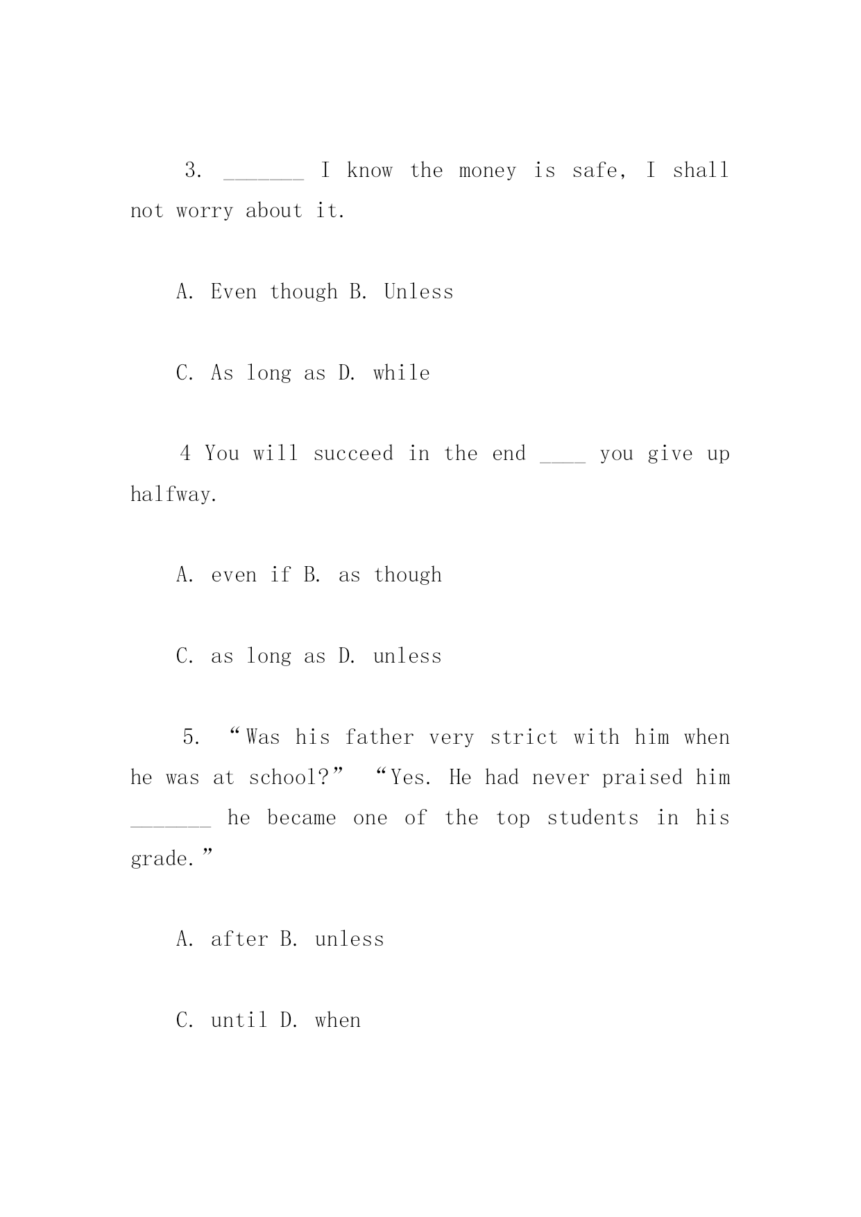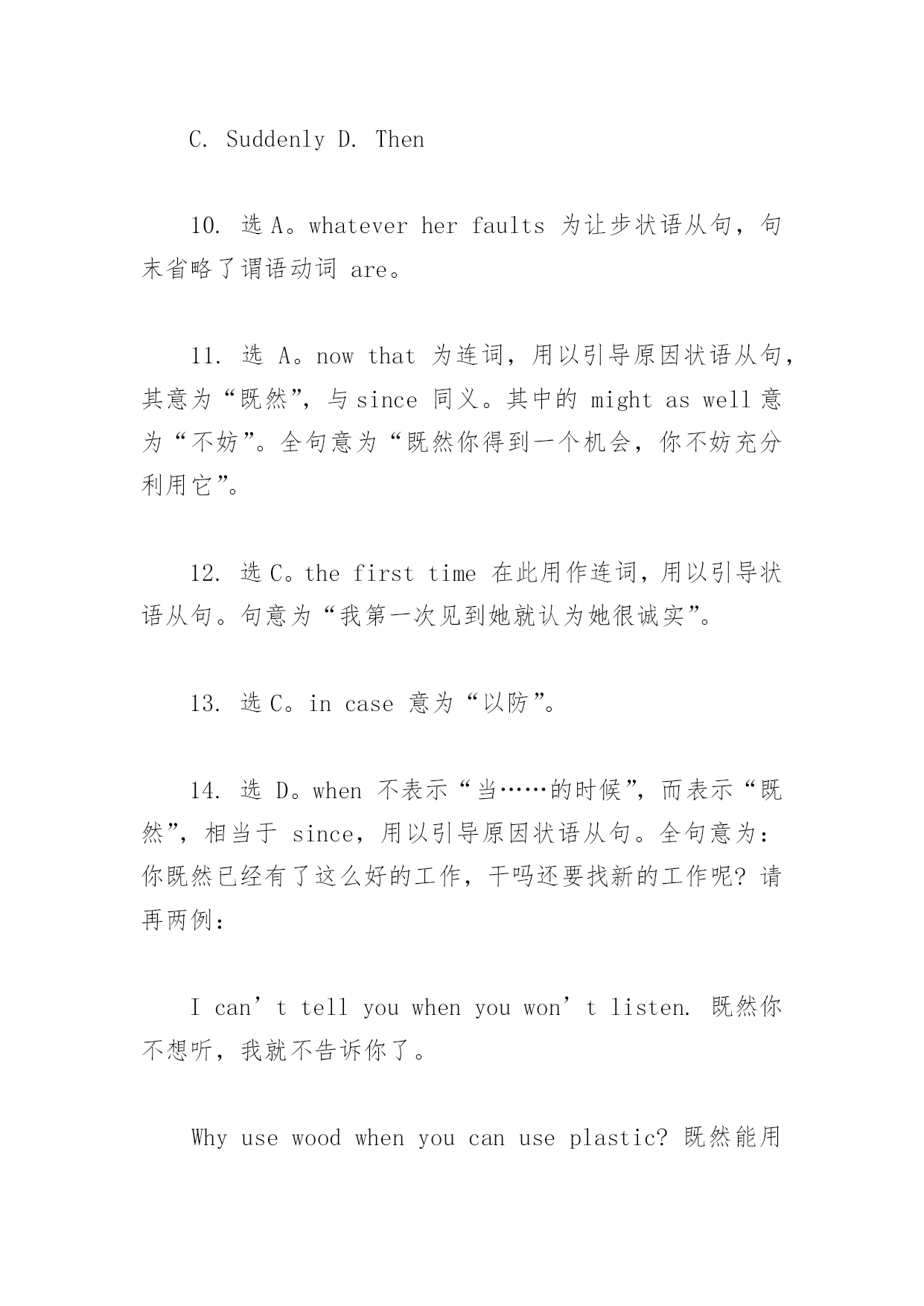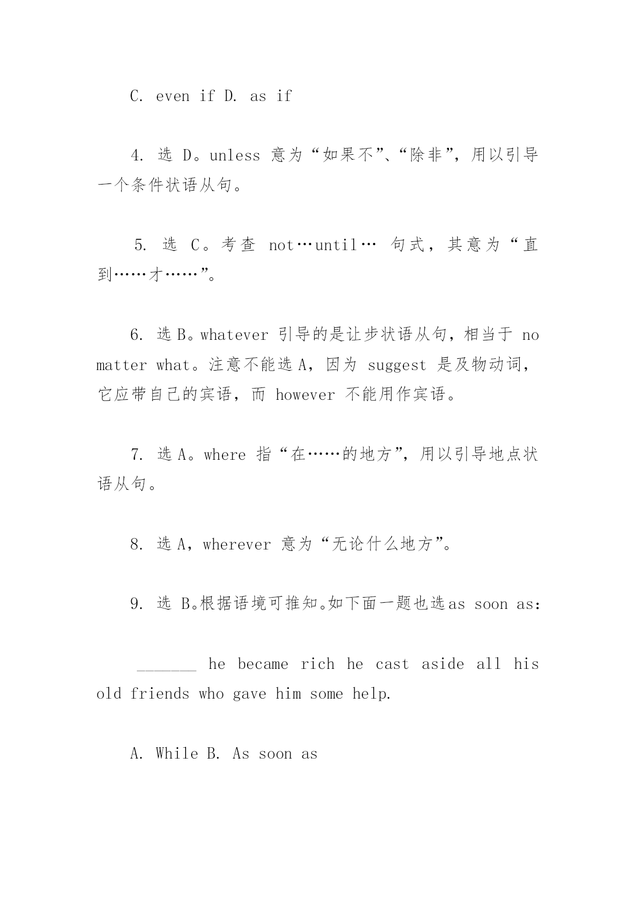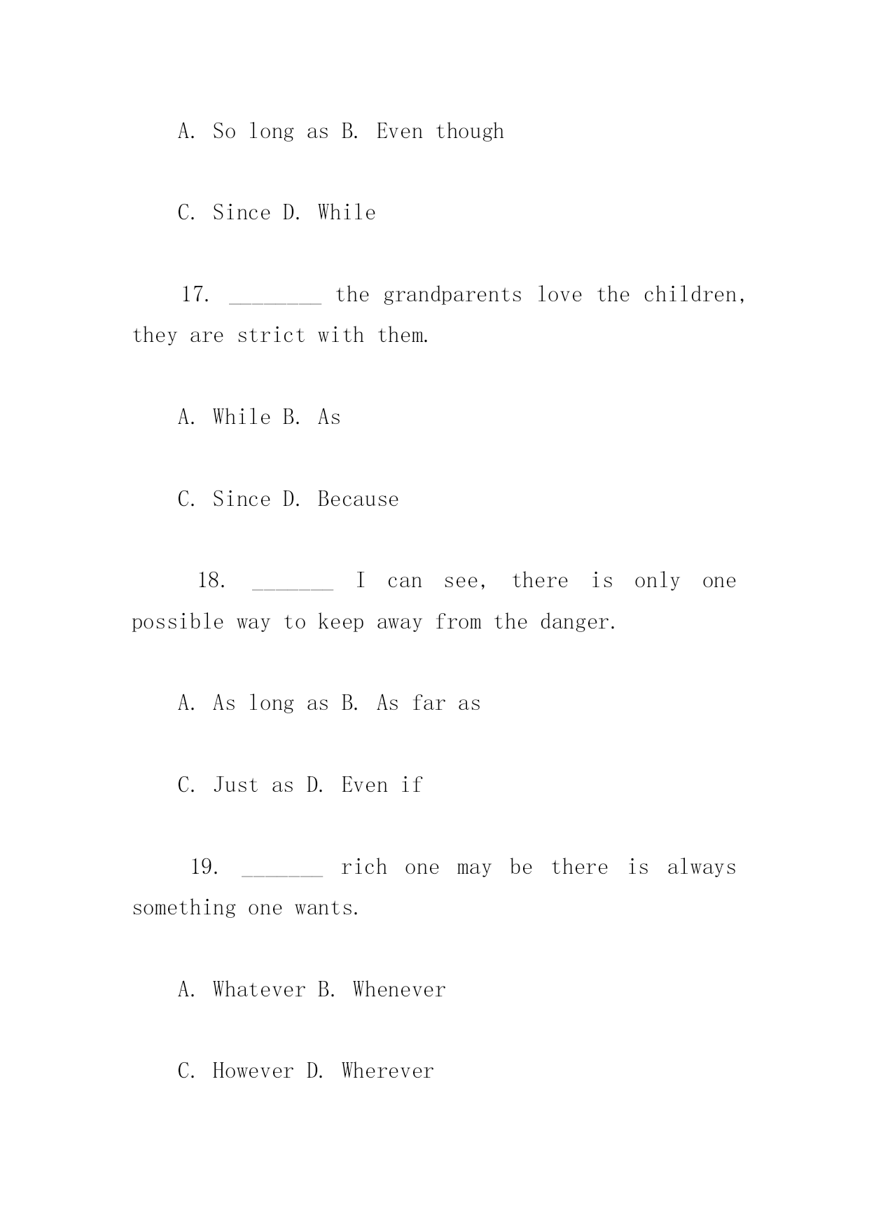 高考易错题名师指导:状语从句陷阱题2014高考易错题名师指导:状语从句陷阱题导语:距离2014年高考只有一个月的时间了,此时考生们不应再大量进行试题训练,要抓紧剩下的时间查漏补缺,把易错题、陷阱题掌握全面。英语网小编为考生们整理了2014高考易错题名师指导:状语从句陷阱题,希望有助于大家备考。◆精编陷阱题训练◆1.Don’tbeafraidofaskingforhelp_______itisneeded.A.unlessB.sinceC.althoughD.when2.Agoodstorytellermustbeabletoholdhislisteners’curiosity________hereachestheendofthestory.A.whenB.unlessC.afterD.until3._______Iknowthemoneyissafe,Ishallnotworryaboutit.A.EventhoughB.UnlessC.AslongasD.while4Youwillsucceedintheend____yougiveuphalfway.A.evenifB.asthoughC.aslongasD.unless5.“Washisfatherverystrictwithhimwhenhewasatschool?”“Yes.Hehadneverpraisedhim_______hebecameoneofthetopstudentsinhisgrade.”A.afterB.unlessC.untilD.when6._____Isuggest,healwaysdisagrees.A.HoweverB.WhateverC.WhicheverD.Whoever7.Youshouldputonthenotices______allthepeoplemayseethem.A.whereB.inwhichC.atD.forthem8._____shegoes,therearecrowdsofpeoplewaitingtoseeher.A.WhereverB.HoweverC.WhicheverD.Whoever9.Maryclappedherhandoverhermouth_______sherealizedwhatshehadsaid.A.whileB.assoonasC.suddenlyD.then10.________herfaults,she’sArnold’smother.Don’tbesorudetoher.A.WhateverB.WhatC.WhicheverD.Whenever11.____you’regotachance,youmightaswellmakefulluseofit.A.NowthatB.AfterC.AlthoughD.Assoonas12.IthoughtshewastheverygirlthatIshouldmarry_______Imether.A.firsttimeB.forthefirsttimeC.thefirsttimeD.bythefirsttime13.Don’tplaybytheriver_______youfallinanddrown!A.incaseB.sothatC.inorderthatD.when14.Whydoyouwantanewjob____you’vegotsuchagoodonealready?A.thatB.whereC.whichD.when15.Heisbetterthan_______Ilastvisitedhim.A.whenB.thatC.howD.which16._______thepunishmentwasunjust,heaccepteditwithoutcomplaint.A.SolongasB.EventhoughC.SinceD.While17.________thegrandparentslovethechildren,theyarestrictwiththem.A.WhileB.AsC.SinceD.Because18._______Icansee,thereisonlyonepossiblewaytokeepawayfromthedanger.A.AslongasB.AsfarasC.JustasD.Evenif19._______richonemaybethereisalwayssomethingonewants.A.WhateverB.WheneverC.HoweverD.Wherever20.Johnshuteverybodyoutofthekitchen_______hecouldpreparehisgrandsu