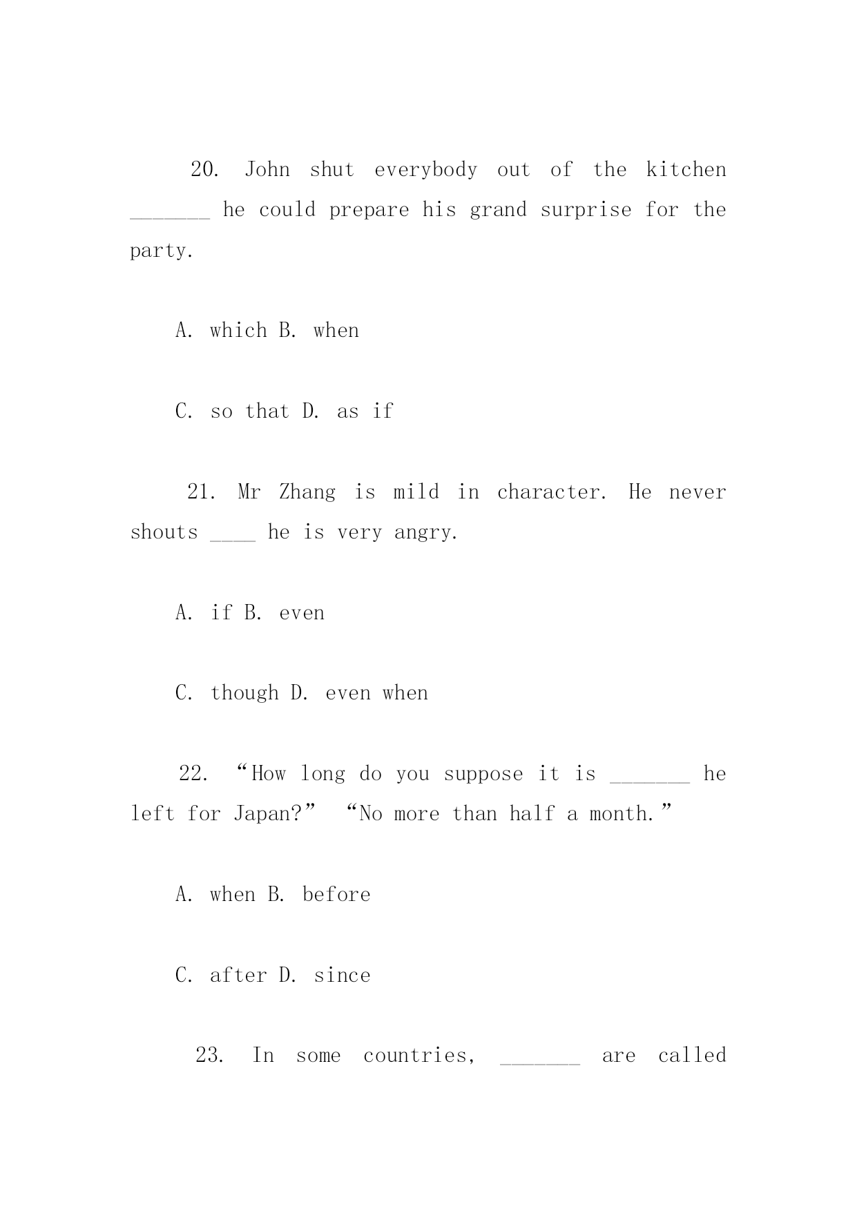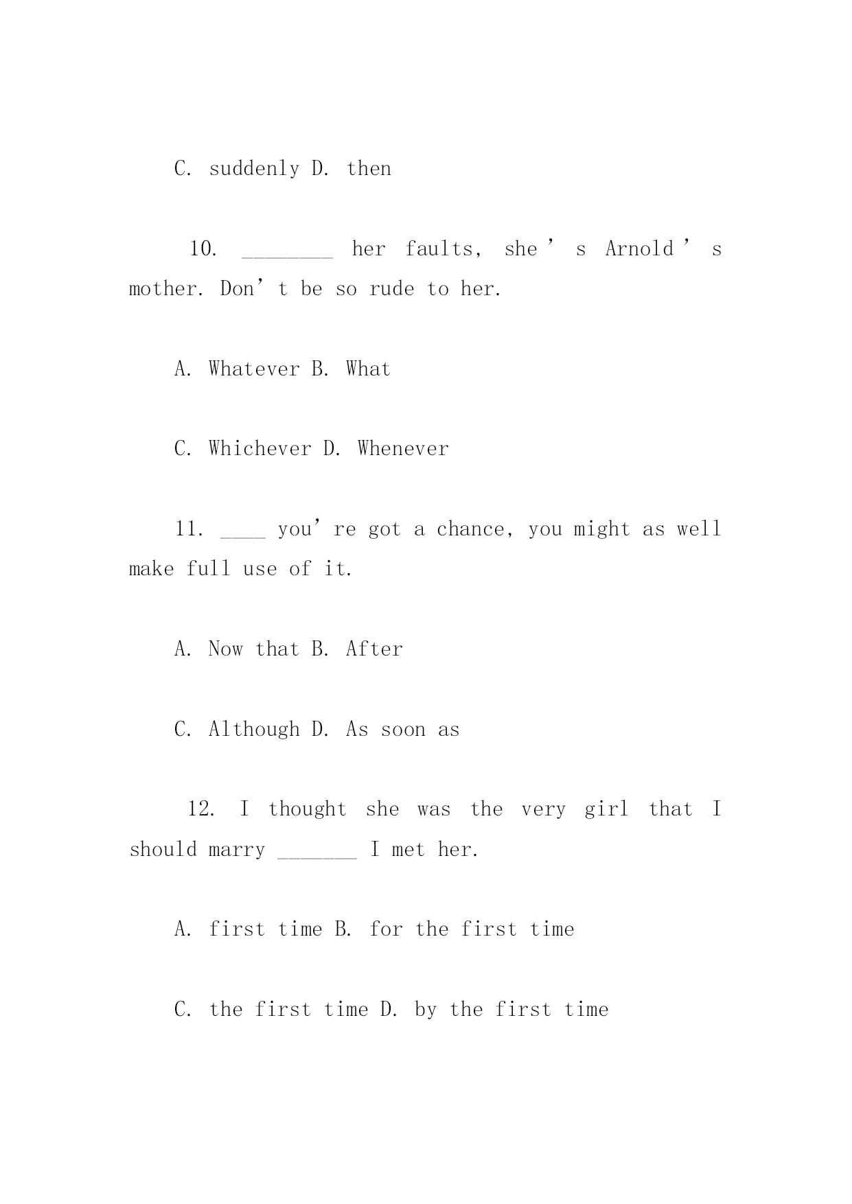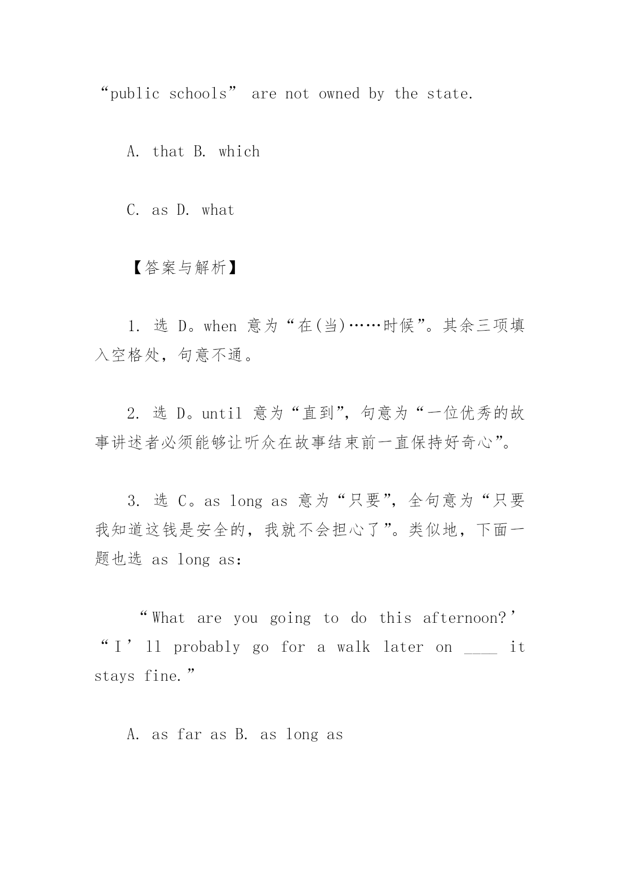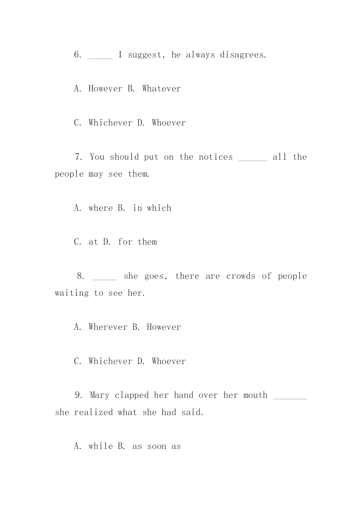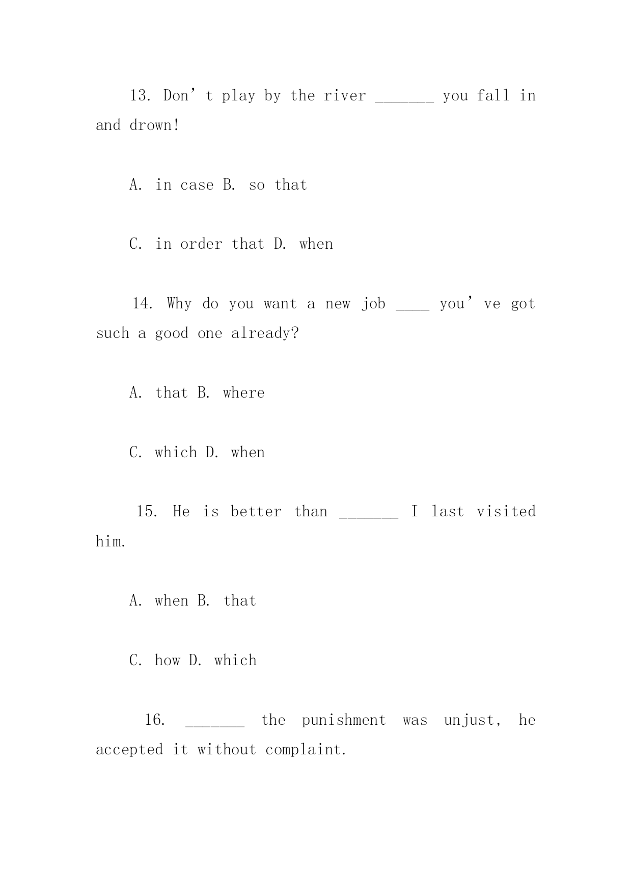 高考易错题名师指导:状语从句陷阱题2014高考易错题名师指导:状语从句陷阱题导语:距离2014年高考只有一个月的时间了,此时考生们不应再大量进行试题训练,要抓紧剩下的时间查漏补缺,把易错题、陷阱题掌握全面。英语网小编为考生们整理了2014高考易错题名师指导:状语从句陷阱题,希望有助于大家备考。◆精编陷阱题训练◆1.Don’tbeafraidofaskingforhelp_______itisneeded.A.unlessB.sinceC.althoughD.when2.Agoodstorytellermustbeabletoholdhislisteners’curiosity________hereachestheendofthestory.A.whenB.unlessC.afterD.until3._______Iknowthemoneyissafe,Ishallnotworryaboutit.A.EventhoughB.UnlessC.AslongasD.while4Youwillsucceedintheend____yougiveuphalfway.A.evenifB.asthoughC.aslongasD.unless5.“Washisfatherverystrictwithhimwhenhewasatschool?”“Yes.Hehadneverpraisedhim_______hebecameoneofthetopstudentsinhisgrade.”A.afterB.unlessC.untilD.when6._____Isuggest,healwaysdisagrees.A.HoweverB.WhateverC.WhicheverD.Whoever7.Youshouldputonthenotices______allthepeoplemayseethem.A.whereB.inwhichC.atD.forthem8._____shegoes,therearecrowdsofpeoplewaitingtoseeher.A.WhereverB.HoweverC.WhicheverD.Whoever9.Maryclappedherhandoverhermouth_______sherealizedwhatshehadsaid.A.whileB.assoonasC.suddenlyD.then10.________herfaults,she’sArnold’smother.Don’tbesorudetoher.A.WhateverB.WhatC.WhicheverD.Whenever11.____you’regotachance,youmightaswellmakefulluseofit.A.NowthatB.AfterC.AlthoughD.Assoonas12.IthoughtshewastheverygirlthatIshouldmarry_______Imether.A.firsttimeB.forthefirsttimeC.thefirsttimeD.bythefirsttime13.Don’tplaybytheriver_______youfallinanddrown!A.incaseB.sothatC.inorderthatD.when14.Whydoyouwantanewjob____you’vegotsuchagoodonealready?A.thatB.whereC.whichD.when15.Heisbetterthan_______Ilastvisitedhim.A.whenB.thatC.howD.which16._______thepunishmentwasunjust,heaccepteditwithoutcomplaint.A.SolongasB.EventhoughC.SinceD.While17.________thegrandparentslovethechildren,theyarestrictwiththem.A.WhileB.AsC.SinceD.Because18._______Icansee,thereisonlyonepossiblewaytokeepawayfromthedanger.A.AslongasB.AsfarasC.JustasD.Evenif19._______richonemaybethereisalwayssomethingonewants.A.WhateverB.WheneverC.HoweverD.Wherever20.Johnshuteverybodyoutofthekitchen_______hecouldpreparehisgrandsu