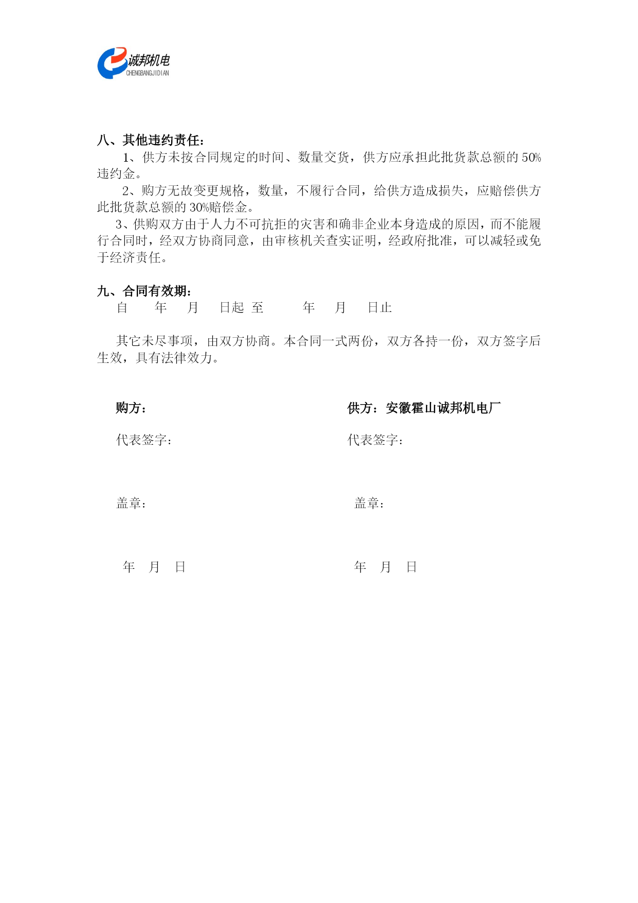 安徽霍山诚邦机电厂产品销售合同合同编号:购方:供方:安徽霍山诚邦机电厂一、合同目的:供、购双方本着诚实守信的原则,为了方便以后顺利合作,经双方友好协商,特签订本合同。二、供货品种、数量、价格等编号产品名称规格型号单位数量单价金额1麻将机变压器2备注按购方传真订单合计人民币:(元)大写:整注:以上产品价格含17%增值税.三、订货方式:购方向供方下达正式订单,订单方式为传真方式或其他文字方式,购方需标明产品品种、规格型号、数量、交货日期等。四、交货时间:自接到购方订单十日内送达。五、交货(运输)办法及地点:托运至购方公司或指定地点。六、货款结算方式及限期:七、质量责任:1、供方出品的产品,质量保质期为三年,在三年之内出现任何质量问题,可免费退换。2、供方出品的产品保障合格率为99.7%,如因供方因素造成合格率低于此指标,供方承诺“坏一赔三”。八、其他违约责任:1、供方未按合同规定的时间、数量交货,供方应承担此批货款总额的50%违约金。2、购方无故变更规格,数量,不履行合同,给供方造成损失,应赔偿供方此批货款总额的30%赔偿金。3、供购双方由于人力不可抗拒的灾害和确非企业本身造成的原因,而不能履行合同时,经双方协商同意,由审核机关查实证明,经政府批准,可以减轻或免于经济责任。九、合同有效期:自年月日起至年月日止其它未尽事项,由双方协商。本合同一式两份,双方各持一份,双方签字后生效,具有法律效力。购方:供方:安徽霍山诚邦机电厂代表签字:代表签字:盖章:盖章:年月日年月日
