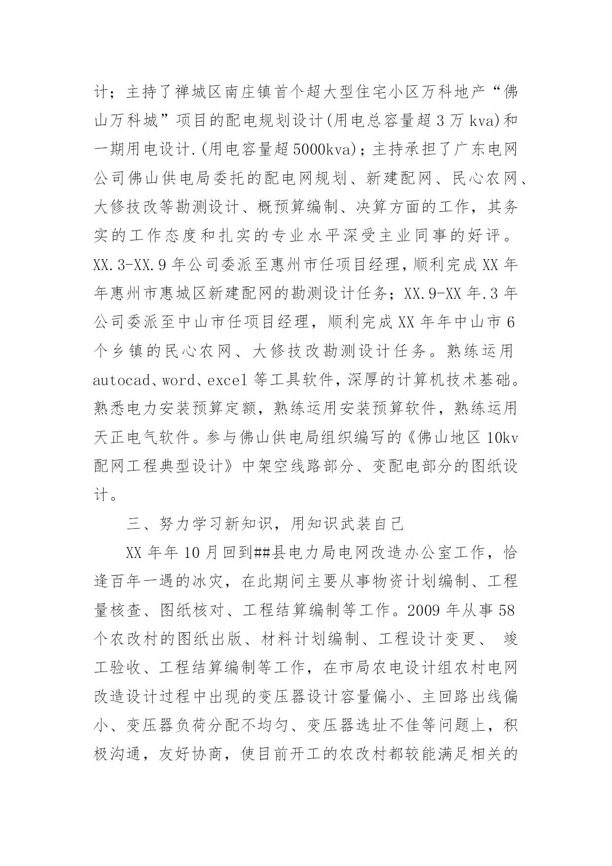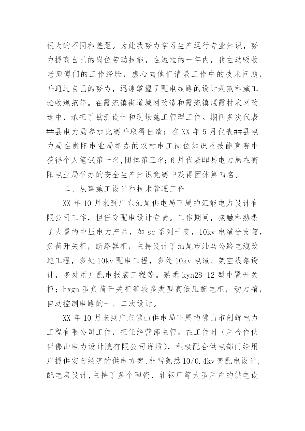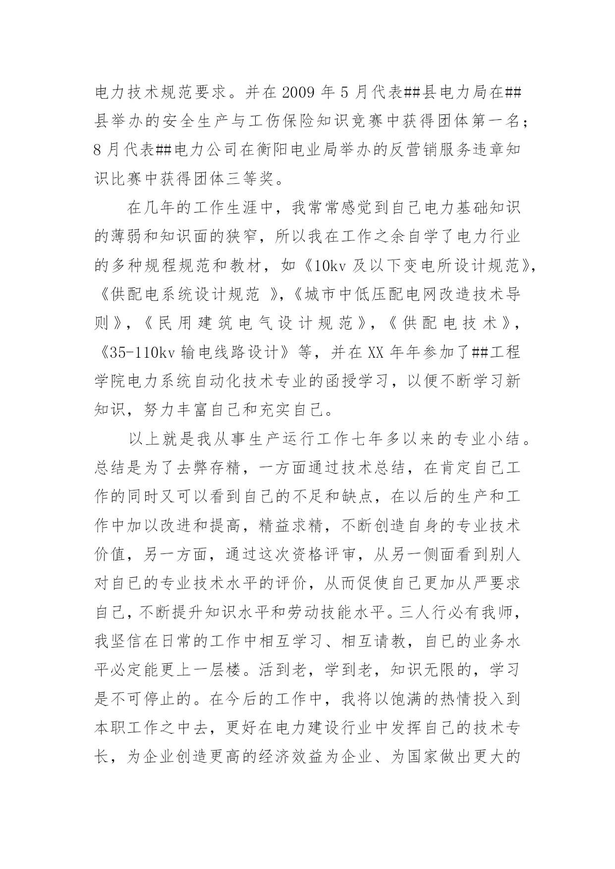 电力生产运行岗位技能技术管理的个人工作总结电力生产运行岗位技能技术管理的个人工作总结电力生产运行岗位技能技术管理个人工作总结,这篇文章由成功励志网收集整理,有时候一篇文章,一个故事就能让人的一生改变,希望有关于电力生产运行岗位技能技术管理个人工作总结的这篇文章能对您有所帮助!本人于1999年7月从##电力学院电力系统及其自动化专业毕业,在XX年8月进入##县供电公司参加工作至今。在这7年中,我先后在电力公司的草市供电所、霞流供电所、网改办从事生产一线工作(其中XX.10-XX年.10期间停薪留职,分别在##公司##供电局下属的##市汇能电力设计有限公司和佛山供电局下属的##市##电力工程有限公司工作)。在各位领导和同事的支持和帮助下,自己的思想、工作、学习等各方面都取得了一定的成绩,个人综合素质也得到了一定的提高,下面就从专业技术角度对我这7年来的工作做一次全面总结:一、学习生产运行专业知识,提高岗位劳动技能从XX年参加工作,领导为了让我尽快转变角色,熟悉工作环境,适应生产要求,我先后被分配至供电公司下属的草市供电所和霞流供电所从事线路架设和检修、抄表核收等工作。工作伊始,我发现学校里学到的专业知识同生产实际有很大的不同和差距。为此我努力学习生产运行专业知识,努力提高自己的岗位劳动技能,在短短的一年内,我主动吸收老师傅们的工作经验,虚心向他们请教工作中的技术问题,并通过自己的努力,迅速掌握了配电线路的设计规范和施工验收规范等。在霞流镇街道城网改造和霞流镇堰霞村农网改造中,承担了勘测设计和现场施工管理工作。期间多次代表##县电力局参加比赛并取得佳绩:在XX年5月代表##县电力局在衡阳电业局举办的农村电工岗位知识及技能竞赛中获得个人笔试第一名,团体第三名;6月代表##县电力局在衡阳电业局举办的安全生产知识竞赛中获得团体第四名。二、从事施工设计和技术管理工作XX年10月来到广东汕尾供电局下属的汇能电力设计有限公司工作,担任变配电设计专责。工作期间,接触和熟悉了大量的中压电力产品,如sc系列干变,10kv电缆分支箱,负荷开关柜,断路器柜,主持设计了汕尾市汕马公路电缆改造工程,多处10kv配电工程,多处10kv电缆、架空线路设计,多处用户配电报装工程等。熟悉kyn28-12型中置开关柜;hxgn型负荷开关柜等较多类型高低压配电柜,动力箱,自动控制电路的一、二次设计。XX年10月来到广东佛山供电局下属的佛山市创辉电力工程有限公司工作,担任经营部主管。在工作时(用合作伙伴佛山电力设计院有限公司资质),积极配合供电部门给用户提供安全经济的供电方案,非常熟悉10/0.4kv变配电设计,配电房设计,主持了多个陶瓷、轧钢厂等大型用户的供电设计;主持了禅城区南庄镇首个超大型住宅小区万科地产“佛山万科城”项目的配电规划设计(用电总容量超3万kva)和一期用电设计.(用电容量超5000kva);主持承担了广东电网公司佛山供电局委托的配电网规划、新建配网、民心农网、大修技改等勘测设计、概预算编制、决算方面的工作,其务实的工作态度和扎实的专业水平深受主业同事的好评。XX.3-XX.9年公司委派至惠州市任项目经理,顺利完成XX年年惠州市惠城区新建配网的勘测设计任务;XX.9-XX年.3年公司委派至中山市任项目经理,顺利完成XX年年中山市6个乡镇的民心农网、大修技改勘测设计任务。熟练运用autocad、word、excel等工具软件,深厚的计算机技术基础。熟悉电力安装预算定额,熟练运用安装预算软件,熟练运用天正电气软件。参与佛山供电局组织编写的《佛山地区10kv配网工程典型设计》中架空线路部分、变配电部分的图纸设计。三、努力学习新知识,用知识武装自己XX年年10月回到##县电力局电网改造办公室工作,恰逢百年一遇的冰灾,在此期间主要从事物资计划编制、工程量核查、图纸核对、工程结算编制等工作。2009年从事58个农改村的图纸出版、材料计划编制、工程设计变更、竣工验收、工程结算编制等工作,在市局农电设计组农村电网改造设计过程中出现的变压器设计容量偏小、主回路出线偏小、变压器负荷分配不均匀、变压器选址不佳等问题上,积极沟通,友好协商,使目前开工的农改村都较能满足相关的电力技术规范要求。并在2009年5月代表##县电力局在##县举办的安全生产与工伤保险知识竞赛中获得团体第一名;8月代表##电力公司在衡阳电业局举办的反营销服务违章知识比赛中获得团体三等奖。在几年的工作生涯中,我常常感觉到自己电力基础知识的薄弱和知识面的狭窄,所以我在工作之余自学了电力行业的多种规程规范和教材,如《10kv及以下变电所设计规范》,《供配电系统设计规范》,《城市中低压配电网改造技术导则》,《民用建筑电气设计规范》,《供配电技术》,《35-110kv输电线路设计》等,并在XX年年参加了##工程