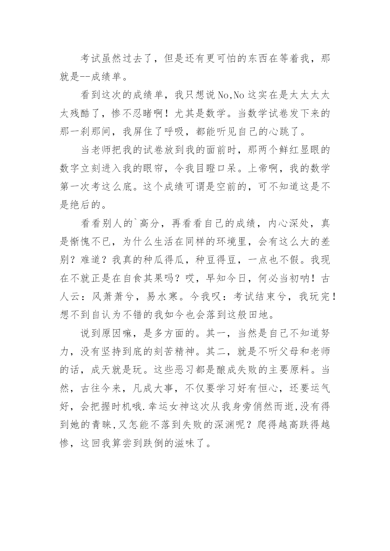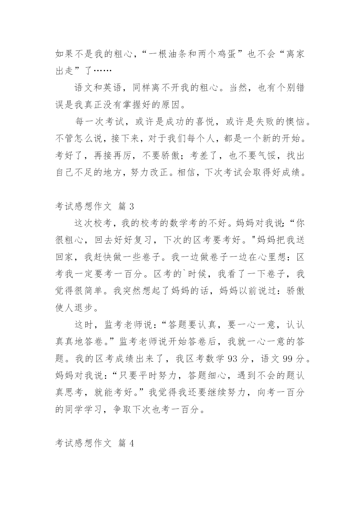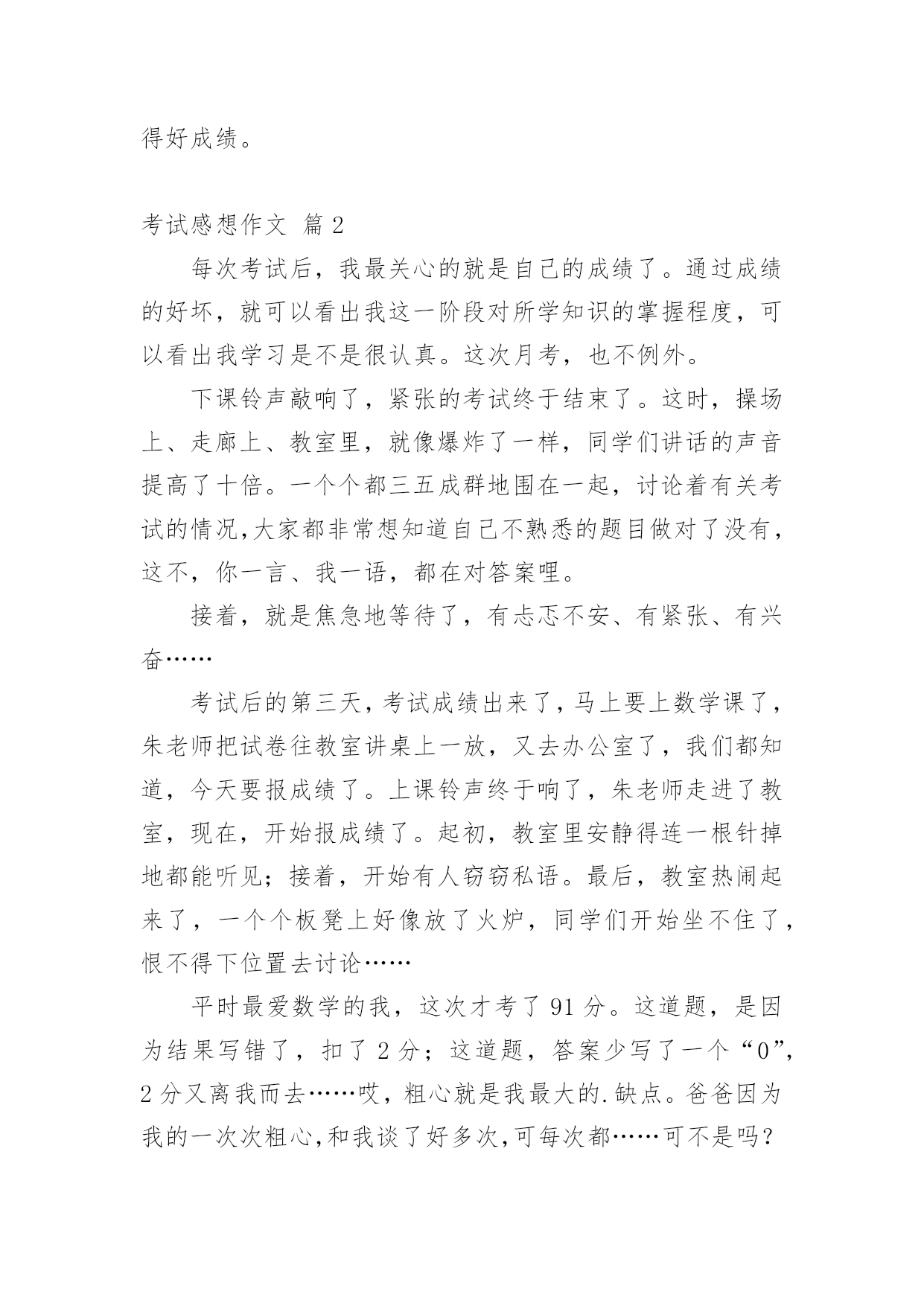 考试感想作文【经典】考试感想作文无论是身处学校还是步入社会,大家都写过作文吧,作文是人们把记忆中所存储的有关知识、经验和思想用书面形式表达出来的记叙方式。相信许多人会觉得作文很难写吧,以下是小编整理的考试感想作文4篇,仅供参考,希望能够帮助到大家。考试感想作文篇1昨天我们进行了期末考试,刚考完的时候我觉得信心十足,认为自己考得不错。可是等到三门科都考完老师讲解试卷的时候,我却傻眼了。听了老师的讲解,我知道了我的语文试卷上错了四题,数学和英语也都有错误。那一刻我感到无比的伤心和后悔。伤心的是这次考试没考好,后悔的是有些题目是因为自己粗心做错的。其中英语有一道题目我当时考虑的时候用的.是先排除错的答案,我想的是选B肯定是错误的,结果我居然就选了B。还有一道数学题因为没有认真看好答案而做错。语文试卷上有一题本来选的答案是正确的,可是自己又觉得不确定就又改成了错误的答案。还有一些题目是因为不太会而做错了。通过这次考试,我发现自己还有许多的不足之处,我以后一定要改掉粗心的毛病,继续加油,争取在下个学期里取得好成绩。考试感想作文篇2每次考试后,我最关心的就是自己的成绩了。通过成绩的好坏,就可以看出我这一阶段对所学知识的掌握程度,可以看出我学习是不是很认真。这次月考,也不例外。下课铃声敲响了,紧张的考试终于结束了。这时,操场上、走廊上、教室里,就像爆炸了一样,同学们讲话的声音提高了十倍。一个个都三五成群地围在一起,讨论着有关考试的情况,大家都非常想知道自己不熟悉的题目做对了没有,这不,你一言、我一语,都在对答案哩。接着,就是焦急地等待了,有忐忑不安、有紧张、有兴奋……考试后的第三天,考试成绩出来了,马上要上数学课了,朱老师把试卷往教室讲桌上一放,又去办公室了,我们都知道,今天要报成绩了。上课铃声终于响了,朱老师走进了教室,现在,开始报成绩了。起初,教室里安静得连一根针掉地都能听见;接着,开始有人窃窃私语。最后,教室热闹起来了,一个个板凳上好像放了火炉,同学们开始坐不住了,恨不得下位置去讨论……平时最爱数学的我,这次才考了91分。这道题,是因为结果写错了,扣了2分;这道题,答案少写了一个“0”,2分又离我而去……哎,粗心就是我最大的.缺点。爸爸因为我的一次次粗心,和我谈了好多次,可每次都……可不是吗?如果不是我的粗心,“一根油条和两个鸡蛋”也不会“离家出走”了……语文和英语,同样离不开我的粗心。当然,也有个别错误是我真正没有掌握好的原因。每一次考试,或许是成功的喜悦,或许是失败的懊恼。不管怎么说,接下来,对于我们每个人,都是一个新的开始。考好了,再接再厉,不要骄傲;考差了,也不要气馁,找出自己不足的地方,努力改正。相信,下次考试会取得好成绩。考试感想作文篇3这次校考,我的校考的数学考的不好。妈妈对我说:“你很粗心,回去好好复习,下次的区考要考好。"妈妈把我送回家,我赶快做一些卷子。我一边做卷子一边在心里想:区考我一定要考一百分。区考的`时候,我看了一下卷子,我觉得很简单。我突然想起了妈妈的话,妈妈以前说过:骄傲使人退步。这时,监考老师说:“答题要认真,要一心一意,认认真真地答卷。”监考老师说开始答卷后,我就一心一意的答题。我的区考成绩出来了,我区考数学93分,语文99分。妈妈对我说:“只要平时努力,答题细心,遇到不会的题认真思考,就能考好。”我觉得我还要继续努力,向考一百分的同学学习,争取下次也考一百分。考试感想作文篇4考试虽然过去了,但是还有更可怕的东西在等着我,那就是--成绩单。看到这次的成绩单,我只想说No,No这实在是太太太太太残酷了,惨不忍睹啊!尤其是数学。当数学试卷发下来的那一刹那间,我屏住了呼吸,都能听见自己的心跳了。当老师把我的试卷放到我的面前时,那两个鲜红显眼的数字立刻进入我的眼帘,令我目瞪口呆。上帝啊,我的数学第一次考这么底。这个成绩可谓是空前的,可不知道这是不是绝后的。看看别人的`高分,再看看自己的成绩,内心深处,真是惭愧不已,为什么生活在同样的环境里,会有这么大的差别?难道?我真的种瓜得瓜,种豆得豆,一点也不假。我现在不就正是在自食其果吗?哎,早知今日,何必当初呐!古人云:风萧萧兮,易水寒。今我叹:考试结束兮,我玩完!想不到自认为不错的我如今也会落到这般田地。说到原因嘛,是多方面的。其一,当然是自己不知道努力,没有坚持到底的刻苦精神。其二,就是不听父母和老师的话,成天就是玩。这些恶习都是酿成失败的主要原料。当然,古往今来,凡成大事,不仅要学习好有恒心,还要运气好,会把握时机哦.幸运女神这次从我身旁俏然而逝,没有得到她的青睐,又怎能不落到失败的深渊呢?爬得越高跌得越惨,这回我算尝到跌倒的滋味了。