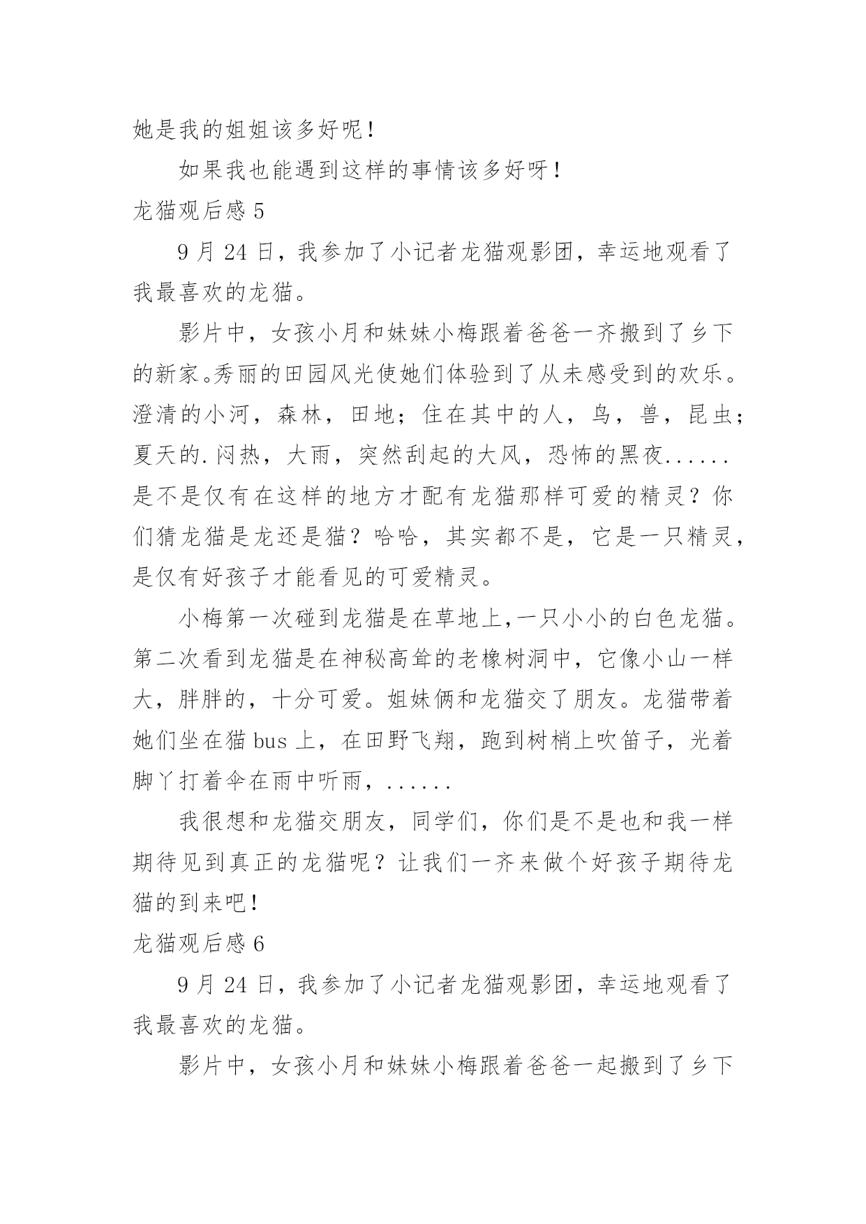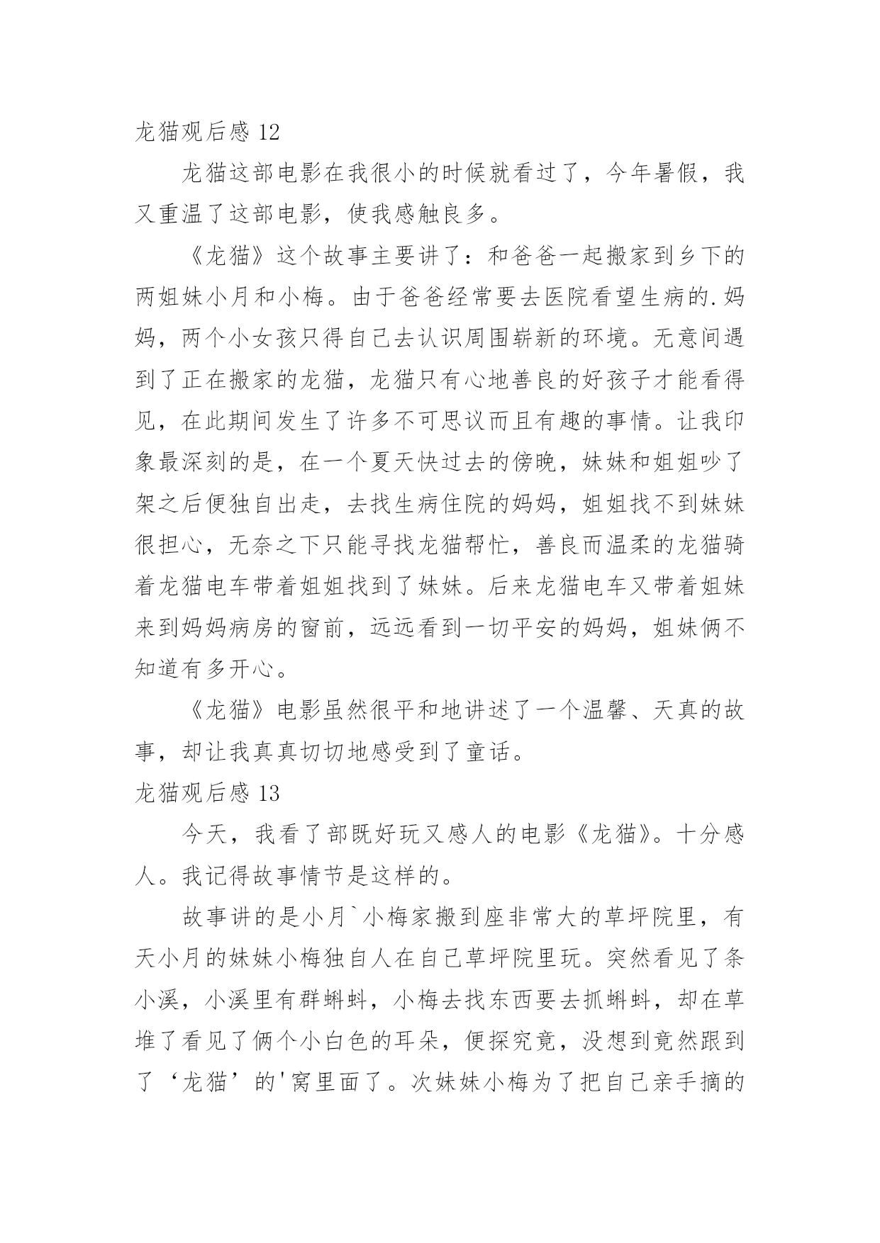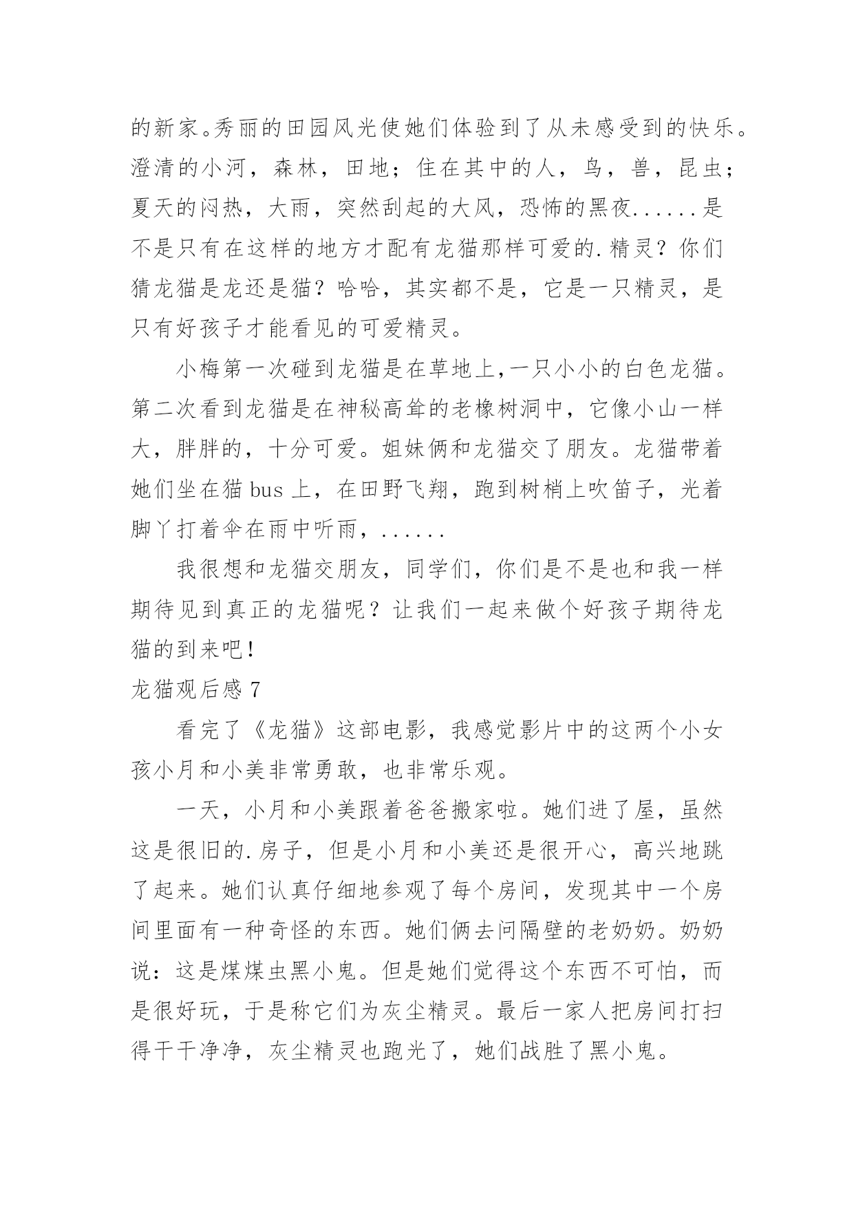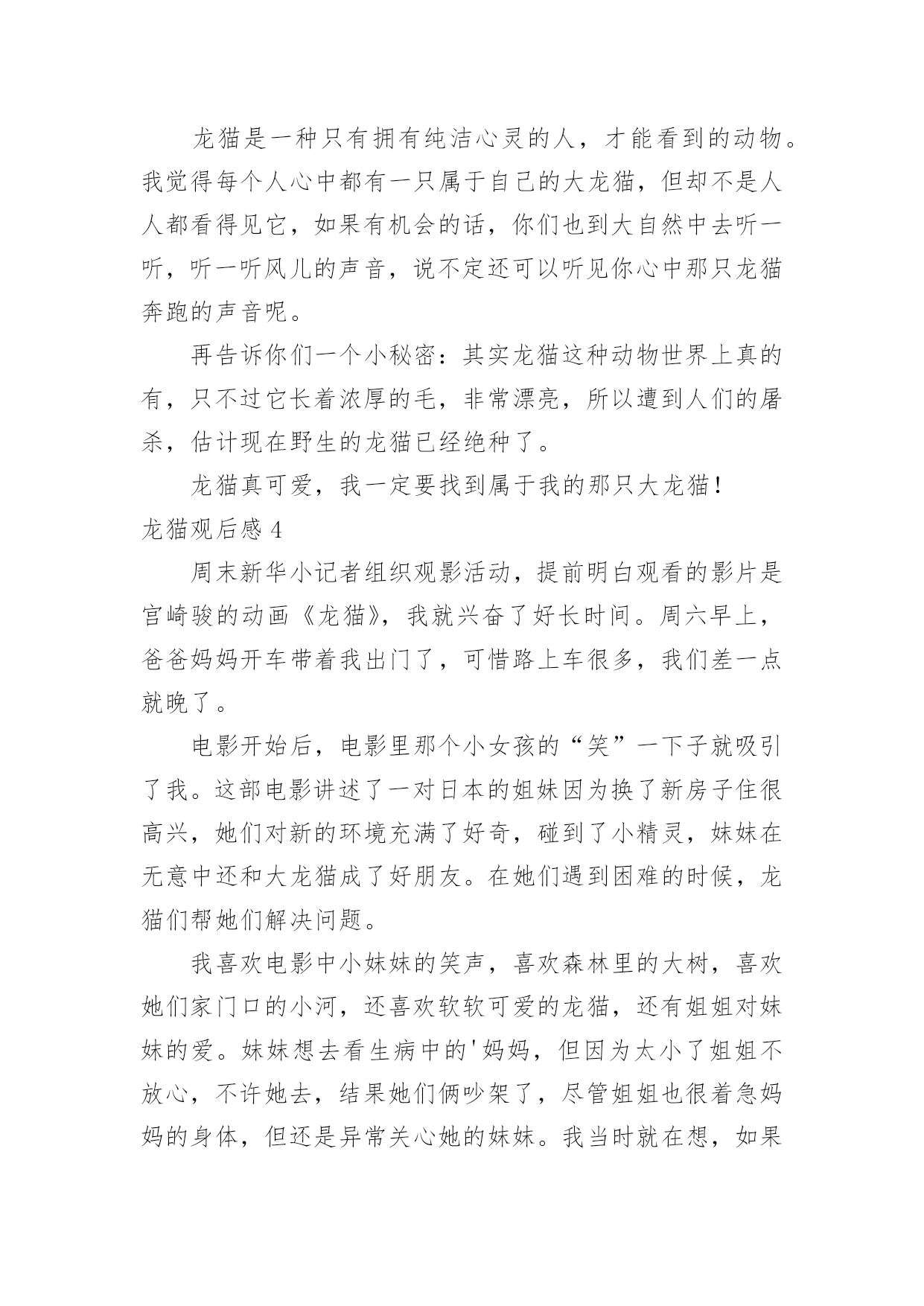 龙猫观后感龙猫观后感【热】看完一部影视作品以后,从中我们收获新的思想,这时候最关键的观后感不能忘了。到底应如何写观后感呢?以下是小编为大家整理的龙猫观后感,仅供参考,欢迎大家阅读。龙猫观后感1今天,我看了《龙猫》,《龙猫》的主人公有:“小月,小梅,龙猫。”小月和小梅是一对姐妹,又聪明又可爱。而且会互相帮助一起玩耍。但她们有吵架的时候呢!龙猫是一只不龙不猫的东西,它的身体很大很大像龙的身体,大大的眼睛像猫的`眼睛,所以叫龙猫。这部电影主要讲了小月和小梅看见了龙猫后就有了奇特的事,比如:“小梅不见了,小月去找了龙猫,龙猫叫了一辆猫型的车去找小梅,那辆猫形的车很快就找到了小梅,小梅和小月又见面了她们开行的不得了。”我快看到末尾的时候有一个画面让我泪流满面,但后来在小月和小梅的笑声中我也破涕为笑。我觉得这部电影很好看,因为前面的画面让我很开心,后面让我感动不已。我下次一定还要看这部电影。龙猫观后感2在同学的推荐下,我看了一部电影——《龙猫》。电影讲述了主人公小美和小月在妈妈住院期间搬到了乡下的新家,房屋虽然很破旧,但田园景象非常秀美,使她们感到了从未体验过的快乐,姐妹俩看到了龙猫,和龙猫交上了朋友,龙猫能听懂他们的话,他们也可以听懂龙猫在说什么。龙猫总是带着小月和小美玩。这一切也许只是小孩子心里纯洁、纯真的幻想,像真的一样,却反映了她们纯洁无暇的.美好心声。电影中,让我印象最深的是小美迷路后,小月为了找她,坐上了龙猫召唤来的龙猫公车,公车在田野上飞驰而过,正在干农活的人们却没有看到,只觉得是一阵风掠过,是什么让他们对这些美好的事物视而不见呢?或许是他们的童心不存在了吧。趁着假期,我回到了老家,自从看完《龙猫》这部电影后,我一直盼望着有一天龙猫会出现,我总是在田地边,在树下,听着风的声音,希望可以听到龙猫的呼吸。多美妙、多纯洁的童心!龙猫观后感3龙猫我想看很久了,因为据说龙猫是自然界中的精灵,有楼房那么大,可以在几秒种之间使小种子长成参天大树。那天,我有幸看到了这部动画片,故事内容主要讲一个幸福的四口之家,妈妈身患重病在住院,爸爸工作又很忙,姐姐带着年幼的'妹妹,一边上学,一边劳动,还好邻居是一位好心的婆婆,经常帮助她们。有一次,妈妈病情加重,是龙猫把她们带到医院,把礼物送给妈妈,妈妈开心地笑了。龙猫是一种只有拥有纯洁心灵的人,才能看到的动物。我觉得每个人心中都有一只属于自己的大龙猫,但却不是人人都看得见它,如果有机会的话,你们也到大自然中去听一听,听一听风儿的声音,说不定还可以听见你心中那只龙猫奔跑的声音呢。再告诉你们一个小秘密:其实龙猫这种动物世界上真的有,只不过它长着浓厚的毛,非常漂亮,所以遭到人们的屠杀,估计现在野生的龙猫已经绝种了。龙猫真可爱,我一定要找到属于我的那只大龙猫!龙猫观后感4周末新华小记者组织观影活动,提前明白观看的影片是宫崎骏的动画《龙猫》,我就兴奋了好长时间。周六早上,爸爸妈妈开车带着我出门了,可惜路上车很多,我们差一点就晚了。电影开始后,电影里那个小女孩的“笑”一下子就吸引了我。这部电影讲述了一对日本的姐妹因为换了新房子住很高兴,她们对新的环境充满了好奇,碰到了小精灵,妺妺在无意中还和大龙猫成了好朋友。在她们遇到困难的时候,龙猫们帮她们解决问题。我喜欢电影中小妺妺的笑声,喜欢森林里的大树,喜欢她们家门口的小河,还喜欢软软可爱的龙猫,还有姐姐对妺妺的爱。妺妺想去看生病中的'妈妈,但因为太小了姐姐不放心,不许她去,结果她们俩吵架了,尽管姐姐也很着急妈妈的身体,但还是异常关心她的妺妺。我当时就在想,如果她是我的姐姐该多好呢!如果我也能遇到这样的事情该多好呀!龙猫观后感59月24日,我参加了小记者龙猫观影团,幸运地观看了我最喜欢的龙猫。影片中,女孩小月和妹妹小梅跟着爸爸一齐搬到了乡下的新家。秀丽的田园风光使她们体验到了从未感受到的欢乐。澄清的小河,森林,田地;住在其中的人,鸟,兽,昆虫;夏天的.闷热,大雨,突然刮起的大风,恐怖的黑夜......是不是仅有在这样的地方才配有龙猫那样可爱的精灵?你们猜龙猫是龙还是猫?哈哈,其实都不是,它是一只精灵,是仅有好孩子才能看见的可爱精灵。小梅第一次碰到龙猫是在草地上,一只小小的白色龙猫。第二次看到龙猫是在神秘高耸的老橡树洞中,它像小山一样大,胖胖的,十分可爱。姐妹俩和龙猫交了朋友。龙猫带着她们坐在猫bus上,在田野飞翔,跑到树梢上吹笛子,光着脚丫打着伞在雨中听雨,......我很想和龙猫交朋友,同学们,你们是不是也和我一样期待见到真正的龙猫呢?让我们一齐来做个好孩子期待龙猫的到来吧!龙猫观后感69月24日,我参加了小记者龙猫观影团,幸运地观看了我最喜欢的龙猫。影片中,女孩小月和妹妹小梅跟着爸爸一起搬到了乡下的新家。秀丽的田园风光使她们体验到了从未感受到的快乐。澄清的小河,森林