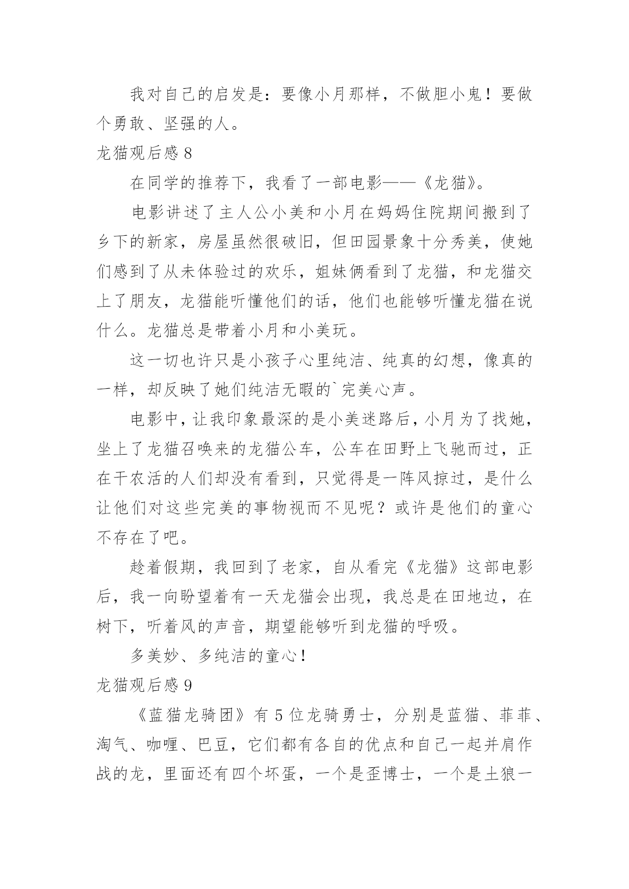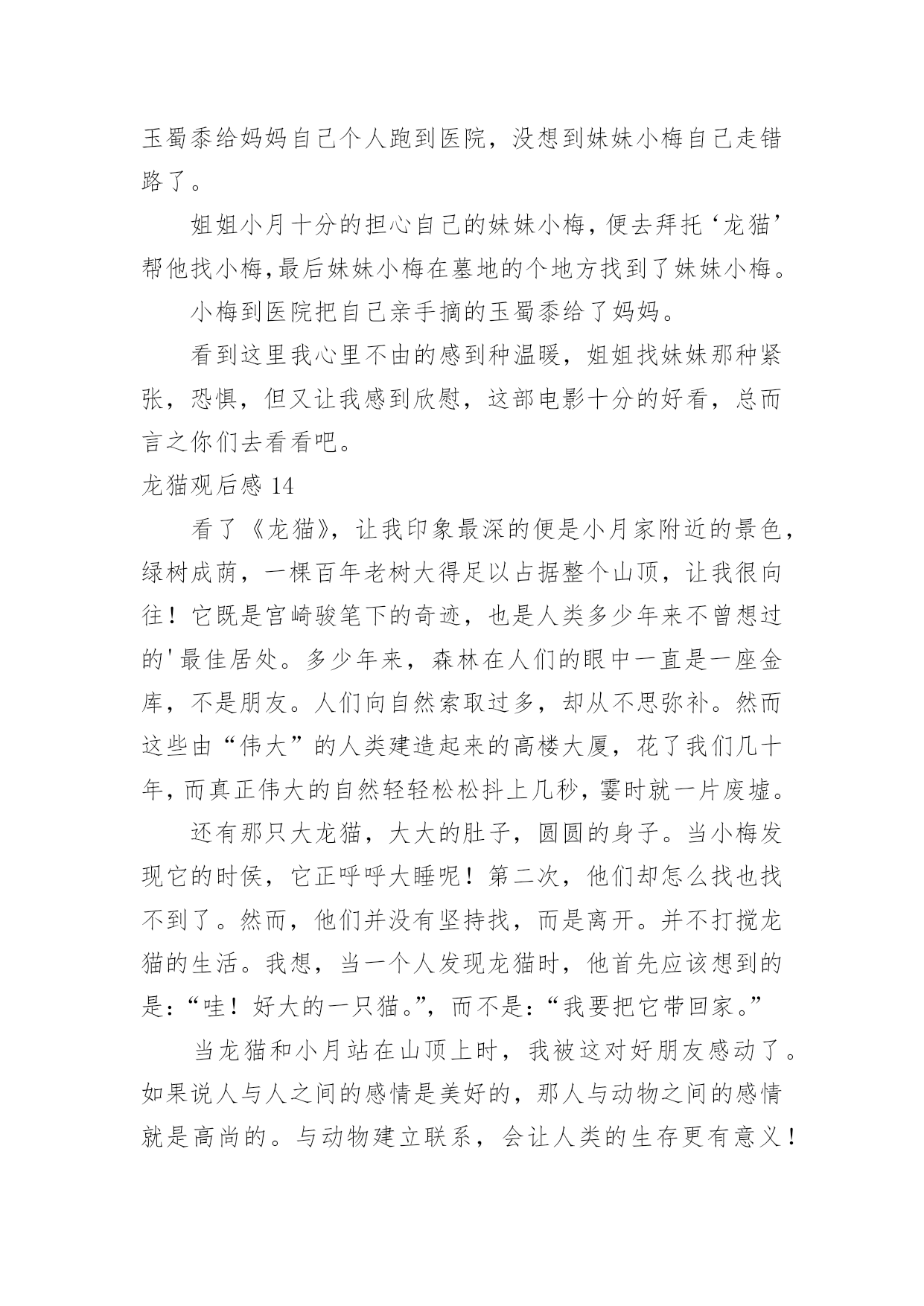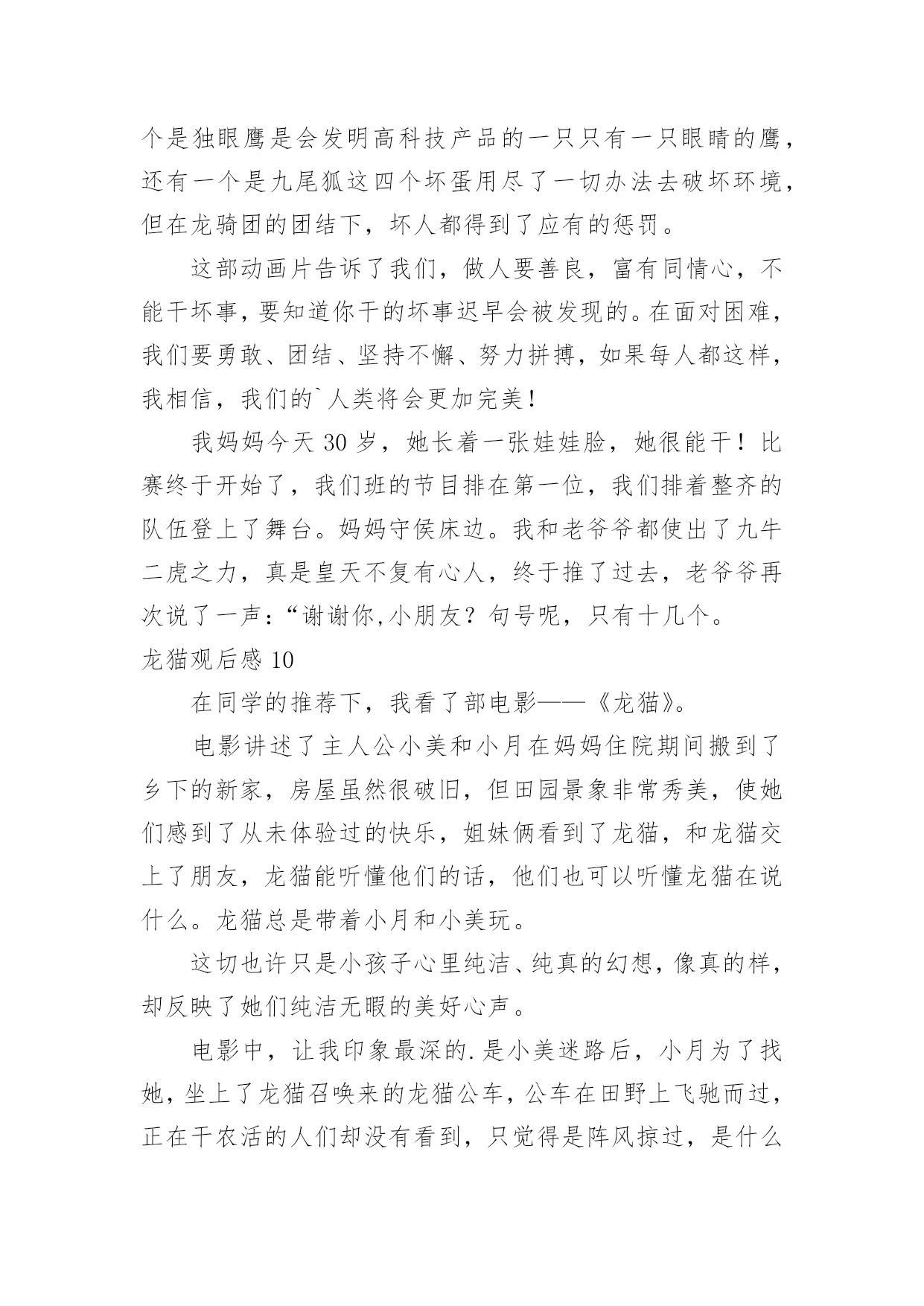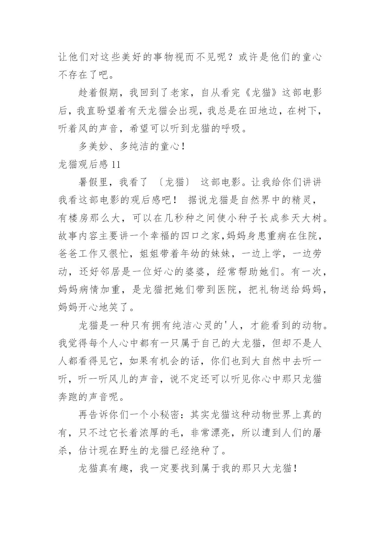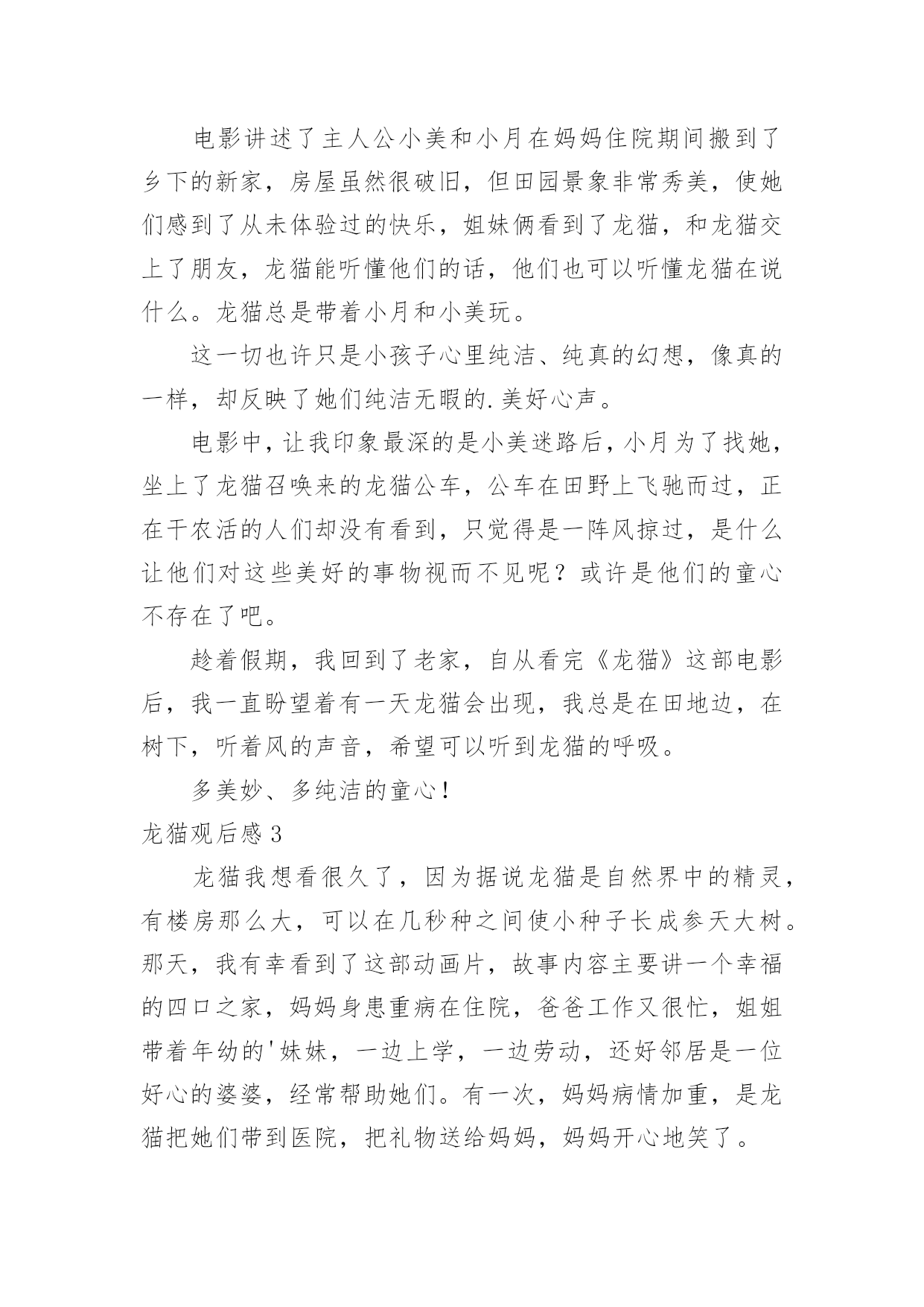 龙猫观后感龙猫观后感【热】看完一部影视作品以后,从中我们收获新的思想,这时候最关键的观后感不能忘了。到底应如何写观后感呢?以下是小编为大家整理的龙猫观后感,仅供参考,欢迎大家阅读。龙猫观后感1今天,我看了《龙猫》,《龙猫》的主人公有:“小月,小梅,龙猫。”小月和小梅是一对姐妹,又聪明又可爱。而且会互相帮助一起玩耍。但她们有吵架的时候呢!龙猫是一只不龙不猫的东西,它的身体很大很大像龙的身体,大大的眼睛像猫的`眼睛,所以叫龙猫。这部电影主要讲了小月和小梅看见了龙猫后就有了奇特的事,比如:“小梅不见了,小月去找了龙猫,龙猫叫了一辆猫型的车去找小梅,那辆猫形的车很快就找到了小梅,小梅和小月又见面了她们开行的不得了。”我快看到末尾的时候有一个画面让我泪流满面,但后来在小月和小梅的笑声中我也破涕为笑。我觉得这部电影很好看,因为前面的画面让我很开心,后面让我感动不已。我下次一定还要看这部电影。龙猫观后感2在同学的推荐下,我看了一部电影——《龙猫》。电影讲述了主人公小美和小月在妈妈住院期间搬到了乡下的新家,房屋虽然很破旧,但田园景象非常秀美,使她们感到了从未体验过的快乐,姐妹俩看到了龙猫,和龙猫交上了朋友,龙猫能听懂他们的话,他们也可以听懂龙猫在说什么。龙猫总是带着小月和小美玩。这一切也许只是小孩子心里纯洁、纯真的幻想,像真的一样,却反映了她们纯洁无暇的.美好心声。电影中,让我印象最深的是小美迷路后,小月为了找她,坐上了龙猫召唤来的龙猫公车,公车在田野上飞驰而过,正在干农活的人们却没有看到,只觉得是一阵风掠过,是什么让他们对这些美好的事物视而不见呢?或许是他们的童心不存在了吧。趁着假期,我回到了老家,自从看完《龙猫》这部电影后,我一直盼望着有一天龙猫会出现,我总是在田地边,在树下,听着风的声音,希望可以听到龙猫的呼吸。多美妙、多纯洁的童心!龙猫观后感3龙猫我想看很久了,因为据说龙猫是自然界中的精灵,有楼房那么大,可以在几秒种之间使小种子长成参天大树。那天,我有幸看到了这部动画片,故事内容主要讲一个幸福的四口之家,妈妈身患重病在住院,爸爸工作又很忙,姐姐带着年幼的'妹妹,一边上学,一边劳动,还好邻居是一位好心的婆婆,经常帮助她们。有一次,妈妈病情加重,是龙猫把她们带到医院,把礼物送给妈妈,妈妈开心地笑了。龙猫是一种只有拥有纯洁心灵的人,才能看到的动物。我觉得每个人心中都有一只属于自己的大龙猫,但却不是人人都看得见它,如果有机会的话,你们也到大自然中去听一听,听一听风儿的声音,说不定还可以听见你心中那只龙猫奔跑的声音呢。再告诉你们一个小秘密:其实龙猫这种动物世界上真的有,只不过它长着浓厚的毛,非常漂亮,所以遭到人们的屠杀,估计现在野生的龙猫已经绝种了。龙猫真可爱,我一定要找到属于我的那只大龙猫!龙猫观后感4周末新华小记者组织观影活动,提前明白观看的影片是宫崎骏的动画《龙猫》,我就兴奋了好长时间。周六早上,爸爸妈妈开车带着我出门了,可惜路上车很多,我们差一点就晚了。电影开始后,电影里那个小女孩的“笑”一下子就吸引了我。这部电影讲述了一对日本的姐妹因为换了新房子住很高兴,她们对新的环境充满了好奇,碰到了小精灵,妺妺在无意中还和大龙猫成了好朋友。在她们遇到困难的时候,龙猫们帮她们解决问题。我喜欢电影中小妺妺的笑声,喜欢森林里的大树,喜欢她们家门口的小河,还喜欢软软可爱的龙猫,还有姐姐对妺妺的爱。妺妺想去看生病中的'妈妈,但因为太小了姐姐不放心,不许她去,结果她们俩吵架了,尽管姐姐也很着急妈妈的身体,但还是异常关心她的妺妺。我当时就在想,如果她是我的姐姐该多好呢!如果我也能遇到这样的事情该多好呀!龙猫观后感59月24日,我参加了小记者龙猫观影团,幸运地观看了我最喜欢的龙猫。影片中,女孩小月和妹妹小梅跟着爸爸一齐搬到了乡下的新家。秀丽的田园风光使她们体验到了从未感受到的欢乐。澄清的小河,森林,田地;住在其中的人,鸟,兽,昆虫;夏天的.闷热,大雨,突然刮起的大风,恐怖的黑夜......是不是仅有在这样的地方才配有龙猫那样可爱的精灵?你们猜龙猫是龙还是猫?哈哈,其实都不是,它是一只精灵,是仅有好孩子才能看见的可爱精灵。小梅第一次碰到龙猫是在草地上,一只小小的白色龙猫。第二次看到龙猫是在神秘高耸的老橡树洞中,它像小山一样大,胖胖的,十分可爱。姐妹俩和龙猫交了朋友。龙猫带着她们坐在猫bus上,在田野飞翔,跑到树梢上吹笛子,光着脚丫打着伞在雨中听雨,......我很想和龙猫交朋友,同学们,你们是不是也和我一样期待见到真正的龙猫呢?让我们一齐来做个好孩子期待龙猫的到来吧!龙猫观后感69月24日,我参加了小记者龙猫观影团,幸运地观看了我最喜欢的龙猫。影片中,女孩小月和妹妹小梅跟着爸爸一起搬到了乡下的新家。秀丽的田园风光使她们体验到了从未感受到的快乐。澄清的小河,森林
