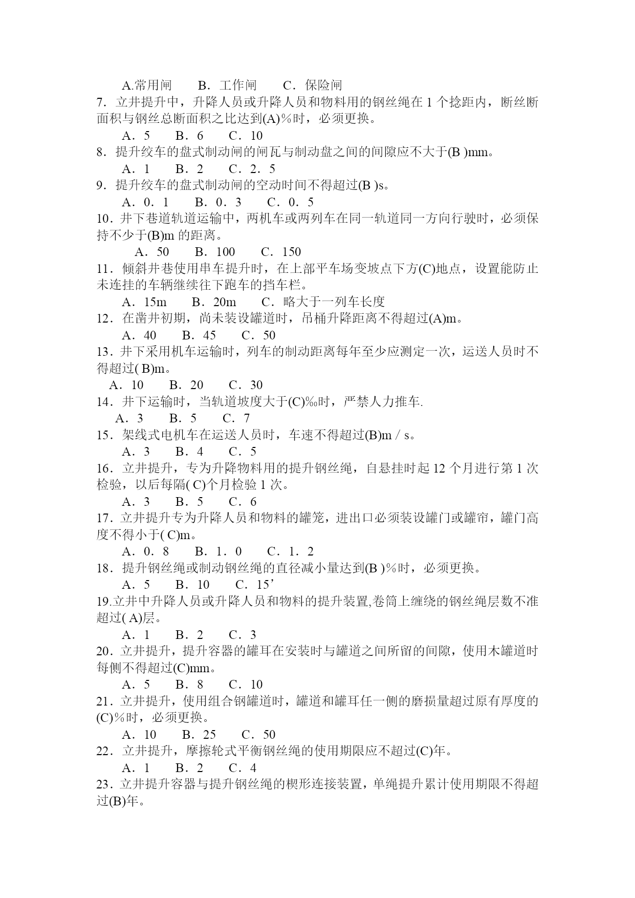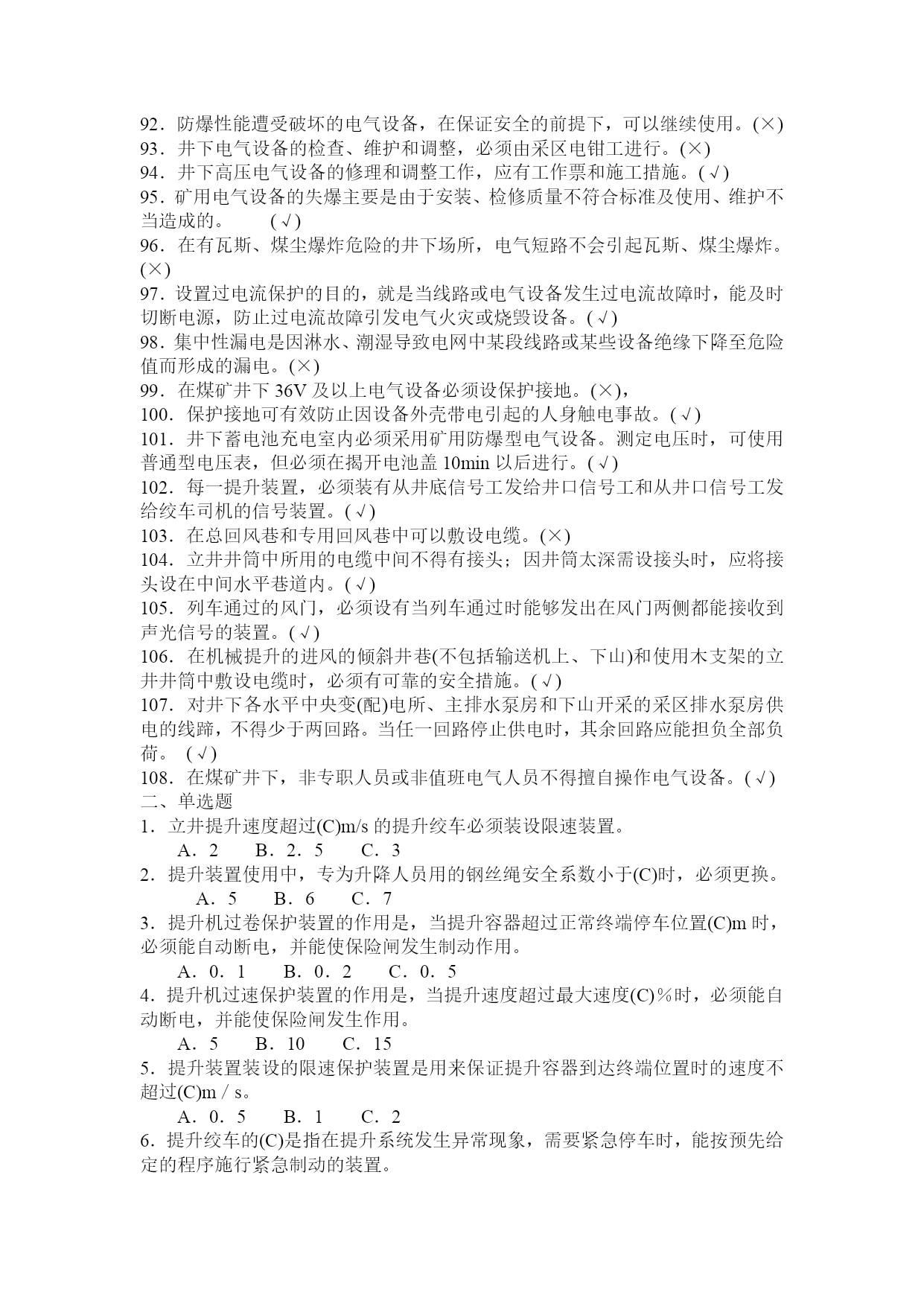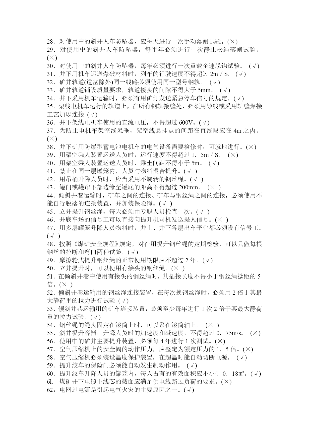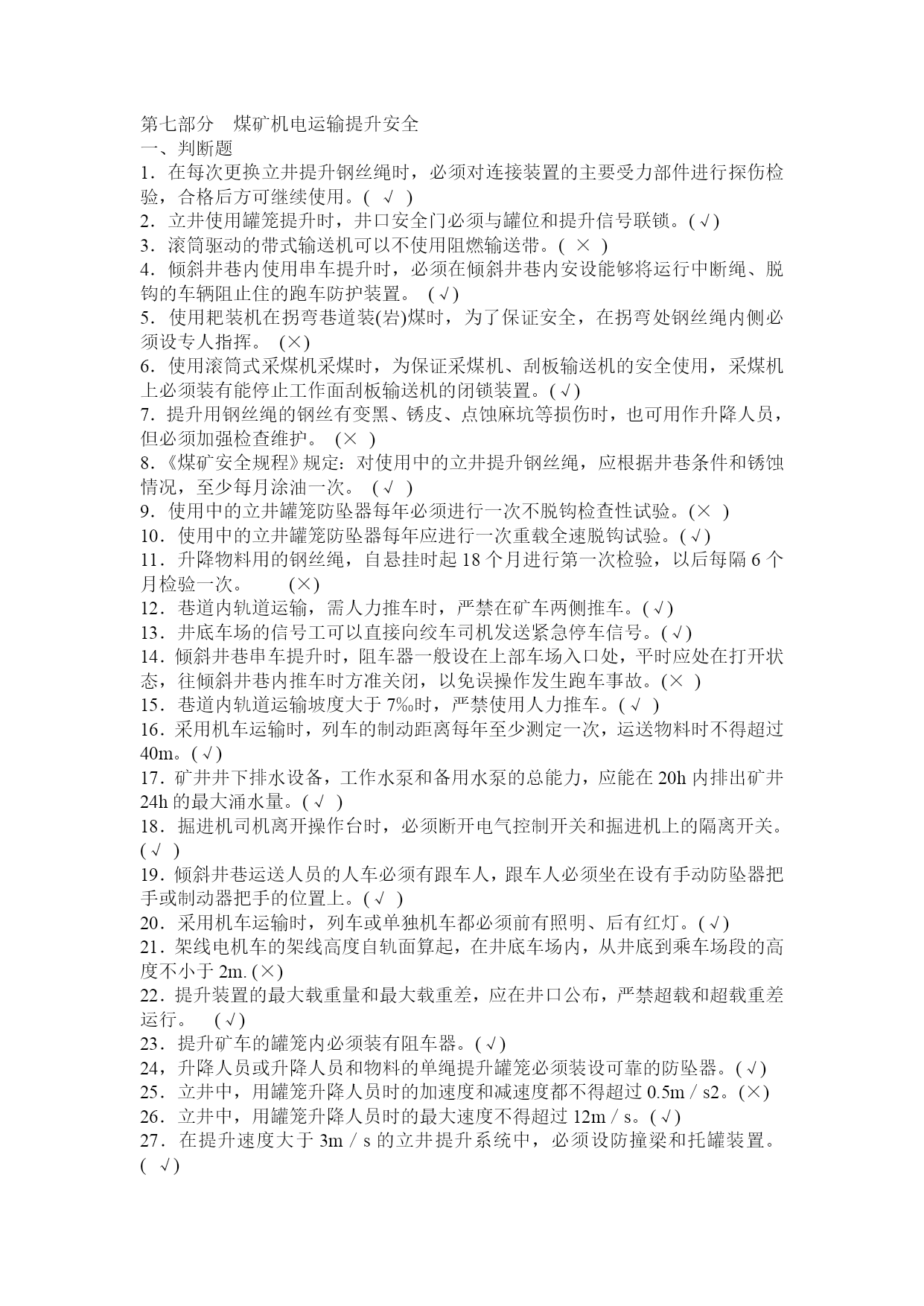 煤矿机电运输提升安全考卷优质资料(可以直接使用,可编辑优质资料,欢迎下载)第七部分煤矿机电运输提升安全一、判断题1.在每次更换立井提升钢丝绳时,必须对连接装置的主要受力部件进行探伤检验,合格后方可继续使用。(√)2.立井使用罐笼提升时,井口安全门必须与罐位和提升信号联锁。(√)3.滚筒驱动的带式输送机可以不使用阻燃输送带。(×)4.倾斜井巷内使用串车提升时,必须在倾斜井巷内安设能够将运行中断绳、脱钩的车辆阻止住的跑车防护装置。(√)5.使用耙装机在拐弯巷道装(岩)煤时,为了保证安全,在拐弯处钢丝绳内侧必须设专人指挥。(×)6.使用滚筒式采煤机采煤时,为保证采煤机、刮板输送机的安全使用,采煤机上必须装有能停止工作面刮板输送机的闭锁装置。(√)7.提升用钢丝绳的钢丝有变黑、锈皮、点蚀麻坑等损伤时,也可用作升降人员,但必须加强检查维护。(×)8.《煤矿安全规程》规定:对使用中的立井提升钢丝绳,应根据井巷条件和锈蚀情况,至少每月涂油一次。(√)9.使用中的立井罐笼防坠器每年必须进行一次不脱钩检查性试验。(×)10.使用中的立井罐笼防坠器每年应进行一次重载全速脱钩试验。(√)11.升降物料用的钢丝绳,自悬挂时起18个月进行第一次检验,以后每隔6个月检验一次。(×)12.巷道内轨道运输,需人力推车时,严禁在矿车两侧推车。(√)13.井底车场的信号工可以直接向绞车司机发送紧急停车信号。(√)14.倾斜井巷串车提升时,阻车器一般设在上部车场入口处,平时应处在打开状态,往倾斜井巷内推车时方准关闭,以免误操作发生跑车事故。(×)15.巷道内轨道运输坡度大于7‰时,严禁使用人力推车。(√)16.采用机车运输时,列车的制动距离每年至少测定一次,运送物料时不得超过40m。(√)17.矿井井下排水设备,工作水泵和备用水泵的总能力,应能在20h内排出矿井24h的最大涌水量。(√)18.掘进机司机离开操作台时,必须断开电气控制开关和掘进机上的隔离开关。(√)19.倾斜井巷运送人员的人车必须有跟车人,跟车人必须坐在设有手动防坠器把手或制动器把手的位置上。(√)20.采用机车运输时,列车或单独机车都必须前有照明、后有红灯。(√)21.架线电机车的架线高度自轨面算起,在井底车场内,从井底到乘车场段的高度不小于2m.(×)22.提升装置的最大载重量和最大载重差,应在井口公布,严禁超载和超载重差运行。(√)23.提升矿车的罐笼内必须装有阻车器。(√)24,升降人员或升降人员和物料的单绳提升罐笼必须装设可靠的防坠器。(√)25.立井中,用罐笼升降人员时的加速度和减速度都不得超过0.5m/s2。(×)26.立井中,用罐笼升降人员时的最大速度不得超过12m/s。(√)27.在提升速度大于3m/s的立井提升系统中,必须设防撞梁和托罐装置。(√)28.对使用中的斜井人车防坠器,应每天进行一次手动落闸试验。(×)29.对使用中的斜井人车防坠器,每半年必须进行一次静止松绳落闸试验。(×)30.对使用中的斜井人车防坠器,每年必须进行一次重载全速脱钩试验。(√)31.井下用机车运送爆破材料时,列车的行驶速度不得超过2m/S.(√)32.矿井轨道(道岔除外)同一线路必须使用同一型号钢轨。(√)33.矿井轨道铺设质量要求,轨道接头的间隙不得大于5mm。(√)34.井下采用机车运输时,必须有用矿灯发送紧急停车信号的规定。(√)35.架线电机车运行的轨道上,在所有钢轨接缝处,必须用导线或采用轨缝焊接工艺加以连接(√)36.井下架线电机车使用的直流电压,不得超过600V。(√)37.为防止电机车架空线悬垂,架空线悬挂点的间距在直线段应在4m之内。(×)38.井下矿用防爆型蓄电池电机车的电气设备需要检修时,可就地进行。(×)39.用架空乘人装置运送人员时,运行速度不得超过1.5m/S。(×)40.用架空乘人装置运送人员时,乘坐间距不得小于5m。(√)41.禁止在同一层罐笼内,人员与物料混合提升。(√)42.用吊桶升降人员时,应当采用不旋转的钢丝绳。(√)43.罐门或罐帘下部边缘至罐底的距离不得超过200mm。(×)44.倾斜井巷运输时,矿车之间的连接、矿车与钢丝绳之间的连接,必须使用不能自行脱落的连接装置,并加装保险绳。(√)45.立井提升钢丝绳,每天必须由专职人员检查一次。(√)46.井底车场的信号工可以直接向提升机司机发送提人信号。(×)47.用多层罐笼升降人员物料时,井上、井下各层出车平台都必须设有信号工。(√)48.按照《煤矿安全规程》规定,对在用提升钢丝绳的定期检验,可以只做每根钢丝的拉断和弯曲两种试验,(√)49.摩擦轮式提升钢丝绳的正常使用期限应不超过2年。(√)50.立井提升时