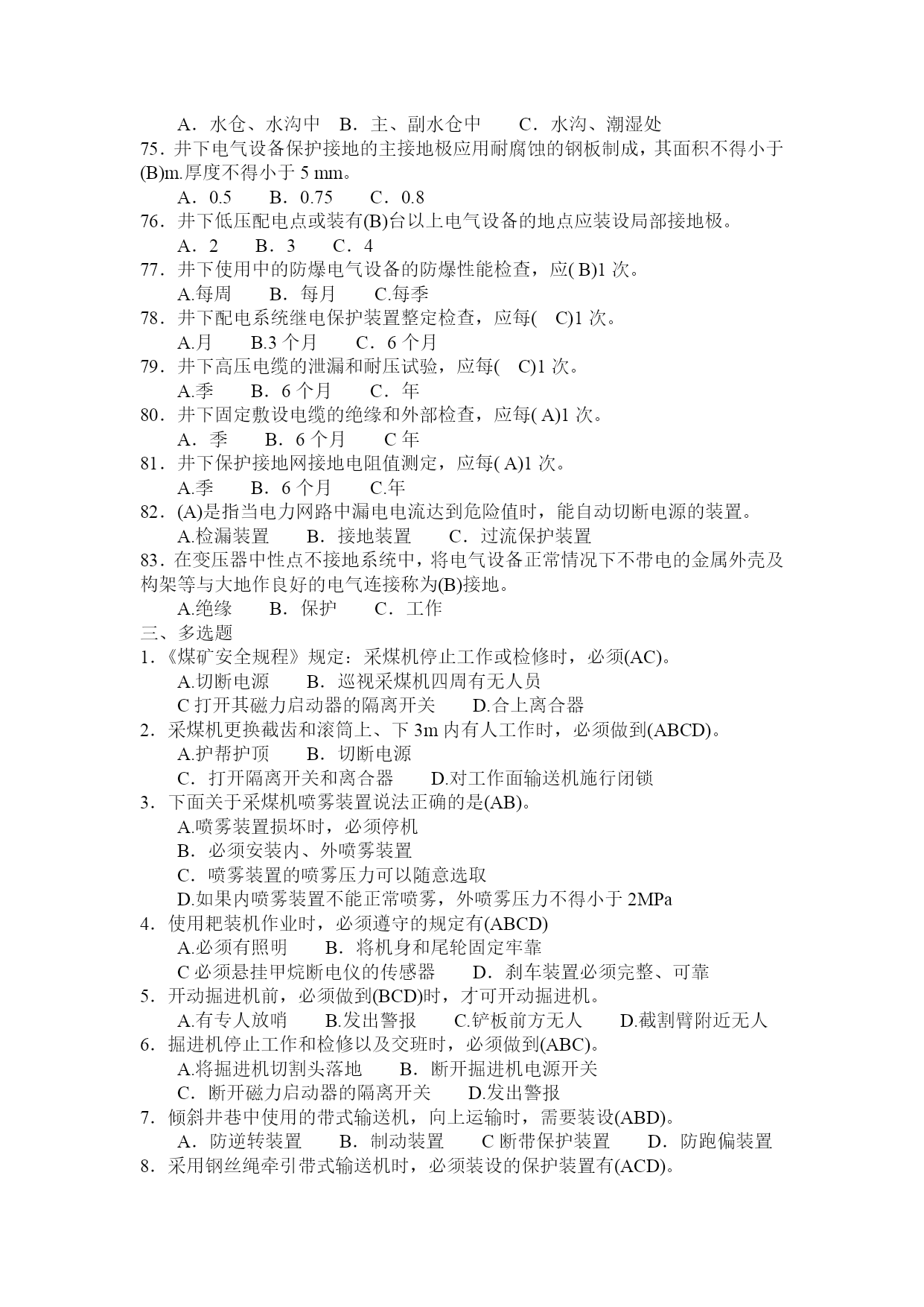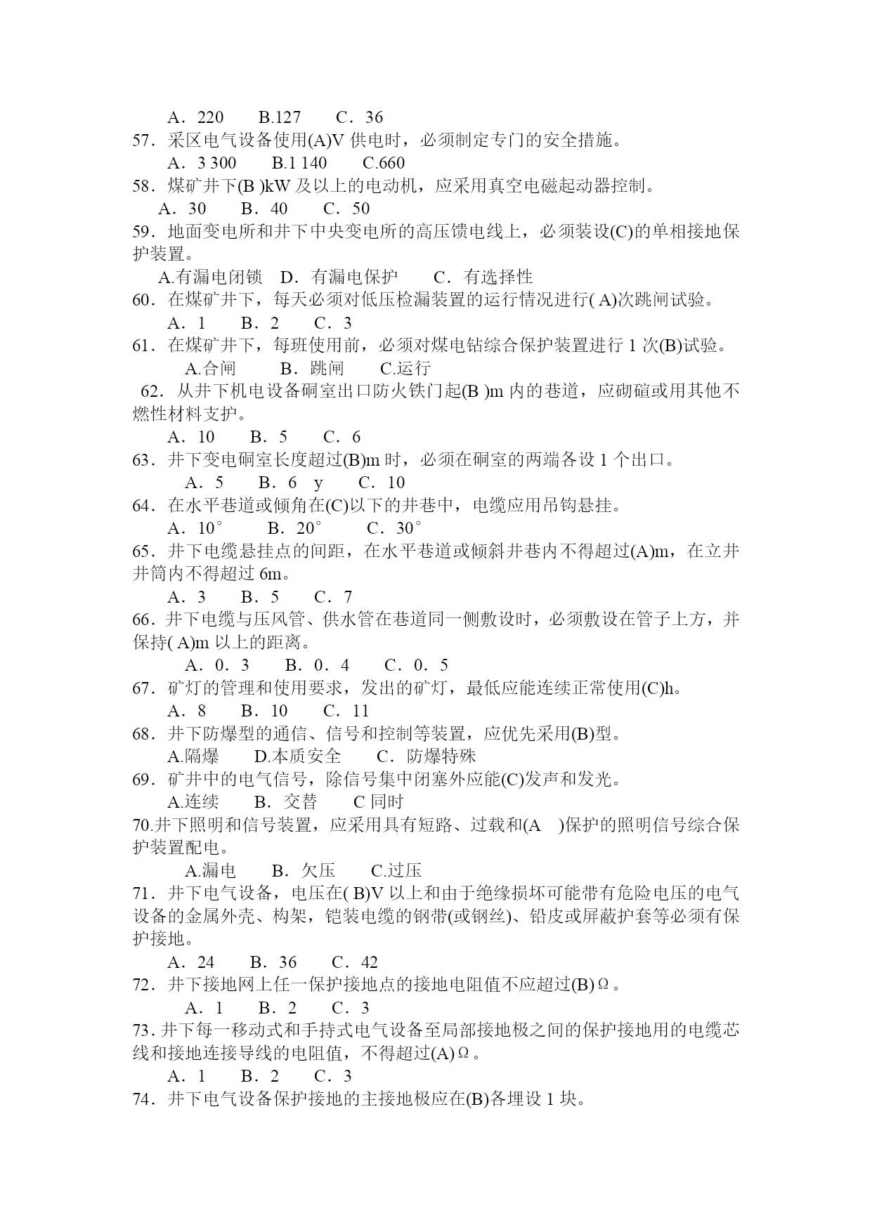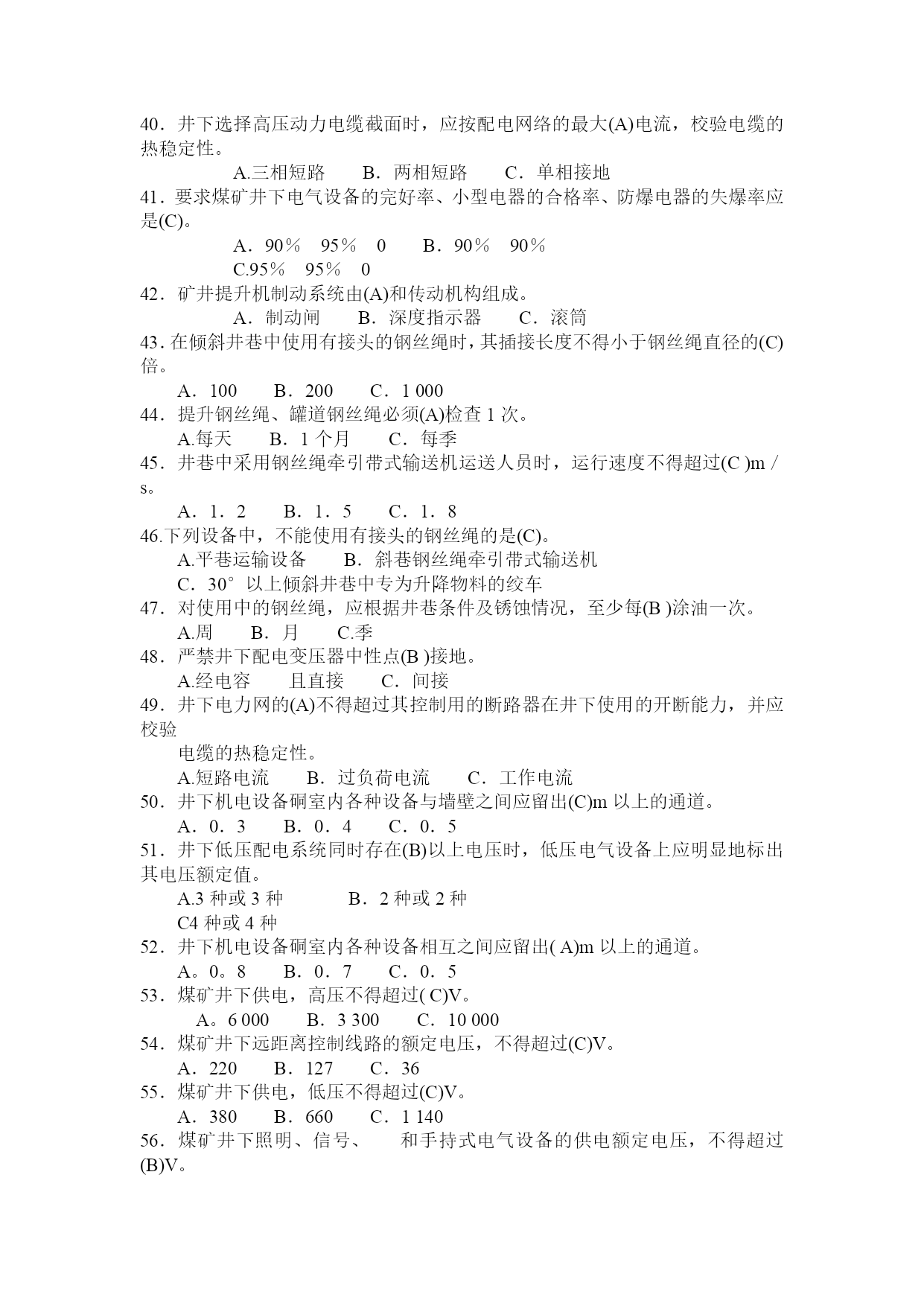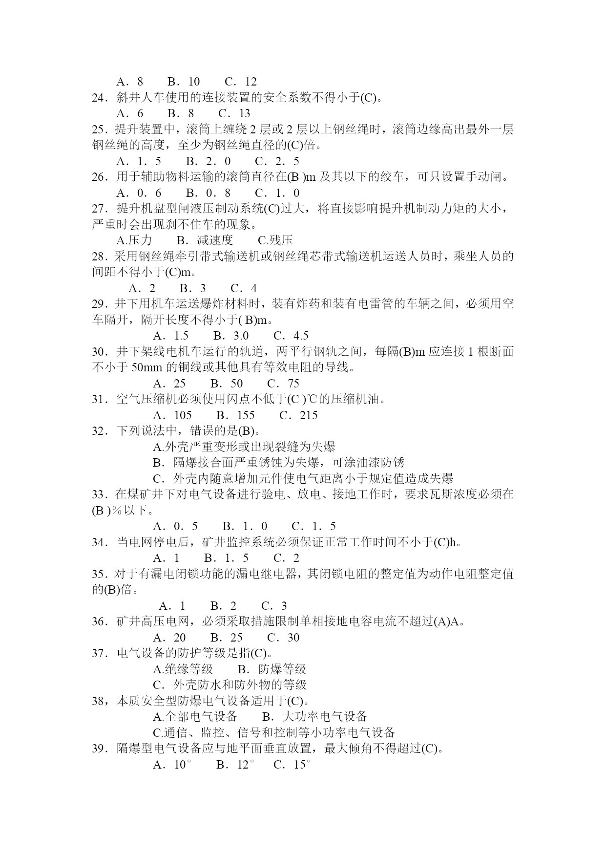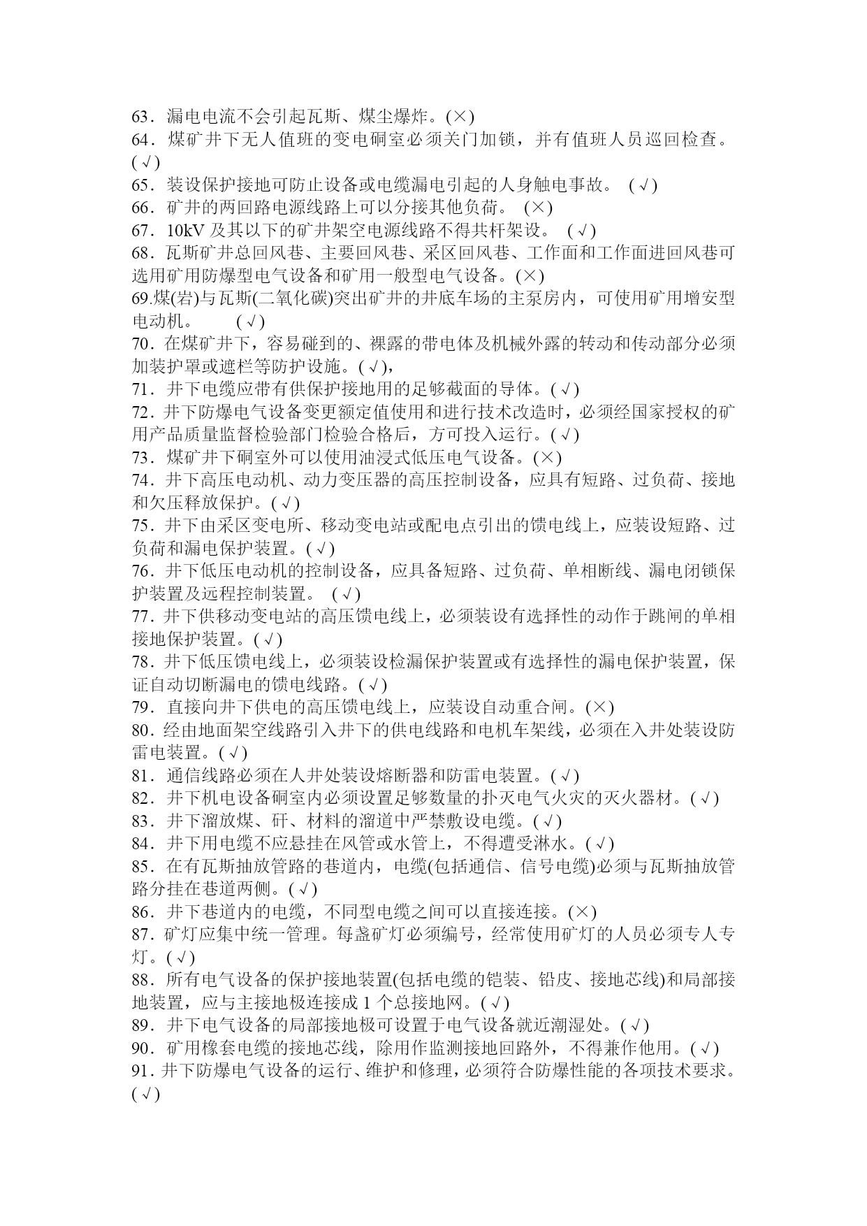 煤矿机电运输提升安全考卷优质资料(可以直接使用,可编辑优质资料,欢迎下载)第七部分煤矿机电运输提升安全一、判断题1.在每次更换立井提升钢丝绳时,必须对连接装置的主要受力部件进行探伤检验,合格后方可继续使用。(√)2.立井使用罐笼提升时,井口安全门必须与罐位和提升信号联锁。(√)3.滚筒驱动的带式输送机可以不使用阻燃输送带。(×)4.倾斜井巷内使用串车提升时,必须在倾斜井巷内安设能够将运行中断绳、脱钩的车辆阻止住的跑车防护装置。(√)5.使用耙装机在拐弯巷道装(岩)煤时,为了保证安全,在拐弯处钢丝绳内侧必须设专人指挥。(×)6.使用滚筒式采煤机采煤时,为保证采煤机、刮板输送机的安全使用,采煤机上必须装有能停止工作面刮板输送机的闭锁装置。(√)7.提升用钢丝绳的钢丝有变黑、锈皮、点蚀麻坑等损伤时,也可用作升降人员,但必须加强检查维护。(×)8.《煤矿安全规程》规定:对使用中的立井提升钢丝绳,应根据井巷条件和锈蚀情况,至少每月涂油一次。(√)9.使用中的立井罐笼防坠器每年必须进行一次不脱钩检查性试验。(×)10.使用中的立井罐笼防坠器每年应进行一次重载全速脱钩试验。(√)11.升降物料用的钢丝绳,自悬挂时起18个月进行第一次检验,以后每隔6个月检验一次。(×)12.巷道内轨道运输,需人力推车时,严禁在矿车两侧推车。(√)13.井底车场的信号工可以直接向绞车司机发送紧急停车信号。(√)14.倾斜井巷串车提升时,阻车器一般设在上部车场入口处,平时应处在打开状态,往倾斜井巷内推车时方准关闭,以免误操作发生跑车事故。(×)15.巷道内轨道运输坡度大于7‰时,严禁使用人力推车。(√)16.采用机车运输时,列车的制动距离每年至少测定一次,运送物料时不得超过40m。(√)17.矿井井下排水设备,工作水泵和备用水泵的总能力,应能在20h内排出矿井24h的最大涌水量。(√)18.掘进机司机离开操作台时,必须断开电气控制开关和掘进机上的隔离开关。(√)19.倾斜井巷运送人员的人车必须有跟车人,跟车人必须坐在设有手动防坠器把手或制动器把手的位置上。(√)20.采用机车运输时,列车或单独机车都必须前有照明、后有红灯。(√)21.架线电机车的架线高度自轨面算起,在井底车场内,从井底到乘车场段的高度不小于2m.(×)22.提升装置的最大载重量和最大载重差,应在井口公布,严禁超载和超载重差运行。(√)23.提升矿车的罐笼内必须装有阻车器。(√)24,升降人员或升降人员和物料的单绳提升罐笼必须装设可靠的防坠器。(√)25.立井中,用罐笼升降人员时的加速度和减速度都不得超过0.5m/s2。(×)26.立井中,用罐笼升降人员时的最大速度不得超过12m/s。(√)27.在提升速度大于3m/s的立井提升系统中,必须设防撞梁和托罐装置。(√)28.对使用中的斜井人车防坠器,应每天进行一次手动落闸试验。(×)29.对使用中的斜井人车防坠器,每半年必须进行一次静止松绳落闸试验。(×)30.对使用中的斜井人车防坠器,每年必须进行一次重载全速脱钩试验。(√)31.井下用机车运送爆破材料时,列车的行驶速度不得超过2m/S.(√)32.矿井轨道(道岔除外)同一线路必须使用同一型号钢轨。(√)33.矿井轨道铺设质量要求,轨道接头的间隙不得大于5mm。(√)34.井下采用机车运输时,必须有用矿灯发送紧急停车信号的规定。(√)35.架线电机车运行的轨道上,在所有钢轨接缝处,必须用导线或采用轨缝焊接工艺加以连接(√)36.井下架线电机车使用的直流电压,不得超过600V。(√)37.为防止电机车架空线悬垂,架空线悬挂点的间距在直线段应在4m之内。(×)38.井下矿用防爆型蓄电池电机车的电气设备需要检修时,可就地进行。(×)39.用架空乘人装置运送人员时,运行速度不得超过1.5m/S。(×)40.用架空乘人装置运送人员时,乘坐间距不得小于5m。(√)41.禁止在同一层罐笼内,人员与物料混合提升。(√)42.用吊桶升降人员时,应当采用不旋转的钢丝绳。(√)43.罐门或罐帘下部边缘至罐底的距离不得超过200mm。(×)44.倾斜井巷运输时,矿车之间的连接、矿车与钢丝绳之间的连接,必须使用不能自行脱落的连接装置,并加装保险绳。(√)45.立井提升钢丝绳,每天必须由专职人员检查一次。(√)46.井底车场的信号工可以直接向提升机司机发送提人信号。(×)47.用多层罐笼升降人员物料时,井上、井下各层出车平台都必须设有信号工。(√)48.按照《煤矿安全规程》规定,对在用提升钢丝绳的定期检验,可以只做每根钢丝的拉断和弯曲两种试验,(√)49.摩擦轮式提升钢丝绳的正常使用期限应不超过2年。(√)50.立井提升时