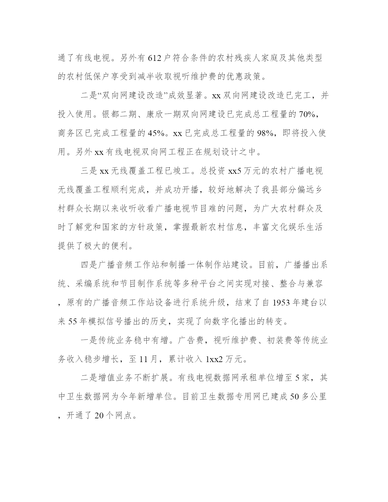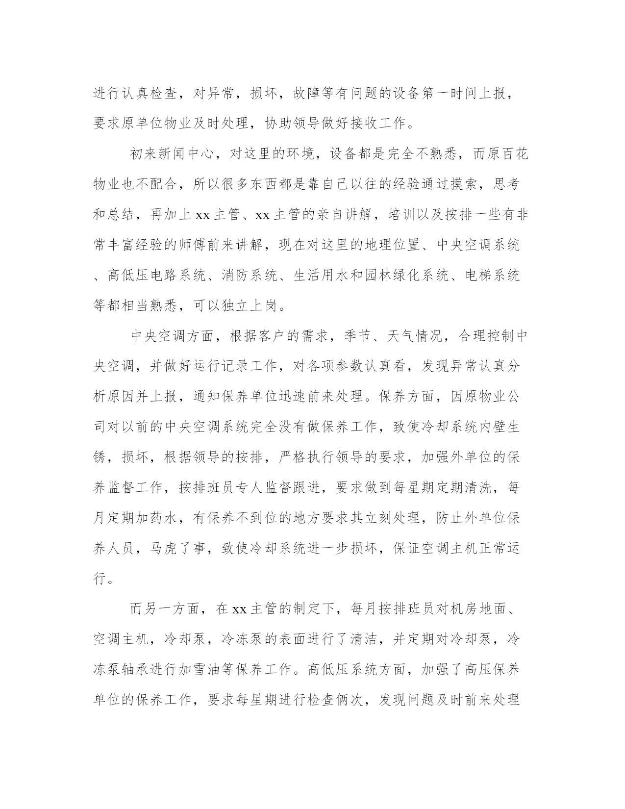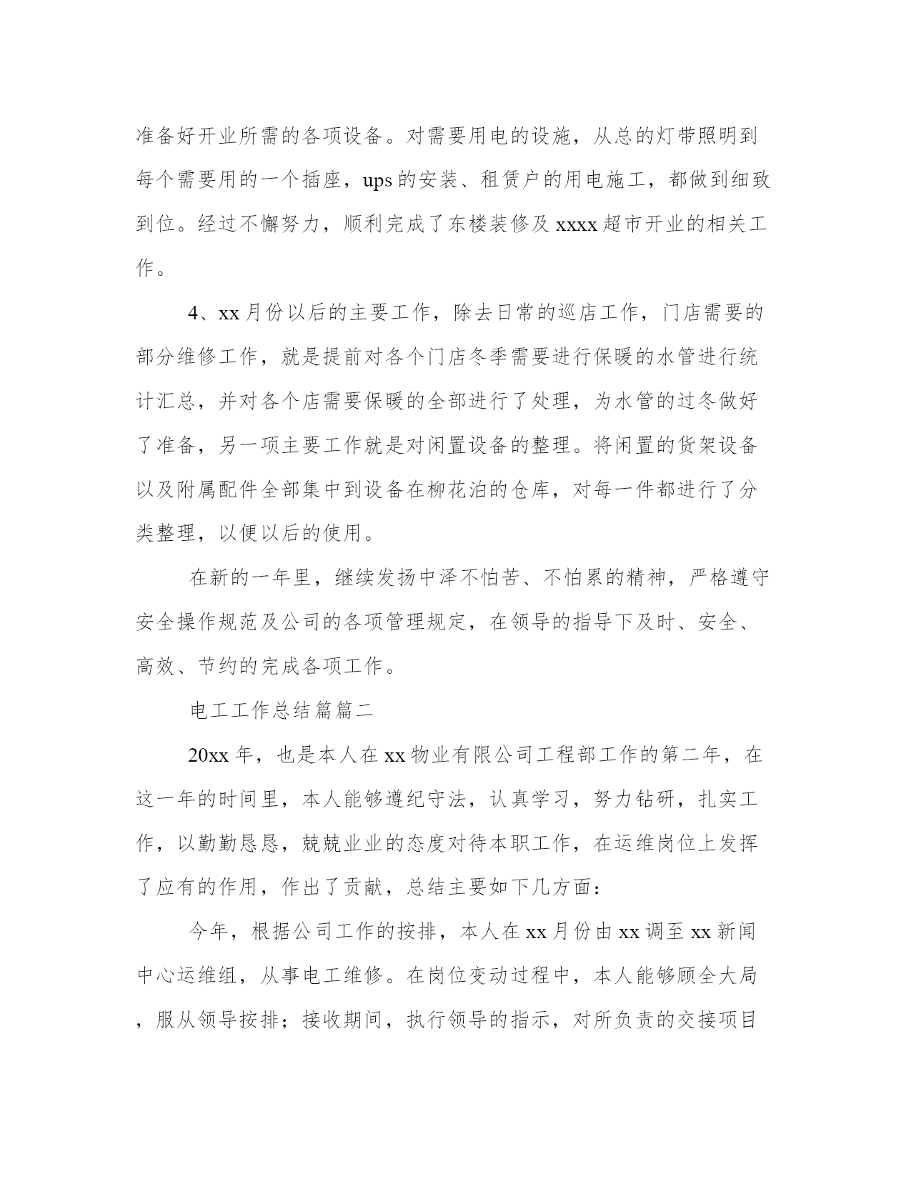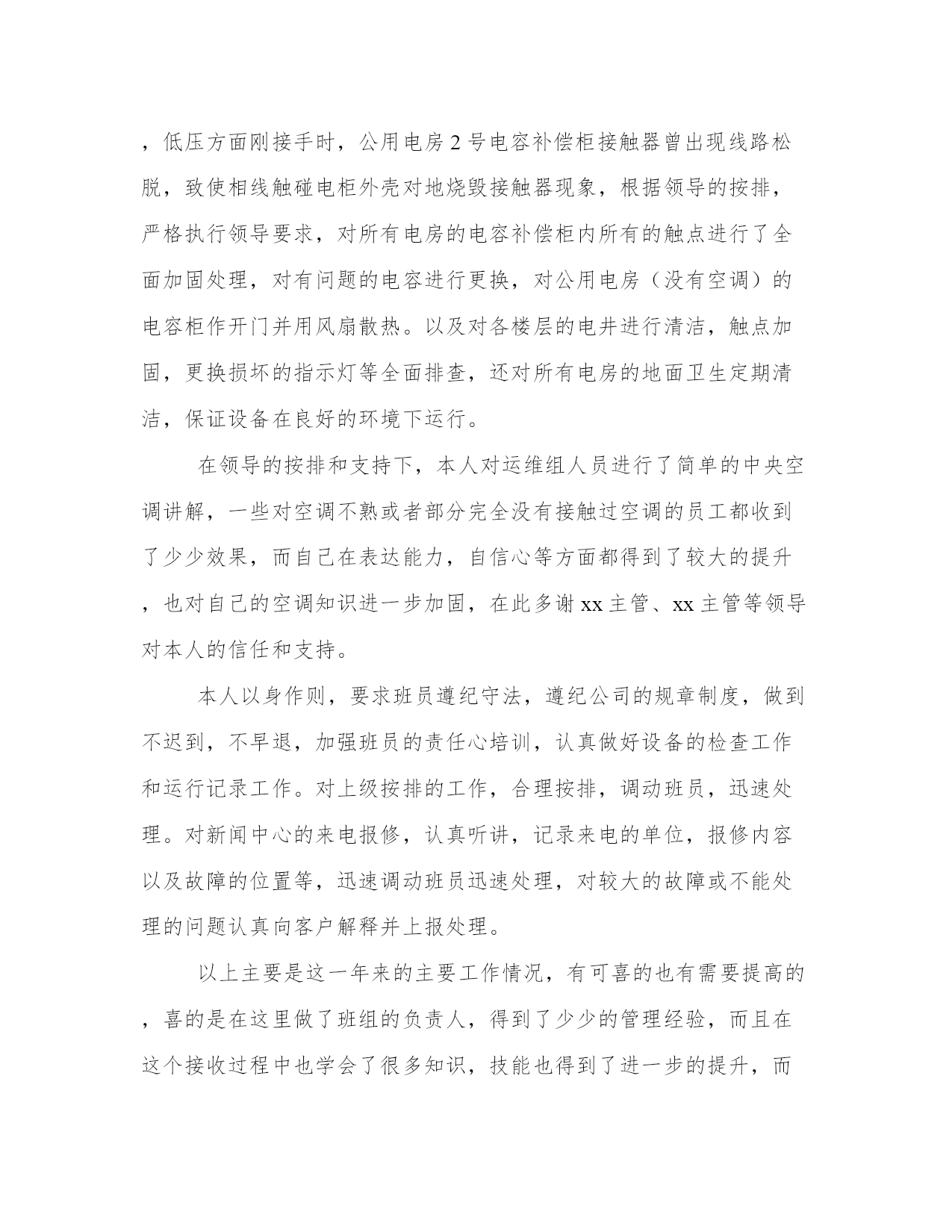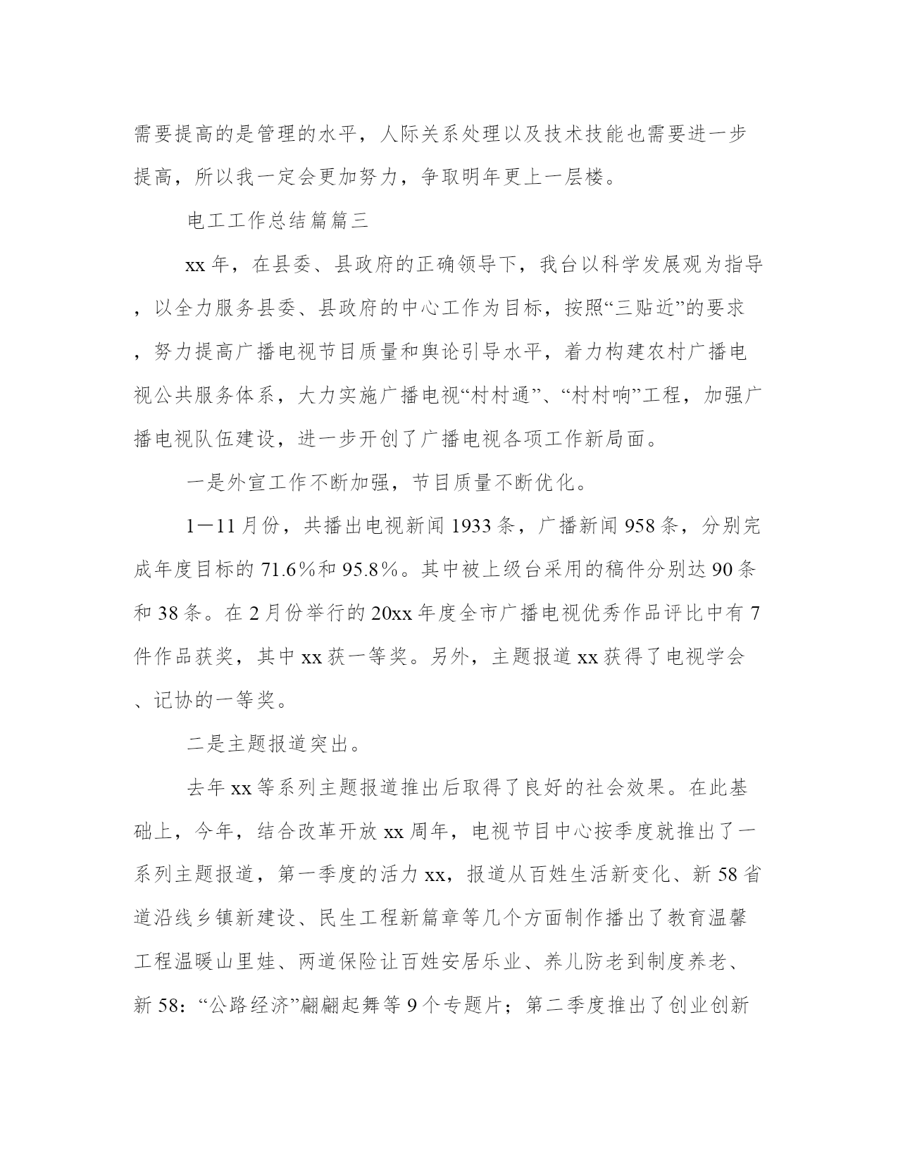 最新电工工作总结篇弱电工作总结(模板18篇)当工作或学习进行到一定阶段或告一段落时,需要回过头来对所做的工作认真地分析分析一下,肯定成绩,找出问题,归纳出经验教训,提高认识,明确方向,以便进一步做好工作,并把这些用文字表述出来,就叫做总结。那么,我们该怎么写总结呢?那么下面我就给大家讲一讲总结怎么写才比较好,我们一起来看一看吧。电工工作总结篇篇一20xx年在忙碌有序的工作中过去了,回顾这一年的工作,我认为主要有两个大的方面:1、做每一项工作都按照安全规范流程操作,杜绝了安全事故;3、xx月到xx月主要就是总店xxxx的装修调整以及xxxx超市开业的准备工作。xxxxxx楼的装修是今年最大的工程,涉及的设施较多,工作量大。扶梯的更换、电路的调整、顶棚的装修、各个专厅的装修跟进、及专厅用电的布局及跟进都需要设备去做。因此这xx个月基本每天都要加班,可我没有被累、工作量所吓倒,发扬中泽不怕苦与累的精神,工作积极主动、认真负责、思路清晰圆满完成公司交给的各项工作,为总店东楼装修工作做出了自己的贡献。xx月份在有xxxx楼装修工作的情况下,又有新店xxxx超市的准备工作。原本设备部的人员就不足,又临近中秋节各个门店也比较繁忙没有什么人员可以抽调的。面对工作我们设备一帮人没有畏惧,严格按照公司的要求及时准备好开业所需的各项设备。对需要用电的设施,从总的灯带照明到每个需要用的一个插座,ups的安装、租赁户的用电施工,都做到细致到位。经过不懈努力,顺利完成了东楼装修及xxxx超市开业的相关工作。4、xx月份以后的主要工作,除去日常的巡店工作,门店需要的部分维修工作,就是提前对各个门店冬季需要进行保暖的水管进行统计汇总,并对各个店需要保暖的全部进行了处理,为水管的过冬做好了准备,另一项主要工作就是对闲置设备的整理。将闲置的货架设备以及附属配件全部集中到设备在柳花泊的仓库,对每一件都进行了分类整理,以便以后的使用。在新的一年里,继续发扬中泽不怕苦、不怕累的精神,严格遵守安全操作规范及公司的各项管理规定,在领导的指导下及时、安全、高效、节约的完成各项工作。电工工作总结篇篇二20xx年,也是本人在xx物业有限公司工程部工作的第二年,在这一年的时间里,本人能够遵纪守法,认真学习,努力钻研,扎实工作,以勤勤恳恳,兢兢业业的态度对待本职工作,在运维岗位上发挥了应有的作用,作出了贡献,总结主要如下几方面:今年,根据公司工作的按排,本人在xx月份由xx调至xx新闻中心运维组,从事电工维修。在岗位变动过程中,本人能够顾全大局,服从领导按排;接收期间,执行领导的指示,对所负责的交接项目进行认真检查,对异常,损坏,故障等有问题的设备第一时间上报,要求原单位物业及时处理,协助领导做好接收工作。初来新闻中心,对这里的环境,设备都是完全不熟悉,而原百花物业也不配合,所以很多东西都是靠自己以往的经验通过摸索,思考和总结,再加上xx主管、xx主管的亲自讲解,培训以及按排一些有非常丰富经验的师傅前来讲解,现在对这里的地理位置、中央空调系统、高低压电路系统、消防系统、生活用水和园林绿化系统、电梯系统等都相当熟悉,可以独立上岗。中央空调方面,根据客户的需求,季节、天气情况,合理控制中央空调,并做好运行记录工作,对各项参数认真看,发现异常认真分析原因并上报,通知保养单位迅速前来处理。保养方面,因原物业公司对以前的中央空调系统完全没有做保养工作,致使冷却系统内壁生锈,损坏,根据领导的按排,严格执行领导的要求,加强外单位的保养监督工作,按排班员专人监督跟进,要求做到每星期定期清洗,每月定期加药水,有保养不到位的地方要求其立刻处理,防止外单位保养人员,马虎了事,致使冷却系统进一步损坏,保证空调主机正常运行。而另一方面,在xx主管的制定下,每月按排班员对机房地面、空调主机,冷却泵,冷冻泵的表面进行了清洁,并定期对冷却泵,冷冻泵轴承进行加雪油等保养工作。高低压系统方面,加强了高压保养单位的保养工作,要求每星期进行检查俩次,发现问题及时前来处理,低压方面刚接手时,公用电房2号电容补偿柜接触器曾出现线路松脱,致使相线触碰电柜外壳对地烧毁接触器现象,根据领导的按排,严格执行领导要求,对所有电房的电容补偿柜内所有的触点进行了全面加固处理,对有问题的电容进行更换,对公用电房(没有空调)的电容柜作开门并用风扇散热。以及对各楼层的电井进行清洁,触点加固,更换损坏的指示灯等全面排查,还对所有电房的地面卫生定期清洁,保证设备在良好的环境下运行。在领导的按排和支持下,本人对运维组人员进行了简单的中央空调讲解,一些对空调不熟或者部分完全没有接触过空调的员工都收到了少少效果,而自己在表达能力,自信心等方面都得到了较大的提升,也对自己的空调知识进一步加固,在此多谢xx主管、xx主管等领导对