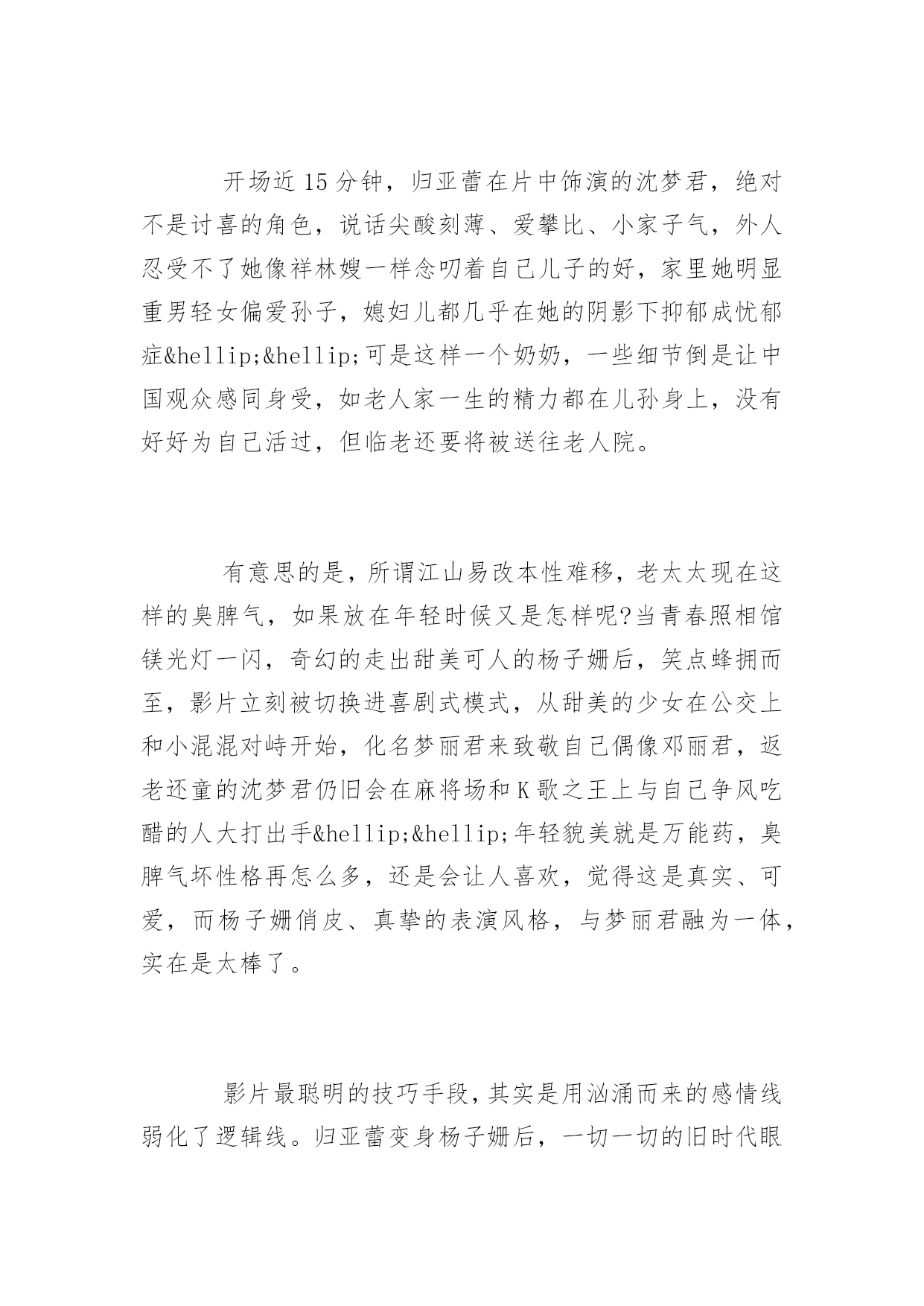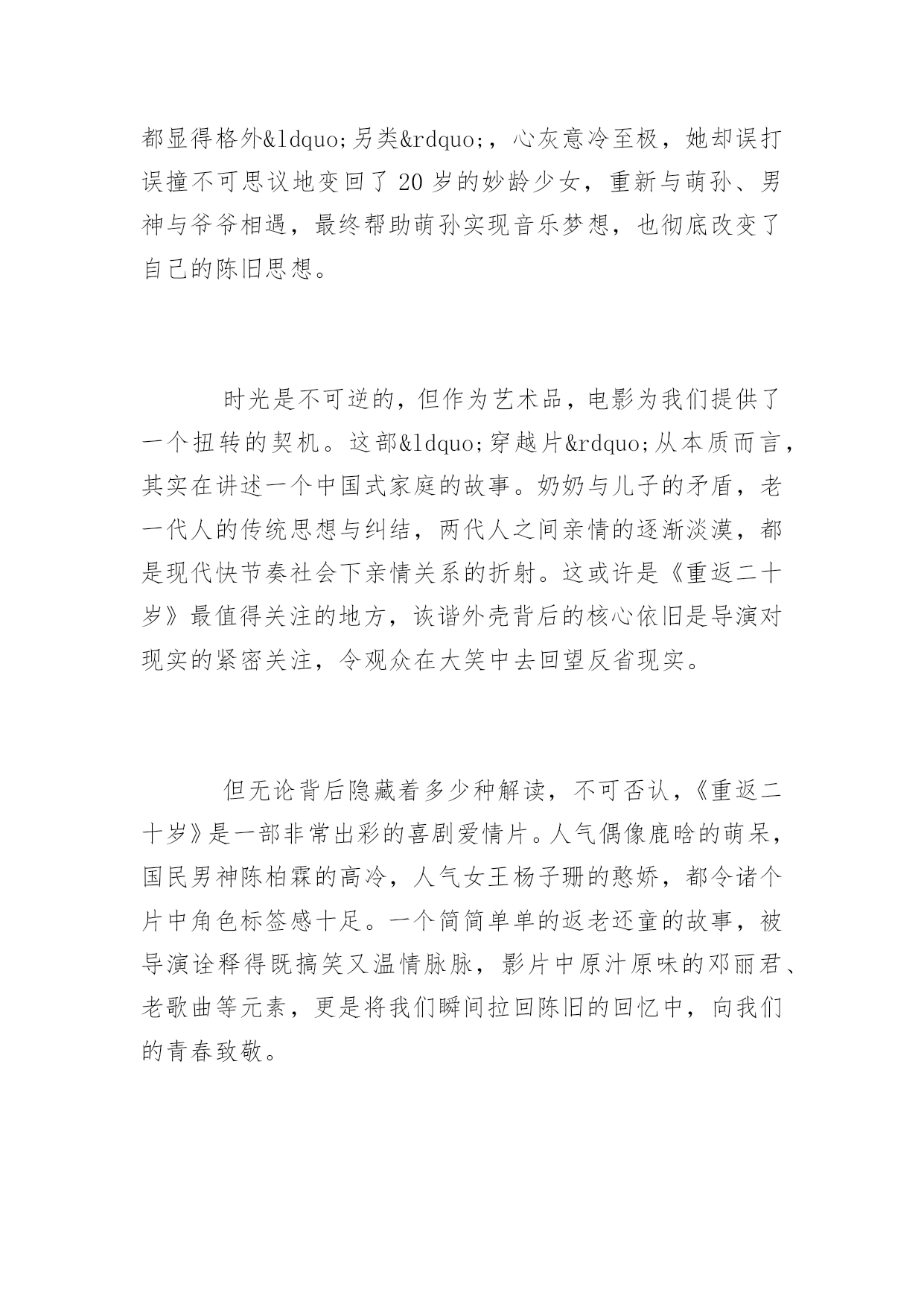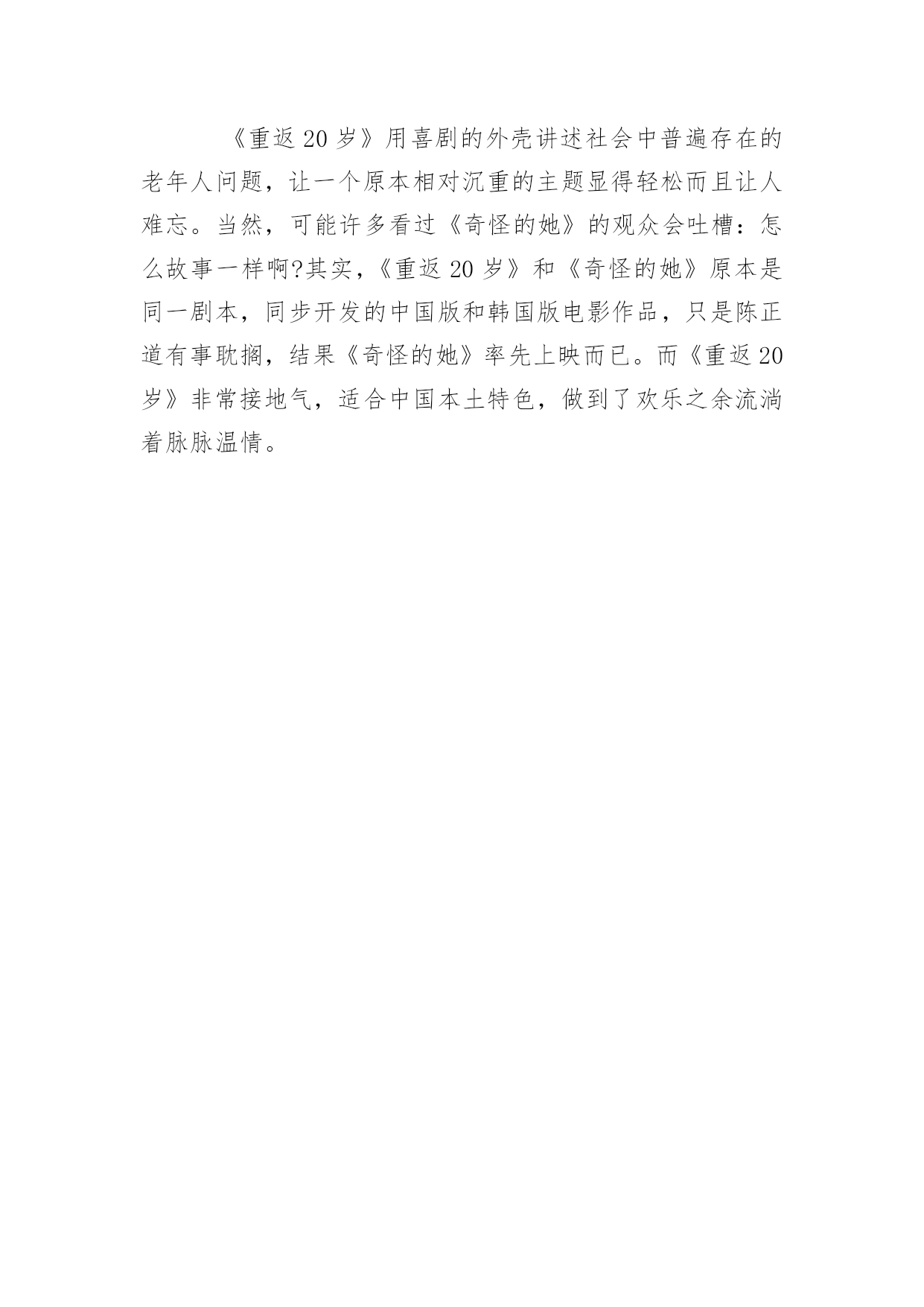 重返20岁观后感这部电影讲述了七十岁的老奶奶突然变身二十岁的妙龄少女,以新的身份投入到了新的生活,并且邂逅了美美的爱情,真是期待里面所有人的演技,有老戏骨归亚蕾老师,还有著名的演员杨子姗,还有内地新人鹿晗以及著名的导演陈正道陈导!该片可谓是大牌云集!重返20岁观后感_第1篇我们总爱用流水来比喻时光,因为一旦错过某些事,或许就是终生的遗憾,只能在余生中不断追悔,悄然等候时光逝去。想象一下,如果时光能够倒流,你会选择做什么?《重返二十岁》,给了我们一个重新选择的机会——一个白发苍苍的老妇人,一个年轻貌美可爱呆萌的妙龄少女,究竟会发生多少不可思议的有趣事儿。作为韩国影史喜剧票房冠军《奇怪的她》的孪生姐妹篇,《重返二十岁》自拍摄起便成了当之无愧的话题之王。70岁的奶奶与儿子一家四口格格不入,无论是生活习惯或想法,都显得格外“另类”,心灰意冷至极,她却误打误撞不可思议地变回了20岁的妙龄少女,重新与萌孙、男神与爷爷相遇,最终帮助萌孙实现音乐梦想,也彻底改变了自己的陈旧思想。时光是不可逆的,但作为艺术品,电影为我们提供了一个扭转的契机。这部“穿越片”从本质而言,其实在讲述一个中国式家庭的故事。奶奶与儿子的矛盾,老一代人的传统思想与纠结,两代人之间亲情的逐渐淡漠,都是现代快节奏社会下亲情关系的折射。这或许是《重返二十岁》最值得关注的地方,诙谐外壳背后的核心依旧是导演对现实的紧密关注,令观众在大笑中去回望反省现实。但无论背后隐藏着多少种解读,不可否认,《重返二十岁》是一部非常出彩的喜剧爱情片。人气偶像鹿晗的萌呆,国民男神陈柏霖的高冷,人气女王杨子珊的憨娇,都令诸个片中角色标签感十足。一个简简单单的返老还童的故事,被导演诠释得既搞笑又温情脉脉,影片中原汁原味的邓丽君、老歌曲等元素,更是将我们瞬间拉回陈旧的回忆中,向我们的青春致敬。电影里,最难演绎的角色当属杨子珊饰演的奶奶。她所扮演的角色不仅要演绎出少女活泼可爱的天性,更要还原由奶奶“回归”少女的心路历程,这对演员自身是极大的挑战,如何纯靠自身演技诠释出角色的挣扎与矛盾,杨子珊给我们交出了一份完美的答案。看似刁蛮清纯的她,却演绎出了老人固执优雅的一面,最出彩的当属片中惟妙惟肖的“广场舞”,逗翻台下一干观众。同时,影片中,衣服时尚、造型多变的她,让人看到了杨子姗时尚的一面;与陈柏霖、鹿晗间的感情纠葛,让人看到了她演技细腻的一面;影片中,她的一展歌喉,让人看到了她对于音乐上的天赋与魅力。这个角色完全不同于《致青春》中那个霸道任性的郑薇,已然带给我们足够多的惊喜。可以预见的是,孟丽君这个角色必将成为杨子姗演绎生涯中又一经典。而为了饰演好奶奶的角色,杨子珊不但苦读剧本,更是代入了自己对爷爷奶奶的回忆,仔细模仿归亚蕾的表演,力求做到最大程度的还原。她的精湛演出换回了媒体的高呼声,甚至被导演盛赞为“这代演员中表演最能打动自己的一位”。凭借着电影的巧妙构思与演员的出彩表演,《重返二十岁》很容易让人联想到一些经典之作,譬如《本杰明巴顿奇事》、《童梦奇缘》、《大话西游》等。时间倒流并不现实,但想象着可倒流的时间,从而珍惜眼前人,活好当下每一天,这才是电影带给我们的最大意义。重返20岁观后感_第2篇“我做了一个很美的梦,可能说出来你都不相信”电影的主线是奇幻影片,对嘛,时光是无法倒流的,可是上天偏偏给了她这样一个机会,可以让她从走青春。重新回到20岁的她,青春靓丽,魅力四射。也重新遇到了心动的人。可是命运好像和她开了一个玩笑,突如其来的意外让她面临选择。是选择拯救心爱的孙子,还是留住青春重遇爱情。最后,他放弃了自己可以重新来过的人生,又回到从前。看完以后开始思考,我想换做是谁,都会和奶奶做出一样的选择吧。这个世界上,愿意为你无条件付出的只有家人,是亲情最温暖。或许很多时候会念你,那是因为是为了你好,是爱的表现。有很多时候会偷偷看着妈妈的侧脸,看着她日渐花白的头发,看着她逐渐增多的皱纹,心里就会大喊:时间啊你慢点走!可是时光匆匆流走一去不再有。所以,珍惜眼前人,且行且珍惜。重返20岁观后感_第3篇喜剧片,最高的标准就是既能让你痛快的笑,也能让你肆意的哭。开场近15分钟,归亚蕾在片中饰演的沈梦君,绝对不是讨喜的角色,说话尖酸刻薄、爱攀比、小家子气,外人忍受不了她像祥林嫂一样念叨着自己儿子的好,家里她明显重男轻女偏爱孙子,媳妇儿都几乎在她的阴影下抑郁成忧郁症……可是这样一个奶奶,一些细节倒是让中国观众感同身受,如老人家一生的精力都在儿孙身上,没有好好为自己活过,但临老还要将被送往老人