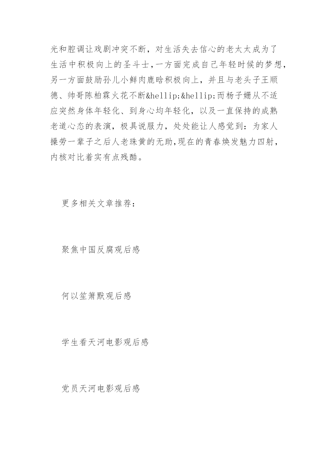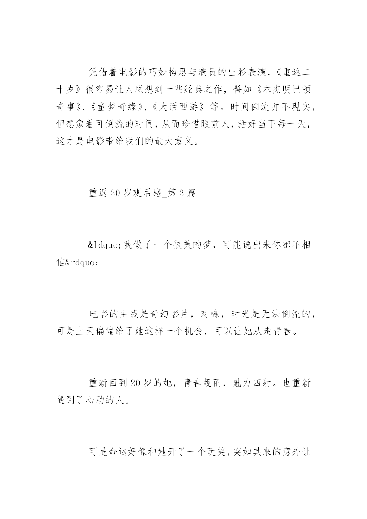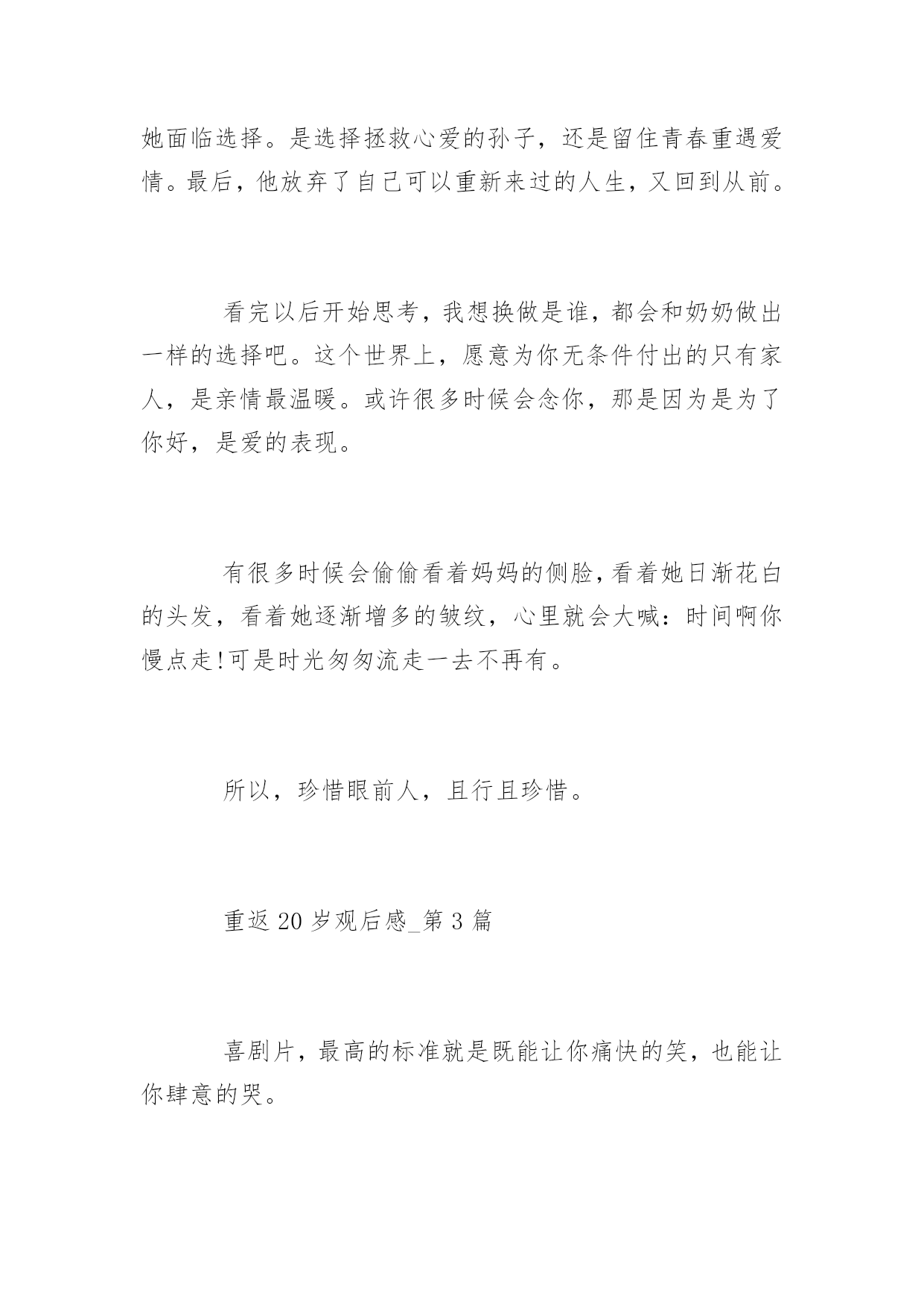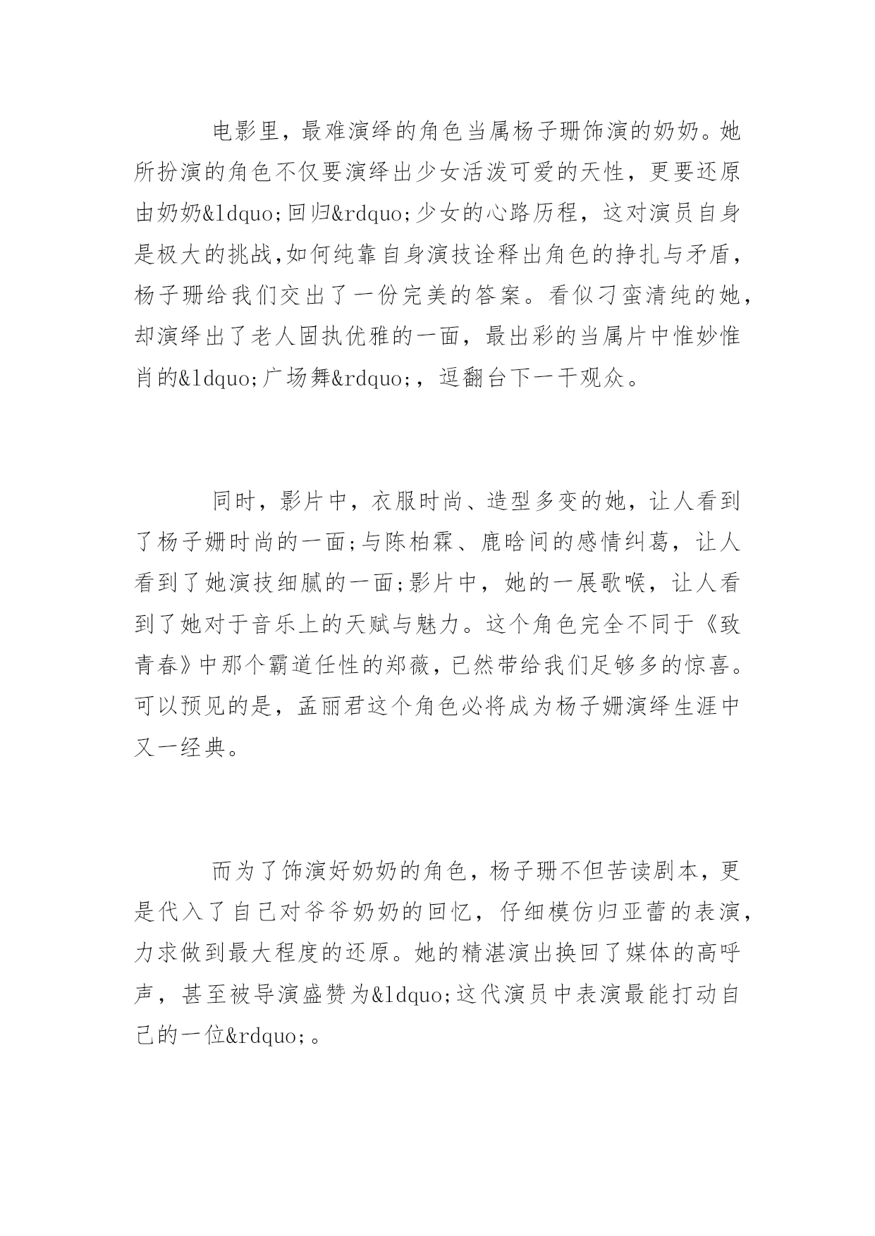 重返20岁观后感这部电影讲述了七十岁的老奶奶突然变身二十岁的妙龄少女,以新的身份投入到了新的生活,并且邂逅了美美的爱情,真是期待里面所有人的演技,有老戏骨归亚蕾老师,还有著名的演员杨子姗,还有内地新人鹿晗以及著名的导演陈正道陈导!该片可谓是大牌云集!重返20岁观后感_第1篇我们总爱用流水来比喻时光,因为一旦错过某些事,或许就是终生的遗憾,只能在余生中不断追悔,悄然等候时光逝去。想象一下,如果时光能够倒流,你会选择做什么?《重返二十岁》,给了我们一个重新选择的机会——一个白发苍苍的老妇人,一个年轻貌美可爱呆萌的妙龄少女,究竟会发生多少不可思议的有趣事儿。作为韩国影史喜剧票房冠军《奇怪的她》的孪生姐妹篇,《重返二十岁》自拍摄起便成了当之无愧的话题之王。70岁的奶奶与儿子一家四口格格不入,无论是生活习惯或想法,都显得格外“另类”,心灰意冷至极,她却误打误撞不可思议地变回了20岁的妙龄少女,重新与萌孙、男神与爷爷相遇,最终帮助萌孙实现音乐梦想,也彻底改变了自己的陈旧思想。时光是不可逆的,但作为艺术品,电影为我们提供了一个扭转的契机。这部“穿越片”从本质而言,其实在讲述一个中国式家庭的故事。奶奶与儿子的矛盾,老一代人的传统思想与纠结,两代人之间亲情的逐渐淡漠,都是现代快节奏社会下亲情关系的折射。这或许是《重返二十岁》最值得关注的地方,诙谐外壳背后的核心依旧是导演对现实的紧密关注,令观众在大笑中去回望反省现实。但无论背后隐藏着多少种解读,不可否认,《重返二十岁》是一部非常出彩的喜剧爱情片。人气偶像鹿晗的萌呆,国民男神陈柏霖的高冷,人气女王杨子珊的憨娇,都令诸个片中角色标签感十足。一个简简单单的返老还童的故事,被导演诠释得既搞笑又温情脉脉,影片中原汁原味的邓丽君、老歌曲等元素,更是将我们瞬间拉回陈旧的回忆中,向我们的青春致敬。电影里,最难演绎的角色当属杨子珊饰演的奶奶。她所扮演的角色不仅要演绎出少女活泼可爱的天性,更要还原由奶奶“回归”少女的心路历程,这对演员自身是极大的挑战,如何纯靠自身演技诠释出角色的挣扎与矛盾,杨子珊给我们交出了一份完美的答案。看似刁蛮清纯的她,却演绎出了老人固执优雅的一面,最出彩的当属片中惟妙惟肖的“广场舞”,逗翻台下一干观众。同时,影片中,衣服时尚、造型多变的她,让人看到了杨子姗时尚的一面;与陈柏霖、鹿晗间的感情纠葛,让人看到了她演技细腻的一面;影片中,她的一展歌喉,让人看到了她对于音乐上的天赋与魅力。这个角色完全不同于《致青春》中那个霸道任性的郑薇,已然带给我们足够多的惊喜。可以预见的是,孟丽君这个角色必将成为杨子姗演绎生涯中又一经典。而为了饰演好奶奶的角色,杨子珊不但苦读剧本,更是代入了自己对爷爷奶奶的回忆,仔细模仿归亚蕾的表演,力求做到最大程度的还原。她的精湛演出换回了媒体的高呼声,甚至被导演盛赞为“这代演员中表演最能打动自己的一位”。凭借着电影的巧妙构思与演员的出彩表演,《重返二十岁》很容易让人联想到一些经典之作,譬如《本杰明巴顿奇事》、《童梦奇缘》、《大话西游》等。时间倒流并不现实,但想象着可倒流的时间,从而珍惜眼前人,活好当下每一天,这才是电影带给我们的最大意义。重返20岁观后感_第2篇“我做了一个很美的梦,可能说出来你都不相信”电影的主线是奇幻影片,对嘛,时光是无法倒流的,可是上天偏偏给了她这样一个机会,可以让她从走青春。重新回到20岁的她,青春靓丽,魅力四射。也重新遇到了心动的人。可是命运好像和她开了一个玩笑,突如其来的意外让她面临选择。是选择拯救心爱的孙子,还是留住青春重遇爱情。最后,他放弃了自己可以重新来过的人生,又回到从前。看完以后开始思考,我想换做是谁,都会和奶奶做出一样的选择吧。这个世界上,愿意为你无条件付出的只有家人,是亲情最温暖。或许很多时候会念你,那是因为是为了你好,是爱的表现。有很多时候会偷偷看着妈妈的侧脸,看着她日渐花白的头发,看着她逐渐增多的皱纹,心里就会大喊:时间啊你慢点走!可是时光匆匆流走一去不再有。所以,珍惜眼前人,且行且珍惜。重返20岁观后感_第3篇喜剧片,最高的标准就是既能让你痛快的笑,也能让你肆意的哭。开场近15分钟,归亚蕾在片中饰演的沈梦君,绝对不是讨喜的角色,说话尖酸刻薄、爱攀比、小家子气,外人忍受不了她像祥林嫂一样念叨着自己儿子的好,家里她明显重男轻女偏爱孙子,媳妇儿都几乎在她的阴影下抑郁成忧郁症……可是这样一个奶奶,一些细节倒是让中国观众感同身受,如老人家一生的精力都在儿孙身上,没有好好为自己活过,但临老还要将被送往老人