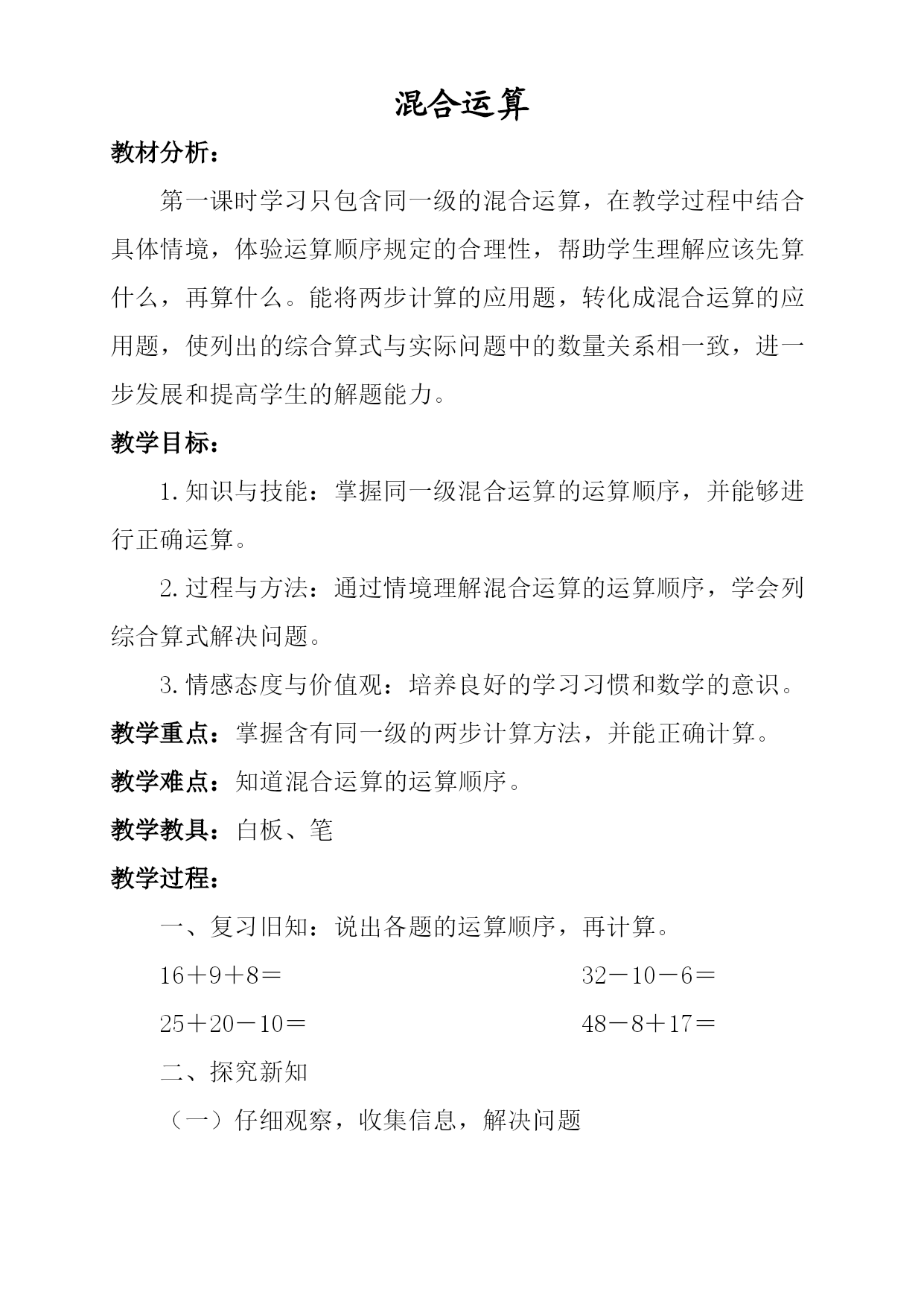 混合运算教材分析:第一课时学习只包含同一级的混合运算,在教学过程中结合具体情境,体验运算顺序规定的合理性,帮助学生理解应该先算什么,再算什么。能将两步计算的应用题,转化成混合运算的应用题,使列出的综合算式与实际问题中的数量关系相一致,进一步发展和提高学生的解题能力。教学目标:1.知识与技能:掌握同一级混合运算的运算顺序,并能够进行正确运算。2.过程与方法:通过情境理解混合运算的运算顺序,学会列综合算式解决问题。3.情感态度与价值观:培养良好的学习习惯和数学的意识。教学重点:掌握含有同一级的两步计算方法,并