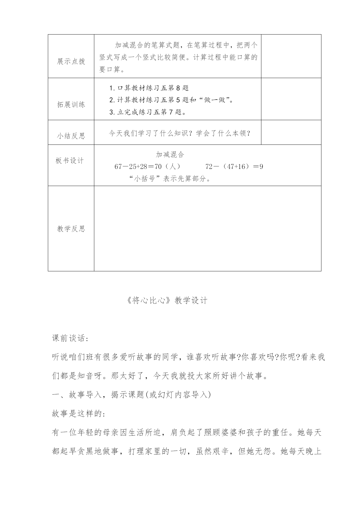 PAGEPAGE5加减混合教学设计资料教学目标1.使学生掌握加减混合运算的计算方法,理解加减混合所表示的意义,能正确计算。2.培养学生观察、比较和抽象概括能力,以及应用所学知识解决实际问题的能力。3.在学习活动中,激发学生的学习兴趣,使学生体会到生活中处处有数学。教学内容教科书的内容及练习十二的第1、2题。教具、学具准备图片、小棒、课件。教学设计一、创设情境,铺垫导入师:同学们,安徒生有一篇美丽的童话《丑小鸭》,大家听说过吗?这只受尽苦难的丑小鸭最终怎么样了呢?师:大家看屏幕,这里有3只丑小鸭