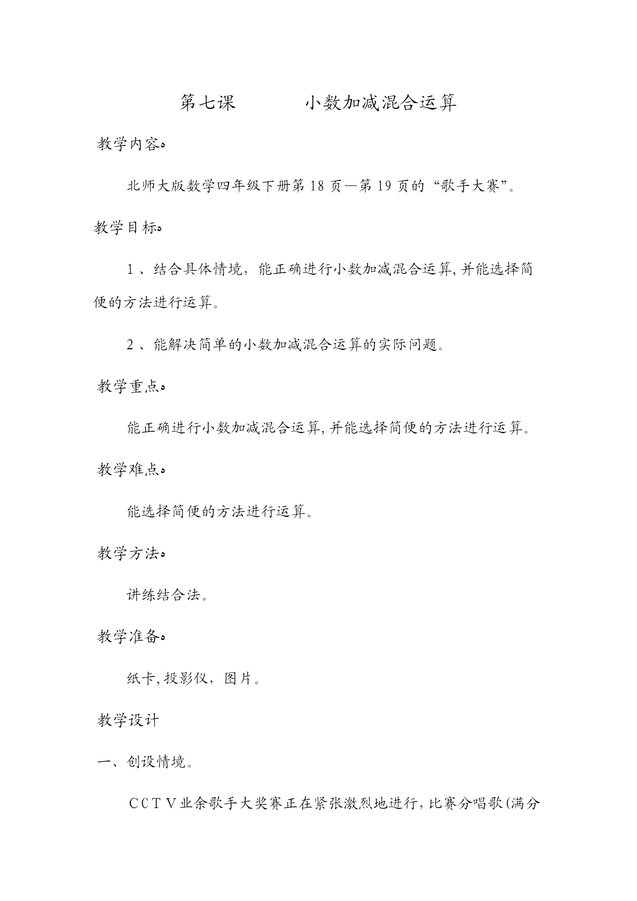 第七课小数加减混合运算教学内容ﻩ北师大版数学四年级下册—的“歌手大赛”。教学目标ﻩ1、结合具体情境,能正确进行小数加减混合运算,并能选择简便的方法进行运算。2、能解决简单的小数加减混合运算的实际问题。教学重点ﻩ能正确进行小数加减混合运算,并能选择简便的方法进行运算。教学难点ﻩ能选择简便的方法进行运算。教学方法ﻩ讲练结合法。教学准备ﻩ纸卡,投影仪,图片。教学设计一、创设情境。CCTV业余歌手大奖赛正在紧张激烈地进行,比赛分唱歌(满分9分)、综合素质(满分1分)两项,5号选手的专业得分是:8.50分、综合素质