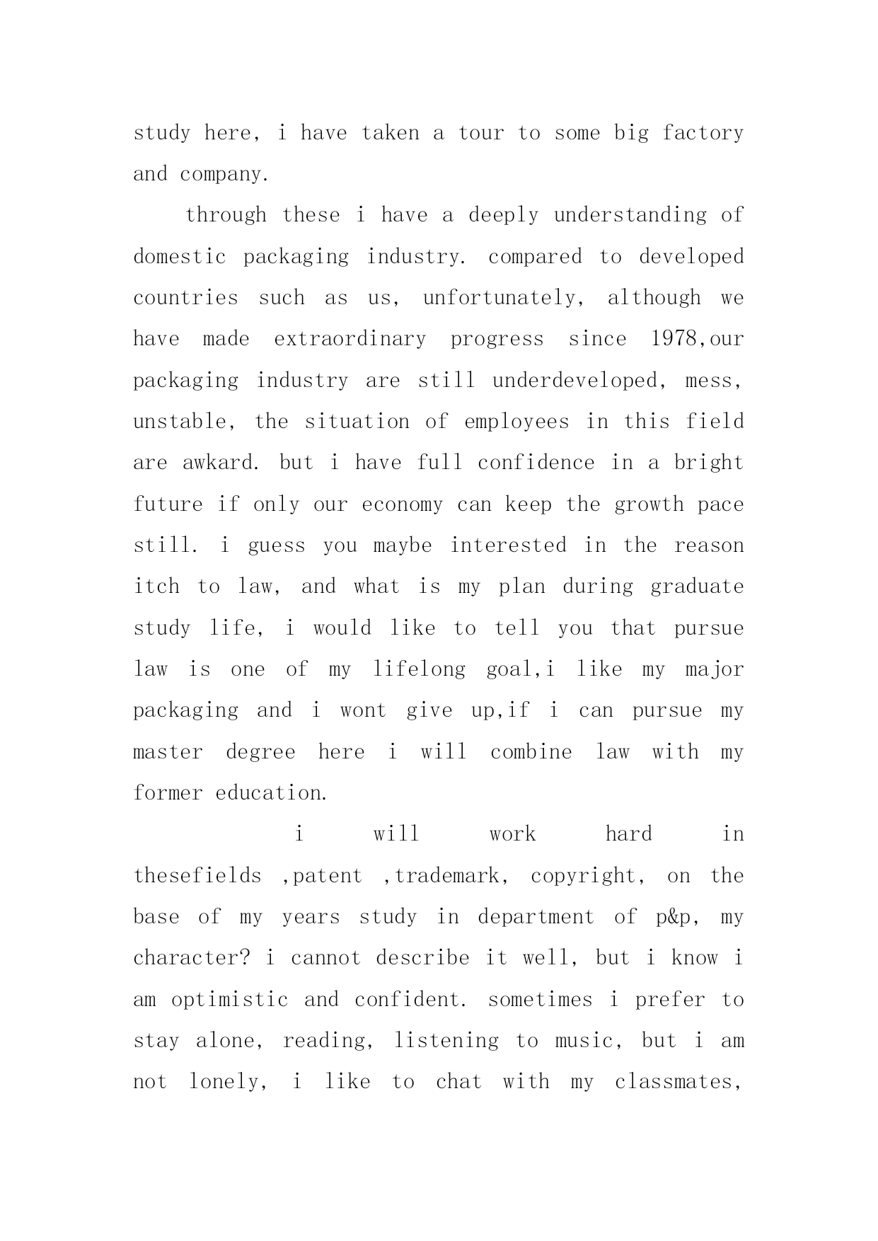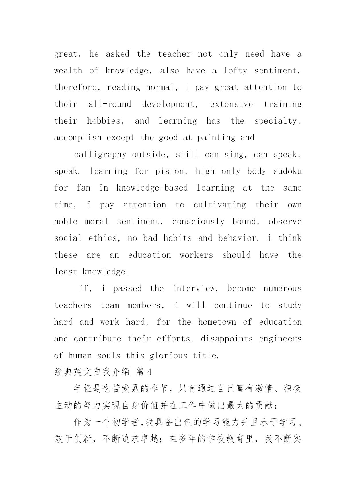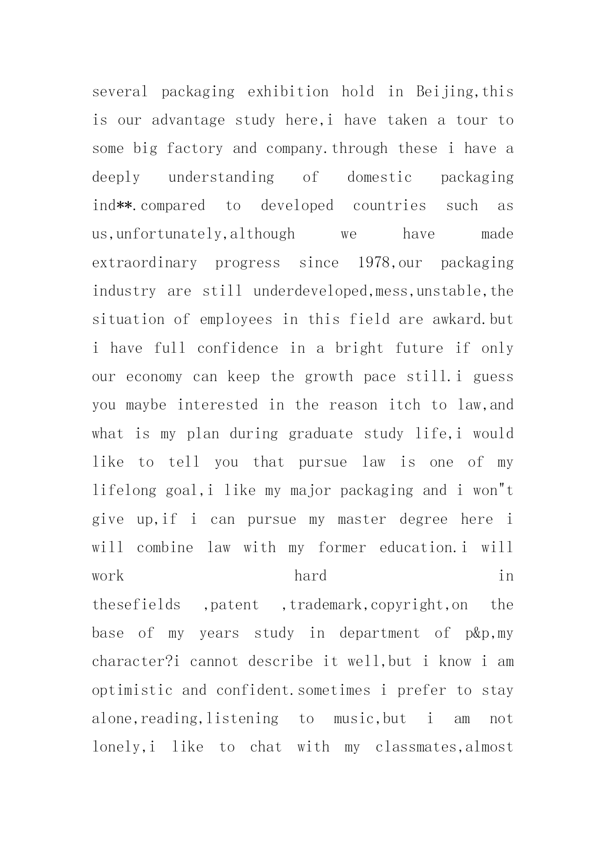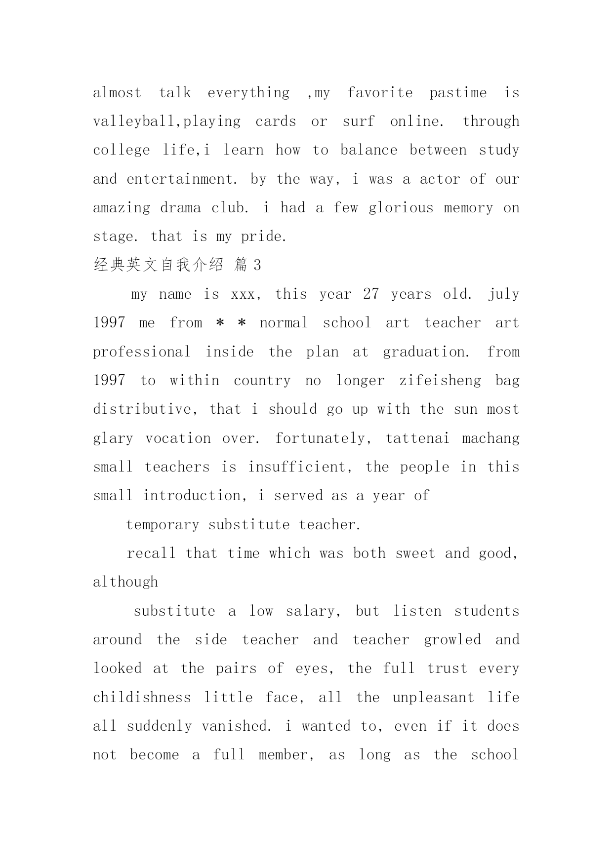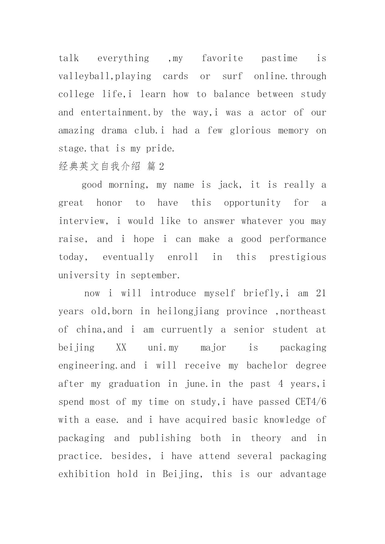 经典英文自我介绍经典英文自我介绍4篇当到达一个新的环境后,我们难以避免地要作出自我介绍,自我介绍是人与人进行沟通的出发点。写自我介绍可不能随随便便哦,以下是小编帮大家整理的经典英文自我介绍4篇,欢迎阅读,希望大家能够喜欢。经典英文自我介绍篇1goodmorning,mynameisjack,itisreallyagreathonortohavethisopportunityforainterview,iwouldliketoanswerwhateveryoumayraise,andihopeicanmakeagoodperformancetoday,eventuallyenrollinthisprestigiousuniversityinseptember.nowiwillintroducemyselfbriefly,iam21yearsold,borninheilongjiangprovince,northeastofchina,andiamcurruentlyaseniorstudentatbeijingXXuni.mymajorispackagingengineering.andiwillreceivemybachelordegreeaftermygraduationinjune.inthepast4years,ispendmostofmytimeonstudy,ihavepassedCET4/6withaease.andihaveacquiredbasicknowledgeofpackagingandpublishingbothintheoryandinpractice.besides,ihaveattendseveralpackagingexhibitionholdinBeijing,thisisouradvantagestudyhere,ihavetakenatourtosomebigfactoryandcompany.throughtheseihaveadeeplyunderstandingofdomesticpackagingind**.comparedtodevelopedcountriessuchasus,unfortunately,althoughwehavemadeextraordinaryprogresssince1978,ourpackagingindustryarestillunderdeveloped,mess,unstable,thesituationofemployeesinthisfieldareawkard.butihavefullconfidenceinabrightfutureifonlyoureconomycankeepthegrowthpacestill.iguessyoumaybeinterestedinthereasonitchtolaw,andwhatismyplanduringgraduatestudylife,iwouldliketotellyouthatpursuelawisoneofmylifelonggoal,ilikemymajorpackagingandiwon"tgiveup,ificanpursuemymasterdegreehereiwillcombinelawwithmyformereducation.iwillworkhardinthesefields,patent,trademark,copyright,onthebaseofmyyearsstudyindepartmentofp&p,mycharacter?icannotdescribeitwell,butiknowiamoptimisticandconfident.sometimesiprefertostayalone,reading,listeningtomusic,butiamnotlonely,iliketochatwithmyclassmates,almosttalkeverything,myfavoritepastimeisvalleyball,playingcardsorsurfonline.throughcollegelife,ilearnhowtobalancebetweenstudyandentertainment.bytheway,iwasaactorofouramazingdramaclub.ihadafewgloriousmemoryonstage.thatismypride.经典英文自我介绍篇2goodmorning,mynameisjack,itisreallyagreathonortohavethisopportunityforainterview,iwould