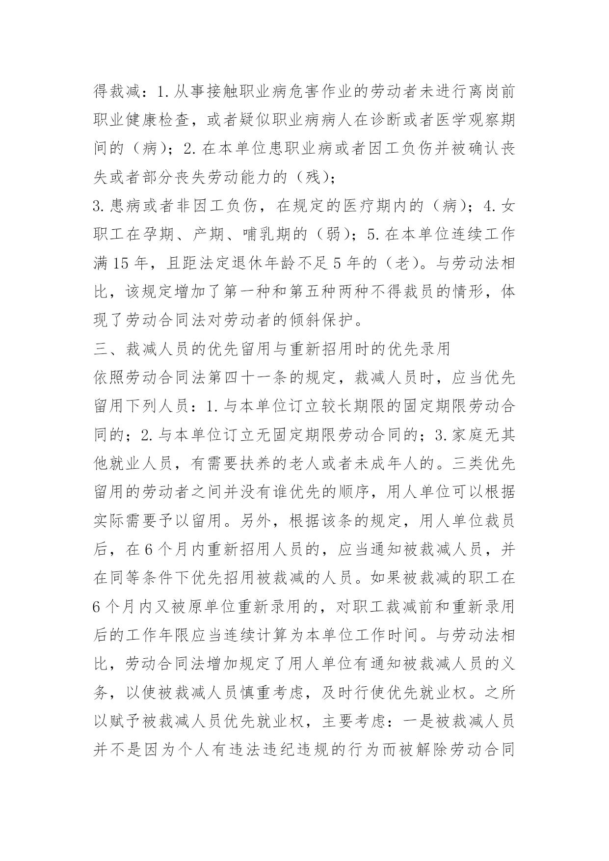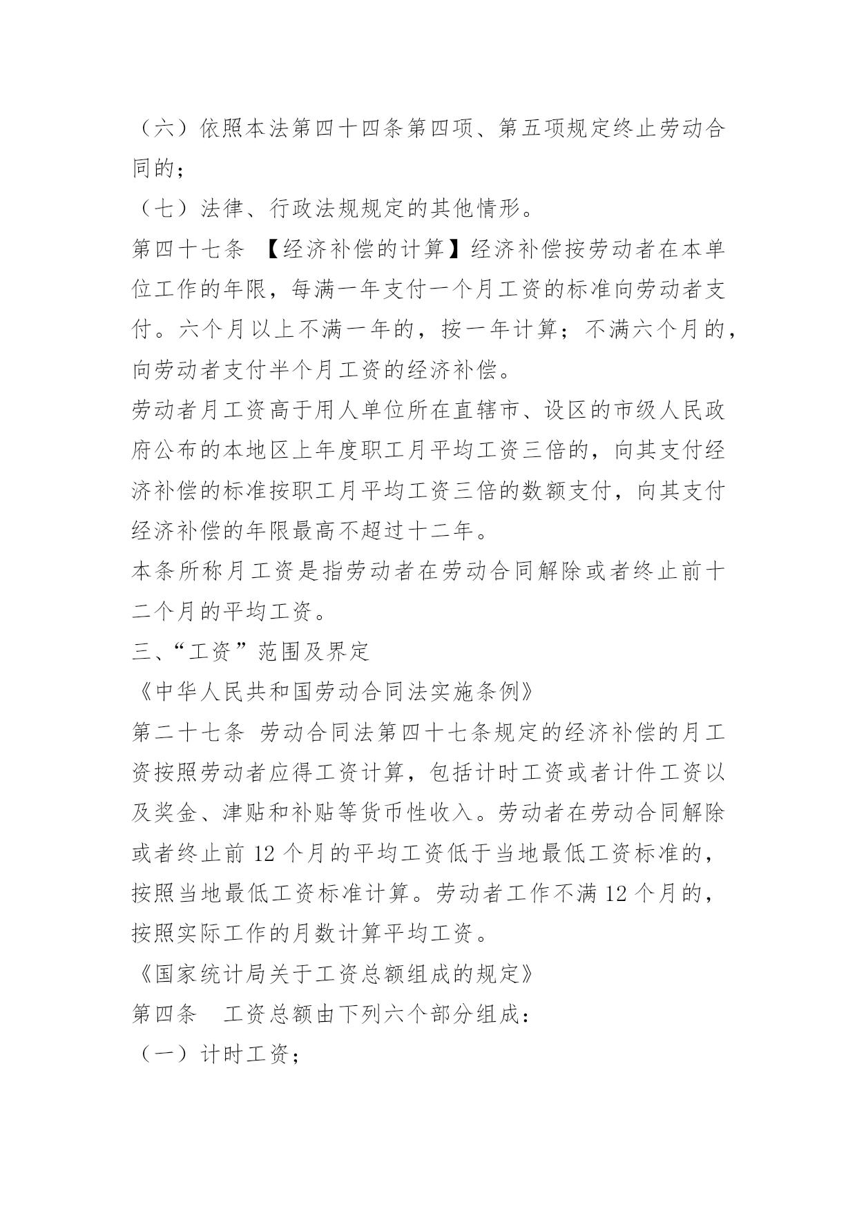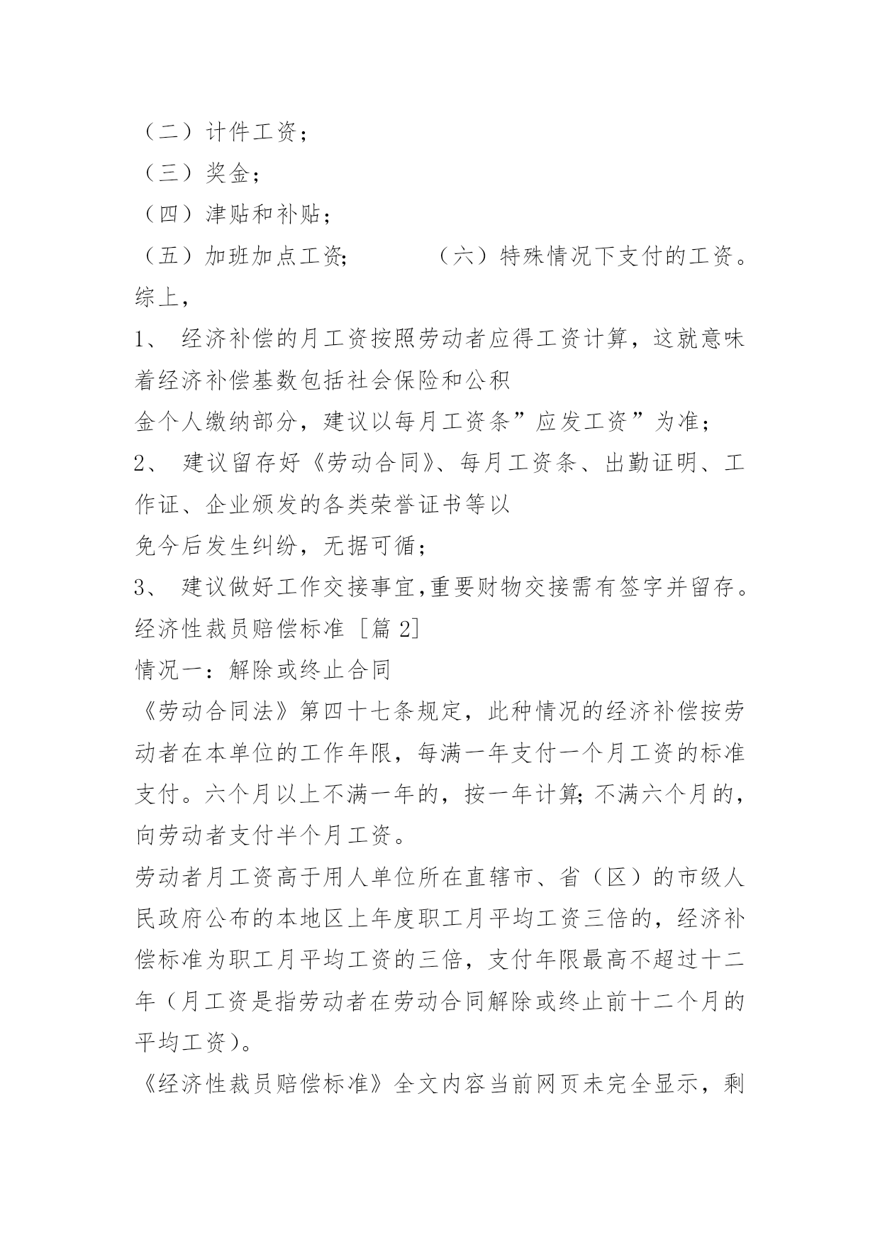 经济性裁员赔偿标准经济性裁员赔偿标准一、经济性裁员的法定情形、禁止性规定及法律依据《中华人民共和国劳动合同法》第四十一条【经济性裁员】有下列情形之一,需要裁减人员二十人以上或者裁减不足二十人但占企业职工总数百分之十以上的,用人单位提前三十日向工会或者全体职工说明情况,听取工会或者职工的意见后,裁减人员方案经向劳动行政部门报告,可以裁减人员:(一)依照企业破产法规定进行重整的;(二)生产经营发生严重困难的;(三)企业转产、重大技术革新或者经营方式调整,经变更劳动合同后,仍需裁减人员的;(四)其他因劳动合同订立时所依据的客观经济情况发生重大变化,致使劳动合同无法履行的。裁减人员时,应当优先留用下列人员:(一)与本单位订立较长期限的固定期限劳动合同的;(二)与本单位订立无固定期限劳动合同的;(三)家庭无其他就业人员,有需要扶养的老人或者未成年人的。用人单位依照本条第一款规定裁减人员,在六个月内重新招用人员的,应当通知被裁减的人员,并在同等条件下优先招用被裁减的人员。第四十二条【用人单位不得解除劳动合同的情形】劳动者有下列情形之一的,用人单位不得依照本法第四十条、第四十一条的规定解除劳动合同:(一)从事接触职业病危害作业的劳动者未进行离岗前职业健康检查,或者疑似职业病病人在诊断或者医学观察期间的;(二)在本单位患职业病或者因工负伤并被确认丧失或者部分丧失劳动能力的;(三)患病或者非因工负伤,在规定的医疗期内的;(四)女职工在孕期、产期、哺乳期的;(五)在本单位连续工作满十五年,且距法定退休年龄不足五年的;(六)法律、行政法规规定的其他情形。二、经济补偿支付标准第四十六条【经济补偿】有下列情形之一的,用人单位应当向劳动者支付经济补偿:(一)劳动者依照本法第三十八条规定解除劳动合同的;(二)用人单位依照本法第三十六条规定向劳动者提出解除劳动合同并与劳动者协商一致解除劳动合同的;(三)用人单位依照本法第四十条规定解除劳动合同的;(四)用人单位依照本法第四十一条第一款规定解除劳动合同的;(五)除用人单位维持或者提高劳动合同约定条件续订劳动合同,劳动者不同意续订的情形外,依照本法第四十四条第一项规定终止固定期限劳动合同的;(六)依照本法第四十四条第四项、第五项规定终止劳动合同的;(七)法律、行政法规规定的其他情形。第四十七条【经济补偿的计算】经济补偿按劳动者在本单位工作的年限,每满一年支付一个月工资的标准向劳动者支付。六个月以上不满一年的,按一年计算;不满六个月的,向劳动者支付半个月工资的经济补偿。劳动者月工资高于用人单位所在直辖市、设区的市级人民政府公布的本地区上年度职工月平均工资三倍的,向其支付经济补偿的标准按职工月平均工资三倍的数额支付,向其支付经济补偿的年限最高不超过十二年。本条所称月工资是指劳动者在劳动合同解除或者终止前十二个月的平均工资。三、“工资”范围及界定《中华人民共和国劳动合同法实施条例》第二十七条劳动合同法第四十七条规定的经济补偿的月工资按照劳动者应得工资计算,包括计时工资或者计件工资以及奖金、津贴和补贴等货币性收入。劳动者在劳动合同解除或者终止前12个月的平均工资低于当地最低工资标准的,按照当地最低工资标准计算。劳动者工作不满12个月的,按照实际工作的月数计算平均工资。《国家统计局关于工资总额组成的规定》第四条工资总额由下列六个部分组成:(一)计时工资;(二)计件工资;(三)奖金;(四)津贴和补贴;(五)加班加点工资;(六)特殊情况下支付的工资。综上,1、经济补偿的月工资按照劳动者应得工资计算,这就意味着经济补偿基数包括社会保险和公积金个人缴纳部分,建议以每月工资条”应发工资”为准;2、建议留存好《劳动合同》、每月工资条、出勤证明、工作证、企业颁发的各类荣誉证书等以免今后发生纠纷,无据可循;3、建议做好工作交接事宜,重要财物交接需有签字并留存。经济性裁员赔偿标准[篇2]情况一:解除或终止合同《劳动合同法》第四十七条规定,此种情况的经济补偿按劳动者在本单位的工作年限,每满一年支付一个月工资的标准支付。六个月以上不满一年的,按一年计算;不满六个月的,向劳动者支付半个月工资。劳动者月工资高于用人单位所在直辖市、省(区)的市级人民政府公布的本地区上年度职工月平均工资三倍的,经济补偿标准为职工月平均工资的三倍,支付年限最高不超过十二年(月工资是指劳动者在劳动合同解除或终止前十二个月的平均工资)。《经济性裁员赔偿标准》全文内容当前网页未完全显示,剩余内容请访问下一页查看。情况二:用人单位单方解除劳动合同《劳动合同法》第四十六条规定,下列情形下,用人单位单方解除劳动合同的,应向劳动者支付经济补偿:1.用人单位依照本法第四十条规定解除劳动合同的:即劳动者患病或非因公负伤,在规定的医疗期满后不能从事原工作,也不能从事由用人单位另行安排的