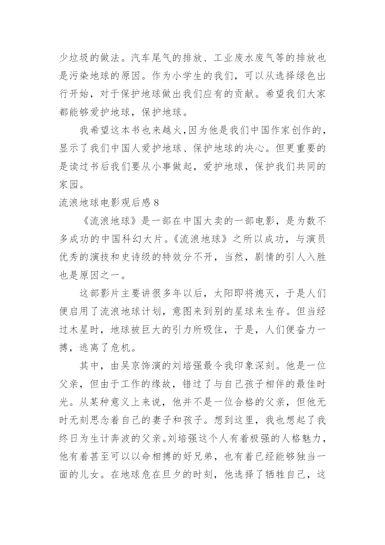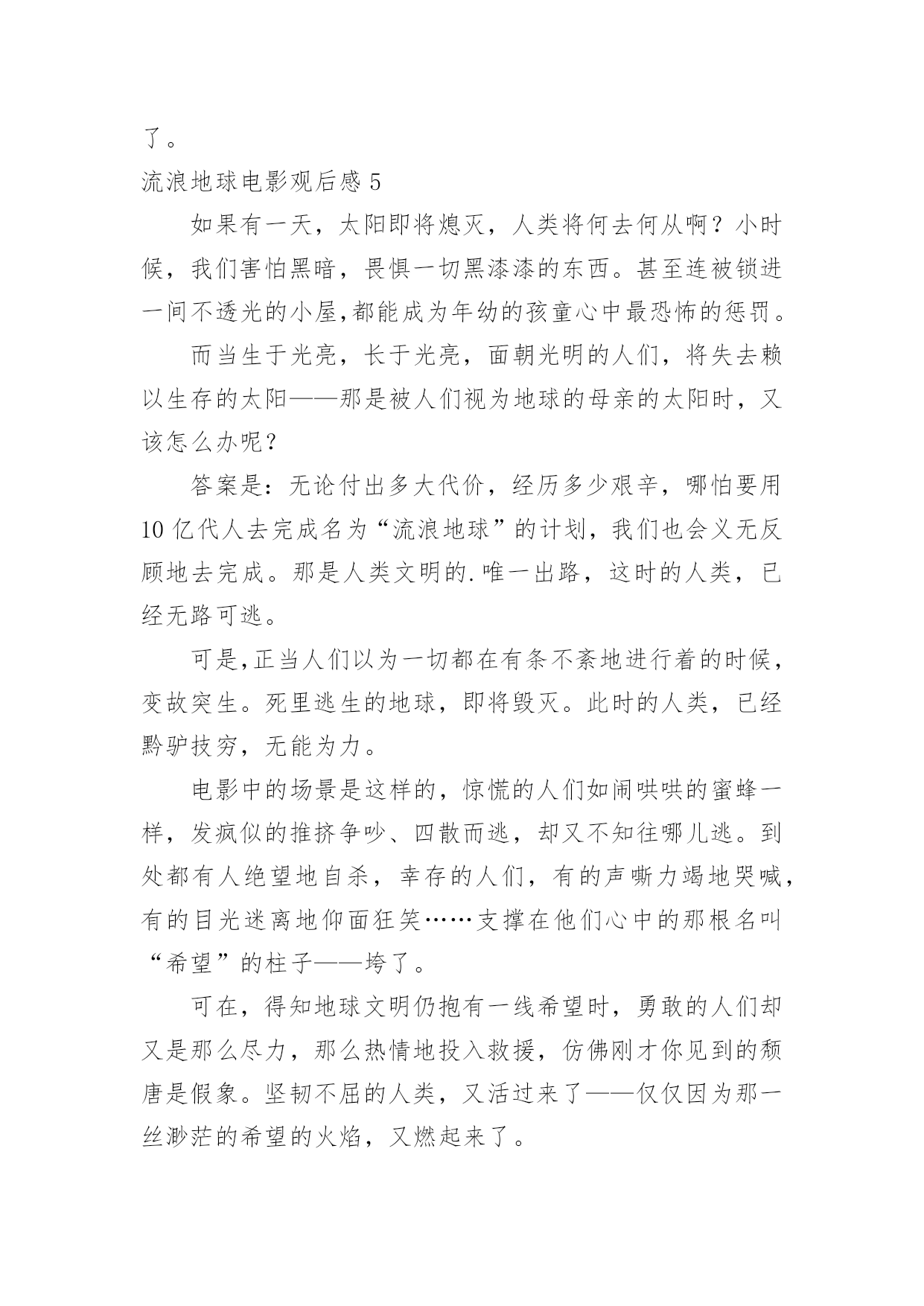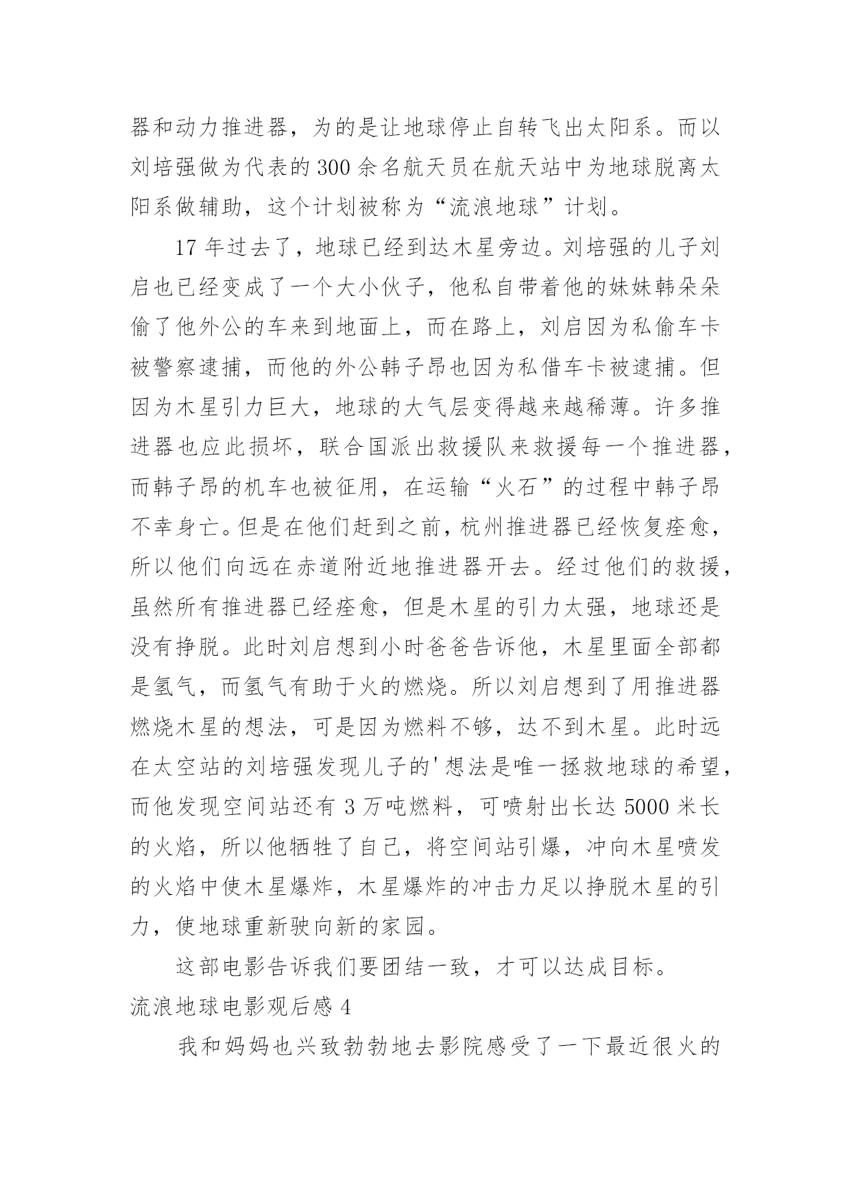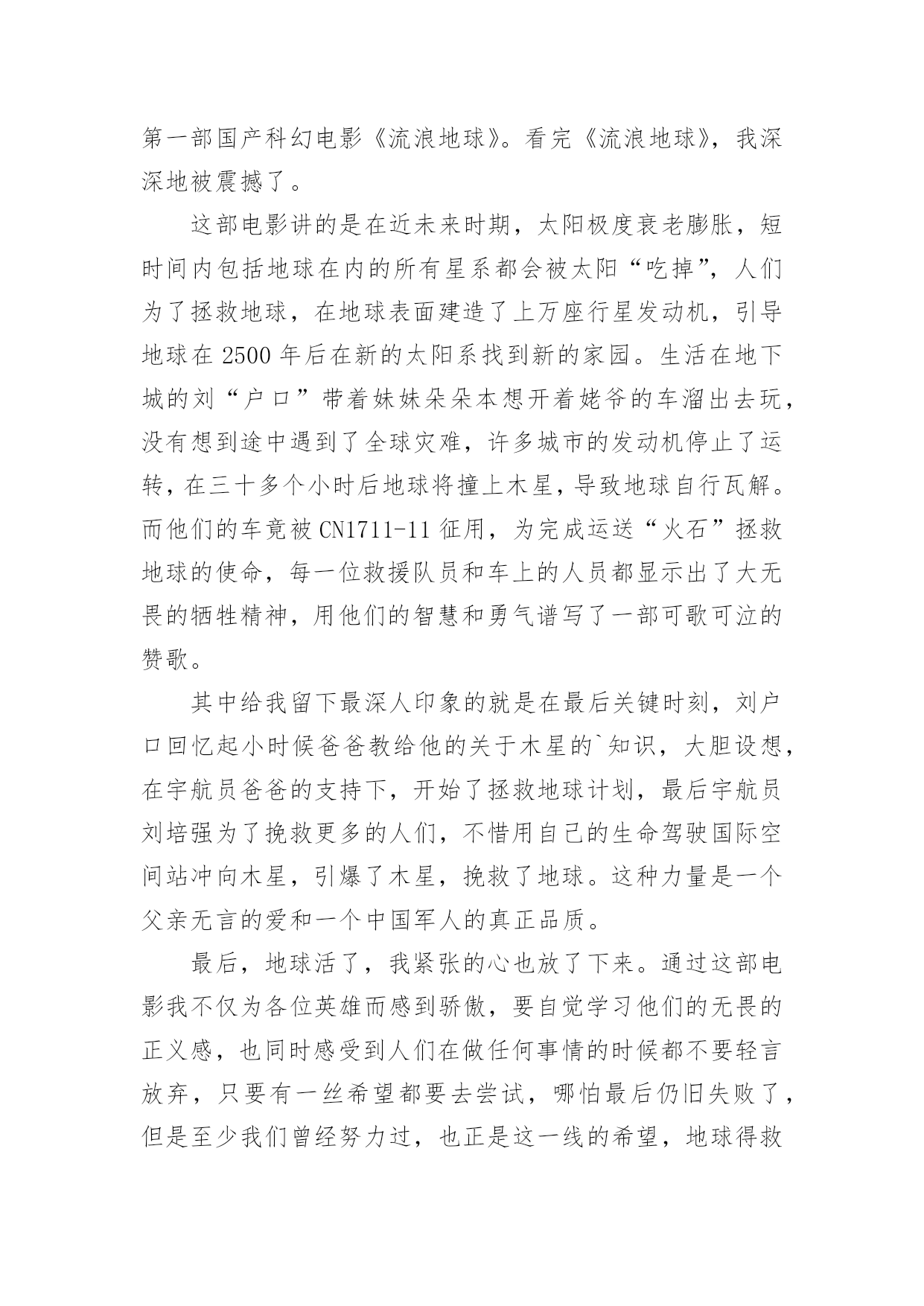 流浪地球电影观后感流浪地球电影观后感(精选15篇)当观看完一部影视作品后,相信大家的收获肯定不少吧,这时候,最关键的观后感怎么能落下!想必许多人都在为如何写好观后感而烦恼吧,下面是小编为大家整理的流浪地球电影观后感,欢迎大家借鉴与参考,希望对大家有所帮助。流浪地球电影观后感1在读过刘慈欣的《流浪地球》后,我就被深深吸引了进去,他通过平凡的方式写出了不凡的科幻!《流浪地球》以丰富的想象贯穿全文——20年前,地球航出了冥王星轨道,航出了太阳系,在寒冷的外太空继续着它孤独的逃亡生涯……读到这里,让我不禁佩服起作者刘慈欣,佩服起他对宇宙的认知,他真是把科幻描绘的像真的'一样;通过他的想象,他发明了地球发动机,它的威力非常大,可以照亮北半球,当在太阳爆炸的时刻地球发动机能够帮助人类逃亡太阳系,逃到其它恒星上寻找可生存的地方。“地球派”和“飞船派”是两队死对头。这些“角色”在情节中不断闪现,而就是这些“角色”为文章增添了许多色彩。人就要有丰富的想象,想像是成功的一半,只有美好的遐想是不行的,只有通过我们的努力才能得以实现,才能够驶向成功的彼岸!也许在实现理想的道路上,难免有崎岖和坎坷,但只要有打不垮的信念,希望之光就会驱散绝望之云!作者用丰富的想象,写出了我们不保护地球的严重后果,虽有地球发动机给予我们的帮助,但它也需要资源{各种山体},如果地球真的灭亡了,那我们就要坐着超音数速汽车到别的星球生存,爱护地球,别让他离我们而去!这本书的作者刘慈欣简直把科幻描写得神乎其神,他把我们的现实生活和宇宙紧紧相接在了一起,表面上看起来不足为奇,可慢慢的品尝,才能尝出真正的味道。读完这本书的时候,就感觉到科幻原来由许多不同形式。如——塑造写地球上不可出现的人或生命体,如通过写我们的生活联系到不可思议的事……它让我认识到了真正的科幻,也让我对科幻燃起了浓厚的兴趣!流浪地球电影观后感2最近,我看了一本让我非常有感触的书,这本书叫做《流浪地球》。《流浪地球》就是大刘的短篇科幻作品合集,但是不要因为短篇而小看它,大刘雄浑的想象力在短篇里一样展现的淋漓尽致。全书8个故事,当中有关联的有两个,虽然它们因为篇幅和架构的原因,比不上三体的气势磅礴,但是短小有短小的好处,很多时候它留下了更多的想象空间,后味反而更浓。以书中我最喜欢的《乡村教师》为例,小说开篇非同寻常,你不会以为这是一个科幻小说,你肯定会以为这是一个现实小说,反映在穷乡僻壤的地区的教育问题,我们看到了熟悉的可敬老师,看到了熟悉的愚昧村民,要不是这本书明明确确的就是大刘署名,我真的怀疑我是不是拿错了——当然,从一半开始,风转急下的剧情突然让人了解了大刘这样安排的用心,从科学的角度讲,人类绝不是什么进化完美的生物,但是人类的发展动力,人类传承的制度虽然低效,但是却是可敬的,如果没有乡村教师最后的坚持,也许文明都会自此消失,这种戏剧的安排,其实很有意思,让紧张感保持到了最后一刻。同时,这部作品又是反映现实的,它不仅反映了人性,也反映了一些大刘关注的现实,大刘的'作品不同于其它作品的最大差别,就是大刘不是信马由缰的想象乱飞,大刘的作品一定是以现实和人性为基础的幻想,幻想可以满天飞,但是没有基础的沉积,那样的作品并不会打动人,也自然不会引起人们的思考和共鸣。我想这正应了一句话,艺术来源于生活,又高于生活。大刘的科幻作品很好的体现了这一点。看了《流浪地球》,我有了太多的感悟了。流浪地球电影观后感3在20xx年春节期间,一部轰动全国的科幻电影,《流浪地球》在各大影视城上映。赶上这波热潮,我也去看了这部电影。这部电影主要讲了科学家们发现太阳在不断膨胀,100年后太阳会吞并地球。而正在急剧下降的天气是人类被迫建造地下城而做暂时的保护。科学家们制造出无数台转向推进器和动力推进器,为的是让地球停止自转飞出太阳系。而以刘培强做为代表的300余名航天员在航天站中为地球脱离太阳系做辅助,这个计划被称为“流浪地球”计划。17年过去了,地球已经到达木星旁边。刘培强的儿子刘启也已经变成了一个大小伙子,他私自带着他的妹妹韩朵朵偷了他外公的车来到地面上,而在路上,刘启因为私偷车卡被警察逮捕,而他的外公韩子昂也因为私借车卡被逮捕。但因为木星引力巨大,地球的大气层变得越来越稀薄。许多推进器也应此损坏,联合国派出救援队来救援每一个推进器,而韩子昂的机车也被征用,在运输“火石”的过程中韩子昂不幸身亡。但是在他们赶到之前,杭州推进器已经恢复痊愈,所以他们向远在赤道附近地推进器开去。经过他们的救援,虽然所有推进器已经痊愈,但是木星的引力太强,地球还是没有挣脱。此时刘启想到小时爸爸告诉他,木星里面全部都是氢气,而氢气有助于火的燃烧。所以刘启想到了用推进器燃烧木星的想法,可是因为燃料不够,达不到木星。此时远在太空站的刘培强发现儿子的'想法是唯一拯救地球的
