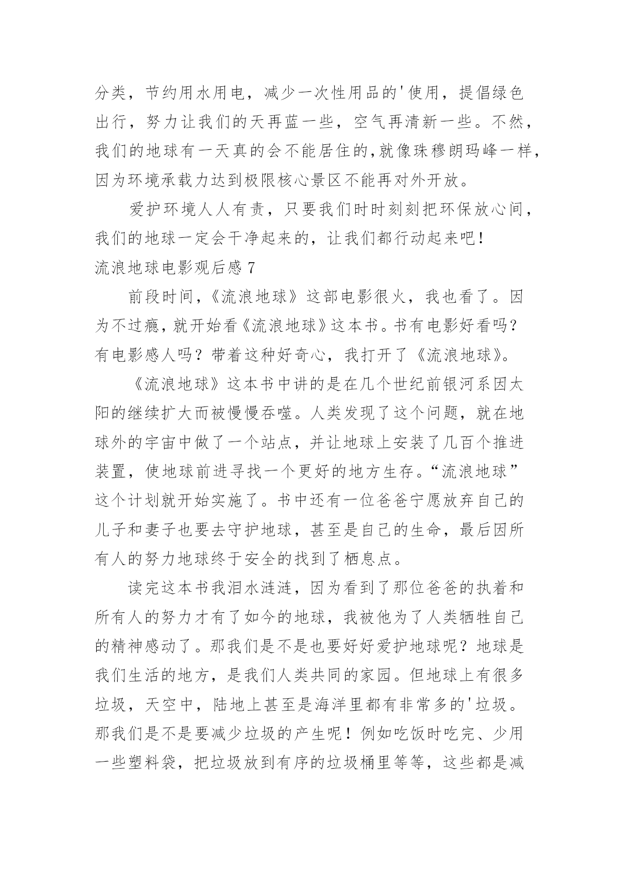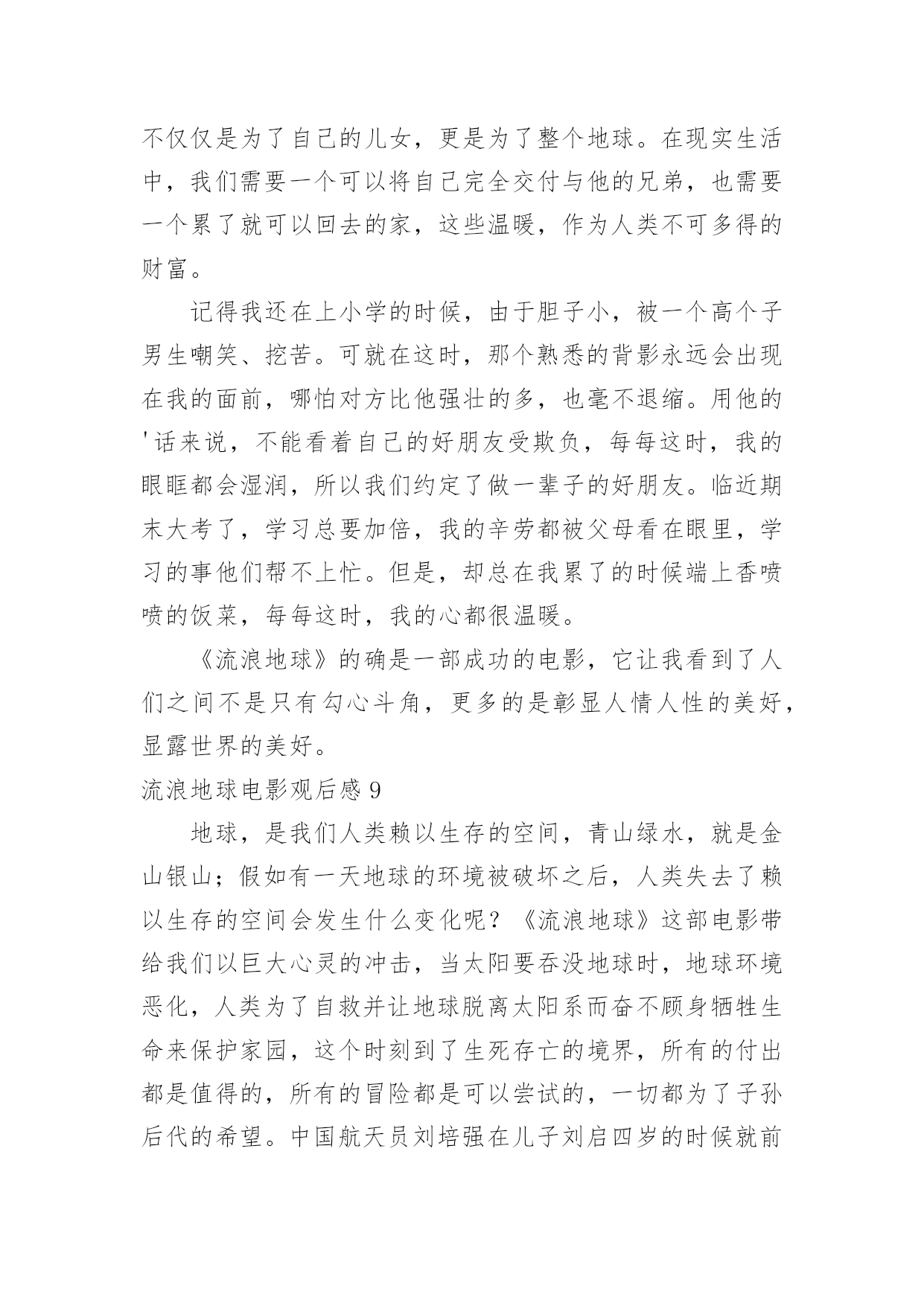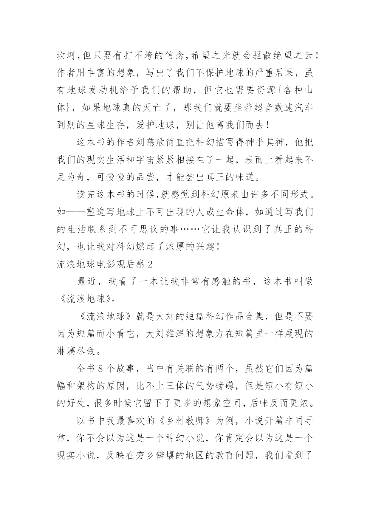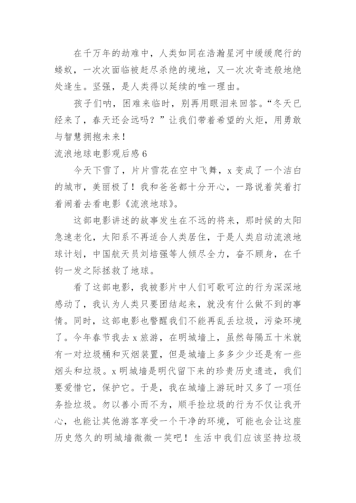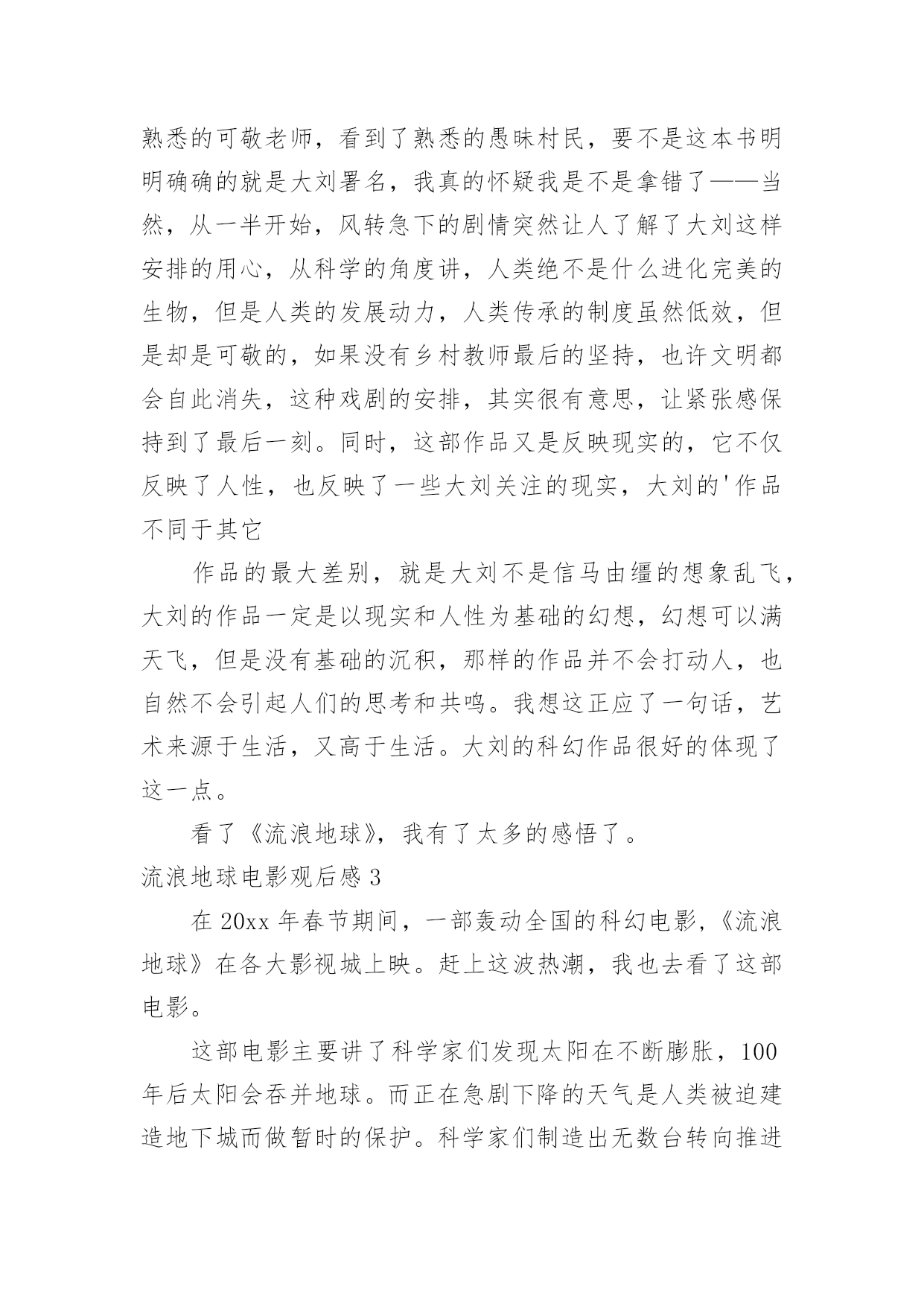 流浪地球电影观后感流浪地球电影观后感(精选15篇)当观看完一部影视作品后,相信大家的收获肯定不少吧,这时候,最关键的观后感怎么能落下!想必许多人都在为如何写好观后感而烦恼吧,下面是小编为大家整理的流浪地球电影观后感,欢迎大家借鉴与参考,希望对大家有所帮助。流浪地球电影观后感1在读过刘慈欣的《流浪地球》后,我就被深深吸引了进去,他通过平凡的方式写出了不凡的科幻!《流浪地球》以丰富的想象贯穿全文——20年前,地球航出了冥王星轨道,航出了太阳系,在寒冷的外太空继续着它孤独的逃亡生涯……读到这里,让我不禁佩服起作者刘慈欣,佩服起他对宇宙的认知,他真是把科幻描绘的像真的'一样;通过他的想象,他发明了地球发动机,它的威力非常大,可以照亮北半球,当在太阳爆炸的时刻地球发动机能够帮助人类逃亡太阳系,逃到其它恒星上寻找可生存的地方。“地球派”和“飞船派”是两队死对头。这些“角色”在情节中不断闪现,而就是这些“角色”为文章增添了许多色彩。人就要有丰富的想象,想像是成功的一半,只有美好的遐想是不行的,只有通过我们的努力才能得以实现,才能够驶向成功的彼岸!也许在实现理想的道路上,难免有崎岖和坎坷,但只要有打不垮的信念,希望之光就会驱散绝望之云!作者用丰富的想象,写出了我们不保护地球的严重后果,虽有地球发动机给予我们的帮助,但它也需要资源{各种山体},如果地球真的灭亡了,那我们就要坐着超音数速汽车到别的星球生存,爱护地球,别让他离我们而去!这本书的作者刘慈欣简直把科幻描写得神乎其神,他把我们的现实生活和宇宙紧紧相接在了一起,表面上看起来不足为奇,可慢慢的品尝,才能尝出真正的味道。读完这本书的时候,就感觉到科幻原来由许多不同形式。如——塑造写地球上不可出现的人或生命体,如通过写我们的生活联系到不可思议的事……它让我认识到了真正的科幻,也让我对科幻燃起了浓厚的兴趣!流浪地球电影观后感2最近,我看了一本让我非常有感触的书,这本书叫做《流浪地球》。《流浪地球》就是大刘的短篇科幻作品合集,但是不要因为短篇而小看它,大刘雄浑的想象力在短篇里一样展现的淋漓尽致。全书8个故事,当中有关联的有两个,虽然它们因为篇幅和架构的原因,比不上三体的气势磅礴,但是短小有短小的好处,很多时候它留下了更多的想象空间,后味反而更浓。以书中我最喜欢的《乡村教师》为例,小说开篇非同寻常,你不会以为这是一个科幻小说,你肯定会以为这是一个现实小说,反映在穷乡僻壤的地区的教育问题,我们看到了熟悉的可敬老师,看到了熟悉的愚昧村民,要不是这本书明明确确的就是大刘署名,我真的怀疑我是不是拿错了——当然,从一半开始,风转急下的剧情突然让人了解了大刘这样安排的用心,从科学的角度讲,人类绝不是什么进化完美的生物,但是人类的发展动力,人类传承的制度虽然低效,但是却是可敬的,如果没有乡村教师最后的坚持,也许文明都会自此消失,这种戏剧的安排,其实很有意思,让紧张感保持到了最后一刻。同时,这部作品又是反映现实的,它不仅反映了人性,也反映了一些大刘关注的现实,大刘的'作品不同于其它作品的最大差别,就是大刘不是信马由缰的想象乱飞,大刘的作品一定是以现实和人性为基础的幻想,幻想可以满天飞,但是没有基础的沉积,那样的作品并不会打动人,也自然不会引起人们的思考和共鸣。我想这正应了一句话,艺术来源于生活,又高于生活。大刘的科幻作品很好的体现了这一点。看了《流浪地球》,我有了太多的感悟了。流浪地球电影观后感3在20xx年春节期间,一部轰动全国的科幻电影,《流浪地球》在各大影视城上映。赶上这波热潮,我也去看了这部电影。这部电影主要讲了科学家们发现太阳在不断膨胀,100年后太阳会吞并地球。而正在急剧下降的天气是人类被迫建造地下城而做暂时的保护。科学家们制造出无数台转向推进器和动力推进器,为的是让地球停止自转飞出太阳系。而以刘培强做为代表的300余名航天员在航天站中为地球脱离太阳系做辅助,这个计划被称为“流浪地球”计划。17年过去了,地球已经到达木星旁边。刘培强的儿子刘启也已经变成了一个大小伙子,他私自带着他的妹妹韩朵朵偷了他外公的车来到地面上,而在路上,刘启因为私偷车卡被警察逮捕,而他的外公韩子昂也因为私借车卡被逮捕。但因为木星引力巨大,地球的大气层变得越来越稀薄。许多推进器也应此损坏,联合国派出救援队来救援每一个推进器,而韩子昂的机车也被征用,在运输“火石”的过程中韩子昂不幸身亡。但是在他们赶到之前,杭州推进器已经恢复痊愈,所以他们向远在赤道附近地推进器开去。经过他们的救援,虽然所有推进器已经痊愈,但是木星的引力太强,地球还是没有挣脱。此时刘启想到小时爸爸告诉他,木星里面全部都是氢气,而氢气有助于火的燃烧。所以刘启想到了用推进器燃烧木星的想法,可是因为燃料不够,达不到木星。此时远在太空站的刘培强发现儿子的'想法是唯一拯救地球的