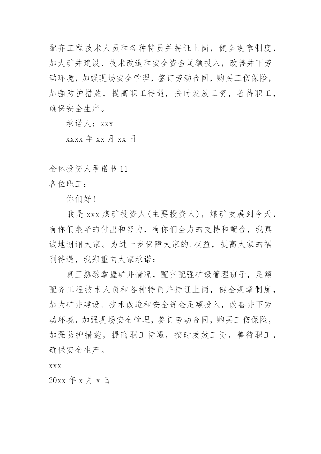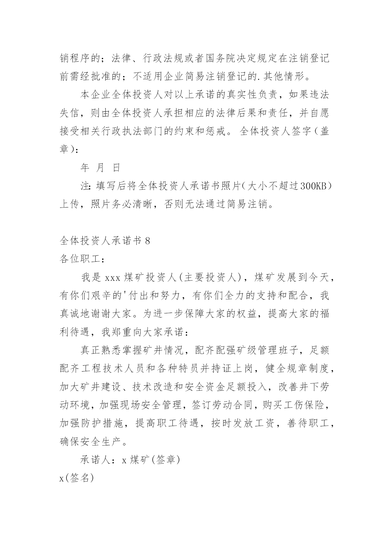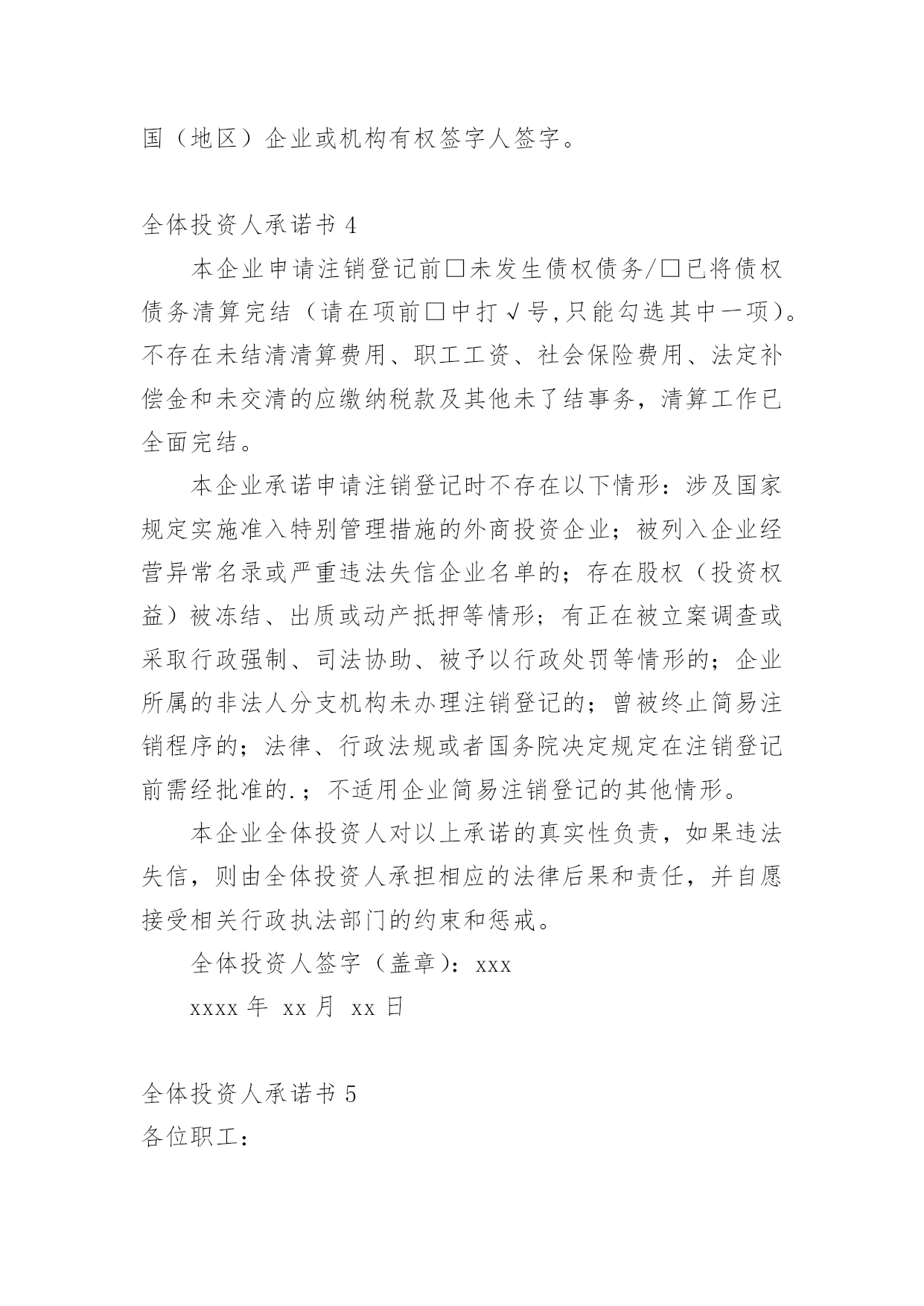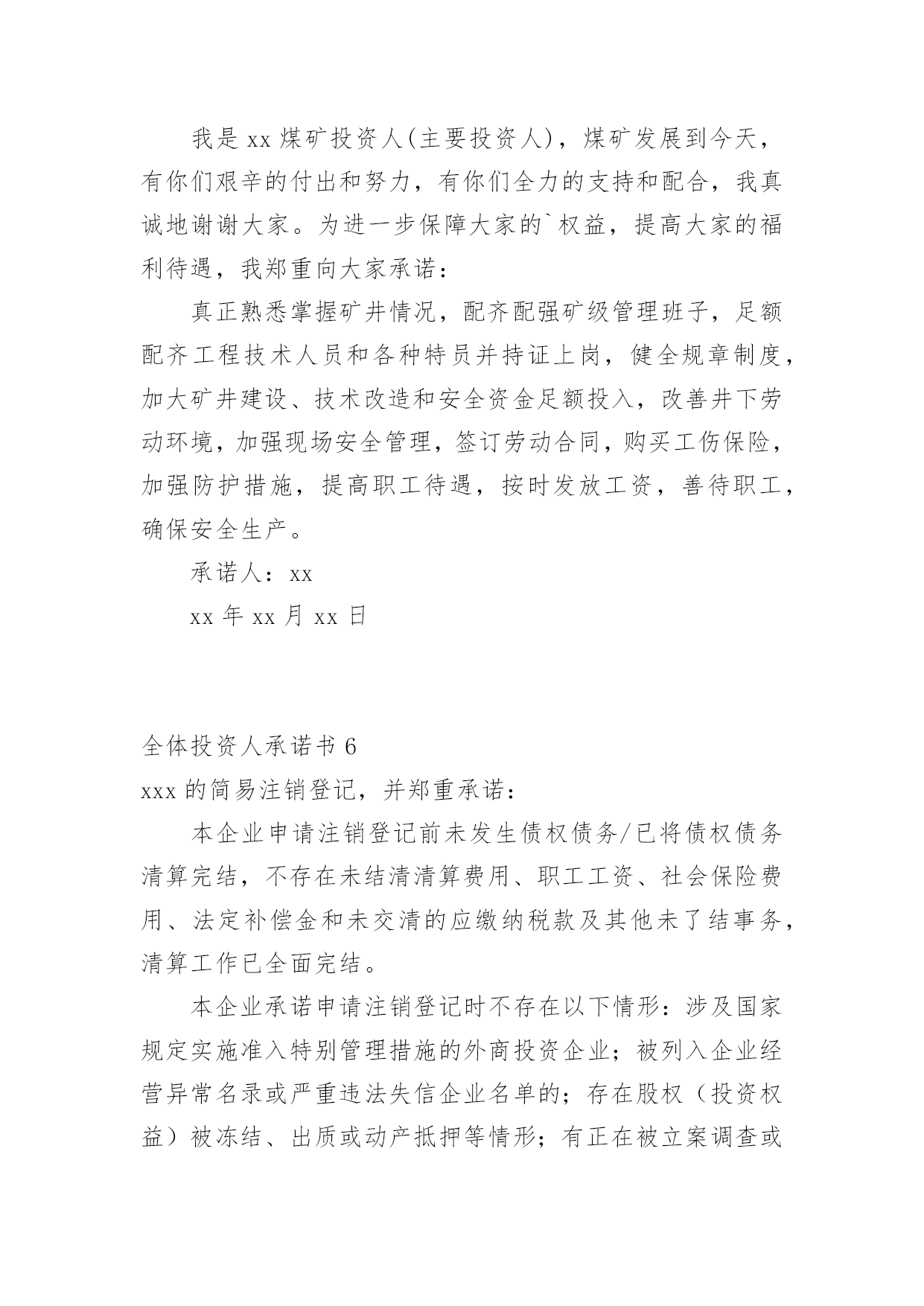 全体投资人承诺书全体投资人承诺书(11篇)随着社会一步步向前发展,我们都跟承诺书有着直接或间接的联系,不同的承诺书内容同样也是不同的。那要怎么写好承诺书呢?以下是小编精心整理的全体投资人承诺书,仅供参考,大家一起来看看吧。全体投资人承诺书1各位职工:我是_________煤矿投资人(主要投资人),煤矿发展到今天,有你们艰辛的付出和努力,有你们全力的`支持和配合,我真诚地谢谢大家。为进一步保障大家的权益,提高大家的福利待遇,我郑重向大家承诺:真正熟悉掌握矿井情况,配齐配强矿级管理班子,足额配齐工程技术人员和各种特员并持证上岗,健全规章制度,加大矿井建设、技术改造和安全资金足额投入,改善井下劳动环境,加强现场安全管理,签订劳动合同,购买工伤保险,加强防护措施,提高职工待遇,按时发放工资,善待职工,确保安全生产。承诺人:___煤矿(签章)___(签名)___年___月___日全体投资人承诺书2现向登记机关申请(企业名称)(统一代码/注册号)的简易注销登记,并郑重承诺:本企业申请注销登记前□未发生债权债务□已将债权债务清算完结,不存在未结清清算费用、职工工资、社会保险费用、法定补偿金和未交清的应缴纳税款及其他未了结事务,清算工作已全面完结。本企业承诺申请注销登记时不存在以下情形:涉及国家规定实施准入特别管理措施的外商投资企业;被列入企业经营异常名录或严重违法失信企业名单的';存在股权(投资权益)被冻结、出质或动产抵押等情形;有正在被立案调查或采取行政强制、司法协助、被予以行政处罚等情形的;企业所属的非法人分支机构未办理注销登记的;所投资的子公司未清理完毕的;曾被终止简易注销程序的;法律、行政法规或者国务院决定规定在注销登记前需经批准的;不适用企业简易注销登记的其他情形。本企业全体投资人对以上承诺的真实性负责,如果违法失信,则由全体投资人承担相应的法律后果和责任,并自愿接受相关行政执法部门的约束和惩戒。全体投资人名称(姓名)及签字(盖章):xxxxxx年xx月xx日全体投资人承诺书3现向登记机关申请(企业名称)(统一代码/注册号)的简易注销登记,并郑重承诺:本企业申请注销登记前□未发生债权债务□已将债权债务清算完结,不存在未结清清算费用、职工工资、社会保险费用、法定补偿金和未交清的应缴纳税款及其他未了结事务,清算工作已全面完结。本企业承诺申请注销登记时不存在以下情形:涉及国家规定实施准入特别管理措施的外商投资企业;被列入企业经营异常名录或严重违法失信企业名单的;存在股权(投资权益)被冻结、出质或动产抵押等情形;有正在被立案调查或采取行政强制、司法协助、被予以行政处罚等情形的;企业所属的非法人分支机构未办理注销登记的;所投资的子公司未清理完毕的;曾被终止简易注销程序的;法律、行政法规或者国务院决定规定在注销登记前需经批准的;不适用企业简易注销登记的其他情形。本企业全体投资人对以上承诺的'真实性负责,如果违法失信,则由全体投资人承担相应的法律后果和责任,并自愿接受相关行政执法部门的约束和惩戒。全体投资人名称(姓名)及签字(盖章):年月日注:请将债务清理情况在□中选择一项勾选。投资人为自然人的,由本人签字;投资人为企业或机构的,加盖公章;投资人为外国(地区)企业或机构的,由外国(地区)企业或机构有权签字人签字。全体投资人承诺书4本企业申请注销登记前□未发生债权债务/□已将债权债务清算完结(请在项前□中打√号,只能勾选其中一项)。不存在未结清清算费用、职工工资、社会保险费用、法定补偿金和未交清的应缴纳税款及其他未了结事务,清算工作已全面完结。本企业承诺申请注销登记时不存在以下情形:涉及国家规定实施准入特别管理措施的外商投资企业;被列入企业经营异常名录或严重违法失信企业名单的;存在股权(投资权益)被冻结、出质或动产抵押等情形;有正在被立案调查或采取行政强制、司法协助、被予以行政处罚等情形的;企业所属的非法人分支机构未办理注销登记的;曾被终止简易注销程序的;法律、行政法规或者国务院决定规定在注销登记前需经批准的.;不适用企业简易注销登记的其他情形。本企业全体投资人对以上承诺的真实性负责,如果违法失信,则由全体投资人承担相应的法律后果和责任,并自愿接受相关行政执法部门的约束和惩戒。全体投资人签字(盖章):xxxxxxx年xx月xx日全体投资人承诺书5各位职工:我是xx煤矿投资人(主要投资人),煤矿发展到今天,有你们艰辛的付出和努力,有你们全力的支持和配合,我真诚地谢谢大家。为进一步保障大家的`权益,提高大家的福利待遇,我郑重向大家承诺:真正熟悉掌握矿井情况,配齐配强矿级管理班子,足额配齐工程技术人员和各种特员并持证上岗,健全规章制度,加大矿井建设、技术改造和安全资金足额投入,改善井下劳动环境,加强现场安全管理,签订劳动合同,购买工伤保险,加强防护