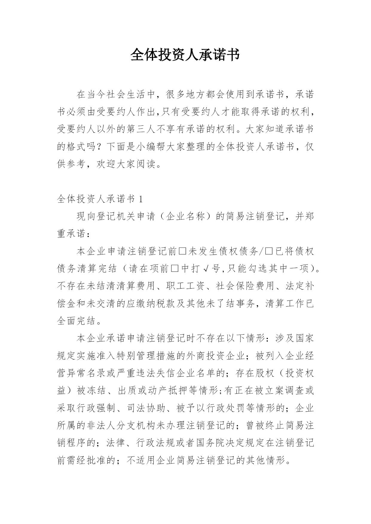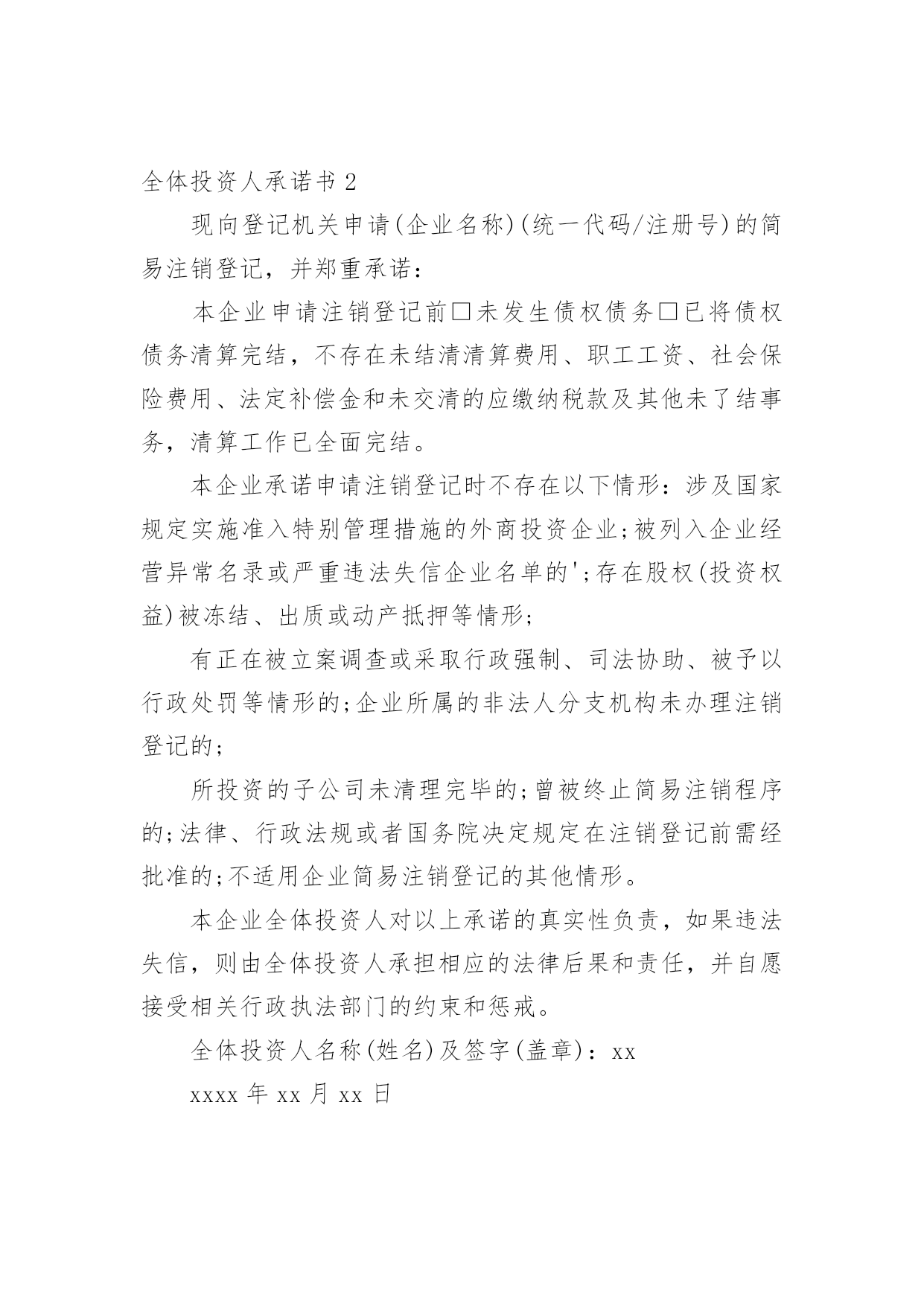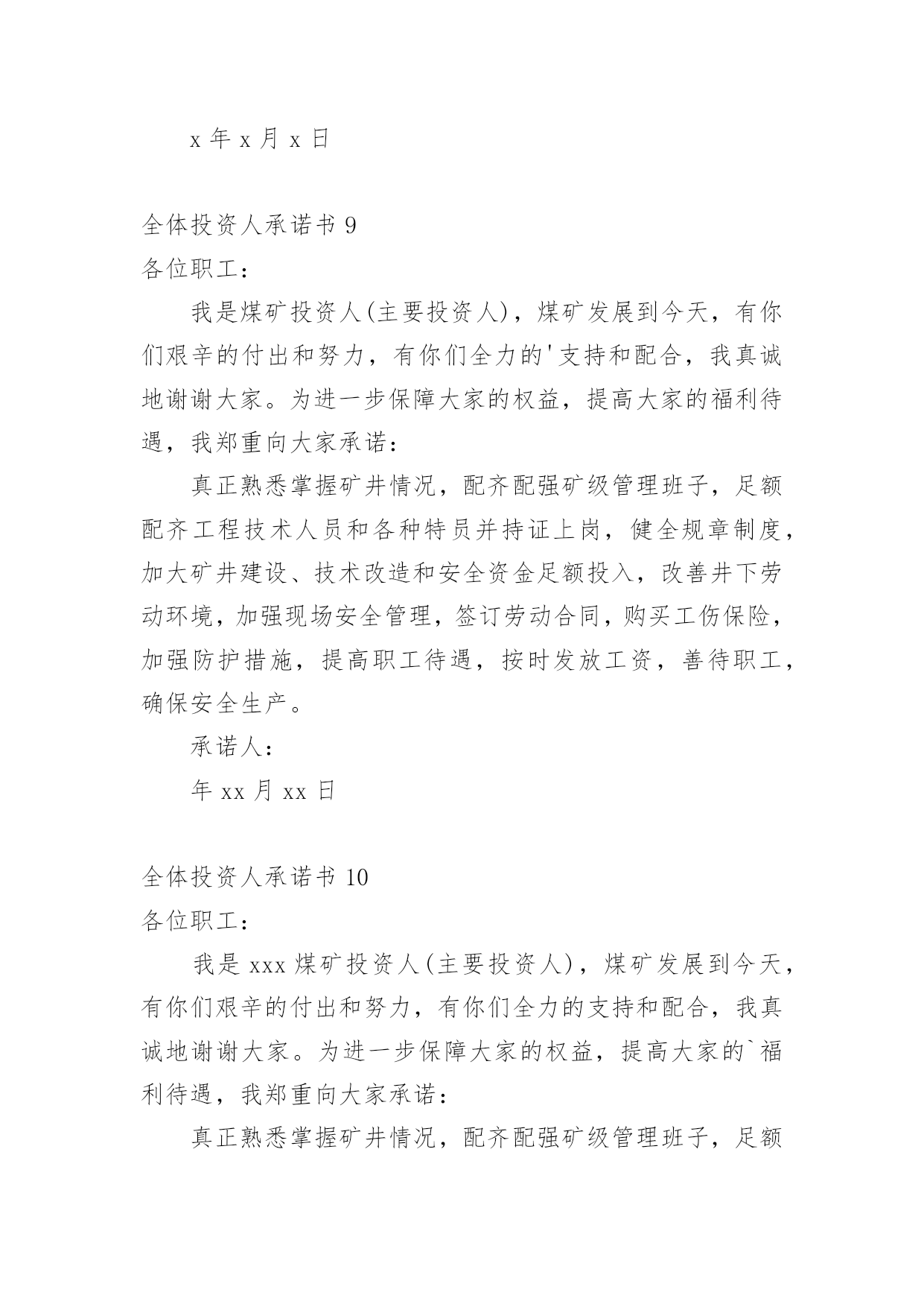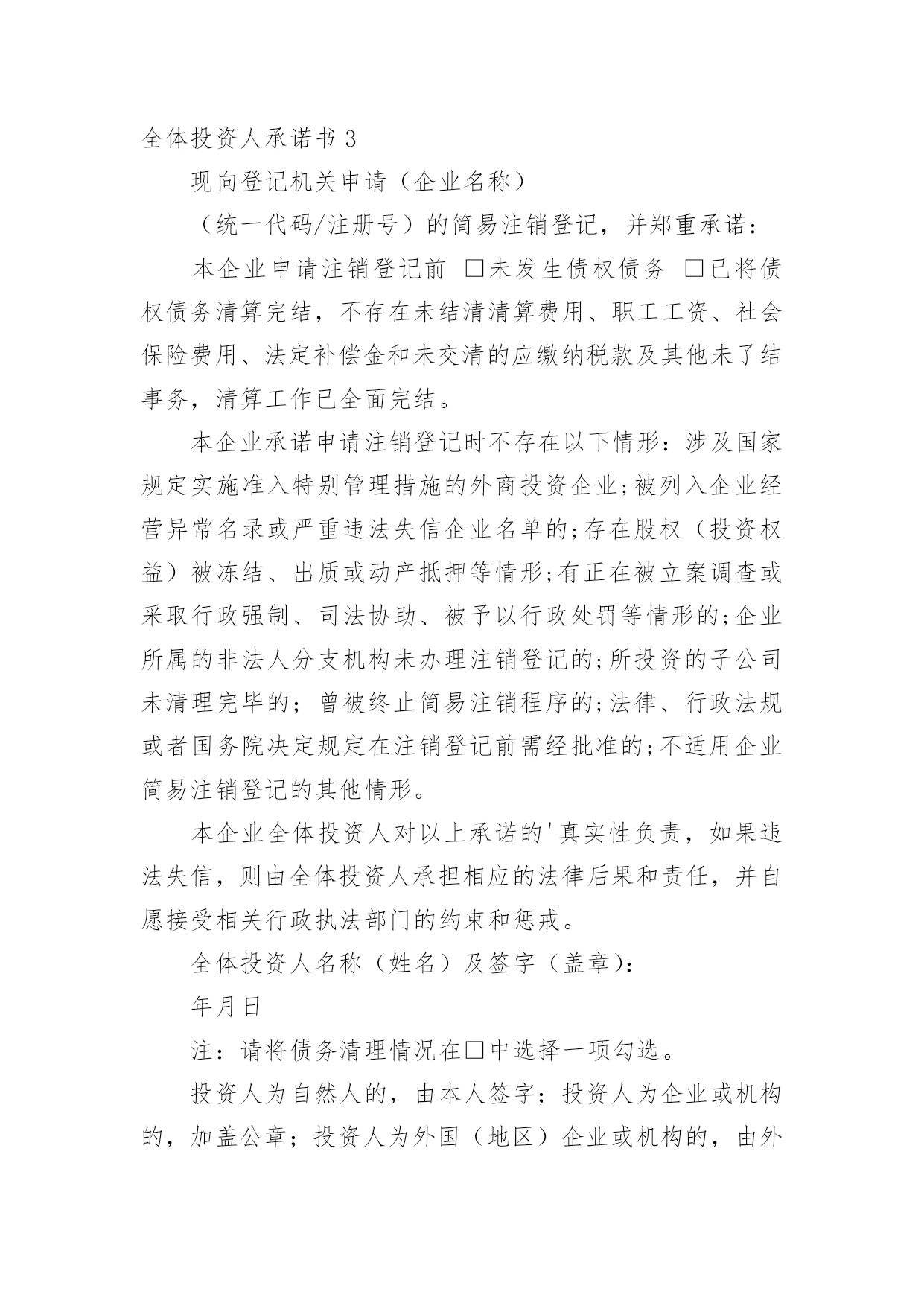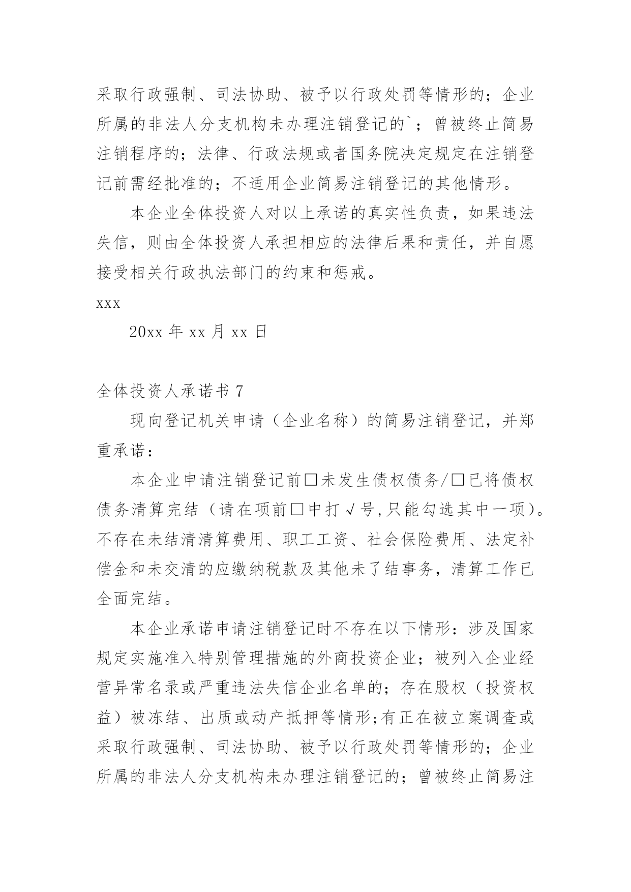 全体投资人承诺书全体投资人承诺书(11篇)随着社会一步步向前发展,我们都跟承诺书有着直接或间接的联系,不同的承诺书内容同样也是不同的。那要怎么写好承诺书呢?以下是小编精心整理的全体投资人承诺书,仅供参考,大家一起来看看吧。全体投资人承诺书1各位职工:我是_________煤矿投资人(主要投资人),煤矿发展到今天,有你们艰辛的付出和努力,有你们全力的`支持和配合,我真诚地谢谢大家。为进一步保障大家的权益,提高大家的福利待遇,我郑重向大家承诺:真正熟悉掌握矿井情况,配齐配强矿级管理班子,足额配齐工程技术人员和各种特员并持证上岗,健全规章制度,加大矿井建设、技术改造和安全资金足额投入,改善井下劳动环境,加强现场安全管理,签订劳动合同,购买工伤保险,加强防护措施,提高职工待遇,按时发放工资,善待职工,确保安全生产。承诺人:___煤矿(签章)___(签名)___年___月___日全体投资人承诺书2现向登记机关申请(企业名称)(统一代码/注册号)的简易注销登记,并郑重承诺:本企业申请注销登记前□未发生债权债务□已将债权债务清算完结,不存在未结清清算费用、职工工资、社会保险费用、法定补偿金和未交清的应缴纳税款及其他未了结事务,清算工作已全面完结。本企业承诺申请注销登记时不存在以下情形:涉及国家规定实施准入特别管理措施的外商投资企业;被列入企业经营异常名录或严重违法失信企业名单的';存在股权(投资权益)被冻结、出质或动产抵押等情形;有正在被立案调查或采取行政强制、司法协助、被予以行政处罚等情形的;企业所属的非法人分支机构未办理注销登记的;所投资的子公司未清理完毕的;曾被终止简易注销程序的;法律、行政法规或者国务院决定规定在注销登记前需经批准的;不适用企业简易注销登记的其他情形。本企业全体投资人对以上承诺的真实性负责,如果违法失信,则由全体投资人承担相应的法律后果和责任,并自愿接受相关行政执法部门的约束和惩戒。全体投资人名称(姓名)及签字(盖章):xxxxxx年xx月xx日全体投资人承诺书3现向登记机关申请(企业名称)(统一代码/注册号)的简易注销登记,并郑重承诺:本企业申请注销登记前□未发生债权债务□已将债权债务清算完结,不存在未结清清算费用、职工工资、社会保险费用、法定补偿金和未交清的应缴纳税款及其他未了结事务,清算工作已全面完结。本企业承诺申请注销登记时不存在以下情形:涉及国家规定实施准入特别管理措施的外商投资企业;被列入企业经营异常名录或严重违法失信企业名单的;存在股权(投资权益)被冻结、出质或动产抵押等情形;有正在被立案调查或采取行政强制、司法协助、被予以行政处罚等情形的;企业所属的非法人分支机构未办理注销登记的;所投资的子公司未清理完毕的;曾被终止简易注销程序的;法律、行政法规或者国务院决定规定在注销登记前需经批准的;不适用企业简易注销登记的其他情形。本企业全体投资人对以上承诺的'真实性负责,如果违法失信,则由全体投资人承担相应的法律后果和责任,并自愿接受相关行政执法部门的约束和惩戒。全体投资人名称(姓名)及签字(盖章):年月日注:请将债务清理情况在□中选择一项勾选。投资人为自然人的,由本人签字;投资人为企业或机构的,加盖公章;投资人为外国(地区)企业或机构的,由外国(地区)企业或机构有权签字人签字。全体投资人承诺书4本企业申请注销登记前□未发生债权债务/□已将债权债务清算完结(请在项前□中打√号,只能勾选其中一项)。不存在未结清清算费用、职工工资、社会保险费用、法定补偿金和未交清的应缴纳税款及其他未了结事务,清算工作已全面完结。本企业承诺申请注销登记时不存在以下情形:涉及国家规定实施准入特别管理措施的外商投资企业;被列入企业经营异常名录或严重违法失信企业名单的;存在股权(投资权益)被冻结、出质或动产抵押等情形;有正在被立案调查或采取行政强制、司法协助、被予以行政处罚等情形的;企业所属的非法人分支机构未办理注销登记的;曾被终止简易注销程序的;法律、行政法规或者国务院决定规定在注销登记前需经批准的.;不适用企业简易注销登记的其他情形。本企业全体投资人对以上承诺的真实性负责,如果违法失信,则由全体投资人承担相应的法律后果和责任,并自愿接受相关行政执法部门的约束和惩戒。全体投资人签字(盖章):xxxxxxx年xx月xx日全体投资人承诺书5各位职工:我是xx煤矿投资人(主要投资人),煤矿发展到今天,有你们艰辛的付出和努力,有你们全力的支持和配合,我真诚地谢谢大家。为进一步保障大家的`权益,提高大家的福利待遇,我郑重向大家承诺:真正熟悉掌握矿井情况,配齐配强矿级管理班子,足额配齐工程技术人员和各种特员并持证上岗,健全规章制度,加大矿井建设、技术改造和安全资金足额投入,改善井下劳动环境,加强现场安全管理,签订劳动合同,购买工伤保险,加强防护