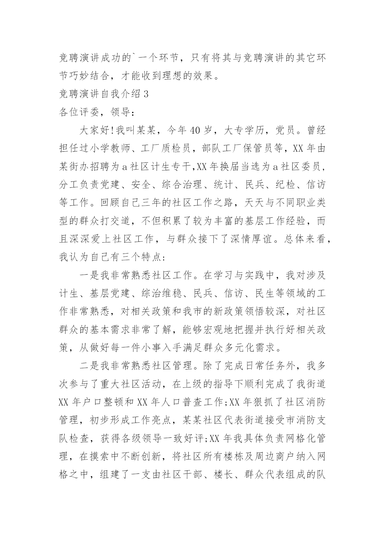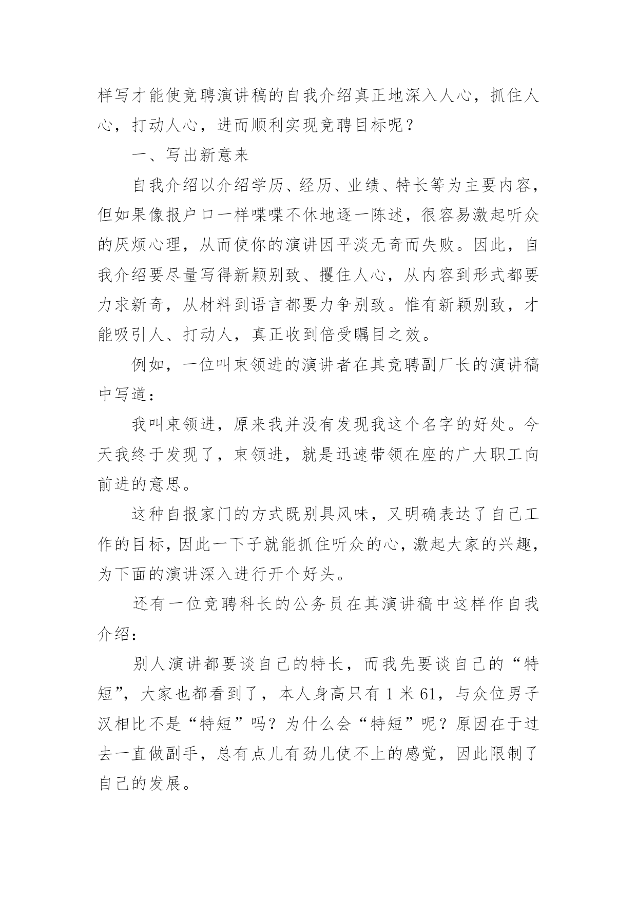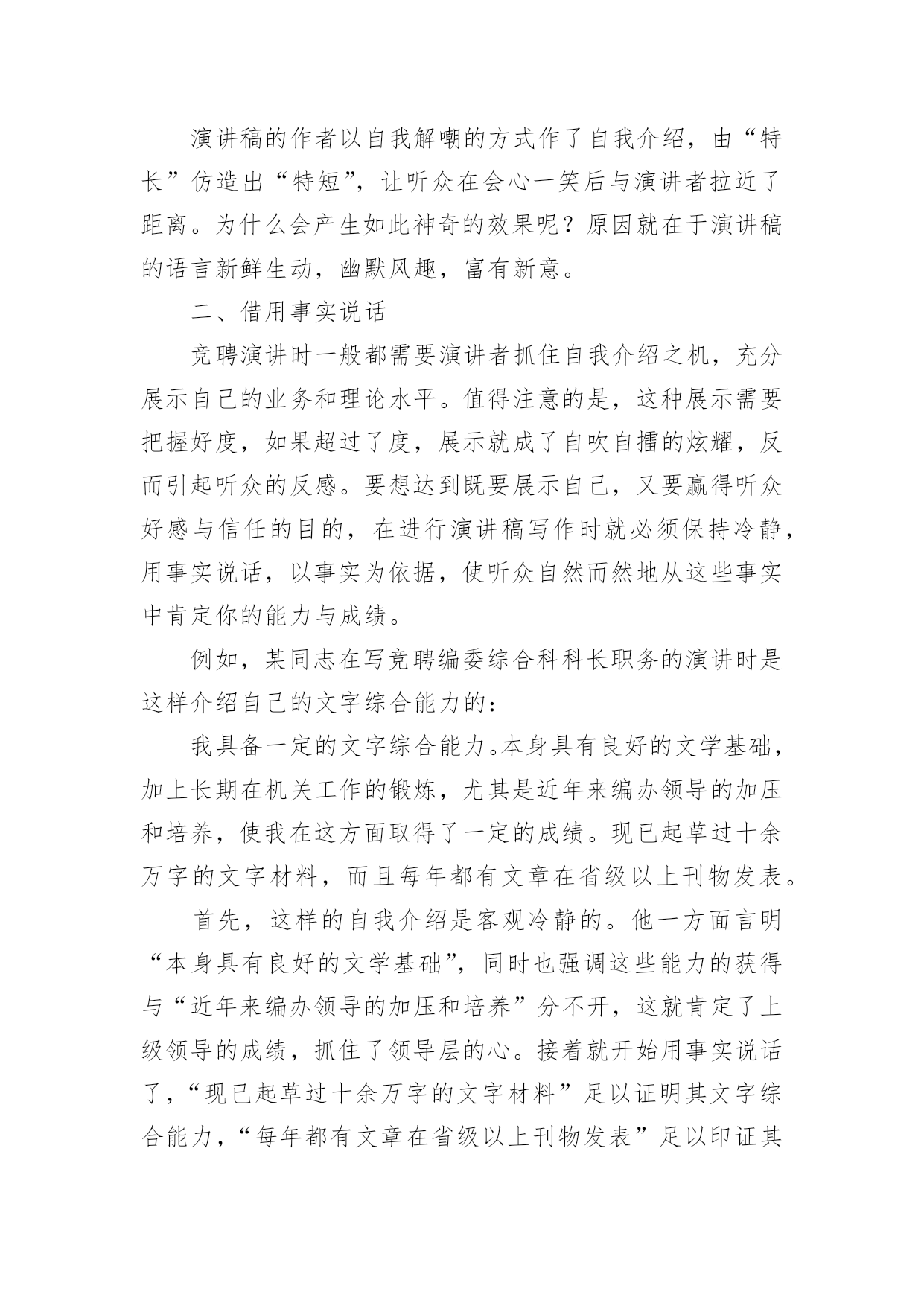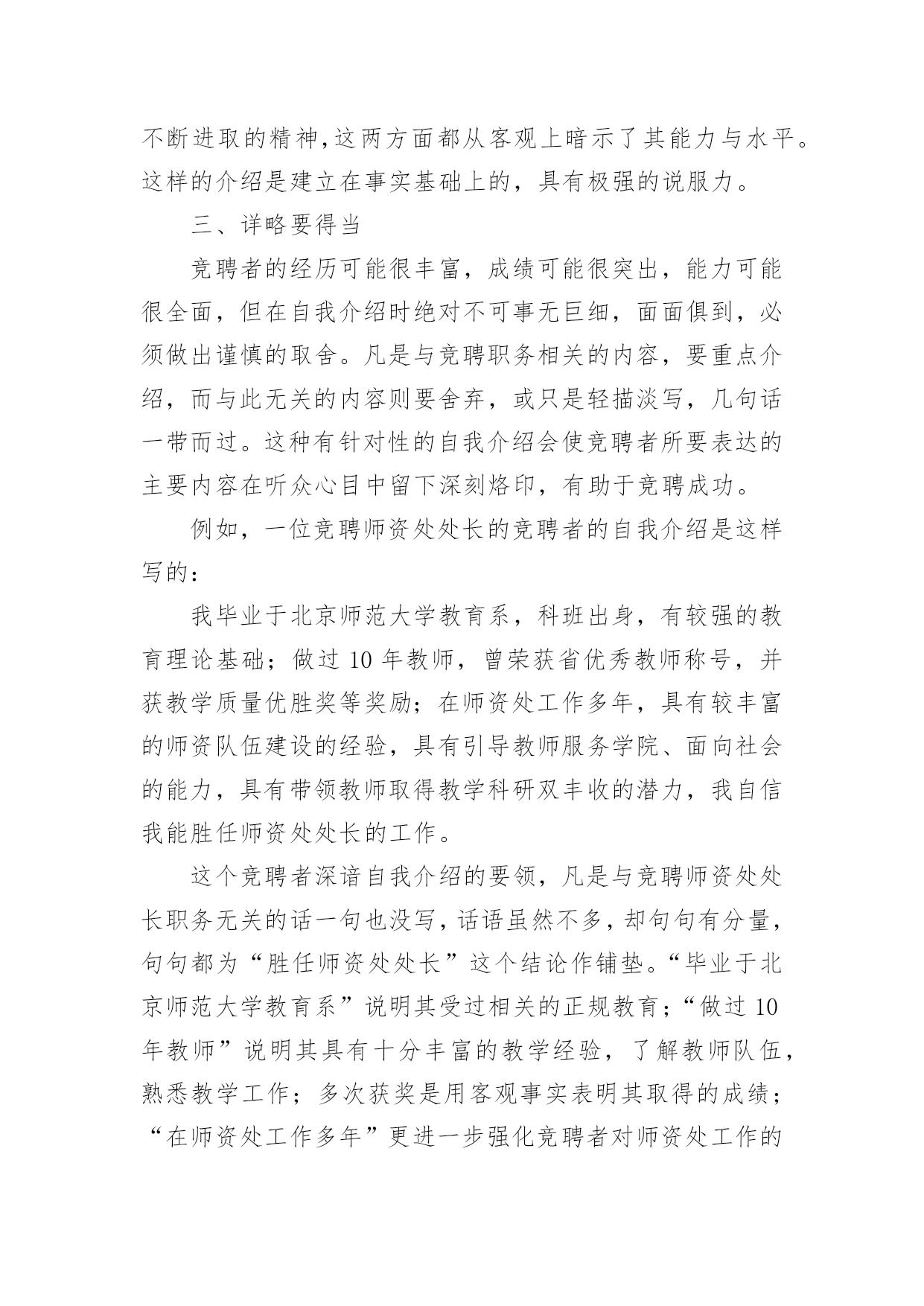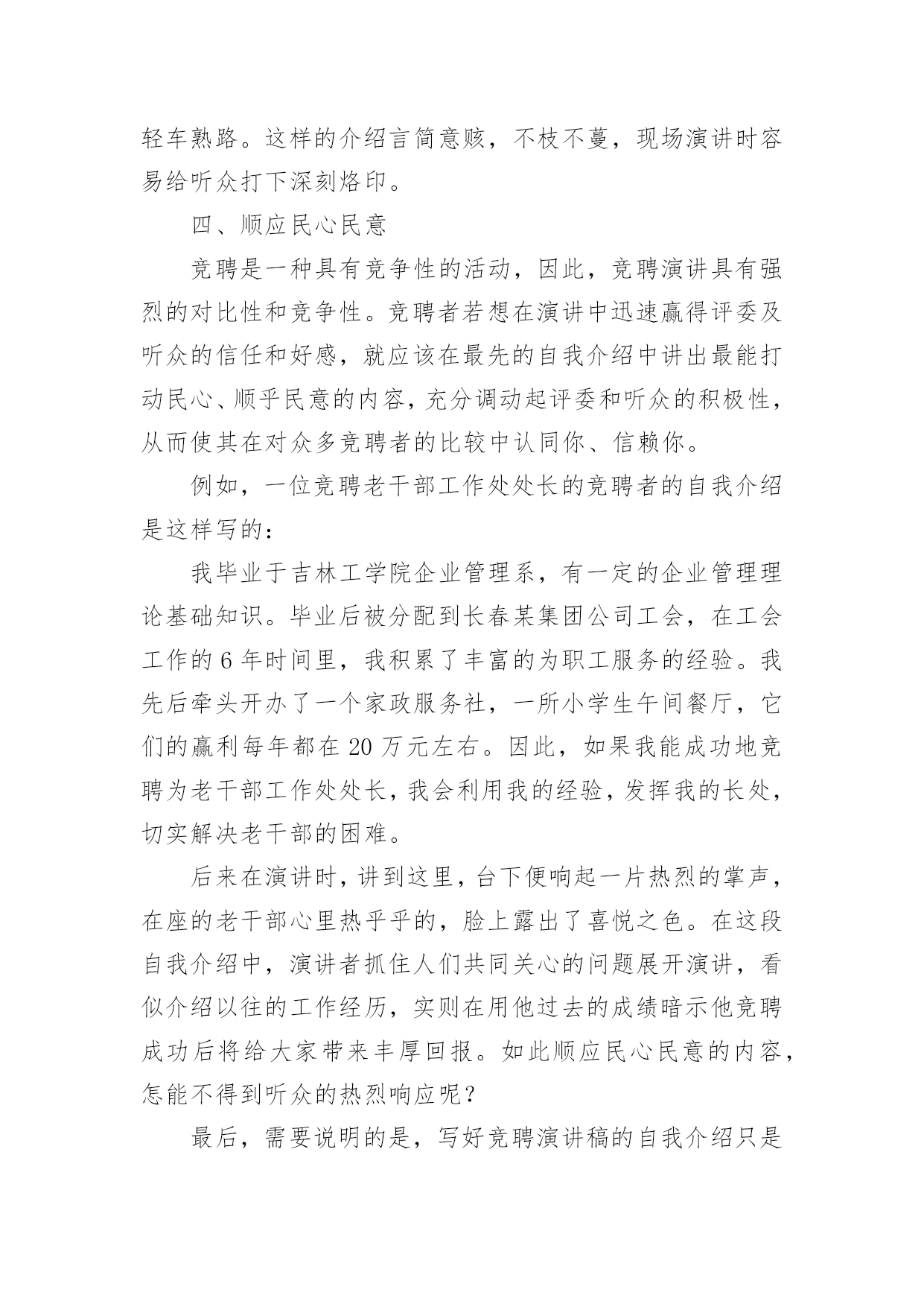 竞聘演讲自我介绍竞聘演讲自我介绍当进入一个陌生环境,通常需要用到自我介绍,自我介绍是我们重新认识自己的开始。那么什么样的自我介绍才合适呢?以下是小编为大家收集的竞聘演讲自我介绍,仅供参考,欢迎大家阅读。竞聘演讲自我介绍1大家好:我是***,我来进行一下自我介绍.来自一个和睦的大家庭:六(6)班。我身高1米45,不算高;是一个性格外向的男孩儿;我个子中等长脸小鼻子;手脚都不大;有一双小小的,眼珠子特别有神的眼睛;一张嘴巴特别能说,只要一说起来,说上一个小时也没问题,身体不胖不瘦。总的来说还是比较帅的。我很喜欢朗读,尤其是表演、和主持节目,因为我天生就声音清脆动听,朗诵带给我许多快乐,使我的业余时间变得丰富多彩,我喜欢朗诵,因此我曾参加过三八妇女节献词。一个外向又喜欢朗诵的人。希望大家投我一票,谢谢.竞聘演讲自我介绍2竞聘演讲的主要目的,是让听众更加全面、深入地了解自己,信赖自己,最终实现获得某种职务的目标。那么,怎样写才能使竞聘演讲稿的自我介绍真正地深入人心,抓住人心,打动人心,进而顺利实现竞聘目标呢?一、写出新意来自我介绍以介绍学历、经历、业绩、特长等为主要内容,但如果像报户口一样喋喋不休地逐一陈述,很容易激起听众的厌烦心理,从而使你的演讲因平淡无奇而失败。因此,自我介绍要尽量写得新颖别致、攫住人心,从内容到形式都要力求新奇,从材料到语言都要力争别致。惟有新颖别致,才能吸引人、打动人,真正收到倍受瞩目之效。例如,一位叫束领进的演讲者在其竞聘副厂长的演讲稿中写道:我叫束领进,原来我并没有发现我这个名字的好处。今天我终于发现了,束领进,就是迅速带领在座的广大职工向前进的意思。这种自报家门的方式既别具风味,又明确表达了自己工作的目标,因此一下子就能抓住听众的心,激起大家的兴趣,为下面的演讲深入进行开个好头。还有一位竞聘科长的公务员在其演讲稿中这样作自我介绍:别人演讲都要谈自己的特长,而我先要谈自己的“特短”,大家也都看到了,本人身高只有1米61,与众位男子汉相比不是“特短”吗?为什么会“特短”呢?原因在于过去一直做副手,总有点儿有劲儿使不上的感觉,因此限制了自己的发展。演讲稿的作者以自我解嘲的方式作了自我介绍,由“特长”仿造出“特短”,让听众在会心一笑后与演讲者拉近了距离。为什么会产生如此神奇的效果呢?原因就在于演讲稿的语言新鲜生动,幽默风趣,富有新意。二、借用事实说话竞聘演讲时一般都需要演讲者抓住自我介绍之机,充分展示自己的业务和理论水平。值得注意的是,这种展示需要把握好度,如果超过了度,展示就成了自吹自擂的炫耀,反而引起听众的反感。要想达到既要展示自己,又要赢得听众好感与信任的目的,在进行演讲稿写作时就必须保持冷静,用事实说话,以事实为依据,使听众自然而然地从这些事实中肯定你的能力与成绩。例如,某同志在写竞聘编委综合科科长职务的演讲时是这样介绍自己的文字综合能力的:我具备一定的文字综合能力。本身具有良好的文学基础,加上长期在机关工作的锻炼,尤其是近年来编办领导的加压和培养,使我在这方面取得了一定的成绩。现已起草过十余万字的文字材料,而且每年都有文章在省级以上刊物发表。首先,这样的自我介绍是客观冷静的。他一方面言明“本身具有良好的文学基础”,同时也强调这些能力的获得与“近年来编办领导的加压和培养”分不开,这就肯定了上级领导的成绩,抓住了领导层的心。接着就开始用事实说话了,“现已起草过十余万字的文字材料”足以证明其文字综合能力,“每年都有文章在省级以上刊物发表”足以印证其不断进取的精神,这两方面都从客观上暗示了其能力与水平。这样的介绍是建立在事实基础上的,具有极强的说服力。三、详略要得当竞聘者的经历可能很丰富,成绩可能很突出,能力可能很全面,但在自我介绍时绝对不可事无巨细,面面俱到,必须做出谨慎的取舍。凡是与竞聘职务相关的内容,要重点介绍,而与此无关的内容则要舍弃,或只是轻描淡写,几句话一带而过。这种有针对性的自我介绍会使竞聘者所要表达的主要内容在听众心目中留下深刻烙印,有助于竞聘成功。例如,一位竞聘师资处处长的竞聘者的自我介绍是这样写的:我毕业于北京师范大学教育系,科班出身,有较强的教育理论基础;做过10年教师,曾荣获省优秀教师称号,并获教学质量优胜奖等奖励;在师资处工作多年,具有较丰富的师资队伍建设的经验,具有引导教师服务学院、面向社会的能力,具有带领教师取得教学科研双丰收的潜力,我自信我能胜任师资处处长的工作。这个竞聘者深谙自我介绍的要领,凡是与竞聘师资处处长职务无关的话一句也没写,话语虽然不多,却句句有分量,句句都为“胜任师资处处长”这个结论作铺垫。“毕业于北京师范大学教育系”说明其受过相关的正规教育;“做过10年教师”说明其具有十分丰富的教学经验,了解教师队伍,熟悉教学工作;多次获奖是用客观事实表明其取得的成绩;“在师