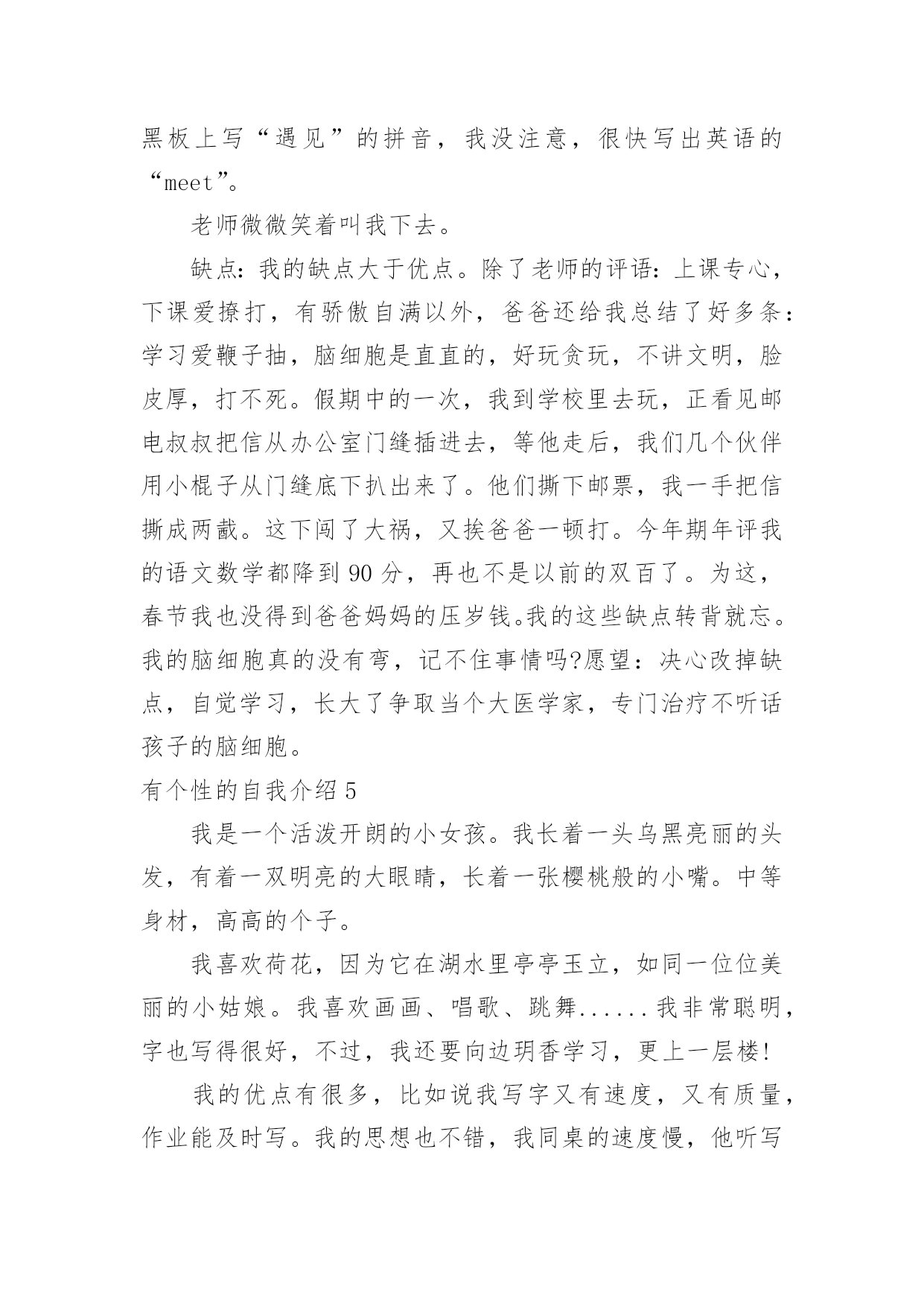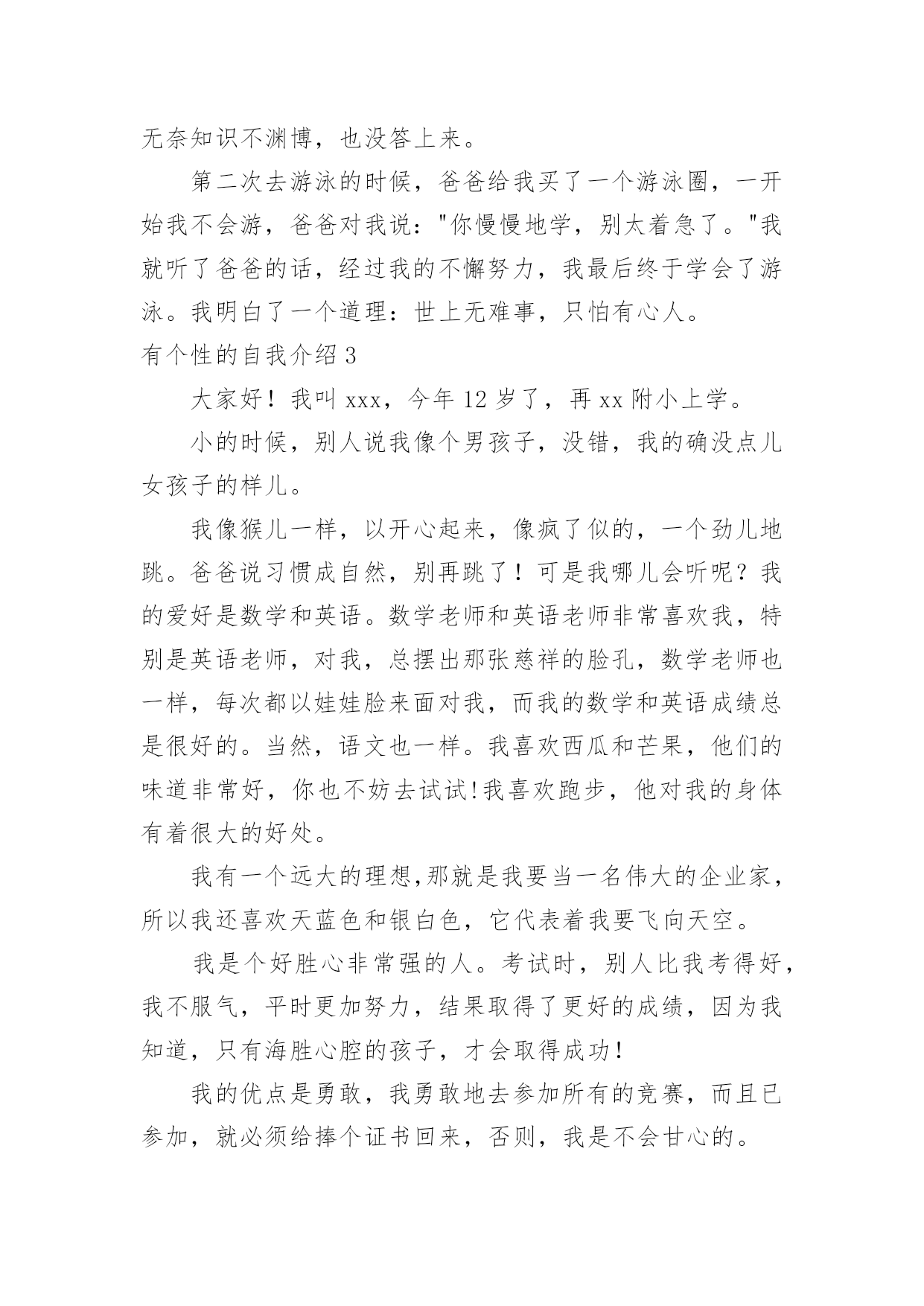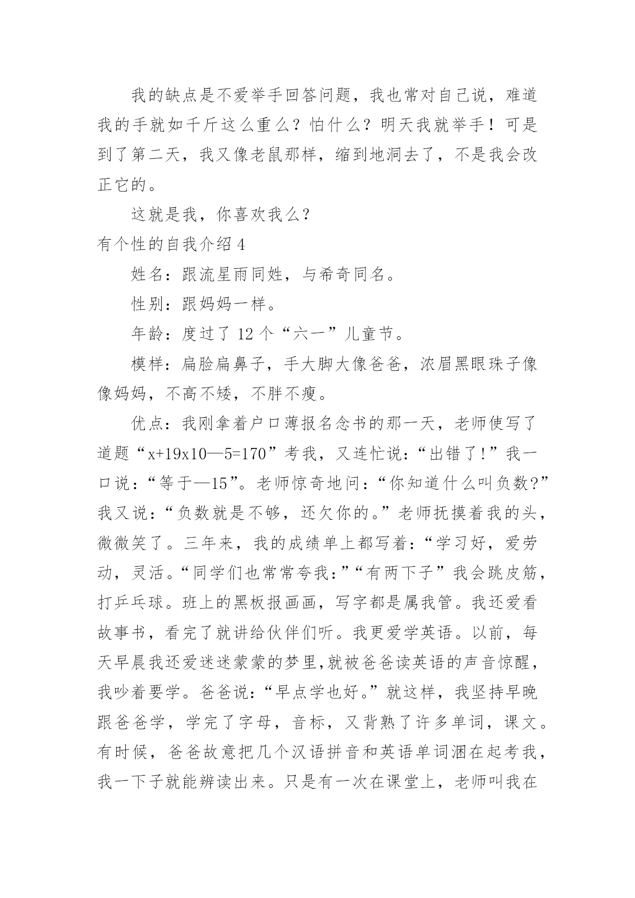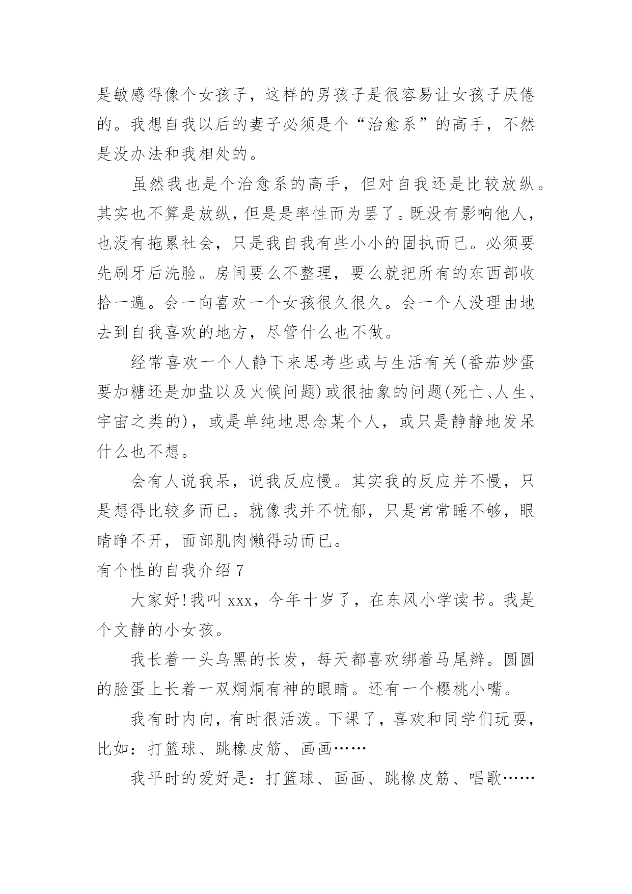 有个性的自我介绍有个性的自我介绍19篇处在一个陌生场合时,我们总少不了要向他人介绍自己,自我介绍可以拉近我们与陌生人的关系。写自我介绍可不能随随便便哦,以下是小编收集整理的有个性的自我介绍,欢迎阅读,希望大家能够喜欢。有个性的自我介绍1大家好!我是xx实验小学三年级六班的xxx,我有一双大而明亮的丹凤眼,一个高高的鼻子,一张能说会道的小嘴巴。换牙后我长出两颗超大的门牙,而且很像兔牙,所以照相时我只能抿着嘴笑。我兴趣广泛,喜欢看《三国演义》和《西游记》等名著,喜欢下象棋,喜欢游泳,特别喜欢画画,我画的画还上了展板报呢,同学们都夸我是画画小天才。我的理想是当一名画家,我要把世界上美好的东西都画下来!有个性的自我介绍2我叫xxx,今年八岁了,我是个男孩。我的头发黄黄的,耳朵大大的,鼻子扁扁的像三毛的鼻子一样。我喜欢打篮球,踢足球,打乒乓球,我还喜欢捕鱼,我最喜欢的还是游泳。记得第一次游泳是在大海里。因为不会游,我喝了好多水,海水非常的咸。我不禁问爸爸:"海水怎么这么咸呀?"爸爸无奈知识不渊博,也没答上来。第二次去游泳的时候,爸爸给我买了一个游泳圈,一开始我不会游,爸爸对我说:"你慢慢地学,别太着急了。"我就听了爸爸的话,经过我的不懈努力,我最后终于学会了游泳。我明白了一个道理:世上无难事,只怕有心人。有个性的自我介绍3大家好!我叫xxx,今年12岁了,再xx附小上学。小的时候,别人说我像个男孩子,没错,我的确没点儿女孩子的样儿。我像猴儿一样,以开心起来,像疯了似的,一个劲儿地跳。爸爸说习惯成自然,别再跳了!可是我哪儿会听呢?我的爱好是数学和英语。数学老师和英语老师非常喜欢我,特别是英语老师,对我,总摆出那张慈祥的脸孔,数学老师也一样,每次都以娃娃脸来面对我,而我的数学和英语成绩总是很好的。当然,语文也一样。我喜欢西瓜和芒果,他们的味道非常好,你也不妨去试试!我喜欢跑步,他对我的身体有着很大的好处。我有一个远大的理想,那就是我要当一名伟大的企业家,所以我还喜欢天蓝色和银白色,它代表着我要飞向天空。我是个好胜心非常强的人。考试时,别人比我考得好,我不服气,平时更加努力,结果取得了更好的成绩,因为我知道,只有海胜心腔的孩子,才会取得成功!我的优点是勇敢,我勇敢地去参加所有的竞赛,而且已参加,就必须给捧个证书回来,否则,我是不会甘心的。我的缺点是不爱举手回答问题,我也常对自己说,难道我的手就如千斤这么重么?怕什么?明天我就举手!可是到了第二天,我又像老鼠那样,缩到地洞去了,不是我会改正它的。这就是我,你喜欢我么?有个性的自我介绍4姓名:跟流星雨同姓,与希奇同名。性别:跟妈妈一样。年龄:度过了12个“六一”儿童节。模样:扁脸扁鼻子,手大脚大像爸爸,浓眉黑眼珠子像像妈妈,不高不矮,不胖不瘦。优点:我刚拿着户口薄报名念书的那一天,老师使写了道题“x+19x10—5=170”考我,又连忙说:“出错了!”我一口说:“等于—15”。老师惊奇地问:“你知道什么叫负数?”我又说:“负数就是不够,还欠你的。”老师抚摸着我的头,微微笑了。三年来,我的成绩单上都写着:“学习好,爱劳动,灵活。“同学们也常常夸我:”“有两下子”我会跳皮筋,打乒乓球。班上的黑板报画画,写字都是属我管。我还爱看故事书,看完了就讲给伙伴们听。我更爱学英语。以前,每天早晨我还爱迷迷蒙蒙的梦里,就被爸爸读英语的声音惊醒,我吵着要学。爸爸说:“早点学也好。”就这样,我坚持早晚跟爸爸学,学完了字母,音标,又背熟了许多单词,课文。有时候,爸爸故意把几个汉语拼音和英语单词涃在起考我,我一下子就能辨读出来。只是有一次在课堂上,老师叫我在黑板上写“遇见”的拼音,我没注意,很快写出英语的“meet”。老师微微笑着叫我下去。缺点:我的缺点大于优点。除了老师的评语:上课专心,下课爱撩打,有骄傲自满以外,爸爸还给我总结了好多条:学习爱鞭子抽,脑细胞是直直的,好玩贪玩,不讲文明,脸皮厚,打不死。假期中的一次,我到学校里去玩,正看见邮电叔叔把信从办公室门缝插进去,等他走后,我们几个伙伴用小棍子从门缝底下扒出来了。他们撕下邮票,我一手把信撕成两酨。这下闯了大祸,又挨爸爸一顿打。今年期年评我的语文数学都降到90分,再也不是以前的双百了。为这,春节我也没得到爸爸妈妈的压岁钱。我的这些缺点转背就忘。我的脑细胞真的没有弯,记不住事情吗?愿望:决心改掉缺点,自觉学习,长大了争取当个大医学家,专门治疗不听话孩子的脑细胞。有个性的自我介绍5我是一个活泼开朗的小女孩。我长着一头乌黑亮丽的头发,有着一双明亮的大眼睛,长着一张樱桃般的小嘴。中等身材,高高的个子。我喜欢荷花,因为它在湖水里亭亭玉立,如同一位位美丽的小姑娘。我喜欢画画、唱歌、跳舞......我非常聪明,字也写得很好,不过,我还要向边玥香学习,更上一层楼!我的优点有很多,