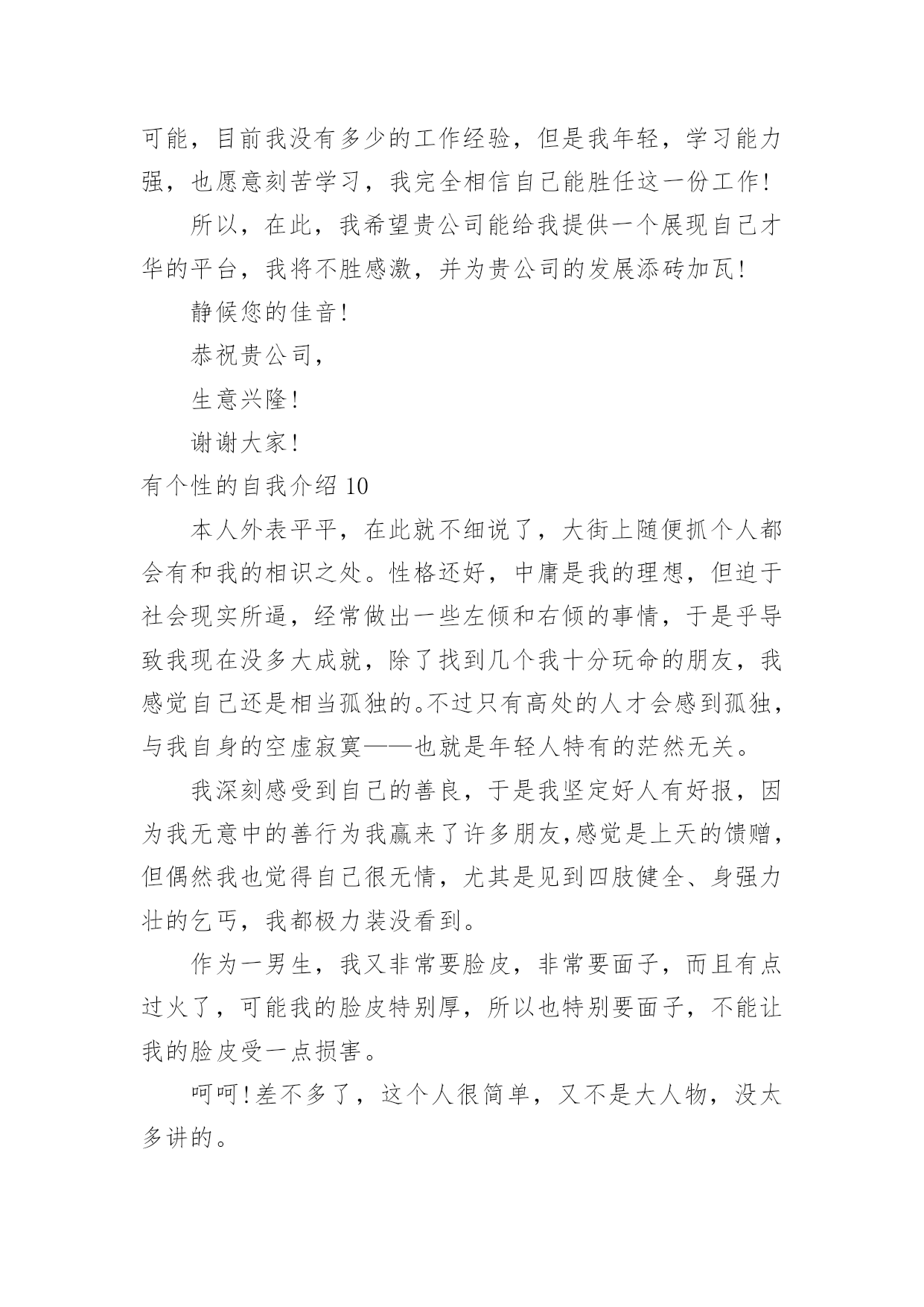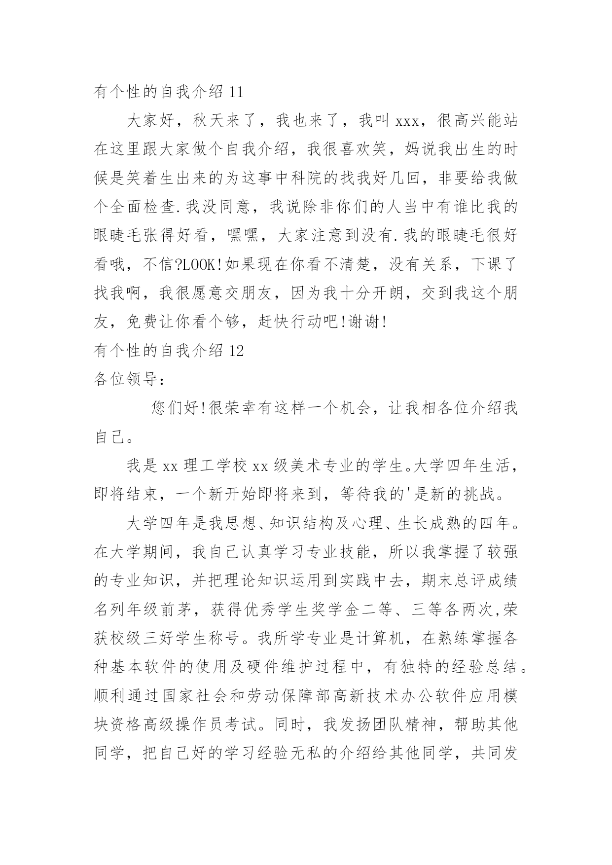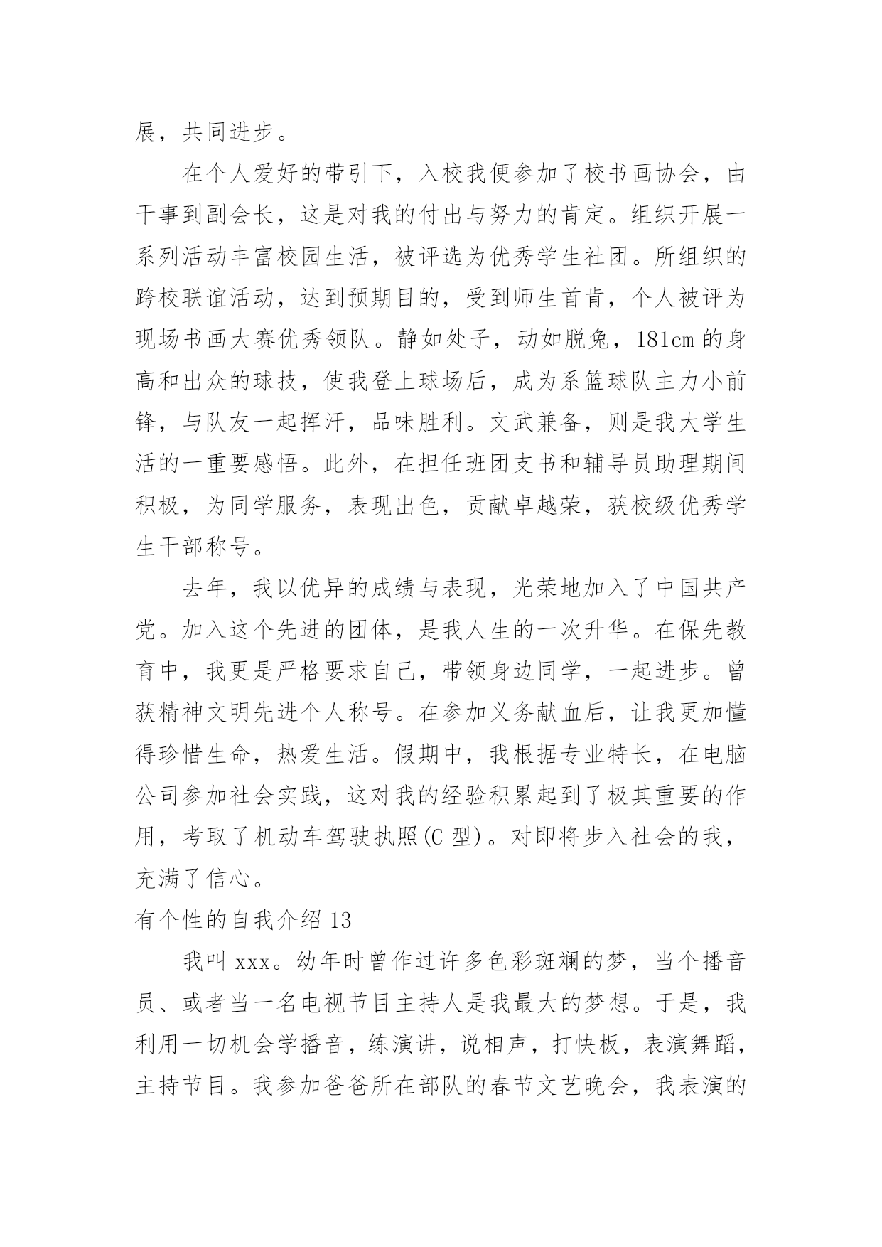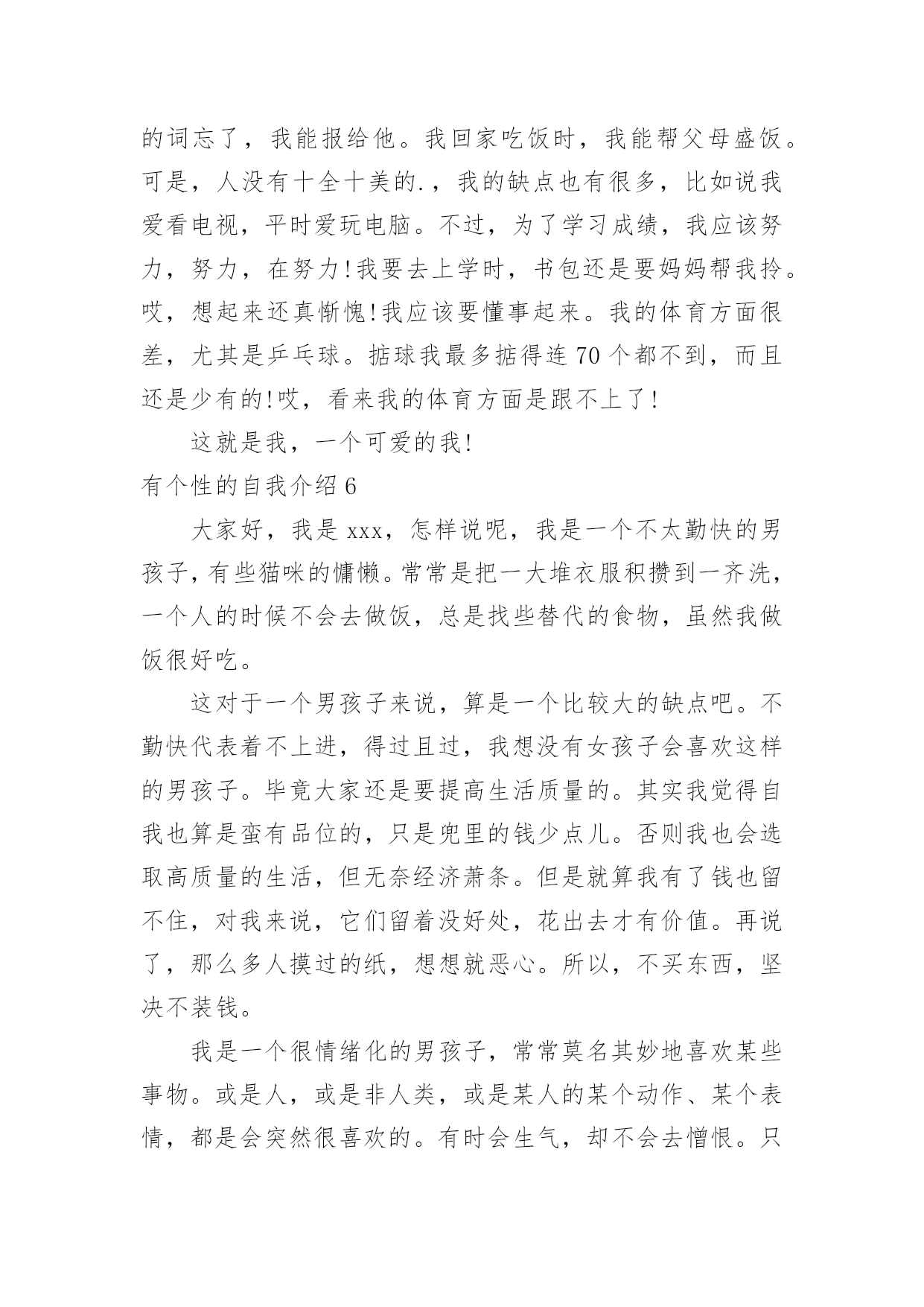 有个性的自我介绍有个性的自我介绍19篇处在一个陌生场合时,我们总少不了要向他人介绍自己,自我介绍可以拉近我们与陌生人的关系。写自我介绍可不能随随便便哦,以下是小编收集整理的有个性的自我介绍,欢迎阅读,希望大家能够喜欢。有个性的自我介绍1大家好!我是xx实验小学三年级六班的xxx,我有一双大而明亮的丹凤眼,一个高高的鼻子,一张能说会道的小嘴巴。换牙后我长出两颗超大的门牙,而且很像兔牙,所以照相时我只能抿着嘴笑。我兴趣广泛,喜欢看《三国演义》和《西游记》等名著,喜欢下象棋,喜欢游泳,特别喜欢画画,我画的画还上了展板报呢,同学们都夸我是画画小天才。我的理想是当一名画家,我要把世界上美好的东西都画下来!有个性的自我介绍2我叫xxx,今年八岁了,我是个男孩。我的头发黄黄的,耳朵大大的,鼻子扁扁的像三毛的鼻子一样。我喜欢打篮球,踢足球,打乒乓球,我还喜欢捕鱼,我最喜欢的还是游泳。记得第一次游泳是在大海里。因为不会游,我喝了好多水,海水非常的咸。我不禁问爸爸:"海水怎么这么咸呀?"爸爸无奈知识不渊博,也没答上来。第二次去游泳的时候,爸爸给我买了一个游泳圈,一开始我不会游,爸爸对我说:"你慢慢地学,别太着急了。"我就听了爸爸的话,经过我的不懈努力,我最后终于学会了游泳。我明白了一个道理:世上无难事,只怕有心人。有个性的自我介绍3大家好!我叫xxx,今年12岁了,再xx附小上学。小的时候,别人说我像个男孩子,没错,我的确没点儿女孩子的样儿。我像猴儿一样,以开心起来,像疯了似的,一个劲儿地跳。爸爸说习惯成自然,别再跳了!可是我哪儿会听呢?我的爱好是数学和英语。数学老师和英语老师非常喜欢我,特别是英语老师,对我,总摆出那张慈祥的脸孔,数学老师也一样,每次都以娃娃脸来面对我,而我的数学和英语成绩总是很好的。当然,语文也一样。我喜欢西瓜和芒果,他们的味道非常好,你也不妨去试试!我喜欢跑步,他对我的身体有着很大的好处。我有一个远大的理想,那就是我要当一名伟大的企业家,所以我还喜欢天蓝色和银白色,它代表着我要飞向天空。我是个好胜心非常强的人。考试时,别人比我考得好,我不服气,平时更加努力,结果取得了更好的成绩,因为我知道,只有海胜心腔的孩子,才会取得成功!我的优点是勇敢,我勇敢地去参加所有的竞赛,而且已参加,就必须给捧个证书回来,否则,我是不会甘心的。我的缺点是不爱举手回答问题,我也常对自己说,难道我的手就如千斤这么重么?怕什么?明天我就举手!可是到了第二天,我又像老鼠那样,缩到地洞去了,不是我会改正它的。这就是我,你喜欢我么?有个性的自我介绍4姓名:跟流星雨同姓,与希奇同名。性别:跟妈妈一样。年龄:度过了12个“六一”儿童节。模样:扁脸扁鼻子,手大脚大像爸爸,浓眉黑眼珠子像像妈妈,不高不矮,不胖不瘦。优点:我刚拿着户口薄报名念书的那一天,老师使写了道题“x+19x10—5=170”考我,又连忙说:“出错了!”我一口说:“等于—15”。老师惊奇地问:“你知道什么叫负数?”我又说:“负数就是不够,还欠你的。”老师抚摸着我的头,微微笑了。三年来,我的成绩单上都写着:“学习好,爱劳动,灵活。“同学们也常常夸我:”“有两下子”我会跳皮筋,打乒乓球。班上的黑板报画画,写字都是属我管。我还爱看故事书,看完了就讲给伙伴们听。我更爱学英语。以前,每天早晨我还爱迷迷蒙蒙的梦里,就被爸爸读英语的声音惊醒,我吵着要学。爸爸说:“早点学也好。”就这样,我坚持早晚跟爸爸学,学完了字母,音标,又背熟了许多单词,课文。有时候,爸爸故意把几个汉语拼音和英语单词涃在起考我,我一下子就能辨读出来。只是有一次在课堂上,老师叫我在黑板上写“遇见”的拼音,我没注意,很快写出英语的“meet”。老师微微笑着叫我下去。缺点:我的缺点大于优点。除了老师的评语:上课专心,下课爱撩打,有骄傲自满以外,爸爸还给我总结了好多条:学习爱鞭子抽,脑细胞是直直的,好玩贪玩,不讲文明,脸皮厚,打不死。假期中的一次,我到学校里去玩,正看见邮电叔叔把信从办公室门缝插进去,等他走后,我们几个伙伴用小棍子从门缝底下扒出来了。他们撕下邮票,我一手把信撕成两酨。这下闯了大祸,又挨爸爸一顿打。今年期年评我的语文数学都降到90分,再也不是以前的双百了。为这,春节我也没得到爸爸妈妈的压岁钱。我的这些缺点转背就忘。我的脑细胞真的没有弯,记不住事情吗?愿望:决心改掉缺点,自觉学习,长大了争取当个大医学家,专门治疗不听话孩子的脑细胞。有个性的自我介绍5我是一个活泼开朗的小女孩。我长着一头乌黑亮丽的头发,有着一双明亮的大眼睛,长着一张樱桃般的小嘴。中等身材,高高的个子。我喜欢荷花,因为它在湖水里亭亭玉立,如同一位位美丽的小姑娘。我喜欢画画、唱歌、跳舞......我非常聪明,字也写得很好,不过,我还要向边玥香学习,更上一层楼!我的优点有很多,