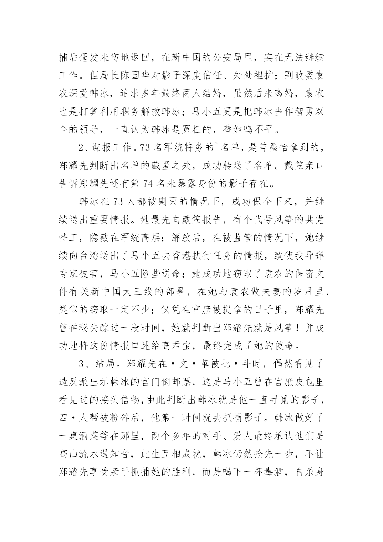 风筝观后感700字风筝观后感700字当观看完一部作品后,大家一定收获不少吧,是时候静下心来好好写写观后感了。在写观后感之前,可以先参考范文,下面是小编为大家收集的风筝观后感700字,希望能够帮助到大家。从郑耀先知道戴笠心腹、军统大特务影子的存在后,他孜孜不倦地寻觅了40年。为此他忍辱负重以周志乾的名义在新中国卑微地活着,在厨房烧火切菜,扫大街铲垃圾,被愚蠢的小人物呼来喝去,挨打受骂,这一切的忍耐,只是为了完成当年组织交给的任务,也是为了自己作为特工的一世英名,他要与影子斗智斗勇,亲手抓捕影子,赢得最终的胜利。风筝与影子的PK,是一场信仰与智慧的博弈,两个信仰同样坚定的人,最终难分伯仲。但是在智慧的比赛中,观众却感觉风筝略逊于影子。1、信任度。郑耀先(风筝),一直被中统、军统的高层怀疑,给他设计了各种陷阱、测试,郑耀先忙于应付。如高占龙、田湖,戴笠、毛人凤,戴笠亲自对宫庶下令,一旦发现郑耀先是共产党,就地正法,不用再向戴笠请示。韩冰(影子)从未被共产党高层怀疑过。韩冰被宫庶抓捕后毫发未伤地返回,在新中国的公安局里,实在无法继续工作。但局长陈国华对影子深度信任、处处袒护;副政委袁农深爱韩冰,追求多年最终两人结婚,虽然后来离婚,袁农也是打算利用职务解救韩冰;马小五更是把韩冰当作智勇双全的领导,一直认为韩冰是冤枉的,替她鸣不平。2、谍报工作。73名军统特务的`名单,是曽墨怡拿到的,郑耀先判断出名单的藏匿之处,成功转送了名单。戴笠亲口告诉郑耀先还有第74名未暴露身份的影子存在。韩冰在73人都被剿灭的情况下,成功保全下来,并继续送出重要情报。她最先向戴笠报告,有个代号风筝的共党特工,隐藏在军统高层;解放后,在被监管的情况下,她继续向台湾送出了马小五去香港执行任务的情报,致使我导弹专家被害,马小五险些送命;她成功地窃取了袁农的保密文件有关新中国大三线的部署,在她与袁农做夫妻的岁月里,类似的窃取一定不少;仅凭在宫庶被捉拿的日子里,郑耀先曾神秘失踪过一段时间,她就判断出郑耀先就是风筝!并成功地将这份情报口述给高君宝,最终完成了她的使命。3、结局。郑耀先在·文·革被批·斗时,偶然看见了造反派出示韩冰的宫门倒邮票,这是马小五曾在宫庶皮包里看见过的接头信物,由此判断出韩冰就是他一直寻觅的影子,四·人帮被粉碎后,他第一时间就去抓捕影子。韩冰做好了一桌酒菜等在那里,两个多年的对手、爱人最终承认他们是高山流水遇知音,此生互相成就,韩冰仍然抢先一步,不让郑耀先享受亲手抓捕她的胜利,而是喝下一杯毒酒,自杀身亡。这部电视剧中,观众一直跟着风筝寻找影子,很少有人想到影子是韩冰,因为戴笠说过第74名特务是兄弟,大家自然没有想到是个女特务,再有韩冰一直比共产党还像共产党,朴素、率真,党性、原则一样不少,当她的军统大特务身份暴露之后,观众们只能用想不到三个字来表达自己的惊异了。正好像众里寻他千百度,此人早在灯火阑珊处