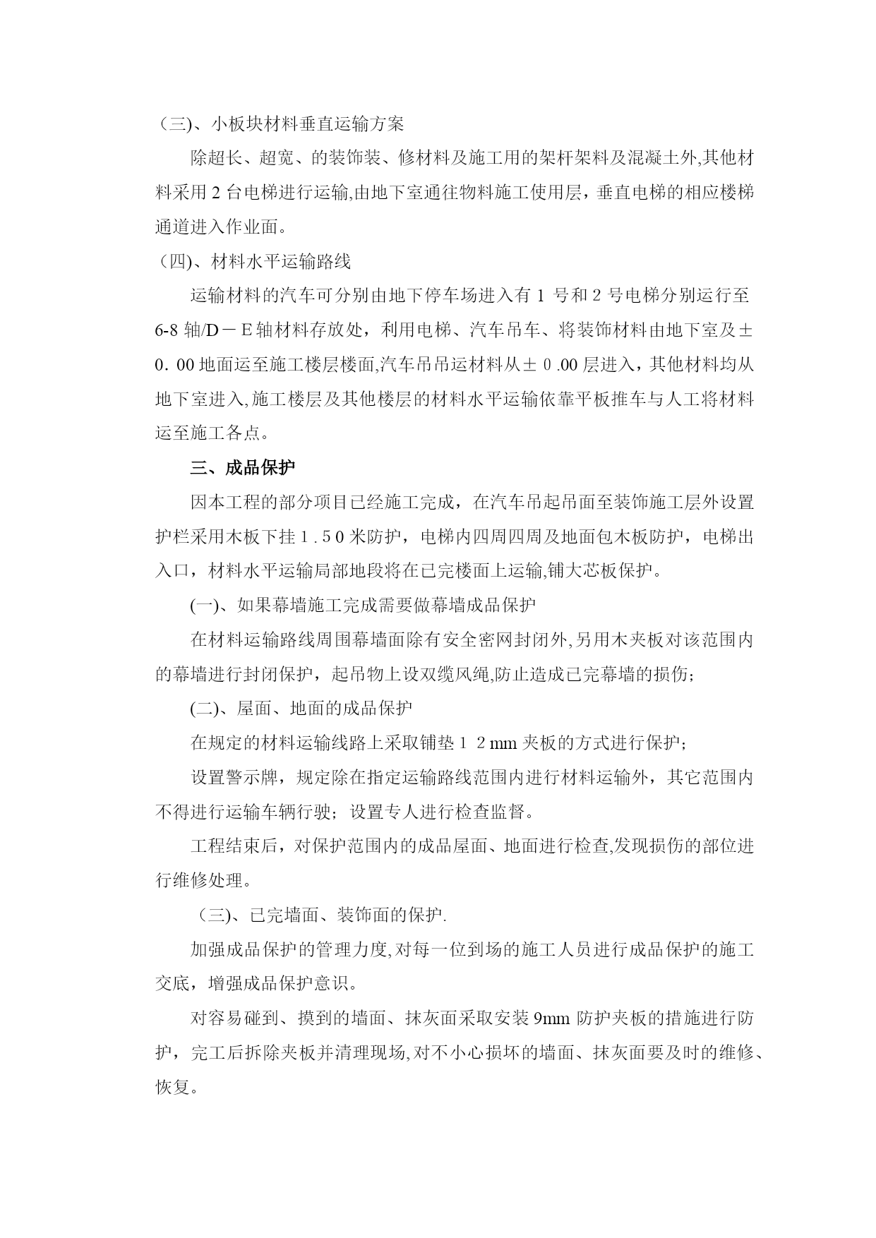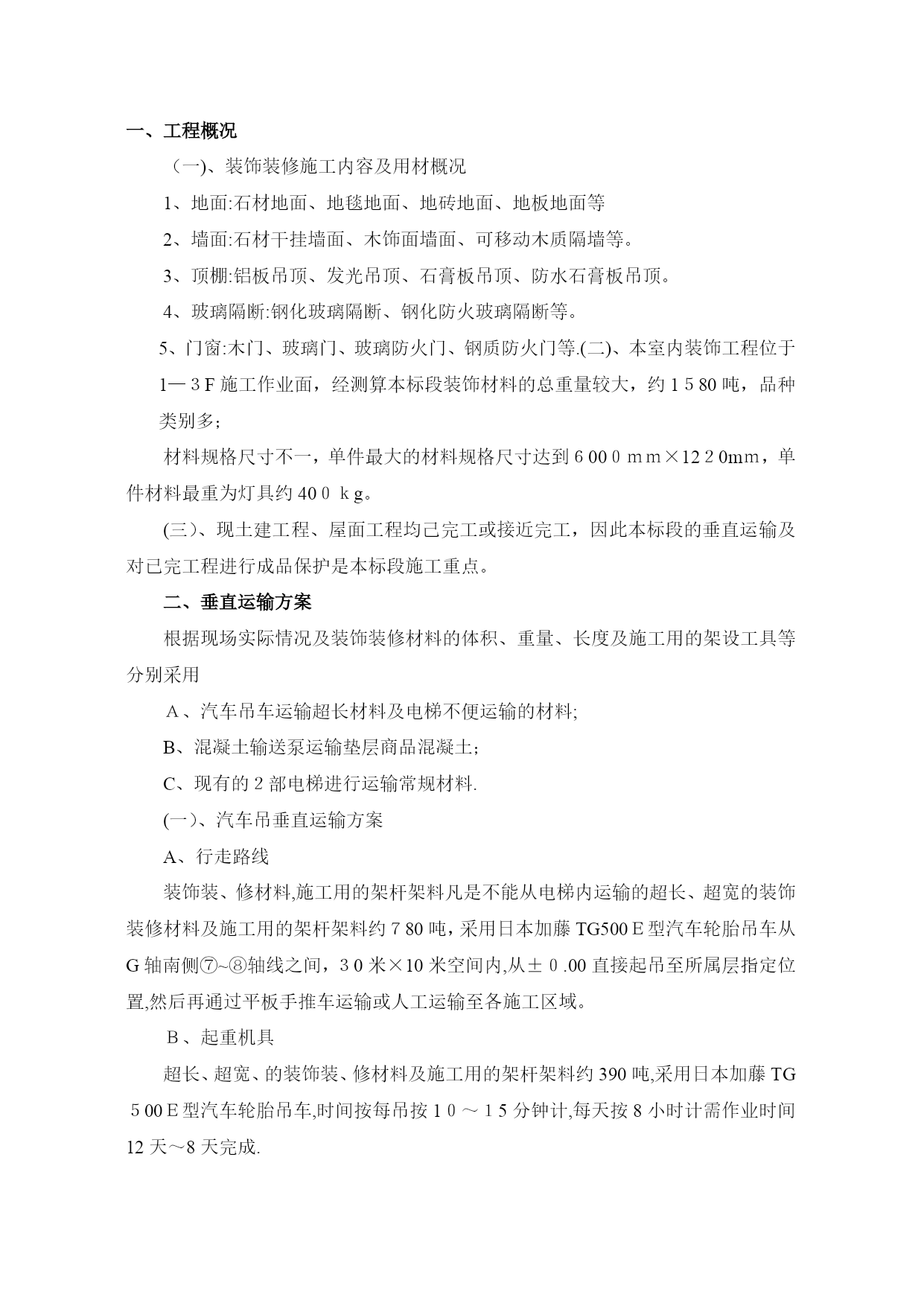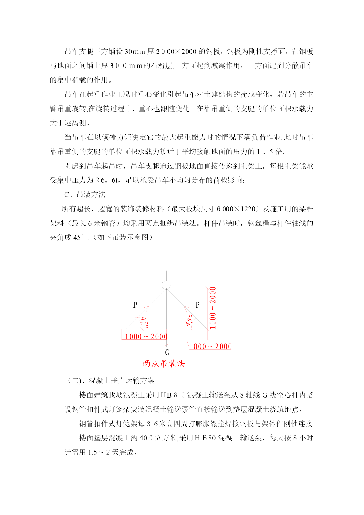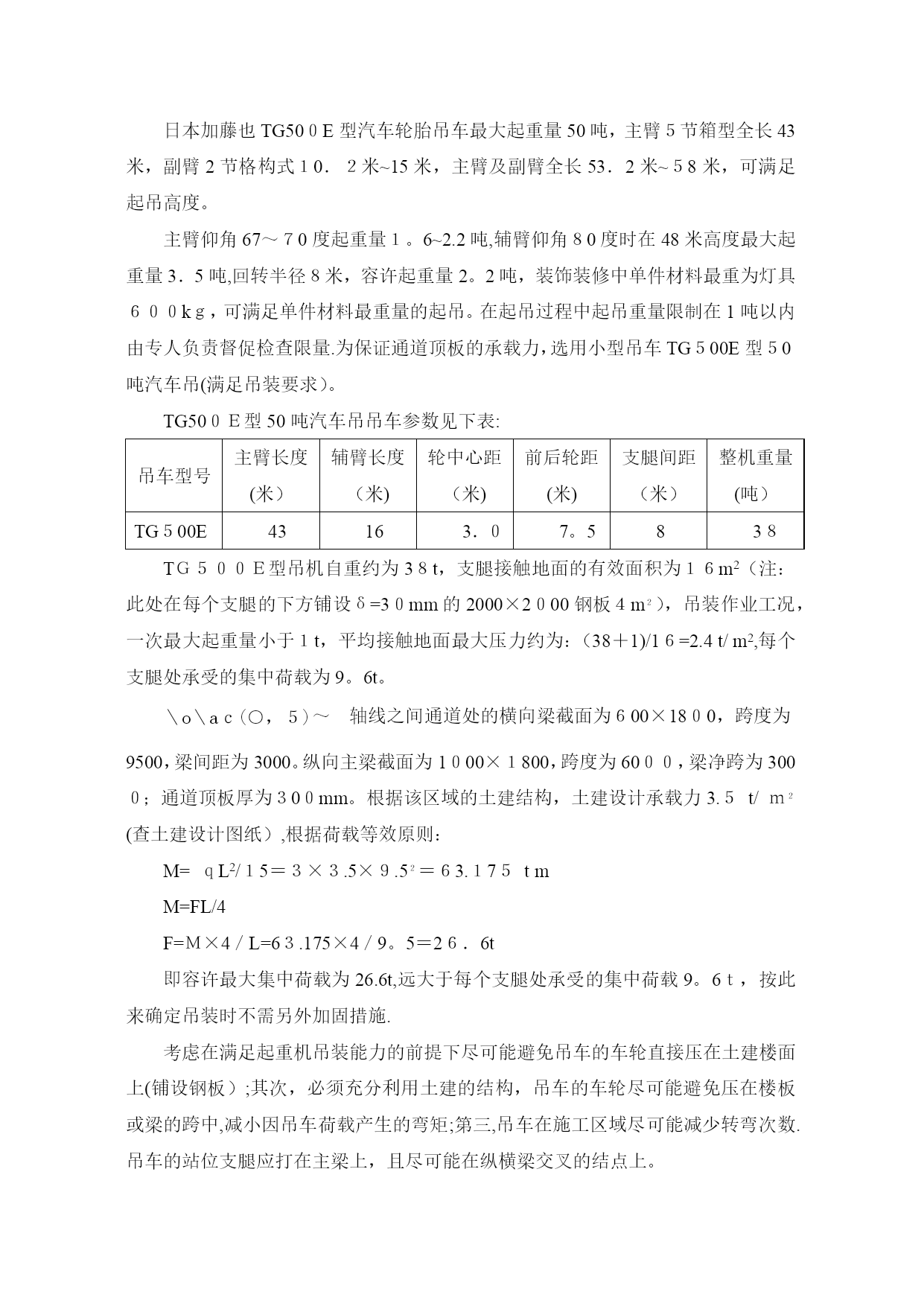垂直水平运输计划(完整资料)(可以直接使用,可编辑优秀版资料,欢迎下载)一、工程概况(一)、装饰装修施工内容及用材概况1、地面:石材地面、地毯地面、地砖地面、地板地面等2、墙面:石材干挂墙面、木饰面墙面、可移动木质隔墙等。3、顶棚:铝板吊顶、发光吊顶、石膏板吊顶、防水石膏板吊顶。4、玻璃隔断:钢化玻璃隔断、钢化防火玻璃隔断等。5、门窗:木门、玻璃门、玻璃防火门、钢质防火门等.(二)、本室内装饰工程位于1—3F施工作业面,经测算本标段装饰材料的总重量较大,约1580吨,品种类别多;材料规格尺寸不一,单件最大的材料规格尺寸达到6000mm×1220mm,单件材料最重为灯具约400kg。(三)、现土建工程、屋面工程均己完工或接近完工,因此本标段的垂直运输及对已完工程进行成品保护是本标段施工重点。二、垂直运输方案根据现场实际情况及装饰装修材料的体积、重量、长度及施工用的架设工具等分别采用A、汽车吊车运输超长材料及电梯不便运输的材料;B、混凝土输送泵运输垫层商品混凝土;C、现有的2部电梯进行运输常规材料.(一)、汽车吊垂直运输方案A、行走路线装饰装、修材料,施工用的架杆架料凡是不能从电梯内运输的超长、超宽的装饰装修材料及施工用的架杆架料约780吨,采用日本加藤TG500E型汽车轮胎吊车从G轴南侧⑦~⑧轴线之间,30米×10米空间内,从±0.00直接起吊至所属层指定位置,然后再通过平板手推车运输或人工运输至各施工区域。B、起重机具超长、超宽、的装饰装、修材料及施工用的架杆架料约390吨,采用日本加藤TG500E型汽车轮胎吊车,时间按每吊按10~15分钟计,每天按8小时计需作业时间12天~8天完成.日本加藤也TG500E型汽车轮胎吊车最大起重量50吨,主臂5节箱型全长43米,副臂2节格构式10.2米~15米,主臂及副臂全长53.2米~58米,可满足起吊高度。主臂仰角67~70度起重量1。6~2.2吨,辅臂仰角80度时在48米高度最大起重量3.5吨,回转半径8米,容许起重量2。2吨,装饰装修中单件材料最重为灯具600kg,可满足单件材料最重量的起吊。在起吊过程中起吊重量限制在1吨以内由专人负责督促检查限量.为保证通道顶板的承载力,选用小型吊车TG500E型50吨汽车吊(满足吊装要求)。TG500E型50吨汽车吊吊车参数见下表:吊车型号主臂长度(米)辅臂长度(米)轮中心距(米)前后轮距(米)支腿间距(米)整机重量(吨)TG500E43163.07。5838TG500E型吊机自重约为38t,支腿接触地面的有效面积为16m2(注:此处在每个支腿的下方铺设δ=30mm的2000×2000钢板4m2),吊装作业工况,一次最大起重量小于1t,平均接触地面最大压力约为:(38+1)/16=2.4t/m2,每个支腿处承受的集中荷载为9。6t。eq\o\ac(○,5)~eq\o\ac(○,6)轴线之间通道处的横向梁截面为600×1800,跨度为9500,梁间距为3000。纵向主梁截面为1000×1800,跨度为6000,梁净跨为3000;通道顶板厚为300mm。根据该区域的土建结构,土建设计承载力3.5t/m2(查土建设计图纸),根据荷载等效原则:M=qL2/15=3×3.5×9.52=63.175tmM=FL/4F=M×4/L=63.175×4/9。5=26.6t即容许最大集中荷载为26.6t,远大于每个支腿处承受的集中荷载9。6t,按此来确定吊装时不需另外加固措施.考虑在满足起重机吊装能力的前提下尽可能避免吊车的车轮直接压在土建楼面上(铺设钢板);其次,必须充分利用土建的结构,吊车的车轮尽可能避免压在楼板或梁的跨中,减小因吊车荷载产生的弯矩;第三,吊车在施工区域尽可能减少转弯次数.吊车的站位支腿应打在主梁上,且尽可能在纵横梁交叉的结点上。吊车支腿下方铺设30mm厚2000×2000的钢板,钢板为刚性支撑面,在钢板与地面之间铺上厚300mm的石粉层,一方面起到减震作用,一方面起到分散吊车的集中荷载的作用。吊车在起重作业工况时重心变化引起吊车对土建结构的荷载变化,若吊车的主臂吊重旋转,在旋转过程中,重心也跟随变化。在靠吊重侧的支腿的单位面积承载力大于远离侧。当吊车在以倾覆力矩决定它的最大起重能力时的情况下满负荷作业,此时吊车靠吊重侧的支腿的单位面积承载力接近于平均接触地面的压力的1。5倍。考虑到吊车起吊时,吊车支腿通过钢板地面直接传递到主梁上,每根主梁能承受集中压力为26。6t,足以承受吊车不均匀分布的荷载影响;C、吊装方法所有超长、超宽的装饰装修材料(最大板块尺寸6000×1220)及施工用的架杆架料(最长6米钢管)均采用两点捆绑吊装法。杆件吊装时,钢丝绳与杆件轴线的夹角成4