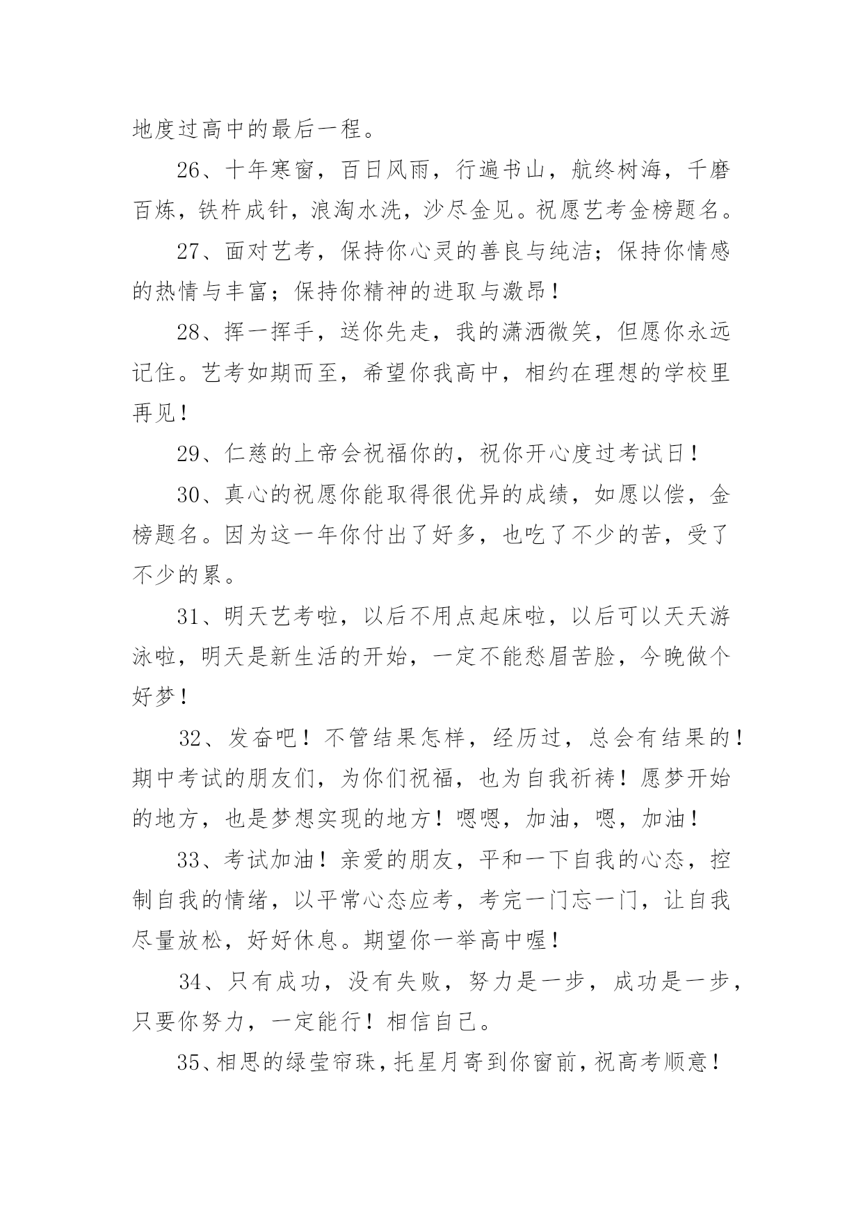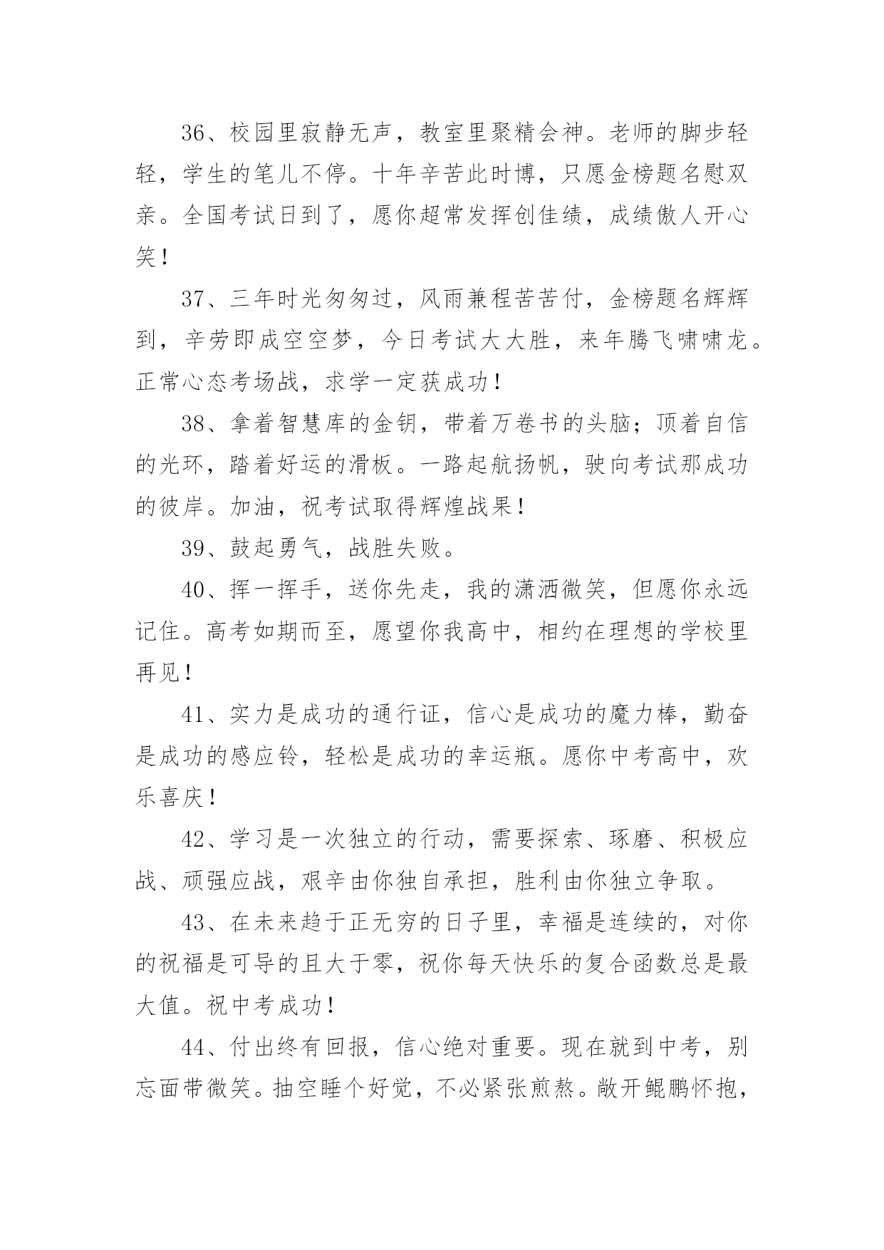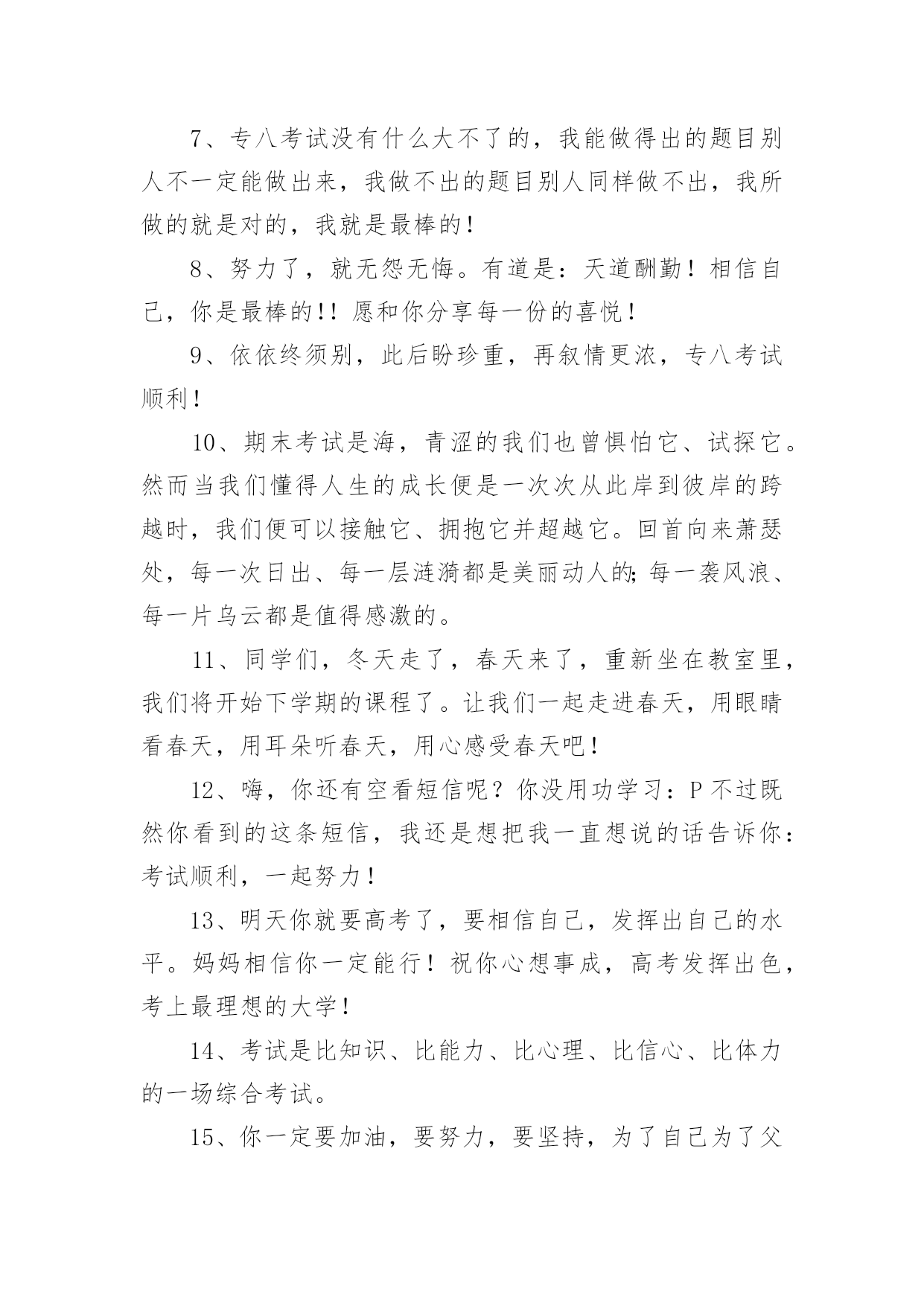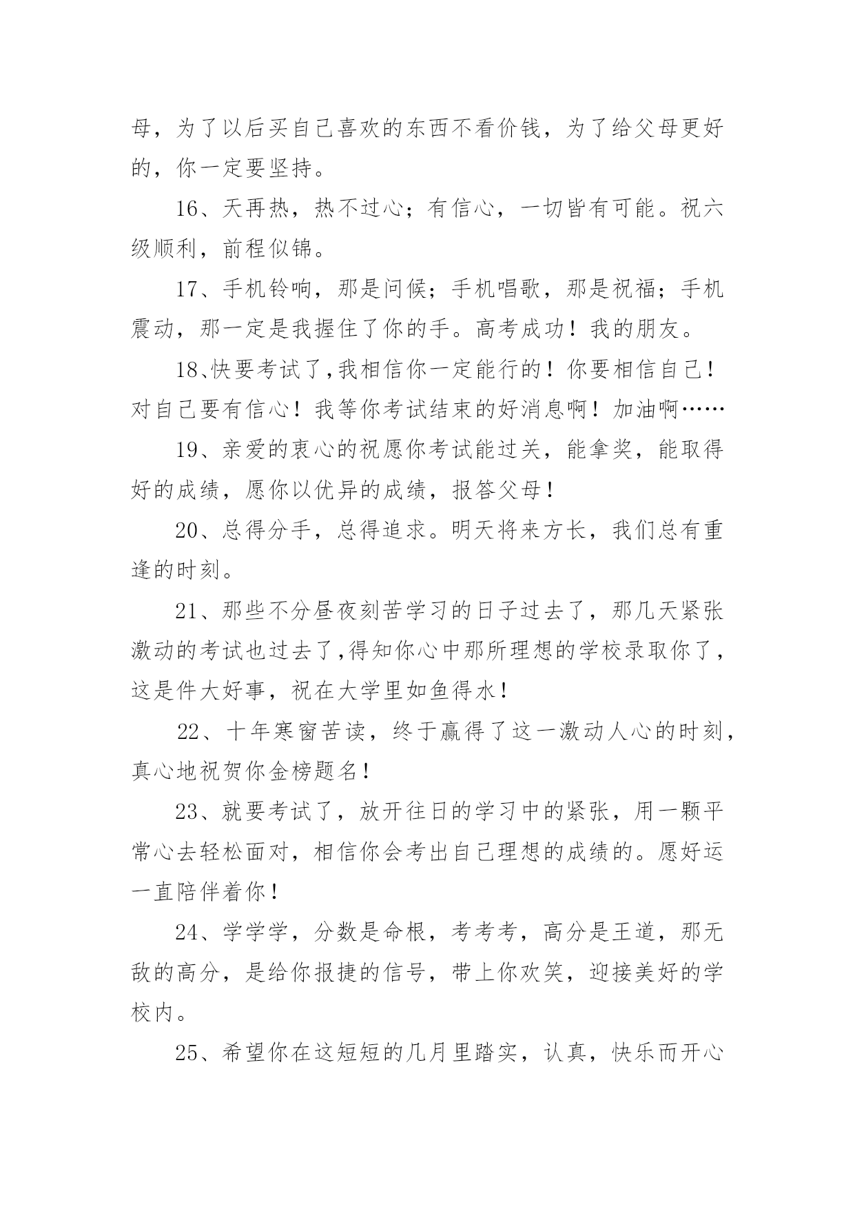 经典考试顺利祝福寄语经典考试顺利祝福寄语200句在日常的学习、工作、生活中,要用到寄语的地方还是很多的,寄语就是把心中想要说的话语用文字表达出来。那什么样的寄语才算得上是经典呢?下面是小编收集整理的经典考试顺利祝福寄语200句,供大家参考借鉴,希望可以帮助到有需要的朋友。1、你今天就要参加考试了,送你一小礼物,据说在考试当天能收到这样一小礼物,就会考出自己满意的成绩,祝你考试好运气啊!2、愿全国所有的考生都能以平常的心态参加考试,发挥自己的水平,考上理想的学校。我真心地祝福你们。3、明天就是考试了,希望在这最后的日子,你能满怀着信心,发挥出你最好的水平,考出最好的成绩!!!加油,好好发挥,老哥支持你!4、放下包袱开动脑筋,勤于思考好好复习,祝你期末考试取得好成绩。5、我们相逢在陌生时,分手在熟悉后。希望明天的你们是快乐的,能够经得起社会的种种考验,最终找到自己的坐标,建造属于自己的事业城堡。祝我们的老大、超哥、旺哥、荣姐在以后的新环境中一切顺利!6、愿全国所有的考生都能以平常的心态参加期中考试,发挥自己的水平,考上理想的学校。我真心地祝福你们。7、专八考试没有什么大不了的,我能做得出的题目别人不一定能做出来,我做不出的题目别人同样做不出,我所做的就是对的,我就是最棒的!8、努力了,就无怨无悔。有道是:天道酬勤!相信自己,你是最棒的!!愿和你分享每一份的喜悦!9、依依终须别,此后盼珍重,再叙情更浓,专八考试顺利!10、期末考试是海,青涩的我们也曾惧怕它、试探它。然而当我们懂得人生的成长便是一次次从此岸到彼岸的跨越时,我们便可以接触它、拥抱它并超越它。回首向来萧瑟处,每一次日出、每一层涟漪都是美丽动人的;每一袭风浪、每一片乌云都是值得感激的。11、同学们,冬天走了,春天来了,重新坐在教室里,我们将开始下学期的课程了。让我们一起走进春天,用眼睛看春天,用耳朵听春天,用心感受春天吧!12、嗨,你还有空看短信呢?你没用功学习:P不过既然你看到的这条短信,我还是想把我一直想说的话告诉你:考试顺利,一起努力!13、明天你就要高考了,要相信自己,发挥出自己的水平。妈妈相信你一定能行!祝你心想事成,高考发挥出色,考上最理想的大学!14、考试是比知识、比能力、比心理、比信心、比体力的一场综合考试。15、你一定要加油,要努力,要坚持,为了自己为了父母,为了以后买自己喜欢的东西不看价钱,为了给父母更好的,你一定要坚持。16、天再热,热不过心;有信心,一切皆有可能。祝六级顺利,前程似锦。17、手机铃响,那是问候;手机唱歌,那是祝福;手机震动,那一定是我握住了你的手。高考成功!我的朋友。18、快要考试了,我相信你一定能行的!你要相信自己!对自己要有信心!我等你考试结束的好消息啊!加油啊……19、亲爱的衷心的祝愿你考试能过关,能拿奖,能取得好的成绩,愿你以优异的成绩,报答父母!20、总得分手,总得追求。明天将来方长,我们总有重逢的时刻。21、那些不分昼夜刻苦学习的日子过去了,那几天紧张激动的考试也过去了,得知你心中那所理想的学校录取你了,这是件大好事,祝在大学里如鱼得水!22、十年寒窗苦读,终于赢得了这一激动人心的时刻,真心地祝贺你金榜题名!23、就要考试了,放开往日的学习中的紧张,用一颗平常心去轻松面对,相信你会考出自己理想的成绩的。愿好运一直陪伴着你!24、学学学,分数是命根,考考考,高分是王道,那无敌的高分,是给你报捷的信号,带上你欢笑,迎接美好的学校内。25、希望你在这短短的几月里踏实,认真,快乐而开心地度过高中的最后一程。26、十年寒窗,百日风雨,行遍书山,航终树海,千磨百炼,铁杵成针,浪淘水洗,沙尽金见。祝愿艺考金榜题名。27、面对艺考,保持你心灵的善良与纯洁;保持你情感的热情与丰富;保持你精神的进取与激昂!28、挥一挥手,送你先走,我的潇洒微笑,但愿你永远记住。艺考如期而至,希望你我高中,相约在理想的学校里再见!29、仁慈的上帝会祝福你的,祝你开心度过考试日!30、真心的祝愿你能取得很优异的成绩,如愿以偿,金榜题名。因为这一年你付出了好多,也吃了不少的苦,受了不少的累。31、明天艺考啦,以后不用点起床啦,以后可以天天游泳啦,明天是新生活的开始,一定不能愁眉苦脸,今晚做个好梦!32、发奋吧!不管结果怎样,经历过,总会有结果的!期中考试的朋友们,为你们祝福,也为自我祈祷!愿梦开始的地方,也是梦想实现的地方!嗯嗯,加油,嗯,加油!33、考试加油!亲爱的朋友,平和一下自我的心态,控制自我的情绪,以平常心态应考,考完一门忘一门,让自我尽量放松,好好休息。期望你一举高中喔!34、只有成功,没有失败,努力是一步,成功是一步,只要你努力,一定能行!相信自己。35、相思的绿莹帘珠,托星月寄到你窗前,祝高考顺意!36、校园里寂静无声,教室里聚精会神。老师的脚