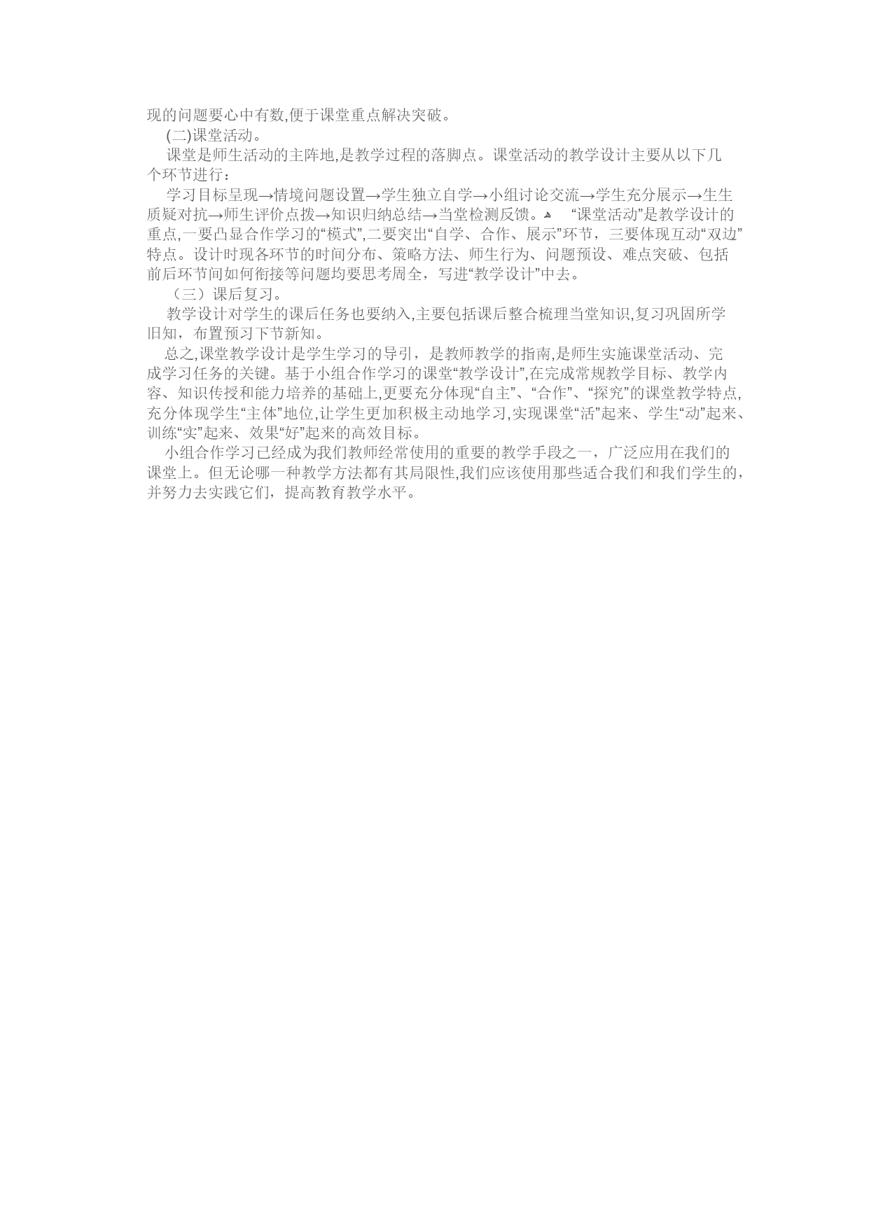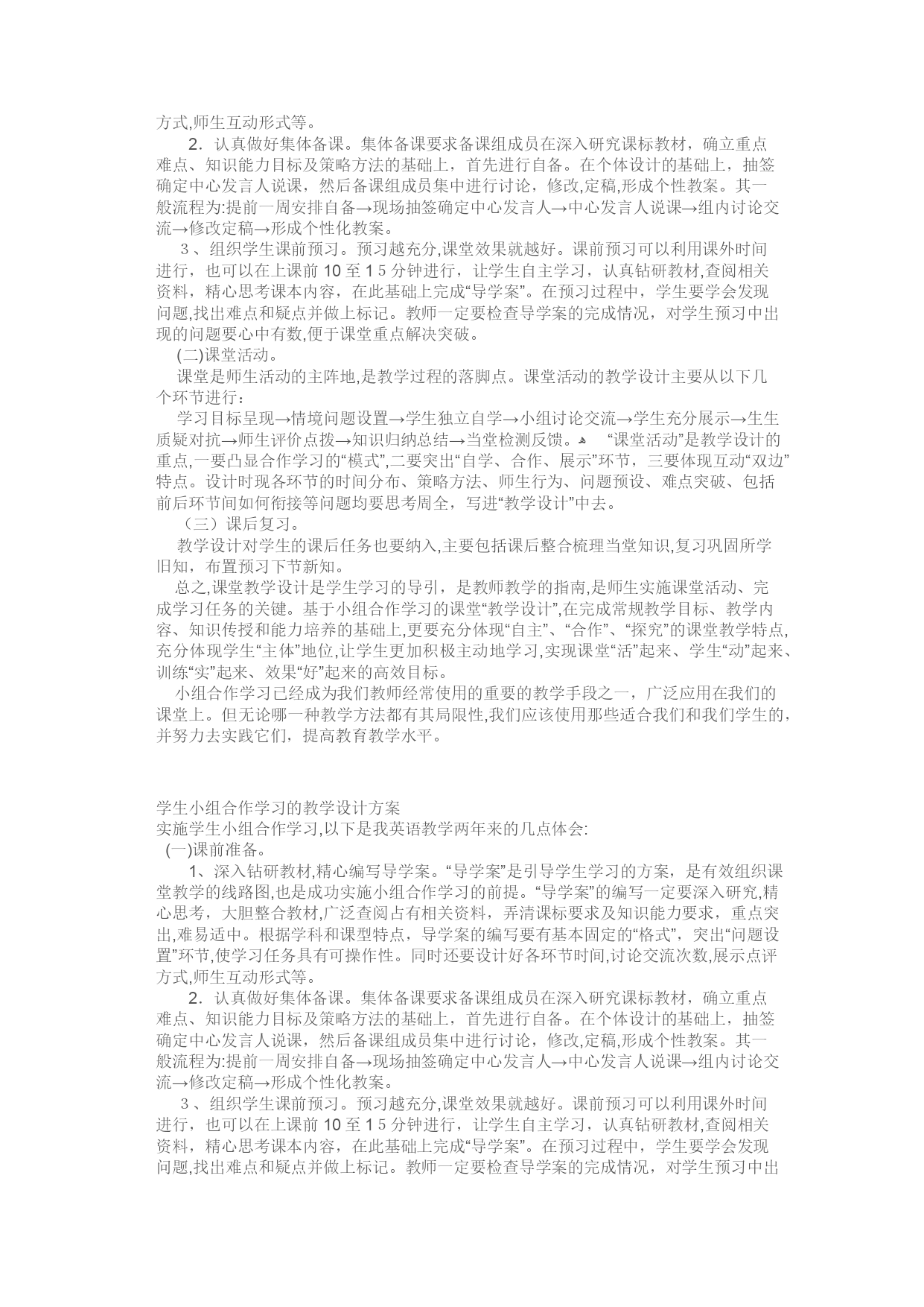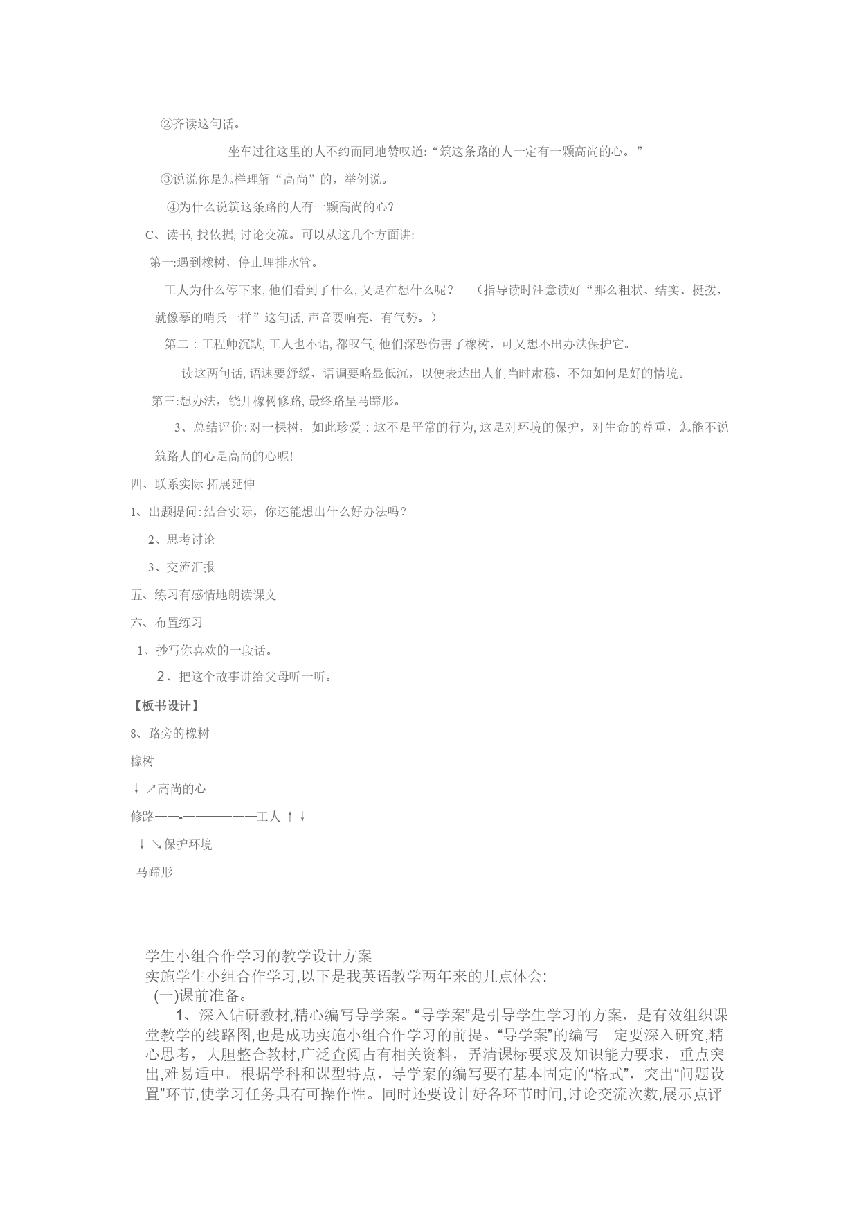 《路旁的橡树》教学设计【教学内容及分析】《路旁的橡树》是人教版三年级下册第8课内容。此文是第二单元的一篇略读课文。讲述的是“工人们在修建公路时,发现一颗粗壮、结实、挺拔的大橡树挺立在路基的中央。为了保护橡树,工人们与工程师经过精心设计,在不改变筑路计划的前提下,是公路在橡树边拐了一个马蹄形的弯,既保护了橡树,又圆满的完成了筑路计划”的故事。表现了人们对草木的珍惜,赞扬了工程师和筑路工人的环境保护意识强。本文语言质朴,情节简单,所反映的人们的行为非常高尚。选编的意图是在读懂课文的基础上,结合生活实际培养学生的环保意识。【教学目标】1、正确、流利、有感情地朗读课文。2、了解课文内容,体会筑路人高尚的心。3、培养独立阅读的能力【教学重点】体会人们为保护橡树而体现出一颗高尚的心,联系生活实际为保护环境做出自己的努力。【教学准备】1、查字典,理解“高尚”一词的意思。联系生活及读书经历,想想哪些行为是高尚的。2、搜集有关人类保护或破坏自然环境的资料【教学时间】1课时【教学过程】一、比较导入揭示课题第7课的内容是什么?人们是怎样对待橡树的?二、初读课文整体感知根握阅读提示自学课文1、把课文读正确、流利。2、思考:课文将了一件什么事?你对这件事有什么看法?三、检查自学组织交流1、指名读课文,指导读正确。并读读下列词语:公路宽阔平坦漂亮马蹄橡树粗壮结实挺拨高尚2、交流思考题。(1)交流第一个问题:课文写了一件什么事?(2)交流看法。A、小组内交流。B、全班交流。要尊重学生的想法。①引导重点交流:(出示投影片)插图及课文景后一句话。②齐读这句话。坐车过往这里的人不约而同地赞叹道:“筑这条路的人一定有一颗高尚的心。”③说说你是怎样理解“高尚”的,举例说。④为什么说筑这条路的人有一颗高尚的心?C、读书,找依据,讨论交流。可以从这几个方面讲:第一:遇到橡树,停止埋排水管。工人为什么停下来,他们看到了什么,又是在想什么呢?(指导读时注意读好“那么粗状、结实、挺拨,就像摹的哨兵一样”这句话,声音要响亮、有气势。)第二:工程师沉默,工人也不语,都叹气,他们深恐伤害了橡树,可又想不出办法保护它。读这两句话,语速要舒缓、语调要略显低沉,以便表达出人们当时肃穆、不知如何是好的情境。第三:想办法,绕开橡树修路,最终路呈马蹄形。3、总结评价:对一棵树,如此珍爱:这不是平常的行为,这是对环境的保护,对生命的尊重,怎能不说筑路人的心是高尚的心呢!四、联系实际拓展延伸1、出题提问:结合实际,你还能想出什么好办法吗?2、思考讨论3、交流汇报五、练习有感情地朗读课文六、布置练习1、抄写你喜欢的一段话。2、把这个故事讲给父母听一听。【板书设计】8、路旁的橡树橡树↓↗高尚的心修路——-——————工人↑↓↓↘保护环境马蹄形学生小组合作学习的教学设计方案实施学生小组合作学习,以下是我英语教学两年来的几点体会:(一)课前准备。1、深入钻研教材,精心编写导学案。“导学案”是引导学生学习的方案,是有效组织课堂教学的线路图,也是成功实施小组合作学习的前提。“导学案”的编写一定要深入研究,精心思考,大胆整合教材,广泛查阅占有相关资料,弄清课标要求及知识能力要求,重点突出,难易适中。根据学科和课型特点,导学案的编写要有基本固定的“格式”,突出“问题设置”环节,使学习任务具有可操作性。同时还要设计好各环节时间,讨论交流次数,展示点评方式,师生互动形式等。2.认真做好集体备课。集体备课要求备课组成员在深入研究课标教材,确立重点难点、知识能力目标及策略方法的基础上,首先进行自备。在个体设计的基础上,抽签确定中心发言人说课,然后备课组成员集中进行讨论,修改,定稿,形成个性教案。其一般流程为:提前一周安排自备→现场抽签确定中心发言人→中心发言人说课→组内讨论交流→修改定稿→形成个性化教案。3、组织学生课前预习。预习越充分,课堂效果就越好。课前预习可以利用课外时间进行,也可以在上课前10至15分钟进行,让学生自主学习,认真钻研教材,查阅相关资料,精心思考课本内容,在此基础上完成“导学案”。在预习过程中,学生要学会发现问题,找出难点和疑点并做上标记。教师一定要检查导学案的完成情况,对学生预习中出现的问题要心中有数,便于课堂重点解决突破。(二)课堂活动。课堂是师生活动的主阵地,是教学过程的落脚点。课堂活动的教学设计主要从以下几个环节进行:学习目标呈现→情境问题设置→学生独立自学→小组讨论交流→学生充分展示→生生质疑对抗→师生评价点拨→知识归纳总结→当堂检测反馈。ﻫ“课堂活动”是教学设计的重点,一要凸显合作学习的“模式”,二要突出“自学、合作、展示”环节,三要体现互动“双边”特点。设计时现各环