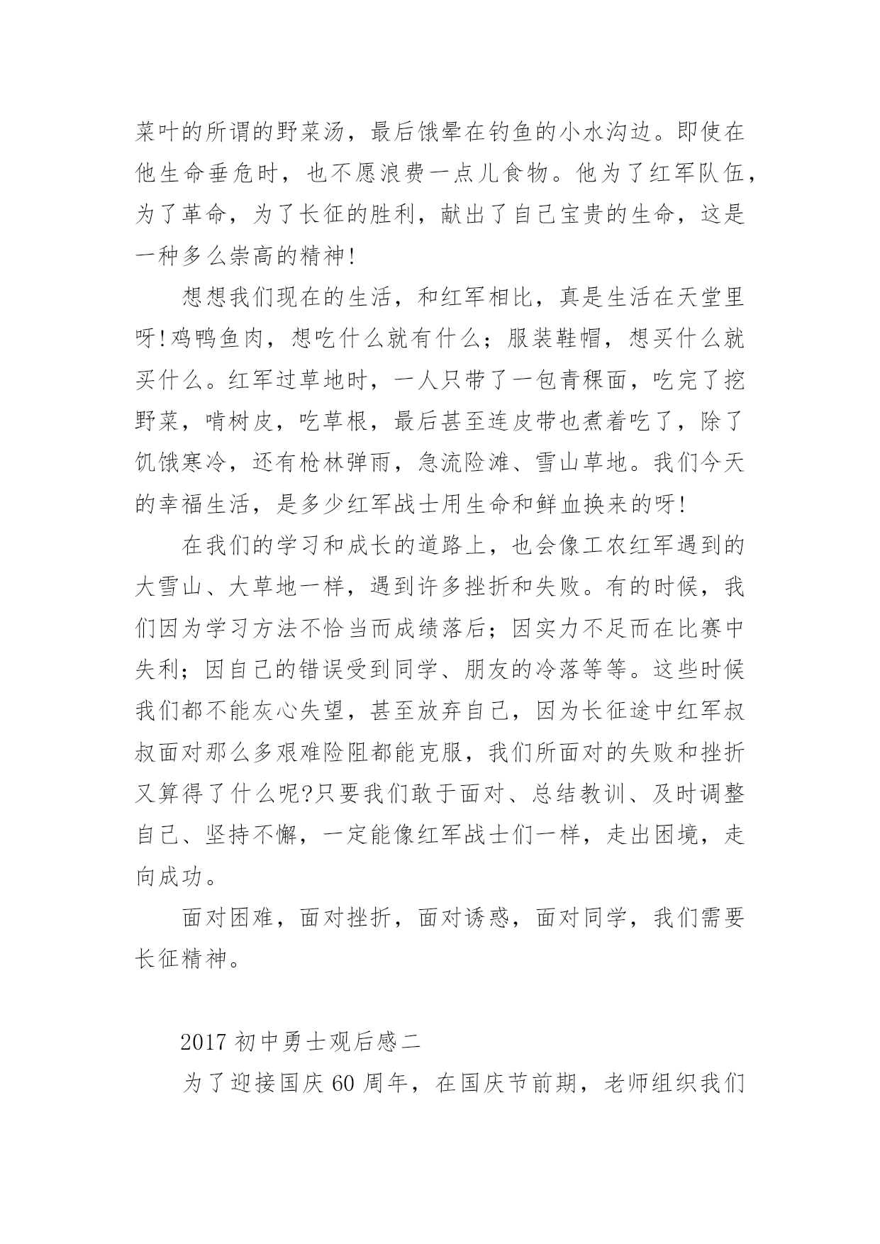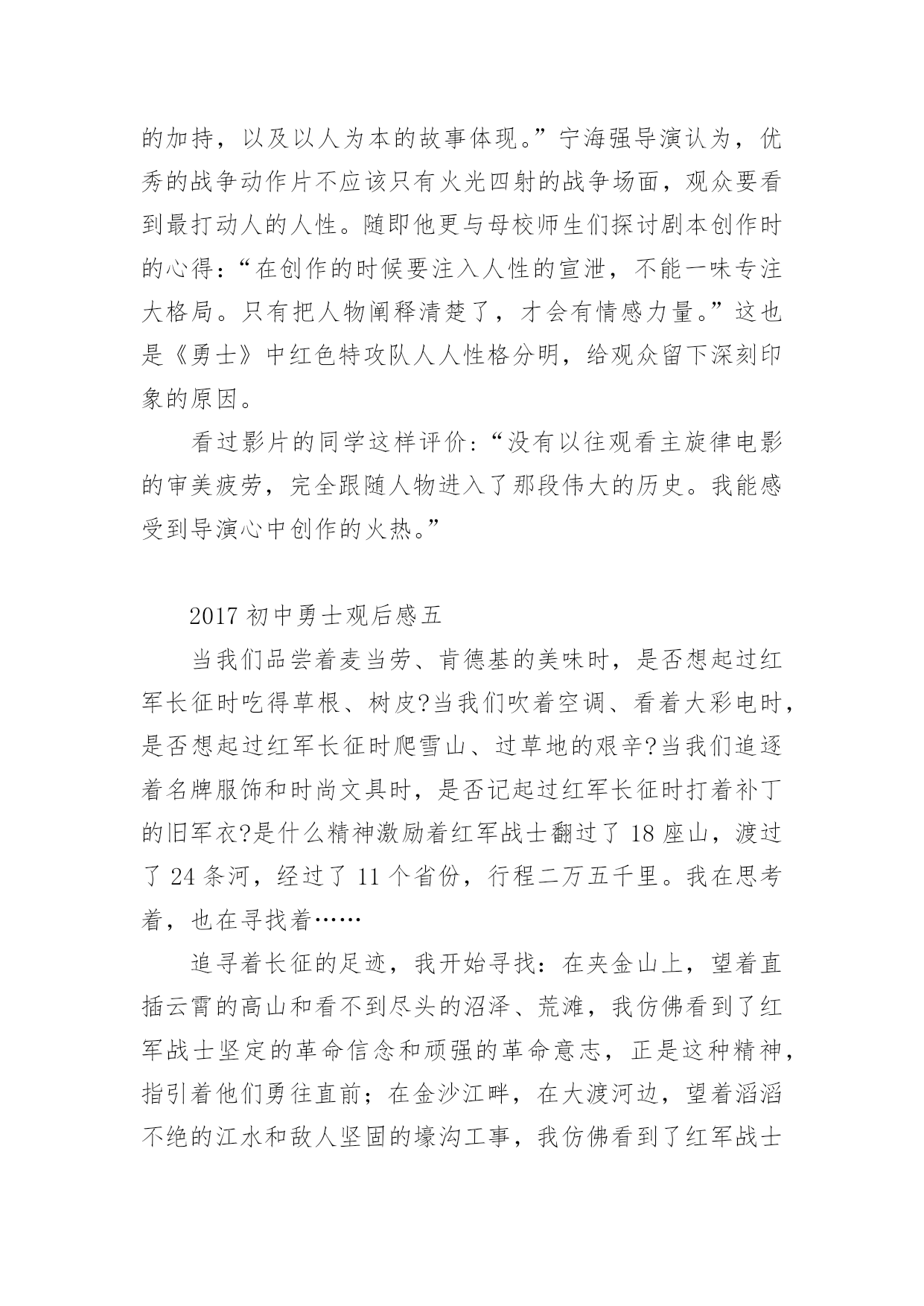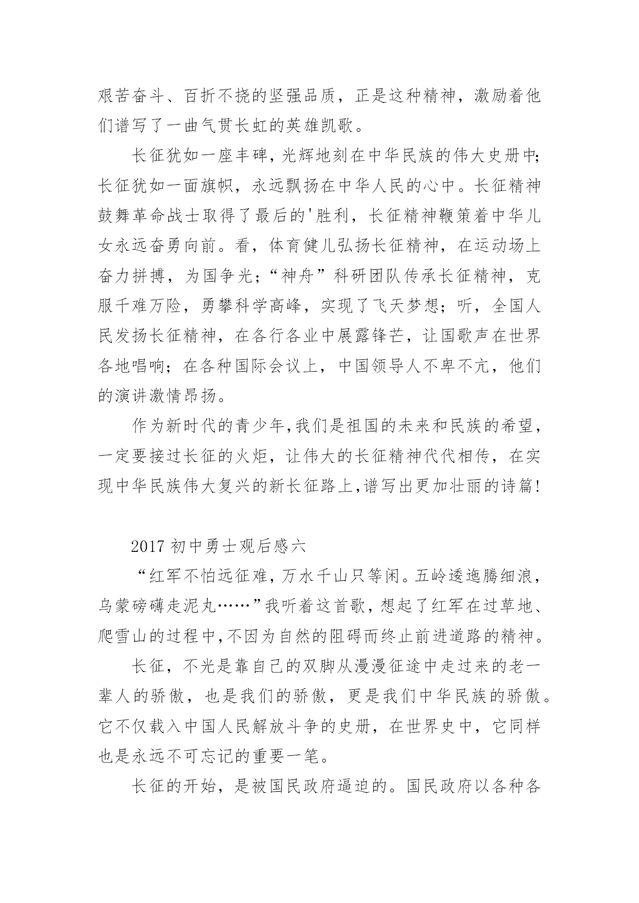 初中勇士观后感2017初中勇士观后感《勇士》以红军长征途中强渡大渡河,飞夺泸定桥的英雄史实为原型,展现了勇士们在敌人的围追堵截中大智大勇,挑战生死关口的非凡经历,剧情感人至深。那么2017初中勇士观后感有哪些?大家不妨来看看小编推送的2017初中勇士观后感,希望给大家带来帮助!2017初中勇士观后感一“红军不怕远征难,万水千山只等闲。五岭逶迤腾细浪,乌蒙磅礴走泥丸。金沙水拍云崖暖,大渡桥横铁索寒。更喜岷山千里雪,三军过后尽开颜。”这是毛主席对长征的概括,从这儿我读出了红军之所以能够取得胜利,是因为他们发扬了“一不怕苦,二不怕死的革命乐观主义精神。”长征途中,发生过多少可歌可泣的故事。我不会忘记《金色的鱼钩》《倔强的小红军》《军神》《丰碑》《草地夜行》《三人行》等感人至深的故事。故事展现给我们的有激烈的战斗场面,有钢筋铁骨般的战斗英雄,有舍己为人的普通战士,有同志间浓浓的亲情。在这些故事中,《金色的鱼钩》更给我留下了深刻的印象,久久不能忘怀。一位年过半百的炊事班长,为了让患病的几个小战士吃到足够的食物,宁愿自己啃他们吃剩的鱼骨头,喝漂着一点菜叶的所谓的野菜汤,最后饿晕在钓鱼的小水沟边。即使在他生命垂危时,也不愿浪费一点儿食物。他为了红军队伍,为了革命,为了长征的胜利,献出了自己宝贵的生命,这是一种多么崇高的精神!想想我们现在的生活,和红军相比,真是生活在天堂里呀!鸡鸭鱼肉,想吃什么就有什么;服装鞋帽,想买什么就买什么。红军过草地时,一人只带了一包青稞面,吃完了挖野菜,啃树皮,吃草根,最后甚至连皮带也煮着吃了,除了饥饿寒冷,还有枪林弹雨,急流险滩、雪山草地。我们今天的幸福生活,是多少红军战士用生命和鲜血换来的呀!在我们的学习和成长的道路上,也会像工农红军遇到的大雪山、大草地一样,遇到许多挫折和失败。有的时候,我们因为学习方法不恰当而成绩落后;因实力不足而在比赛中失利;因自己的错误受到同学、朋友的冷落等等。这些时候我们都不能灰心失望,甚至放弃自己,因为长征途中红军叔叔面对那么多艰难险阻都能克服,我们所面对的失败和挫折又算得了什么呢?只要我们敢于面对、总结教训、及时调整自己、坚持不懈,一定能像红军战士们一样,走出困境,走向成功。面对困难,面对挫折,面对诱惑,面对同学,我们需要长征精神。2017初中勇士观后感二为了迎接国庆60周年,在国庆节前期,老师组织我们观看了革命历史题材巨片《长征》,影片真实再现了工农红军“二万五千里长征”的伟大壮举。让我在深刻了解中国历史的同时,心灵受到了无比地冲击和震撼,更感受到了伟大祖国那坚强不屈、坚韧不拔的精神。1934年,蒋xx对红军中央苏区进行了五次疯狂地大围剿,在反围剿失败后,红军被迫进行了战略性转移,从而开始了震惊中外的“两万五千里长征”。在长征的艰难路程中,经历了飞夺泸定桥、湘江战役、强渡乌江、四渡赤水等战役,但是让我感触最深地还是在那艰苦环境下,没有食物、没有交通工具、物资极度缺乏、恶劣的自然环境再加上xx党部队的拦截追击,有多少红军战士牺牲在战场上;有多少舍生忘死的感人事迹;更有多少爱国志士抛头颅洒热血,可是工农红军们毅然表现出一往无前、不怕牺牲的英雄气概令人无比敬佩!看,无论是爬雪山还是过草地,无论是大渡河还是金沙江,无论蒋xx的部队有多么的精锐和残忍,都无法阻挡红军前进的步伐!更无法阻挡伟大中国共产党的复兴之路!长征不仅是一段光荣的历史,更是一种坚强的精神,它深深地感动着我们每一代人。让我们记住那段历史、发扬那顽强的拼搏精神,为我们祖国的繁荣富强而努力奋斗!2017初中勇士观后感三昨天下午,我上网看了《长征》这部电影,我聚精会神、全神贯注,深深地被影片中红军战士那种为了中国革命的胜利,为了我们今天的幸福生活,不怕艰难困苦,勇于牺牲的忘我精神而感动。雪皑皑,夜茫茫。高原寒,炊断粮……多么艰苦的生活啊!可红军战士们野菜充饥志越坚,革命理想高于天。是啊,红军长征的丰功伟绩是千古唯独,万世无双的,红军长征的壮烈和坚韧是惊天地、泣鬼神、是人神共仰的,红军长征的艰难困苦是凡人难以想象、难以理解的,红军长征的精神是举世齐颂、万国同歌、亿民共赞的。红军二万五千里长征,展示了中国工农红军的攻无不克、战无不胜、无坚不摧的伟大天兵神威,翻开了中国共产党从艰苦走向胜利,从幼年走向成熟的新一页,宣告了赶走日本帝国主义、推翻蒋家王朝,中华民族不是东亚病夫,而是永远屹立于世界民族之林的东方之子。在看《长征》影片时,我高兴、我悲戚、我感动、我流泪。看到那湘江激战、那四渡赤水、那抢渡乌江、那飞夺泸定、那爬雪山、过草地、攻克腊子口,以及马蹄声急,见到那一个个倒下去的革命先烈,使我一次次流下了热泪,那十盼红军的旋律在我耳边不时回环,那千万红军的身影不时在我脑中呈现,那前赴后继、百折不挠的革命精神无时不在我心中回荡着。记得毛