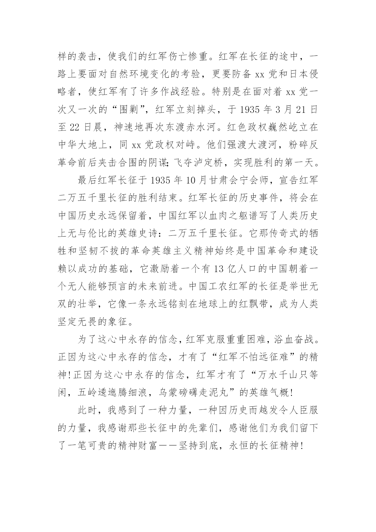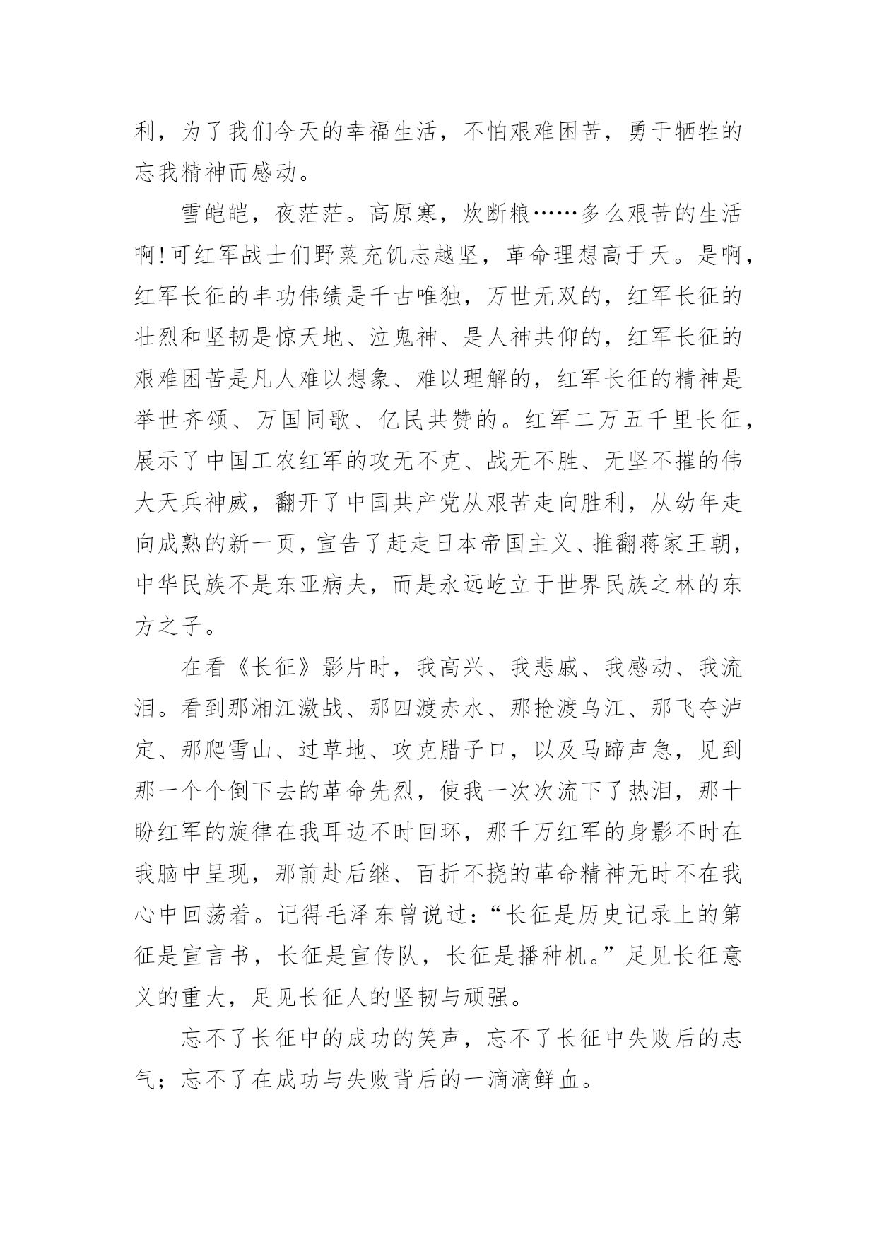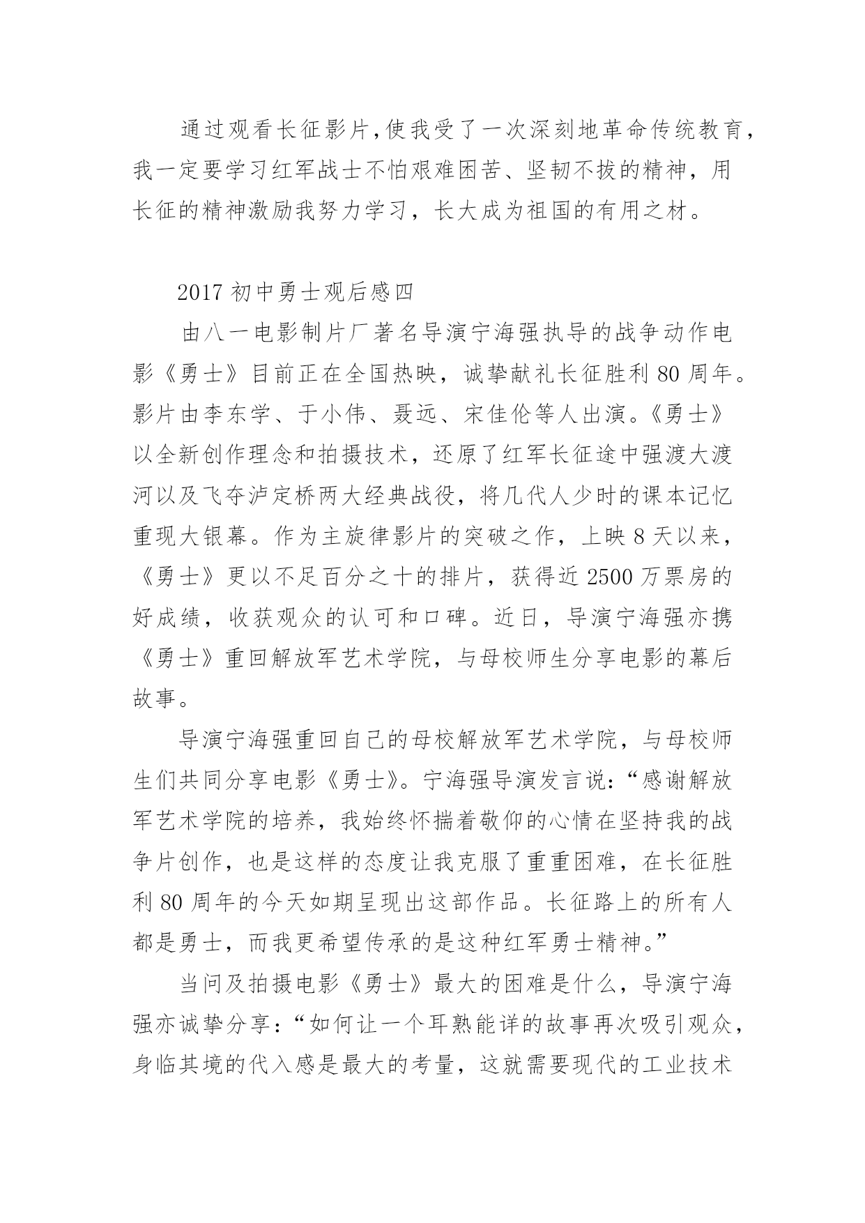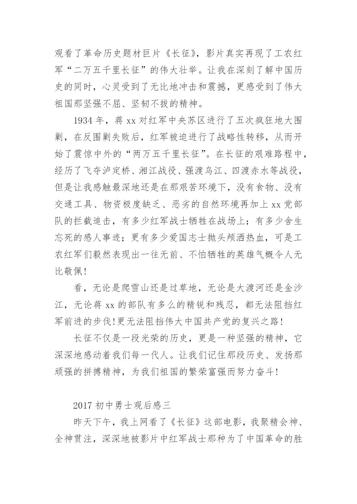 初中勇士观后感2017初中勇士观后感《勇士》以红军长征途中强渡大渡河,飞夺泸定桥的英雄史实为原型,展现了勇士们在敌人的围追堵截中大智大勇,挑战生死关口的非凡经历,剧情感人至深。那么2017初中勇士观后感有哪些?大家不妨来看看小编推送的2017初中勇士观后感,希望给大家带来帮助!2017初中勇士观后感一“红军不怕远征难,万水千山只等闲。五岭逶迤腾细浪,乌蒙磅礴走泥丸。金沙水拍云崖暖,大渡桥横铁索寒。更喜岷山千里雪,三军过后尽开颜。”这是毛主席对长征的概括,从这儿我读出了红军之所以能够取得胜利,是因为他们发扬了“一不怕苦,二不怕死的革命乐观主义精神。”长征途中,发生过多少可歌可泣的故事。我不会忘记《金色的鱼钩》《倔强的小红军》《军神》《丰碑》《草地夜行》《三人行》等感人至深的故事。故事展现给我们的有激烈的战斗场面,有钢筋铁骨般的战斗英雄,有舍己为人的普通战士,有同志间浓浓的亲情。在这些故事中,《金色的鱼钩》更给我留下了深刻的印象,久久不能忘怀。一位年过半百的炊事班长,为了让患病的几个小战士吃到足够的食物,宁愿自己啃他们吃剩的鱼骨头,喝漂着一点菜叶的所谓的野菜汤,最后饿晕在钓鱼的小水沟边。即使在他生命垂危时,也不愿浪费一点儿食物。他为了红军队伍,为了革命,为了长征的胜利,献出了自己宝贵的生命,这是一种多么崇高的精神!想想我们现在的生活,和红军相比,真是生活在天堂里呀!鸡鸭鱼肉,想吃什么就有什么;服装鞋帽,想买什么就买什么。红军过草地时,一人只带了一包青稞面,吃完了挖野菜,啃树皮,吃草根,最后甚至连皮带也煮着吃了,除了饥饿寒冷,还有枪林弹雨,急流险滩、雪山草地。我们今天的幸福生活,是多少红军战士用生命和鲜血换来的呀!在我们的学习和成长的道路上,也会像工农红军遇到的大雪山、大草地一样,遇到许多挫折和失败。有的时候,我们因为学习方法不恰当而成绩落后;因实力不足而在比赛中失利;因自己的错误受到同学、朋友的冷落等等。这些时候我们都不能灰心失望,甚至放弃自己,因为长征途中红军叔叔面对那么多艰难险阻都能克服,我们所面对的失败和挫折又算得了什么呢?只要我们敢于面对、总结教训、及时调整自己、坚持不懈,一定能像红军战士们一样,走出困境,走向成功。面对困难,面对挫折,面对诱惑,面对同学,我们需要长征精神。2017初中勇士观后感二为了迎接国庆60周年,在国庆节前期,老师组织我们观看了革命历史题材巨片《长征》,影片真实再现了工农红军“二万五千里长征”的伟大壮举。让我在深刻了解中国历史的同时,心灵受到了无比地冲击和震撼,更感受到了伟大祖国那坚强不屈、坚韧不拔的精神。1934年,蒋xx对红军中央苏区进行了五次疯狂地大围剿,在反围剿失败后,红军被迫进行了战略性转移,从而开始了震惊中外的“两万五千里长征”。在长征的艰难路程中,经历了飞夺泸定桥、湘江战役、强渡乌江、四渡赤水等战役,但是让我感触最深地还是在那艰苦环境下,没有食物、没有交通工具、物资极度缺乏、恶劣的自然环境再加上xx党部队的拦截追击,有多少红军战士牺牲在战场上;有多少舍生忘死的感人事迹;更有多少爱国志士抛头颅洒热血,可是工农红军们毅然表现出一往无前、不怕牺牲的英雄气概令人无比敬佩!看,无论是爬雪山还是过草地,无论是大渡河还是金沙江,无论蒋xx的部队有多么的精锐和残忍,都无法阻挡红军前进的步伐!更无法阻挡伟大中国共产党的复兴之路!长征不仅是一段光荣的历史,更是一种坚强的精神,它深深地感动着我们每一代人。让我们记住那段历史、发扬那顽强的拼搏精神,为我们祖国的繁荣富强而努力奋斗!2017初中勇士观后感三昨天下午,我上网看了《长征》这部电影,我聚精会神、全神贯注,深深地被影片中红军战士那种为了中国革命的胜利,为了我们今天的幸福生活,不怕艰难困苦,勇于牺牲的忘我精神而感动。雪皑皑,夜茫茫。高原寒,炊断粮……多么艰苦的生活啊!可红军战士们野菜充饥志越坚,革命理想高于天。是啊,红军长征的丰功伟绩是千古唯独,万世无双的,红军长征的壮烈和坚韧是惊天地、泣鬼神、是人神共仰的,红军长征的艰难困苦是凡人难以想象、难以理解的,红军长征的精神是举世齐颂、万国同歌、亿民共赞的。红军二万五千里长征,展示了中国工农红军的攻无不克、战无不胜、无坚不摧的伟大天兵神威,翻开了中国共产党从艰苦走向胜利,从幼年走向成熟的新一页,宣告了赶走日本帝国主义、推翻蒋家王朝,中华民族不是东亚病夫,而是永远屹立于世界民族之林的东方之子。在看《长征》影片时,我高兴、我悲戚、我感动、我流泪。看到那湘江激战、那四渡赤水、那抢渡乌江、那飞夺泸定、那爬雪山、过草地、攻克腊子口,以及马蹄声急,见到那一个个倒下去的革命先烈,使我一次次流下了热泪,那十盼红军的旋律在我耳边不时回环,那千万红军的身影不时在我脑中呈现,那前赴后继、百折不挠的革命精神无时不在我心中回荡着。记得毛
