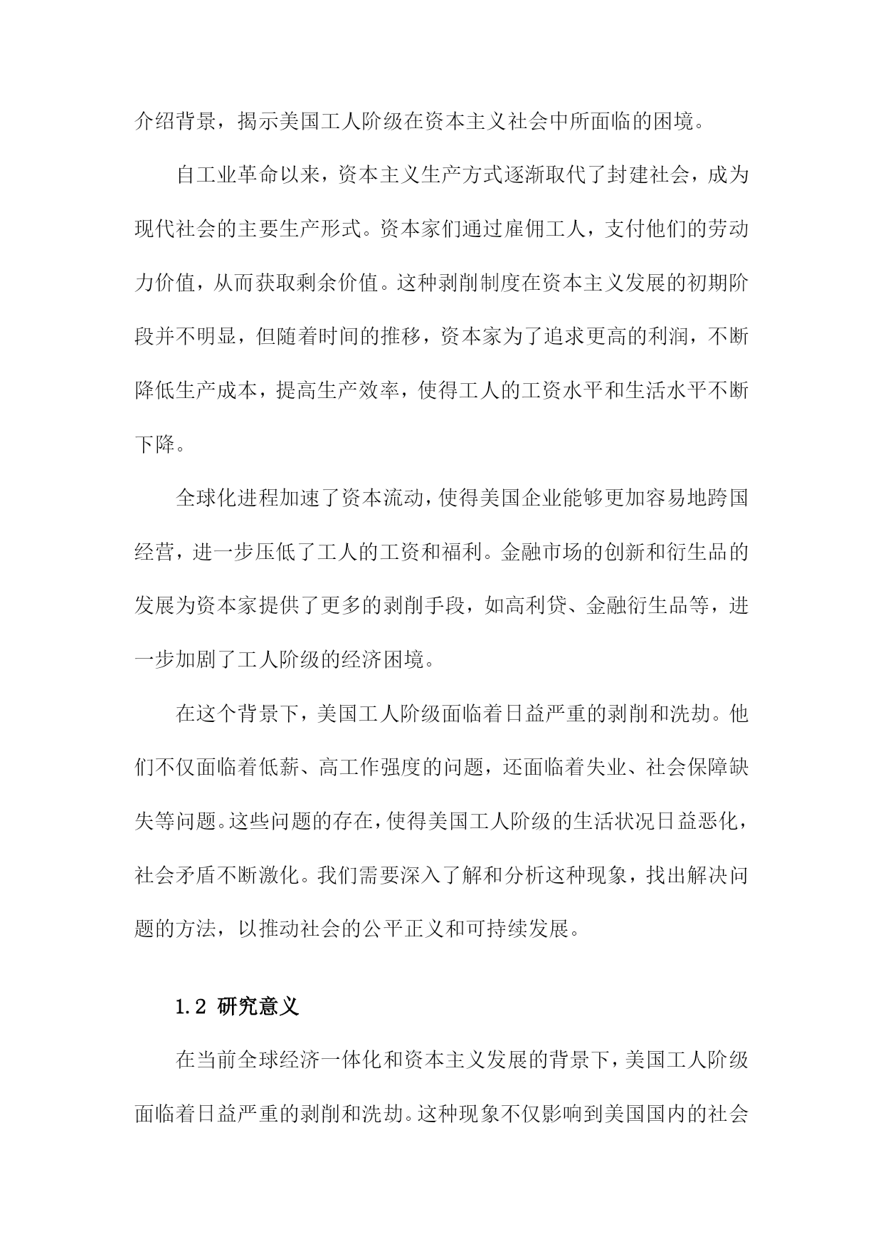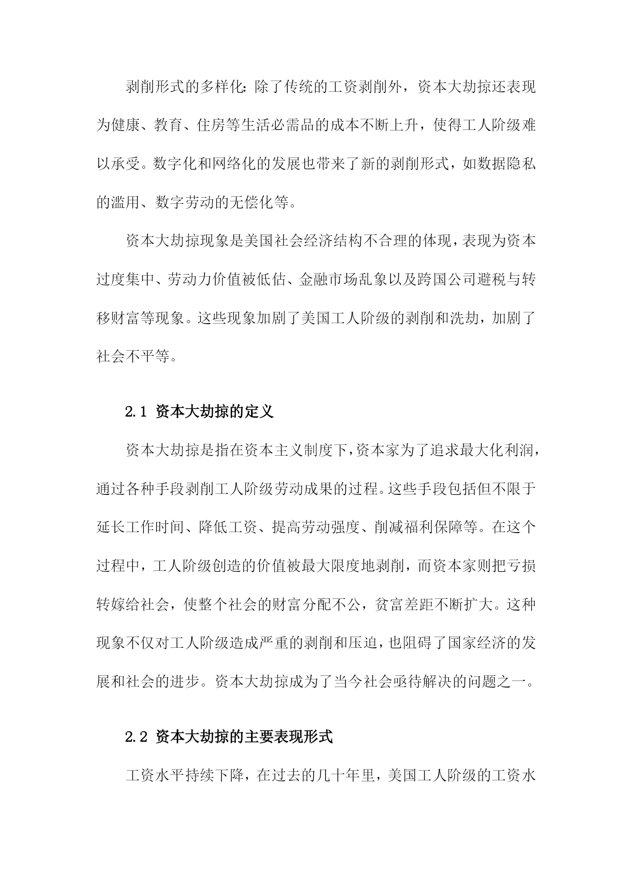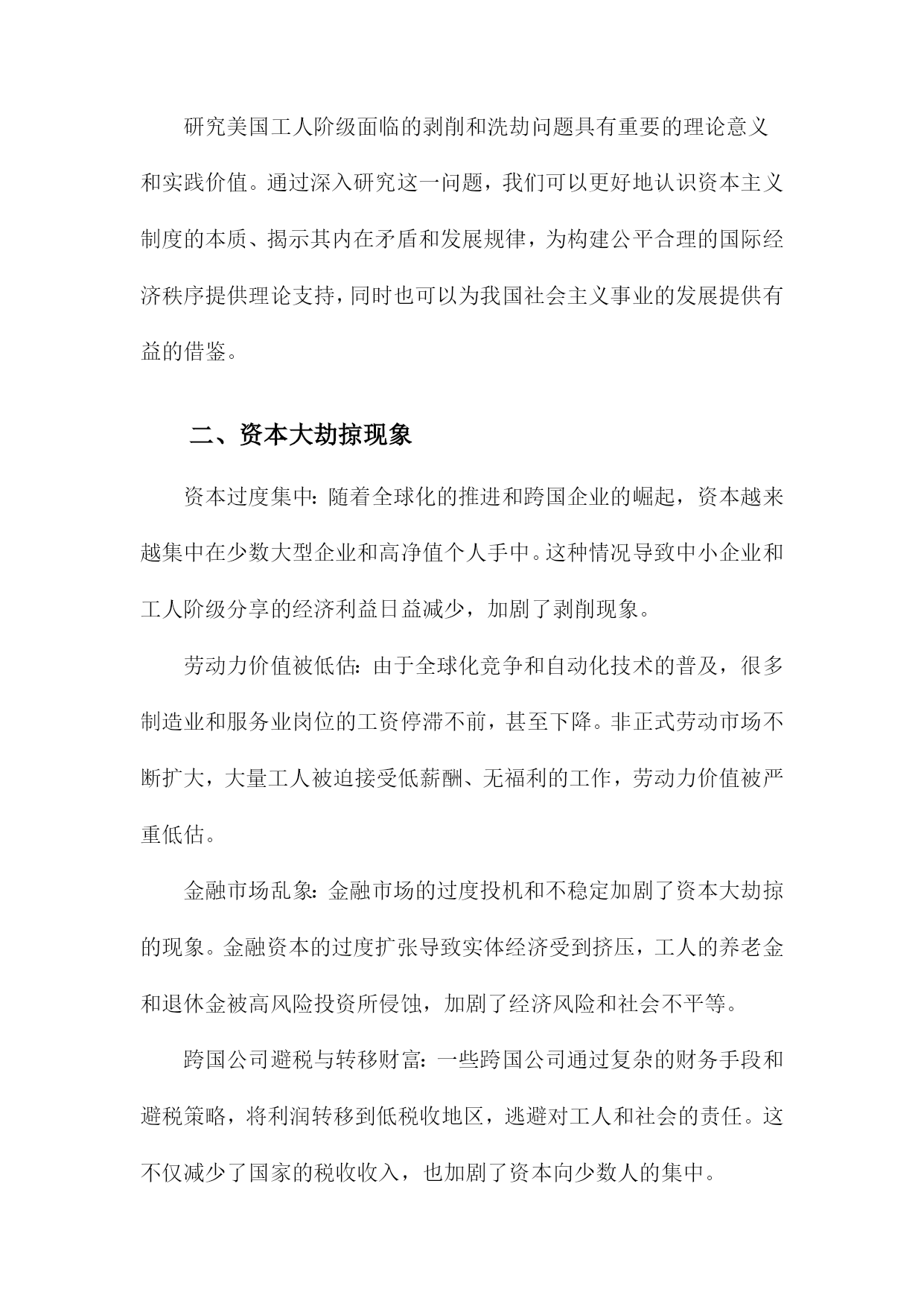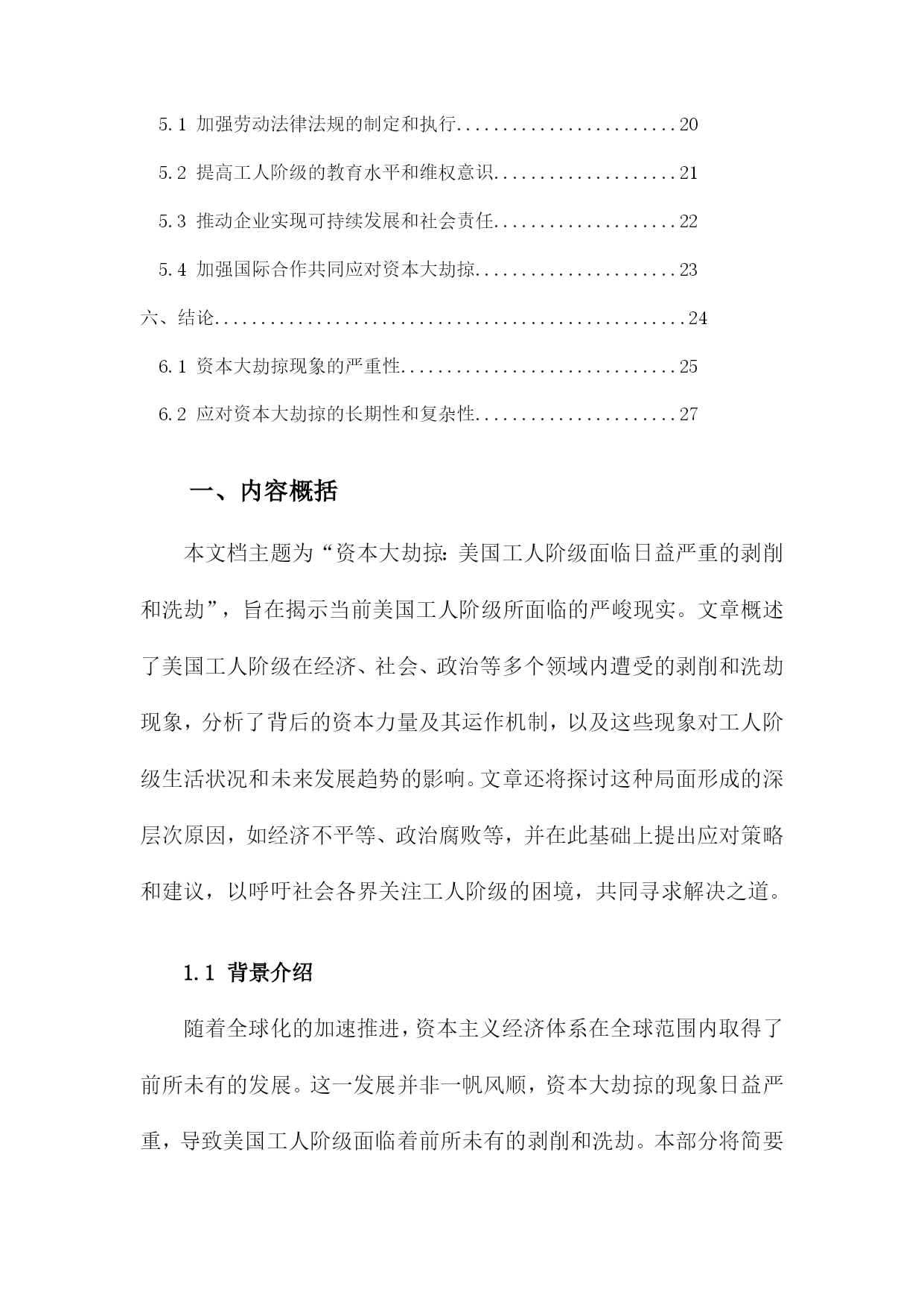 资本大劫掠:美国工人阶级面临日益严重的剥削和洗劫目录一、内容概括................................................21.1背景介绍.............................................21.2研究意义.............................................3二、资本大劫掠现象..........................................52.1资本大劫掠的定义.....................................62.2资本大劫掠的主要表现形式.............................62.3资本大劫掠的影响.....................................7三、美国工人阶级面临的问题..................................93.1工人阶级的生活状况..................................103.2工人阶级的工资水平..................................113.3工人阶级的工作环境..................................123.4工人阶级的社会地位..................................13四、资本大劫掠的原因分析...................................144.1资本主义制度的内在矛盾..............................154.2资本家追求最大化利润的动机..........................164.3政府政策的调整和监管不力............................17五、应对资本大劫掠的策略与建议.............................195.1加强劳动法律法规的制定和执行........................205.2提高工人阶级的教育水平和维权意识....................215.3推动企业实现可持续发展和社会责任....................225.4加强国际合作共同应对资本大劫掠......................23六、结论...................................................246.1资本大劫掠现象的严重性..............................256.2应对资本大劫掠的长期性和复杂性......................27一、内容概括本文档主题为“资本大劫掠:美国工人阶级面临日益严重的剥削和洗劫”,旨在揭示当前美国工人阶级所面临的严峻现实。文章概述了美国工人阶级在经济、社会、政治等多个领域内遭受的剥削和洗劫现象,分析了背后的资本力量及其运作机制,以及这些现象对工人阶级生活状况和未来发展趋势的影响。文章还将探讨这种局面形成的深层次原因,如经济不平等、政治腐败等,并在此基础上提出应对策略和建议,以呼吁社会各界关注工人阶级的困境,共同寻求解决之道。1.1背景介绍随着全球化的加速推进,资本主义经济体系在全球范围内取得了前所未有的发展。这一发展并非一帆风顺,资本大劫掠的现象日益严重,导致美国工人阶级面临着前所未有的剥削和洗劫。本部分将简要介绍背景,揭示美国工人阶级在资本主义社会中所面临的困境。自工业革命以来,资本主义生产方式逐渐取代了封建社会,成为现代社会的主要生产形式。资本家们通过雇佣工人,支付他们的劳动力价值,从而获取剩余价值。这种剥削制度在资本主义发展的初期阶段并不明显,但随着时间的推移,资本家为了追求更高的利润,不断降低生产成本,提高生产效率,使得工人的工资水平和生活水平不断下降。全球化进程加速了资本流动,使得美国企业能够更加容易地跨国经营,进一步压低了工人的工资和福利。金融市场的创新和衍生品的发展为资本家提供了更多的剥削手段,如高利贷、金融衍生品等,进一步加剧了工人阶级的经济困境。在这个背景下,美国工人阶级面临着日益严重的剥削和洗劫。他们不仅面临着低薪、高工作强度的问题,还面临着失业、社会保障缺失等问题。这些问题的存在,使得美国工人阶级的生活状况日益恶化,社会矛盾不断激化。我们需要深入了解和分析这种现象,找出解决问题的方法,以推动社会的公平正义和可持续发展。1.2研究意义在当前全球经济一体化和资本主义发展的背景下,美国工人阶级面临着日益严重的剥削和洗劫。这种现象不仅影响到美国国内的社会稳定和经济