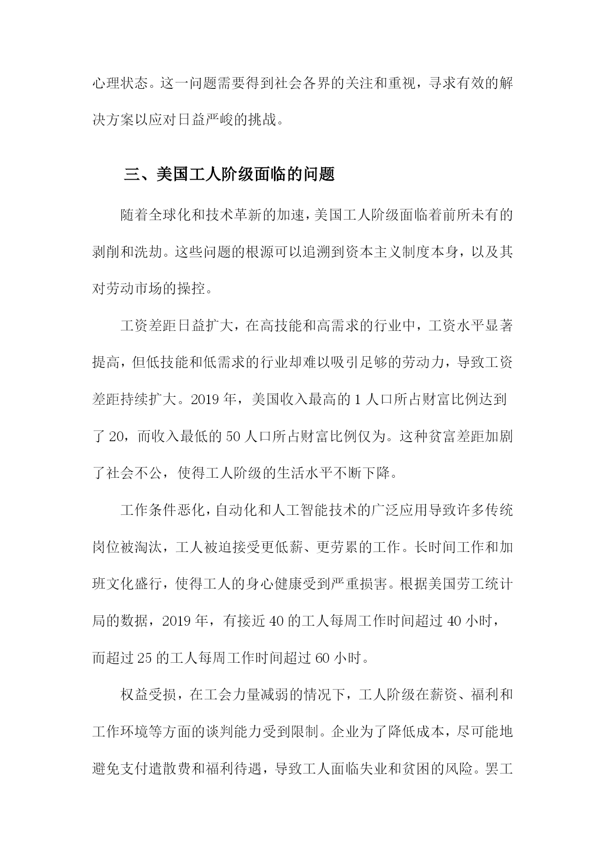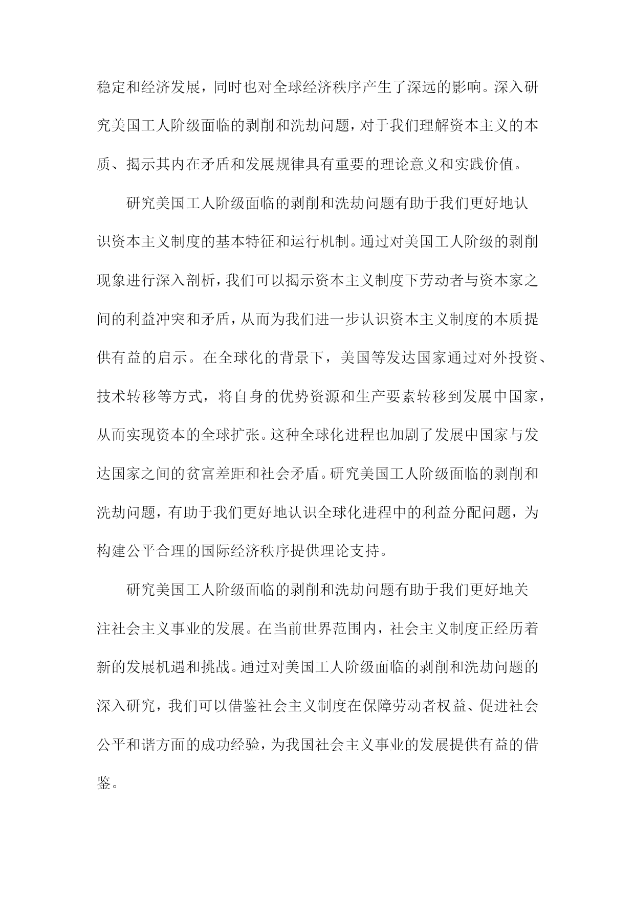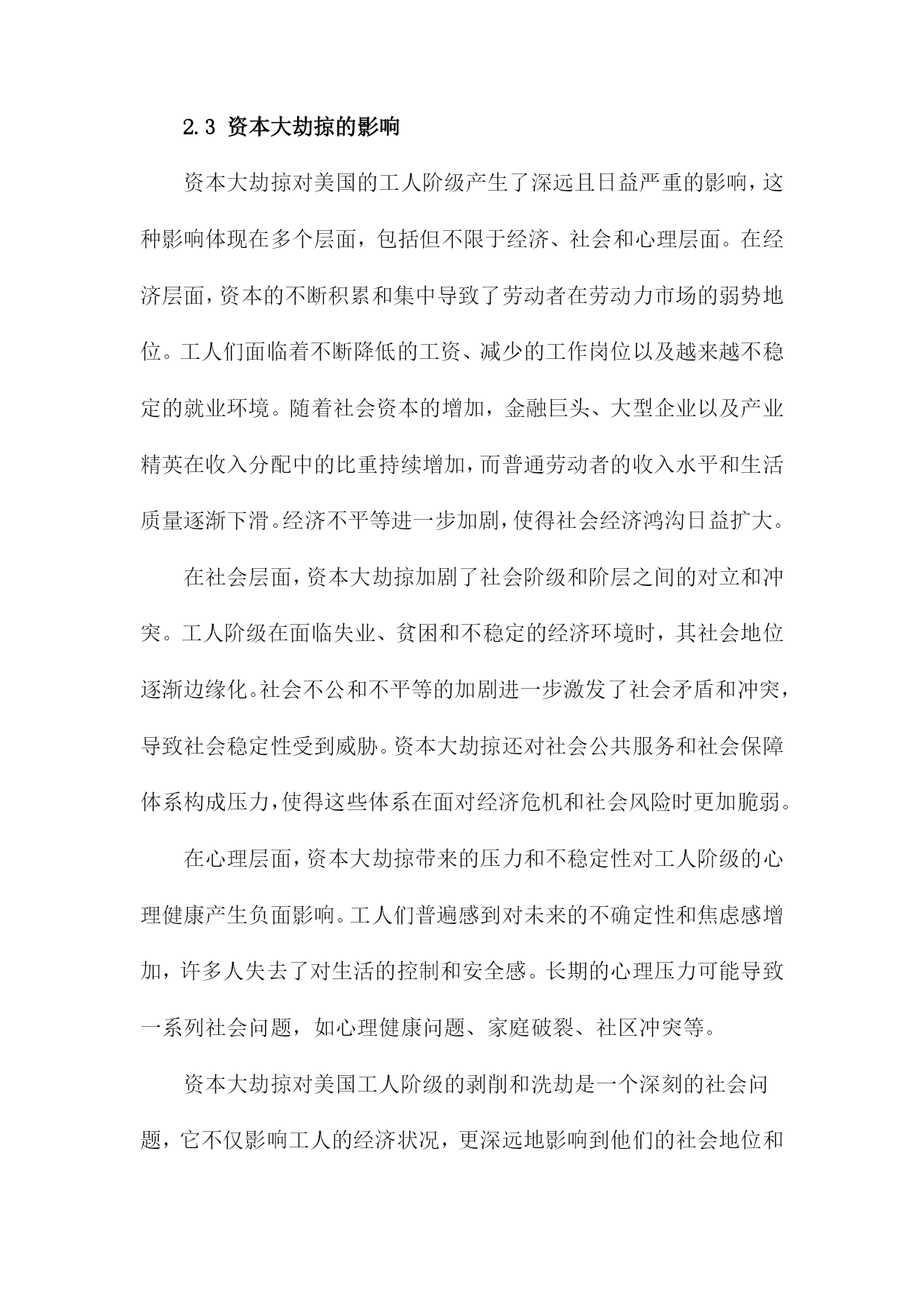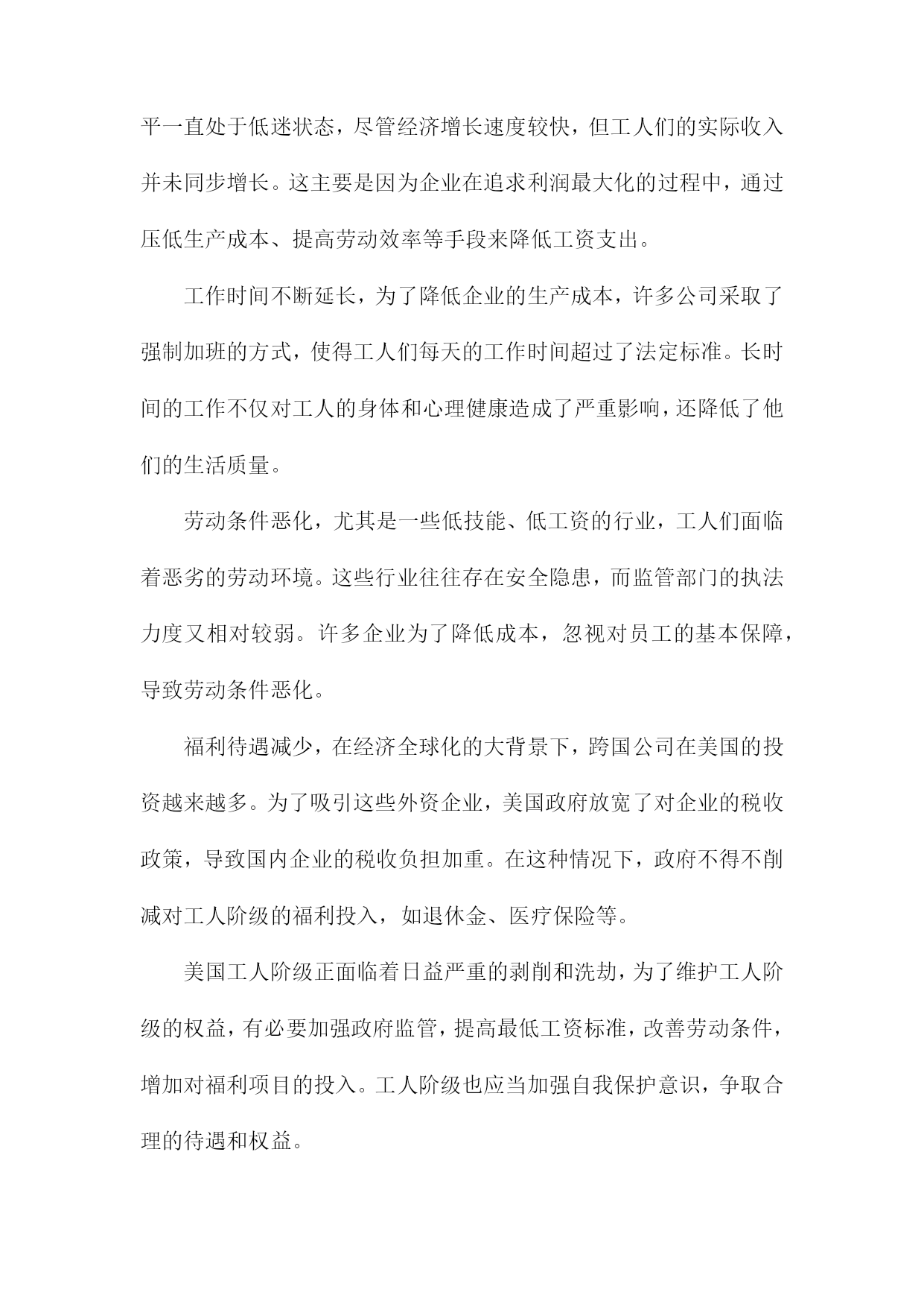 资本大劫掠:美国工人阶级面临日益严重的剥削和洗劫目录一、内容概括................................................21.1背景介绍.............................................21.2研究意义.............................................3二、资本大劫掠现象..........................................52.1资本大劫掠的定义.....................................62.2资本大劫掠的主要表现形式.............................62.3资本大劫掠的影响.....................................7三、美国工人阶级面临的问题..................................93.1工人阶级的生活状况..................................103.2工人阶级的工资水平..................................113.3工人阶级的工作环境..................................123.4工人阶级的社会地位..................................13四、资本大劫掠的原因分析...................................144.1资本主义制度的内在矛盾..............................154.2资本家追求最大化利润的动机..........................164.3政府政策的调整和监管不力............................17五、应对资本大劫掠的策略与建议.............................195.1加强劳动法律法规的制定和执行........................205.2提高工人阶级的教育水平和维权意识....................215.3推动企业实现可持续发展和社会责任....................225.4加强国际合作共同应对资本大劫掠......................23六、结论...................................................246.1资本大劫掠现象的严重性..............................256.2应对资本大劫掠的长期性和复杂性......................27一、内容概括本文档主题为“资本大劫掠:美国工人阶级面临日益严重的剥削和洗劫”,旨在揭示当前美国工人阶级所面临的严峻现实。文章概述了美国工人阶级在经济、社会、政治等多个领域内遭受的剥削和洗劫现象,分析了背后的资本力量及其运作机制,以及这些现象对工人阶级生活状况和未来发展趋势的影响。文章还将探讨这种局面形成的深层次原因,如经济不平等、政治腐败等,并在此基础上提出应对策略和建议,以呼吁社会各界关注工人阶级的困境,共同寻求解决之道。1.1背景介绍随着全球化的加速推进,资本主义经济体系在全球范围内取得了前所未有的发展。这一发展并非一帆风顺,资本大劫掠的现象日益严重,导致美国工人阶级面临着前所未有的剥削和洗劫。本部分将简要介绍背景,揭示美国工人阶级在资本主义社会中所面临的困境。自工业革命以来,资本主义生产方式逐渐取代了封建社会,成为现代社会的主要生产形式。资本家们通过雇佣工人,支付他们的劳动力价值,从而获取剩余价值。这种剥削制度在资本主义发展的初期阶段并不明显,但随着时间的推移,资本家为了追求更高的利润,不断降低生产成本,提高生产效率,使得工人的工资水平和生活水平不断下降。全球化进程加速了资本流动,使得美国企业能够更加容易地跨国经营,进一步压低了工人的工资和福利。金融市场的创新和衍生品的发展为资本家提供了更多的剥削手段,如高利贷、金融衍生品等,进一步加剧了工人阶级的经济困境。在这个背景下,美国工人阶级面临着日益严重的剥削和洗劫。他们不仅面临着低薪、高工作强度的问题,还面临着失业、社会保障缺失等问题。这些问题的存在,使得美国工人阶级的生活状况日益恶化,社会矛盾不断激化。我们需要深入了解和分析这种现象,找出解决问题的方法,以推动社会的公平正义和可持续发展。1.2研究意义在当前全球经济一体化和资本主义发展的背景下,美国工人阶级面临着日益严重的剥削和洗劫。这种现象不仅影响到美国国内的社会稳定和经济