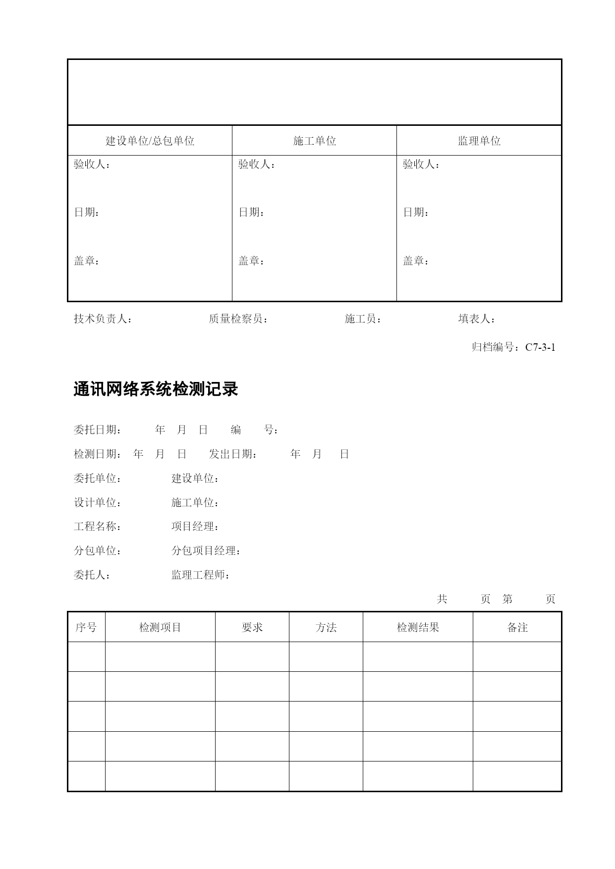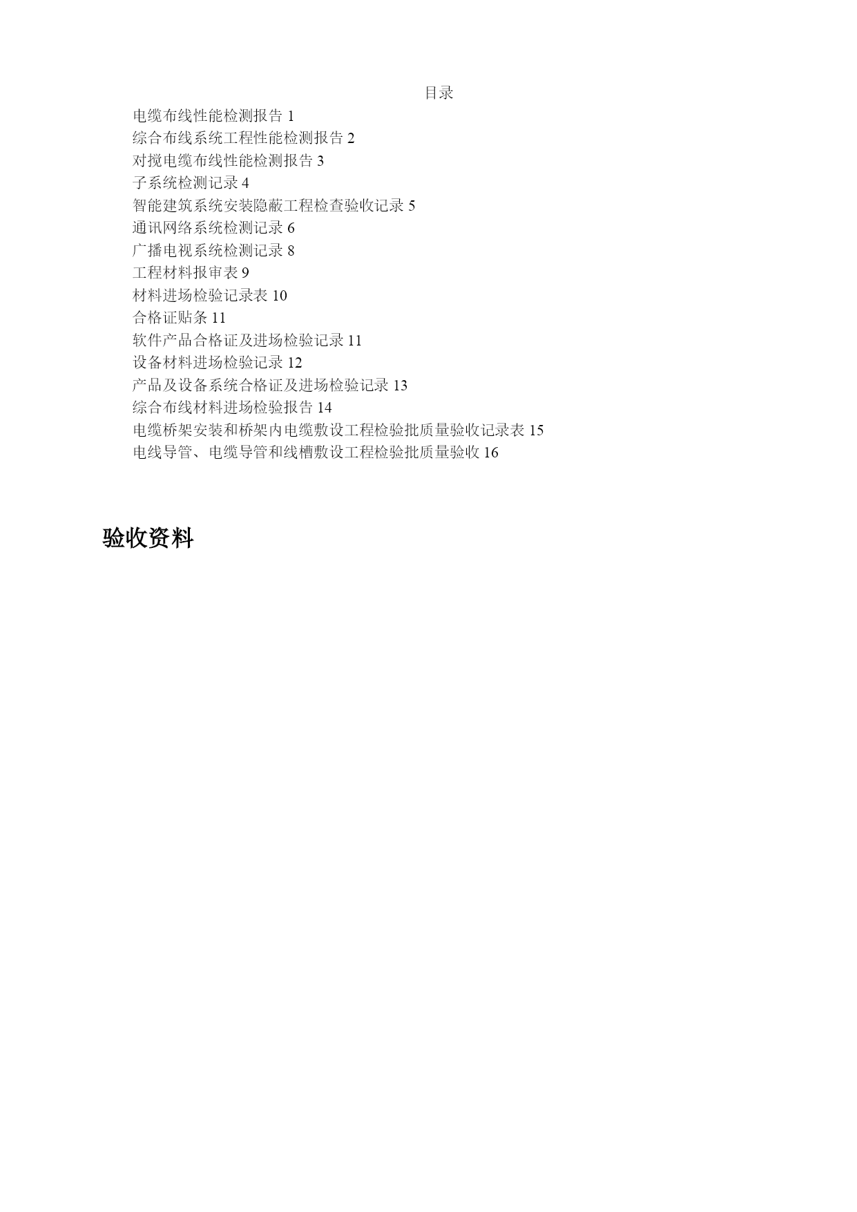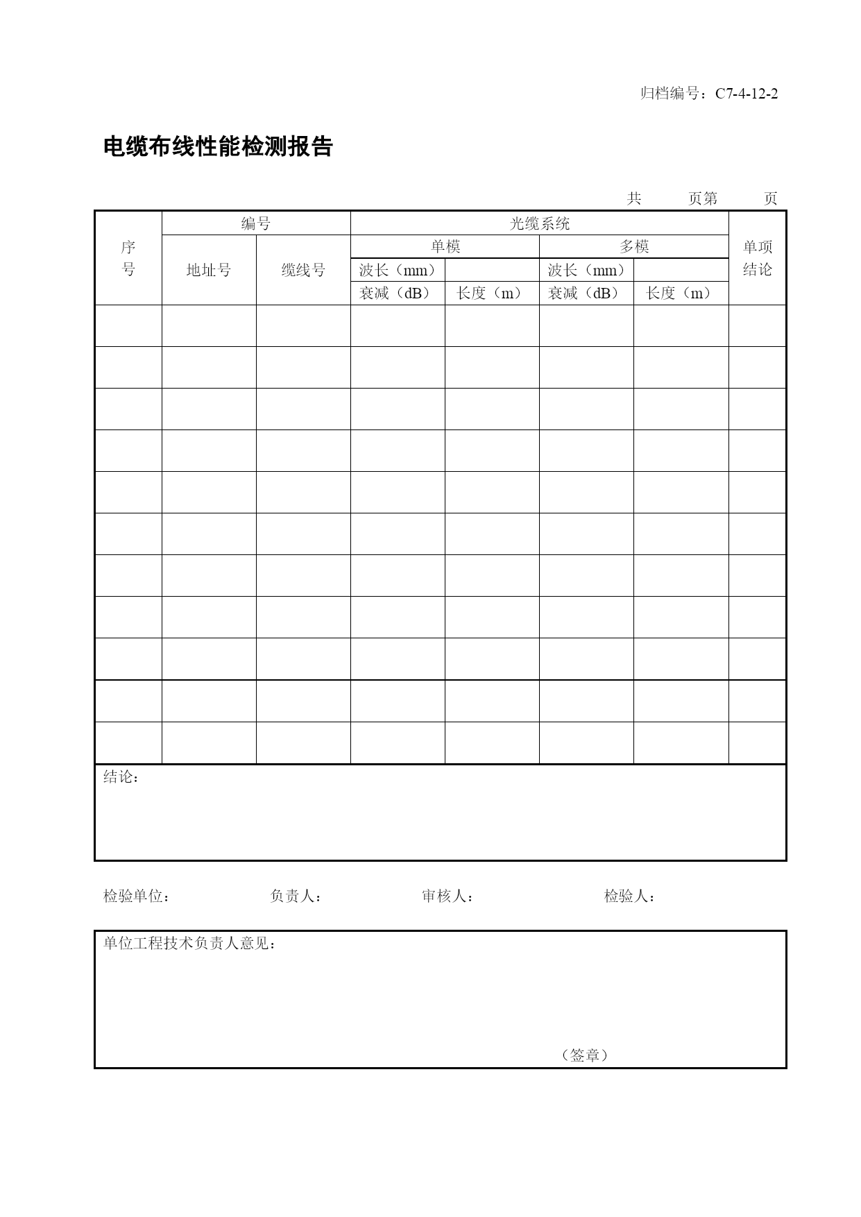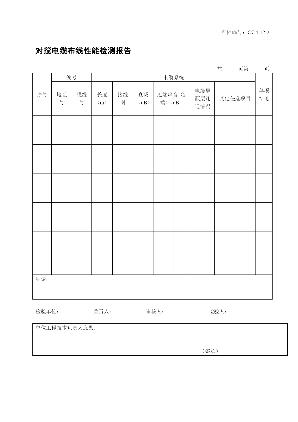 验收资料表格汇总优质资料(可以直接使用,可编辑优质资料,欢迎下载)目录TOC\o"1-3"\h\z\uHYPERLINK\l"_Toc281210982"电缆布线性能检测报告PAGEREF_Toc281210982\h1HYPERLINK\l"_Toc281210983"综合布线系统工程性能检测报告PAGEREF_Toc281210983\h2HYPERLINK\l"_Toc281210984"对搅电缆布线性能检测报告PAGEREF_Toc281210984\h3HYPERLINK\l"_Toc281210985"子系统检测记录PAGEREF_Toc281210985\h4HYPERLINK\l"_Toc281210986"智能建筑系统安装隐蔽工程检查验收记录PAGEREF_Toc281210986\h5HYPERLINK\l"_Toc281210987"通讯网络系统检测记录PAGEREF_Toc281210987\h6HYPERLINK\l"_Toc281210988"广播电视系统检测记录PAGEREF_Toc281210988\h8HYPERLINK\l"_Toc281210990"工程材料报审表PAGEREF_Toc281210990\h9HYPERLINK\l"_Toc281210991"材料进场检验记录表PAGEREF_Toc281210991\h10HYPERLINK\l"_Toc281210992"合格证贴条PAGEREF_Toc281210992\h11HYPERLINK\l"_Toc281210993"软件产品合格证及进场检验记录PAGEREF_Toc281210993\h11HYPERLINK\l"_Toc281210994"设备材料进场检验记录PAGEREF_Toc281210994\h12HYPERLINK\l"_Toc281210995"产品及设备系统合格证及进场检验记录PAGEREF_Toc281210995\h13HYPERLINK\l"_Toc281210996"综合布线材料进场检验报告PAGEREF_Toc281210996\h14HYPERLINK\l"_Toc281210997"电缆桥架安装和桥架内电缆敷设工程检验批质量验收记录表PAGEREF_Toc281210997\h15HYPERLINK\l"_Toc281210998"电线导管、电缆导管和线槽敷设工程检验批质量验收PAGEREF_Toc281210998\h16验收资料归档编号:C7-4-12-2电缆布线性能检测报告共页第页序号编号光缆系统单项结论地址号缆线号单模多模波长(mm)波长(mm)衰减(dB)长度(m)衰减(dB)长度(m)结论:检验单位:负责人:审核人:检验人:单位工程技术负责人意见:(签章)归档编号:C7-4-12综合布线系统工程性能检测报告委托日期:年月日检测编号:检测日期:年月日至年月日发出日期:年月日建设单位:委托单位:工程名称:信息点数:光缆端口数量:电缆抽样比率:光缆抽样比率:系统类型:测试仪表型号:依据标准:测试仪鉴定证书号:共页第页电缆检测结果总链路数量实测链路数量合格数量不合格数量实测合格率结论:检测单位:负责人:审核人:检验人:光纤检测结果总链路数量实测链路数量合格数量不合格数量实测合格率结论:检测单位:负责人:审核人:检验人:附注:1.检测环境条件:℃2.检测结果的不确定度(必要时填写)3.偏离标准方法的例外情况(必要时填写)归档编号:C7-4-12-2对搅电缆布线性能检测报告共页第页序号编号电缆系统单项结论地址号缆线号长度(m)接线图衰减(dB)近端串音(2端)(dB)电缆屏蔽层连通情况其他任选项目结论:检验单位:负责人:审核人:检验人:单位工程技术负责人意见:(签章)归档编号:C7-3-6子系统检测记录系统名称子系统名称序号检测部位施工单位项目经理执行标准名称及编号分包单位分包项目经理主控项目系统检测内容检测规范的规定系统检测评定记录检测结果备注合格不合格一般项目强制性条文检测机构的检测结论:检测负责人年月日注:1..检测结果栏中,左列“√”为合格,右列打“√”为不合格;2.备注栏内填写检测时出现的问题。