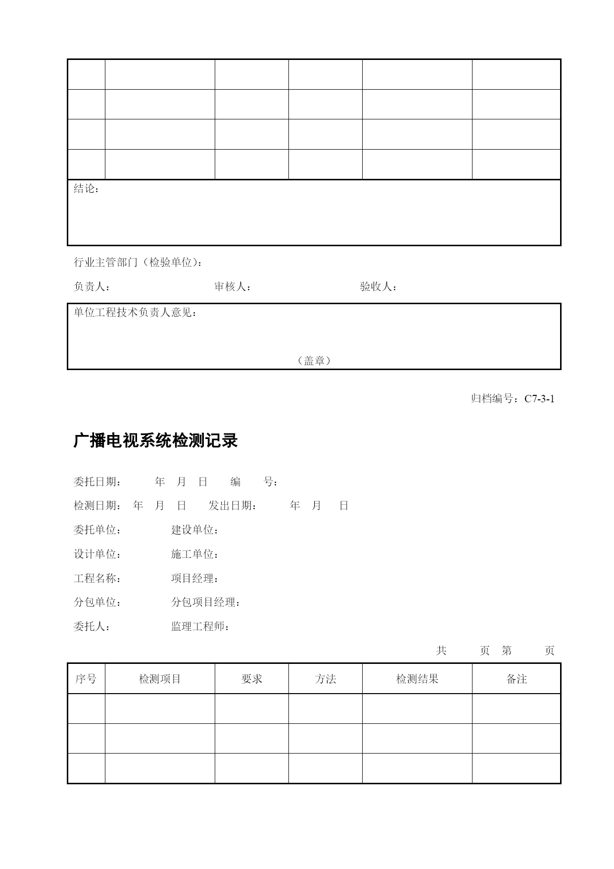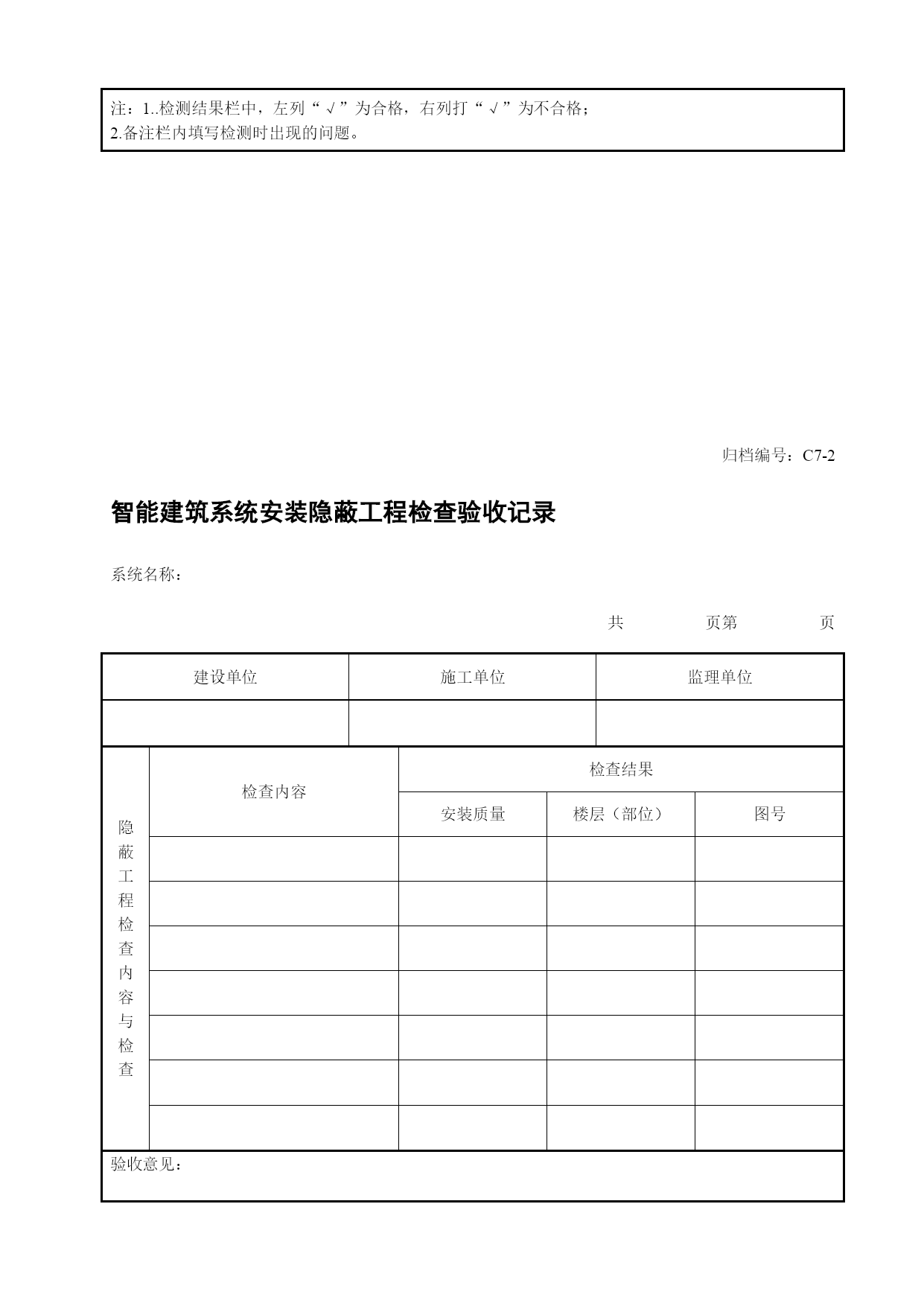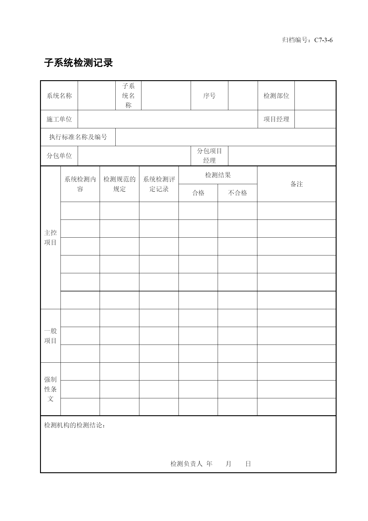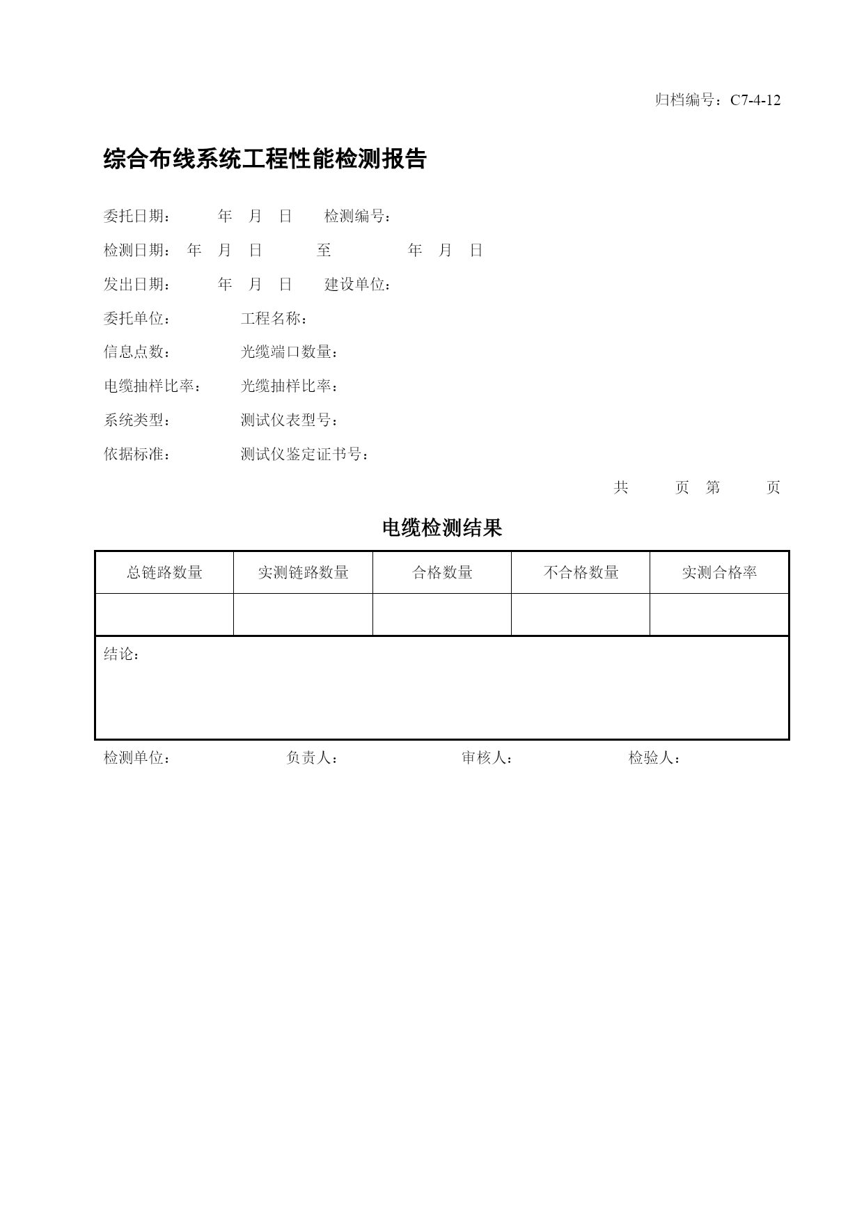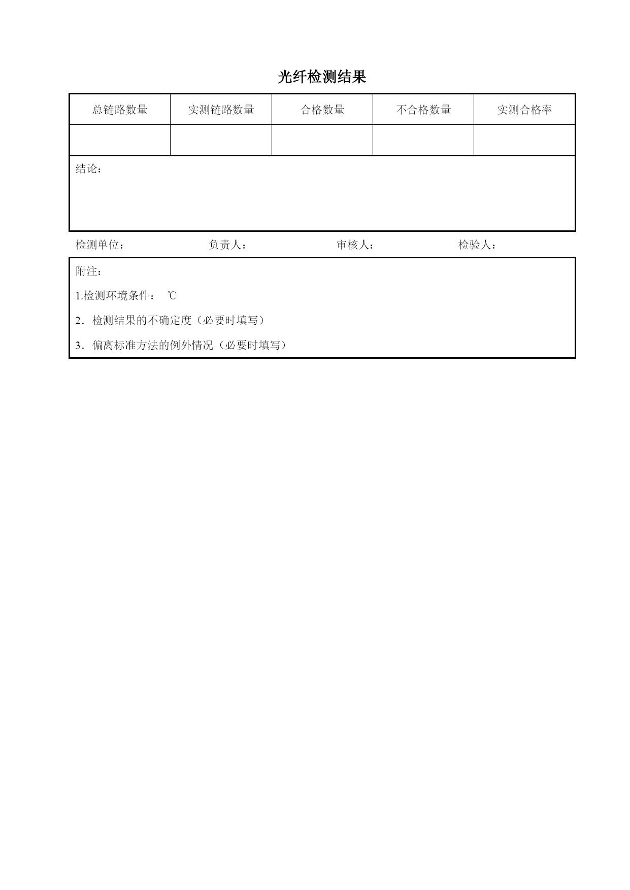 验收资料表格汇总优质资料(可以直接使用,可编辑优质资料,欢迎下载)目录TOC\o"1-3"\h\z\uHYPERLINK\l"_Toc281210982"电缆布线性能检测报告PAGEREF_Toc281210982\h1HYPERLINK\l"_Toc281210983"综合布线系统工程性能检测报告PAGEREF_Toc281210983\h2HYPERLINK\l"_Toc281210984"对搅电缆布线性能检测报告PAGEREF_Toc281210984\h3HYPERLINK\l"_Toc281210985"子系统检测记录PAGEREF_Toc281210985\h4HYPERLINK\l"_Toc281210986"智能建筑系统安装隐蔽工程检查验收记录PAGEREF_Toc281210986\h5HYPERLINK\l"_Toc281210987"通讯网络系统检测记录PAGEREF_Toc281210987\h6HYPERLINK\l"_Toc281210988"广播电视系统检测记录PAGEREF_Toc281210988\h8HYPERLINK\l"_Toc281210990"工程材料报审表PAGEREF_Toc281210990\h9HYPERLINK\l"_Toc281210991"材料进场检验记录表PAGEREF_Toc281210991\h10HYPERLINK\l"_Toc281210992"合格证贴条PAGEREF_Toc281210992\h11HYPERLINK\l"_Toc281210993"软件产品合格证及进场检验记录PAGEREF_Toc281210993\h11HYPERLINK\l"_Toc281210994"设备材料进场检验记录PAGEREF_Toc281210994\h12HYPERLINK\l"_Toc281210995"产品及设备系统合格证及进场检验记录PAGEREF_Toc281210995\h13HYPERLINK\l"_Toc281210996"综合布线材料进场检验报告PAGEREF_Toc281210996\h14HYPERLINK\l"_Toc281210997"电缆桥架安装和桥架内电缆敷设工程检验批质量验收记录表PAGEREF_Toc281210997\h15HYPERLINK\l"_Toc281210998"电线导管、电缆导管和线槽敷设工程检验批质量验收PAGEREF_Toc281210998\h16验收资料归档编号:C7-4-12-2电缆布线性能检测报告共页第页序号编号光缆系统单项结论地址号缆线号单模多模波长(mm)波长(mm)衰减(dB)长度(m)衰减(dB)长度(m)结论:检验单位:负责人:审核人:检验人:单位工程技术负责人意见:(签章)归档编号:C7-4-12综合布线系统工程性能检测报告委托日期:年月日检测编号:检测日期:年月日至年月日发出日期:年月日建设单位:委托单位:工程名称:信息点数:光缆端口数量:电缆抽样比率:光缆抽样比率:系统类型:测试仪表型号:依据标准:测试仪鉴定证书号:共页第页电缆检测结果总链路数量实测链路数量合格数量不合格数量实测合格率结论:检测单位:负责人:审核人:检验人:光纤检测结果总链路数量实测链路数量合格数量不合格数量实测合格率结论:检测单位:负责人:审核人:检验人:附注:1.检测环境条件:℃2.检测结果的不确定度(必要时填写)3.偏离标准方法的例外情况(必要时填写)归档编号:C7-4-12-2对搅电缆布线性能检测报告共页第页序号编号电缆系统单项结论地址号缆线号长度(m)接线图衰减(dB)近端串音(2端)(dB)电缆屏蔽层连通情况其他任选项目结论:检验单位:负责人:审核人:检验人:单位工程技术负责人意见:(签章)归档编号:C7-3-6子系统检测记录系统名称子系统名称序号检测部位施工单位项目经理执行标准名称及编号分包单位分包项目经理主控项目系统检测内容检测规范的规定系统检测评定记录检测结果备注合格不合格一般项目强制性条文检测机构的检测结论:检测负责人年月日注:1..检测结果栏中,左列“√”为合格,右列打“√”为不合格;2.备注栏内填写检测时出现的问题。
