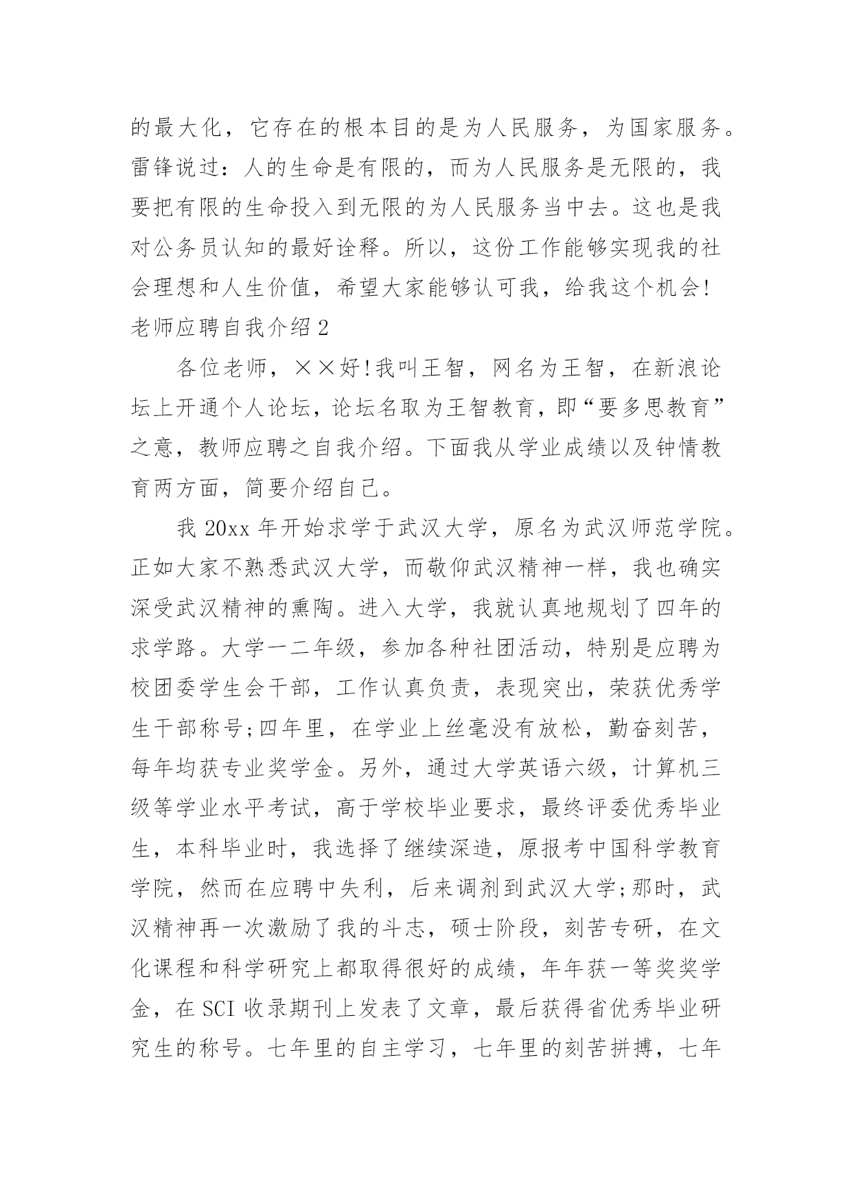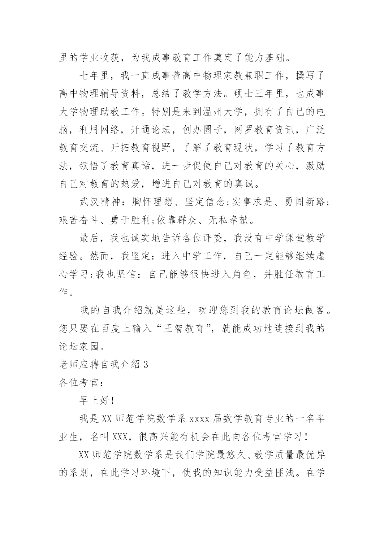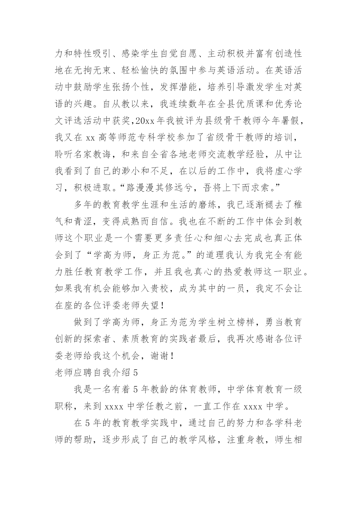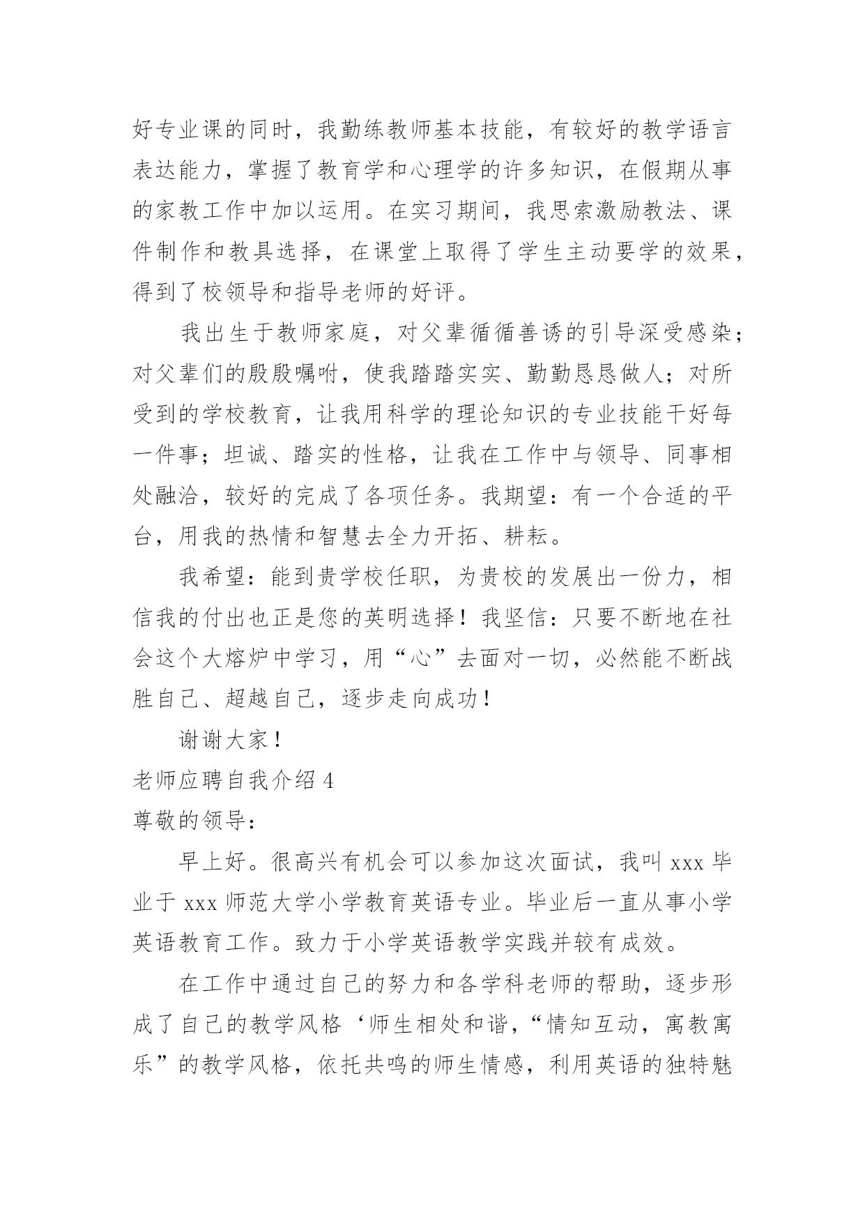 老师应聘自我介绍老师应聘自我介绍当到达一个陌生的环境后,我们总少不了要向他人介绍自己,自我介绍可以满足我们渴望得到尊重的心理。那要怎么写好自我介绍呢?以下是小编为大家收集的老师应聘自我介绍,欢迎阅读,希望大家能够喜欢。老师应聘自我介绍1尊敬的各位考官、各位评委老师:通过考试,今天,我以本岗位第一的成绩进入了面试。对我来说,这次机会显得尤为珍贵。(一般不能说名字)今年____岁。希望通过这次面试能够展示自我,提高自我。我是____族,____。我平时喜欢看书和上网浏览信息。我的性格比较开朗,随和。能关系周围的任何事,和亲人朋友能够和睦相处,并且对生活充满了信心。我以前在____实习过,所以有一定的实践经验。在外地求学的四年中,我养成了坚强的性格,这种性格使我克服了学习和生活中的一些困难,积极进取。如果我有机会被录用的话,我一定能够在中得到锻炼并实现自身的价值,争当人民公仆,做合格的。同时,我也认识到,人和工作的关系是建立在自我认知的基础上的,我认为我有能力也有信心做好这份工作。公务员是一个神圣而高尚的职业,它追求的是公共利益的最大化,它存在的根本目的是为人民服务,为国家服务。雷锋说过:人的生命是有限的,而为人民服务是无限的,我要把有限的生命投入到无限的为人民服务当中去。这也是我对公务员认知的最好诠释。所以,这份工作能够实现我的社会理想和人生价值,希望大家能够认可我,给我这个机会!老师应聘自我介绍2各位老师,××好!我叫王智,网名为王智,在新浪论坛上开通个人论坛,论坛名取为王智教育,即“要多思教育”之意,教师应聘之自我介绍。下面我从学业成绩以及钟情教育两方面,简要介绍自己。我20xx年开始求学于武汉大学,原名为武汉师范学院。正如大家不熟悉武汉大学,而敬仰武汉精神一样,我也确实深受武汉精神的熏陶。进入大学,我就认真地规划了四年的求学路。大学一二年级,参加各种社团活动,特别是应聘为校团委学生会干部,工作认真负责,表现突出,荣获优秀学生干部称号;四年里,在学业上丝毫没有放松,勤奋刻苦,每年均获专业奖学金。另外,通过大学英语六级,计算机三级等学业水平考试,高于学校毕业要求,最终评委优秀毕业生,本科毕业时,我选择了继续深造,原报考中国科学教育学院,然而在应聘中失利,后来调剂到武汉大学;那时,武汉精神再一次激励了我的斗志,硕士阶段,刻苦专研,在文化课程和科学研究上都取得很好的成绩,年年获一等奖奖学金,在SCI收录期刊上发表了文章,最后获得省优秀毕业研究生的称号。七年里的自主学习,七年里的刻苦拼搏,七年里的学业收获,为我成事教育工作奠定了能力基础。七年里,我一直成事着高中物理家教兼职工作,撰写了高中物理辅导资料,总结了教学方法。硕士三年里,也成事大学物理助教工作。特别是来到温州大学,拥有了自己的电脑,利用网络,开通论坛,创办圈子,网罗教育资讯,广泛教育交流、开拓教育视野,了解了教育现状,学习了教育方法,领悟了教育真谛,进一步促使自己对教育的关心,激励自己对教育的热爱,增进自己对教育的真诚。武汉精神:胸怀理想、坚定信念;实事求是、勇闯新路;艰苦奋斗、勇于胜利;依靠群众、无私奉献。最后,我也诚实地告诉各位评委,我没有中学课堂教学经验。然而,我坚定:进入中学工作,自己一定能够继续虚心学习;我也坚信:自己能够很快进入角色,并胜任教育工作。我的自我介绍就是这些,欢迎您到我的教育论坛做客。您只要在百度上输入“王智教育”,就能成功地连接到我的论坛家园。老师应聘自我介绍3各位考官:早上好!我是XX师范学院数学系xxxx届数学教育专业的一名毕业生,名叫XXX,很高兴能有机会在此向各位考官学习!XX师范学院数学系是我们学院最悠久、教学质量最优异的系别,在此学习环境下,使我的知识能力受益匪浅。在学好专业课的同时,我勤练教师基本技能,有较好的教学语言表达能力,掌握了教育学和心理学的许多知识,在假期从事的家教工作中加以运用。在实习期间,我思索激励教法、课件制作和教具选择,在课堂上取得了学生主动要学的效果,得到了校领导和指导老师的好评。我出生于教师家庭,对父辈循循善诱的引导深受感染;对父辈们的殷殷嘱咐,使我踏踏实实、勤勤恳恳做人;对所受到的学校教育,让我用科学的理论知识的专业技能干好每一件事;坦诚、踏实的性格,让我在工作中与领导、同事相处融洽,较好的完成了各项任务。我期望:有一个合适的平台,用我的热情和智慧去全力开拓、耕耘。我希望:能到贵学校任职,为贵校的发展出一份力,相信我的付出也正是您的英明选择!我坚信:只要不断地在社会这个大熔炉中学习,用“心”去面对一切,必然能不断战胜自己、超越自己,逐步走向成功!谢谢大家!老师应聘自我介绍4尊敬的领导:早上好。很高兴有机会可以参加这次面试,我叫xxx毕业于xxx师范大学小学教育英语专业。毕业后一直从事小学英语教育工作。致力于小