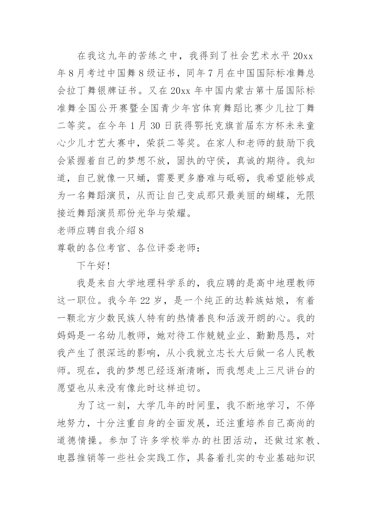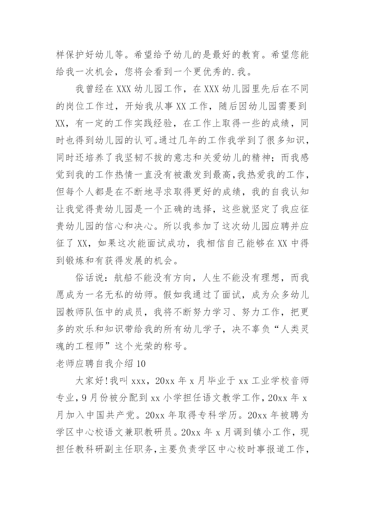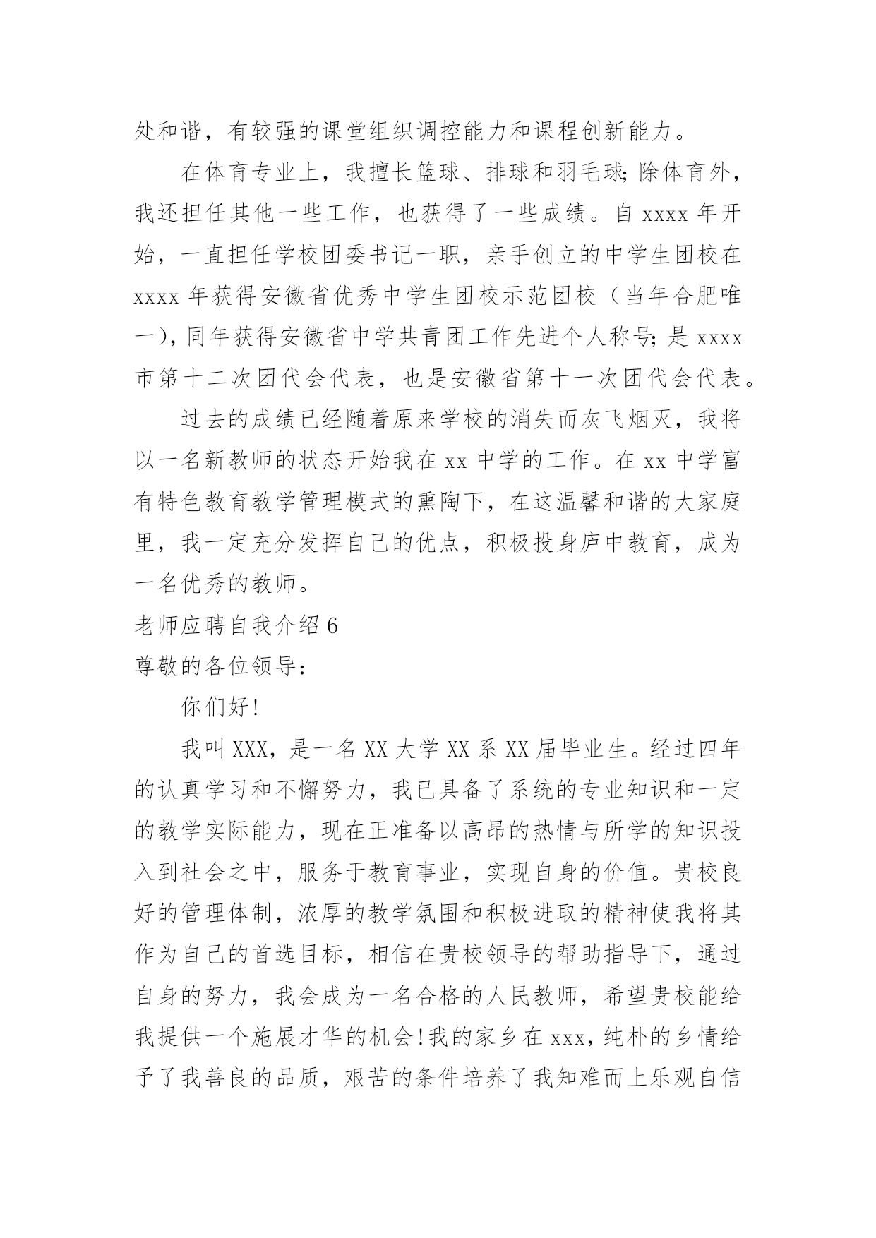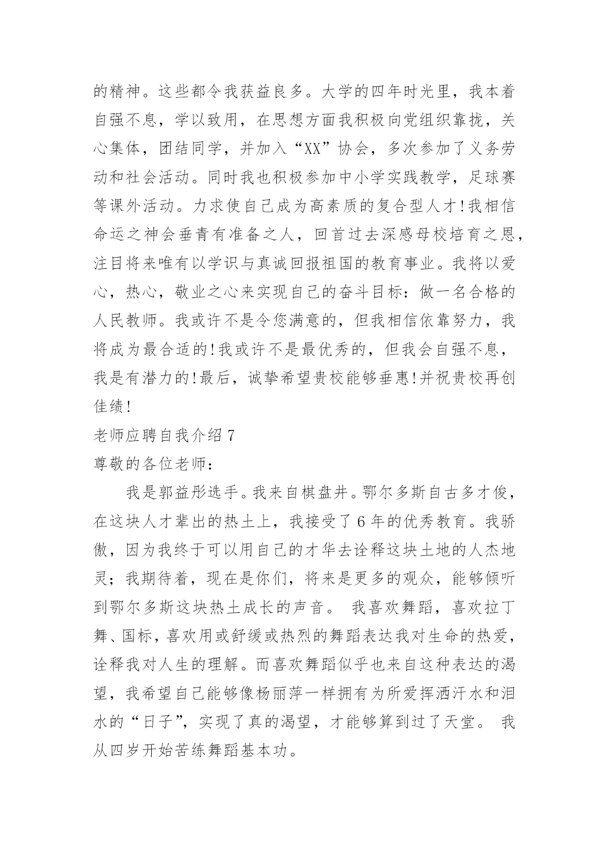 老师应聘自我介绍老师应聘自我介绍当到达一个陌生的环境后,我们总少不了要向他人介绍自己,自我介绍可以满足我们渴望得到尊重的心理。那要怎么写好自我介绍呢?以下是小编为大家收集的老师应聘自我介绍,欢迎阅读,希望大家能够喜欢。老师应聘自我介绍1尊敬的各位考官、各位评委老师:通过考试,今天,我以本岗位第一的成绩进入了面试。对我来说,这次机会显得尤为珍贵。(一般不能说名字)今年____岁。希望通过这次面试能够展示自我,提高自我。我是____族,____。我平时喜欢看书和上网浏览信息。我的性格比较开朗,随和。能关系周围的任何事,和亲人朋友能够和睦相处,并且对生活充满了信心。我以前在____实习过,所以有一定的实践经验。在外地求学的四年中,我养成了坚强的性格,这种性格使我克服了学习和生活中的一些困难,积极进取。如果我有机会被录用的话,我一定能够在中得到锻炼并实现自身的价值,争当人民公仆,做合格的。同时,我也认识到,人和工作的关系是建立在自我认知的基础上的,我认为我有能力也有信心做好这份工作。公务员是一个神圣而高尚的职业,它追求的是公共利益的最大化,它存在的根本目的是为人民服务,为国家服务。雷锋说过:人的生命是有限的,而为人民服务是无限的,我要把有限的生命投入到无限的为人民服务当中去。这也是我对公务员认知的最好诠释。所以,这份工作能够实现我的社会理想和人生价值,希望大家能够认可我,给我这个机会!老师应聘自我介绍2各位老师,××好!我叫王智,网名为王智,在新浪论坛上开通个人论坛,论坛名取为王智教育,即“要多思教育”之意,教师应聘之自我介绍。下面我从学业成绩以及钟情教育两方面,简要介绍自己。我20xx年开始求学于武汉大学,原名为武汉师范学院。正如大家不熟悉武汉大学,而敬仰武汉精神一样,我也确实深受武汉精神的熏陶。进入大学,我就认真地规划了四年的求学路。大学一二年级,参加各种社团活动,特别是应聘为校团委学生会干部,工作认真负责,表现突出,荣获优秀学生干部称号;四年里,在学业上丝毫没有放松,勤奋刻苦,每年均获专业奖学金。另外,通过大学英语六级,计算机三级等学业水平考试,高于学校毕业要求,最终评委优秀毕业生,本科毕业时,我选择了继续深造,原报考中国科学教育学院,然而在应聘中失利,后来调剂到武汉大学;那时,武汉精神再一次激励了我的斗志,硕士阶段,刻苦专研,在文化课程和科学研究上都取得很好的成绩,年年获一等奖奖学金,在SCI收录期刊上发表了文章,最后获得省优秀毕业研究生的称号。七年里的自主学习,七年里的刻苦拼搏,七年里的学业收获,为我成事教育工作奠定了能力基础。七年里,我一直成事着高中物理家教兼职工作,撰写了高中物理辅导资料,总结了教学方法。硕士三年里,也成事大学物理助教工作。特别是来到温州大学,拥有了自己的电脑,利用网络,开通论坛,创办圈子,网罗教育资讯,广泛教育交流、开拓教育视野,了解了教育现状,学习了教育方法,领悟了教育真谛,进一步促使自己对教育的关心,激励自己对教育的热爱,增进自己对教育的真诚。武汉精神:胸怀理想、坚定信念;实事求是、勇闯新路;艰苦奋斗、勇于胜利;依靠群众、无私奉献。最后,我也诚实地告诉各位评委,我没有中学课堂教学经验。然而,我坚定:进入中学工作,自己一定能够继续虚心学习;我也坚信:自己能够很快进入角色,并胜任教育工作。我的自我介绍就是这些,欢迎您到我的教育论坛做客。您只要在百度上输入“王智教育”,就能成功地连接到我的论坛家园。老师应聘自我介绍3各位考官:早上好!我是XX师范学院数学系xxxx届数学教育专业的一名毕业生,名叫XXX,很高兴能有机会在此向各位考官学习!XX师范学院数学系是我们学院最悠久、教学质量最优异的系别,在此学习环境下,使我的知识能力受益匪浅。在学好专业课的同时,我勤练教师基本技能,有较好的教学语言表达能力,掌握了教育学和心理学的许多知识,在假期从事的家教工作中加以运用。在实习期间,我思索激励教法、课件制作和教具选择,在课堂上取得了学生主动要学的效果,得到了校领导和指导老师的好评。我出生于教师家庭,对父辈循循善诱的引导深受感染;对父辈们的殷殷嘱咐,使我踏踏实实、勤勤恳恳做人;对所受到的学校教育,让我用科学的理论知识的专业技能干好每一件事;坦诚、踏实的性格,让我在工作中与领导、同事相处融洽,较好的完成了各项任务。我期望:有一个合适的平台,用我的热情和智慧去全力开拓、耕耘。我希望:能到贵学校任职,为贵校的发展出一份力,相信我的付出也正是您的英明选择!我坚信:只要不断地在社会这个大熔炉中学习,用“心”去面对一切,必然能不断战胜自己、超越自己,逐步走向成功!谢谢大家!老师应聘自我介绍4尊敬的领导:早上好。很高兴有机会可以参加这次面试,我叫xxx毕业于xxx师范大学小学教育英语专业。毕业后一直从事小学英语教育工作。致力于小
