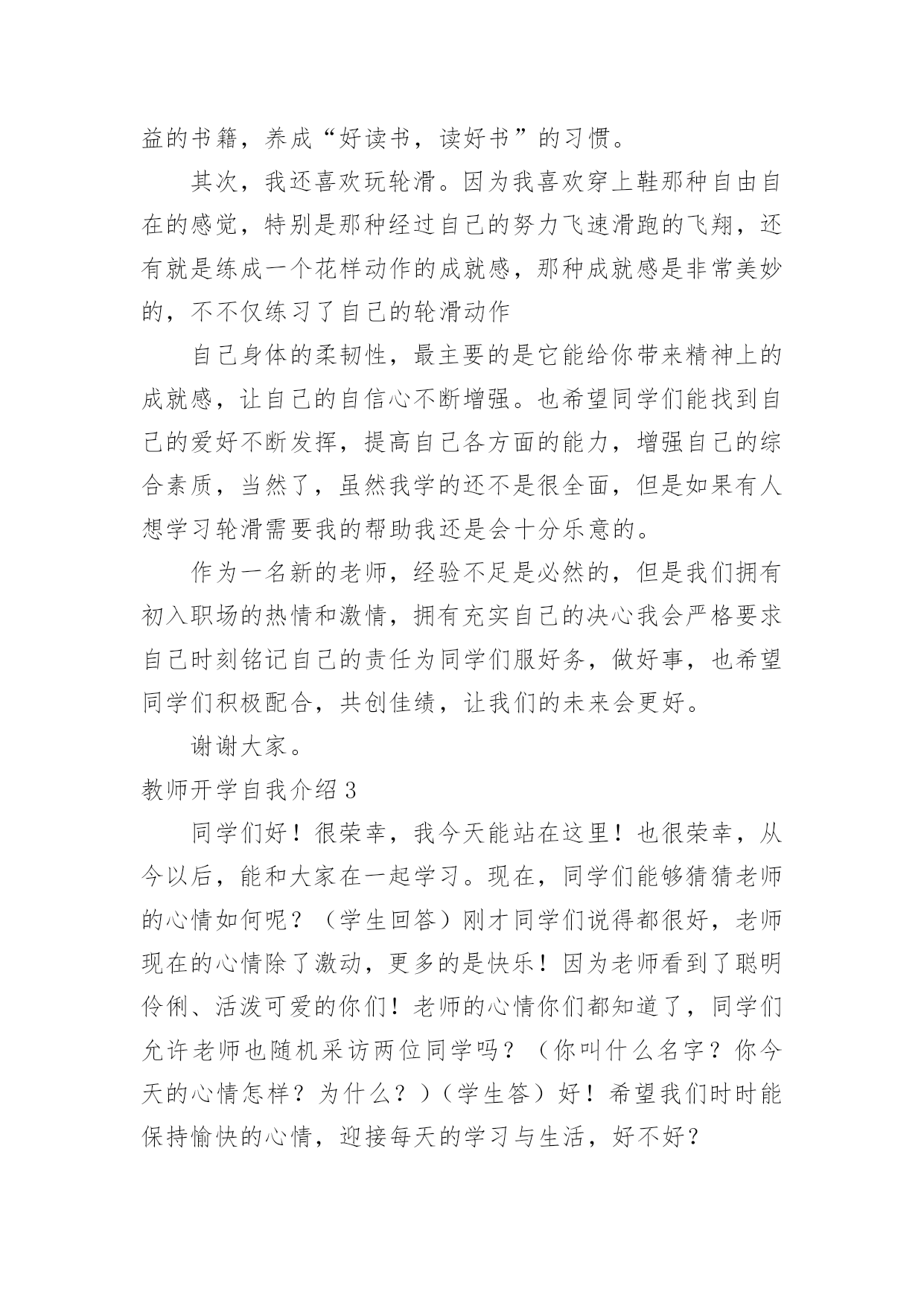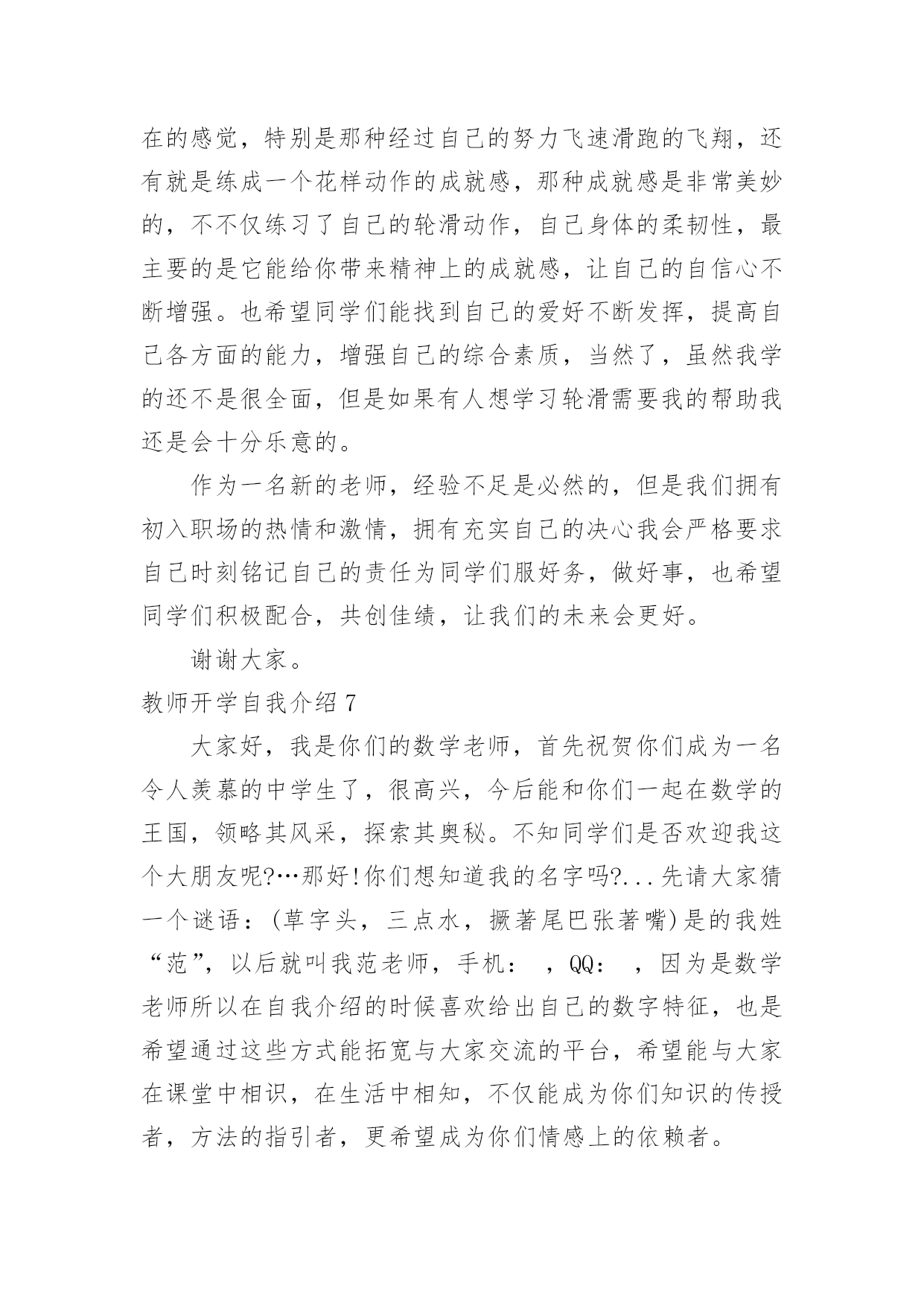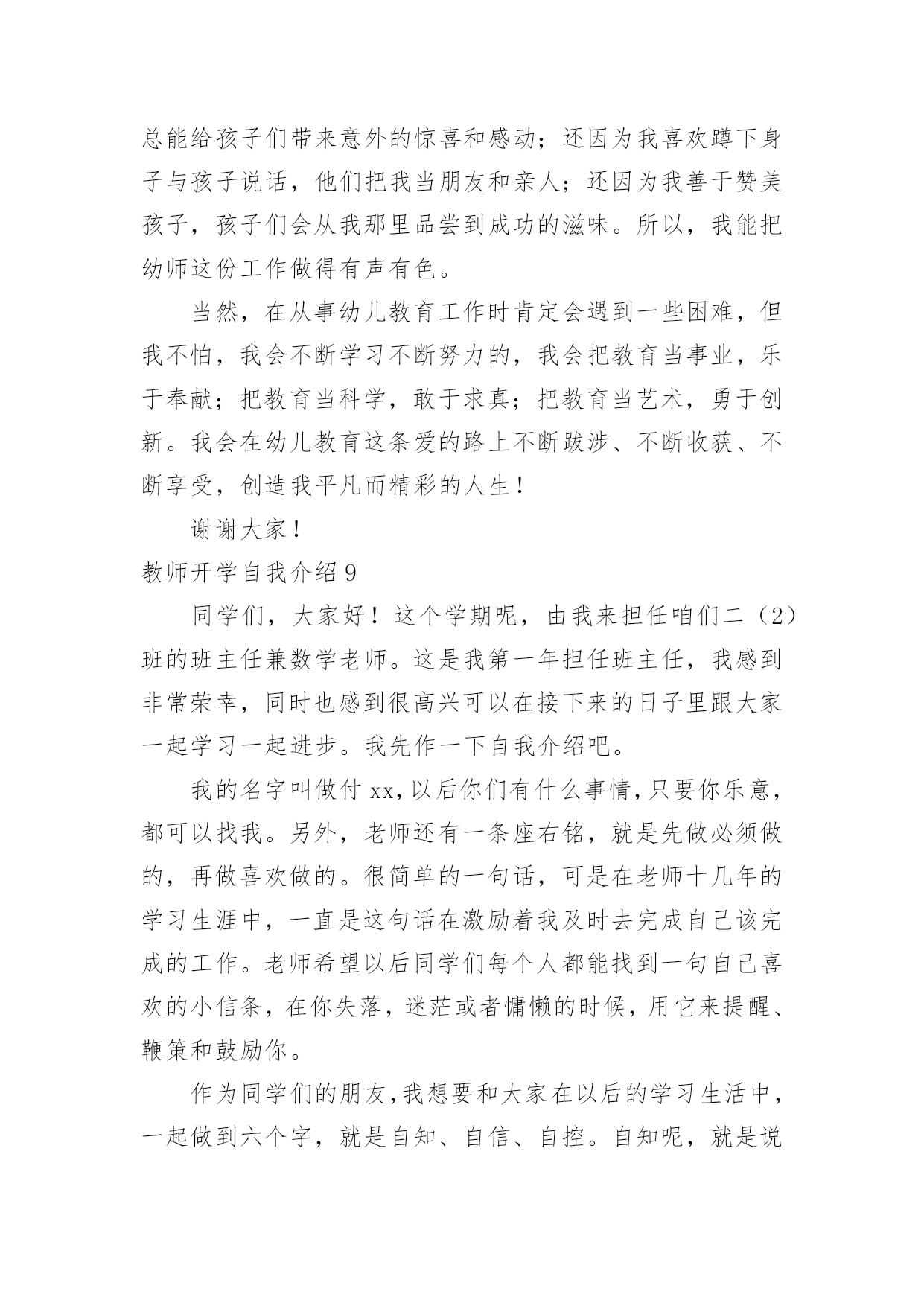 教师开学自我介绍教师开学自我介绍当来到一个陌生的地方时,时常需要用到自我介绍,自我介绍是人与人进行沟通的出发点。怎么写自我介绍才能避免踩雷呢?以下是小编为大家整理的教师开学自我介绍,供大家参考借鉴,希望可以帮助到有需要的朋友。教师开学自我介绍1我是一名有着xx年教龄的体育教师,中学体育教育一级职称,来到xx中学任教之前,一直工作在xx中学,现在就让我做个详细的自我介绍!在十三年的教育教学实践中,通过自己的努力和各学科老师的帮助,逐步形成了自己的教学风格,注重身教,师生相处和谐,有较强的课堂组织调控能力和课程创新能力。积极参加教科研活动,xx年参加了合肥市首批新课程改革试验,并在省教科所体育教研组的带领下,参与了国家级课题《超体重儿童健康行为的实验与研究》的研究,荣获国家二等奖,撰写的论文中,《中学生体育课的教法与激趣》一文发表在《安徽教育论坛》xx年第二期,《认识cai》在xx年合肥市电化教学论文评比中获二等奖,《议中学生体育兴趣的培养》一文荣获xx年度合肥中市区教育学会举办的教育教学论文评比二等奖。在学科竞赛中,xx年获合肥市首届体育教师(初中组)基本功比赛一等奖,同年参加安徽省第二届中小学体育教师教学基本功比赛,获初中组个人总分二等奖,自我介绍《中学体育教师自我介绍范文》。20xx-xx年获合肥市学校体育工作先进个人,xx年被xx区任命为首批骨干教师并保持至今,xx年获合肥市电化教育(现代教育技术)工作先进个人。四十三中学工作期间,除了从事体育教育工作之外,还担任其他一些工作,也获得了一些成绩。自95年开始,一直担任学校团委书记一职,亲手创立的中学生团校在xx年获得安徽省优秀中学生团校示范团校(当年合肥唯一),同年获得安徽省中学共青团工作先进个人称号;是合肥市第十二次团代会代表,也是安徽省第十一次团代会代表。担任学校科技活动小组组长其间,在小组全体师生共同努力下,xx年获首届全国青少年电脑机器人竞赛优秀辅导员称号,并获得中学组创意赛二等奖辅导员奖;xx年获安徽省青少年电脑机器人比赛第一名(领队兼教练);xx年8月,辅导学生参加合肥市第四届中小学电脑制作初中组机器人竞赛,荣获合肥市初中组一等奖。过去的成绩已经随着原来学校的消失而灰飞烟灭,我将以一名新教师的状态开始我在xx中学的工作。在xx中学富有特色教育教学管理模式的熏陶下,在这温馨和谐的大家庭里,我一定充分发挥自己的优点,积极投身庐中教育,成为一名优秀的教师。教师开学自我介绍2亲爱的同学们:大家好!我是各位新的数学老师,以后负责大家的数学课。虽然现在大家彼此还不熟悉交流比较少,但是我希望在以后的课堂交流中大家能积极踊跃的回答问题,提出疑问,这不仅是支持我的工作,也是让我们共同学习共同进步,为我们的班级建设贡献自己的力量。下面我进行一下自我介绍我叫,毕业于河北师范大学汇华学院思想政治教育专业,是一名真真正正的思想政治教育接班人。初次来到蔚县来到蔚县二中我感到十分的亲切,因为甚麽呢,因为我感受到了你们的热情、你们的天真、你们的勤奋。虽说是初次来到蔚县,但是我对张家口并不陌生因为我这是第二次来到张家口,第一次是去赤城玩,在那里我领略到了张家口的美好风景,名山大川。但是说起我的家乡我也是十分的自豪,我出生于有着“孔孟之乡,运河之都”美称的山东省济宁市,有着“佛都”之称的汶上县。“至圣先师”孔子就在我们那的曲阜,亚圣孟子,复圣颜子,宗圣曾子也都诞生于此,古代文化气息相当的浓厚,欢迎大家有时间去参观感受一下。说起我的爱好平时喜欢看看书籍特别是关于励志、金融方面的较多。先人说过“书中自有黄金屋,书中自有颜如玉”嘛古人诚不我欺也旷读的多了自己的见识就会随之增长,自己的气质也会提高,“腹中有书气自华”希望同学们也多多读些自己喜欢的对自己有益的书籍,养成“好读书,读好书”的习惯。其次,我还喜欢玩轮滑。因为我喜欢穿上鞋那种自由自在的感觉,特别是那种经过自己的努力飞速滑跑的飞翔,还有就是练成一个花样动作的成就感,那种成就感是非常美妙的,不不仅练习了自己的轮滑动作自己身体的柔韧性,最主要的是它能给你带来精神上的成就感,让自己的自信心不断增强。也希望同学们能找到自己的爱好不断发挥,提高自己各方面的能力,增强自己的综合素质,当然了,虽然我学的还不是很全面,但是如果有人想学习轮滑需要我的帮助我还是会十分乐意的。作为一名新的老师,经验不足是必然的,但是我们拥有初入职场的热情和激情,拥有充实自己的决心我会严格要求自己时刻铭记自己的责任为同学们服好务,做好事,也希望同学们积极配合,共创佳绩,让我们的未来会更好。谢谢大家。教师开学自我介绍3同学们好!很荣幸,我今天能站在这里!也很荣幸,从今以后,能和大家在一起学习。现在,同学们能够猜猜老师的心情如何呢?(学生回答)刚才同学们说得都很好,老师现在的心情除了激动