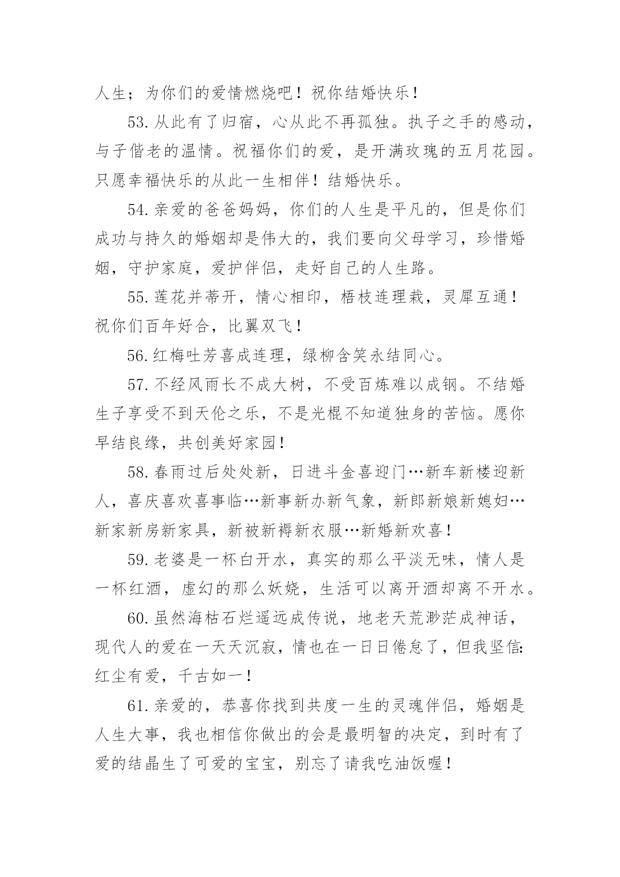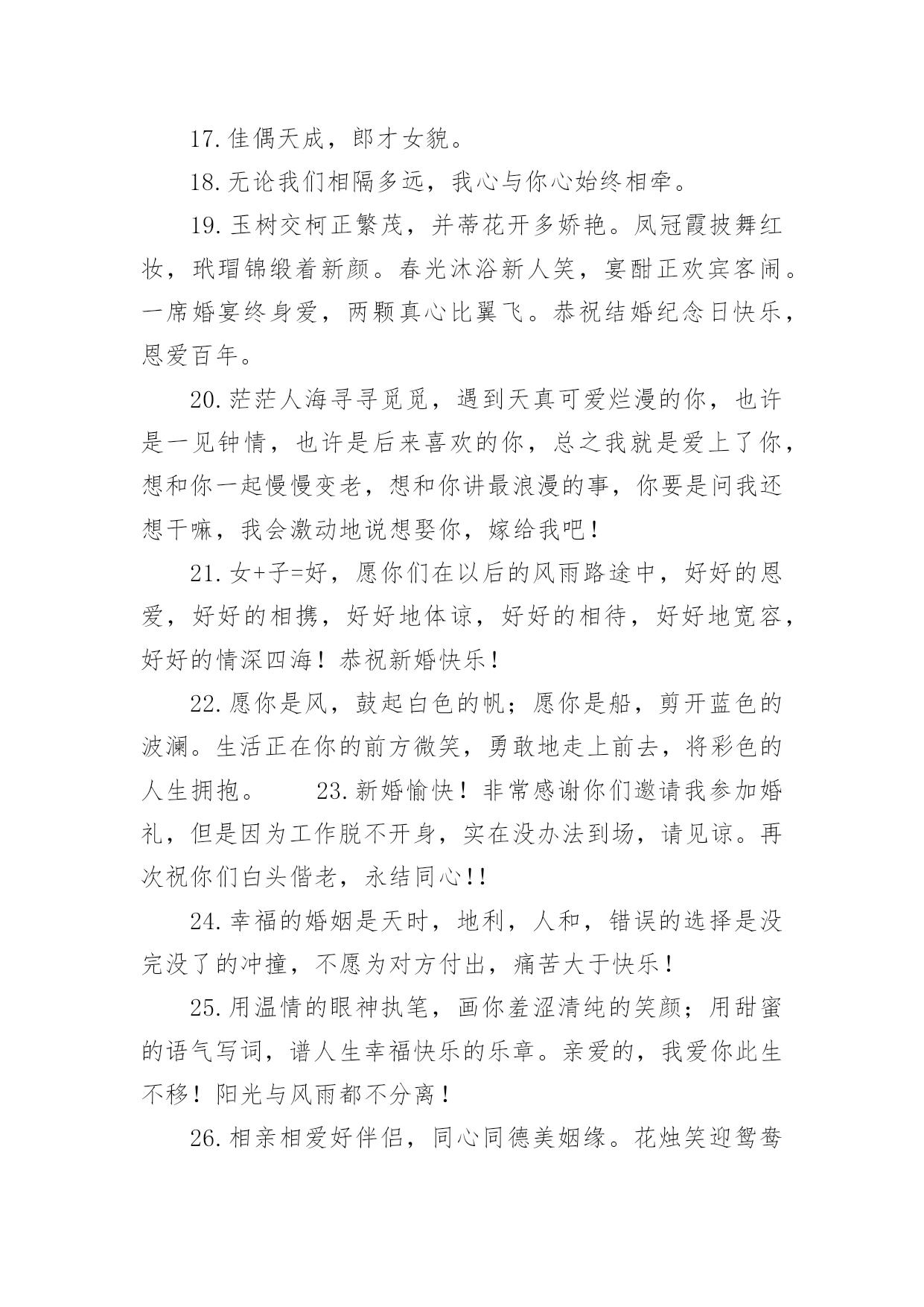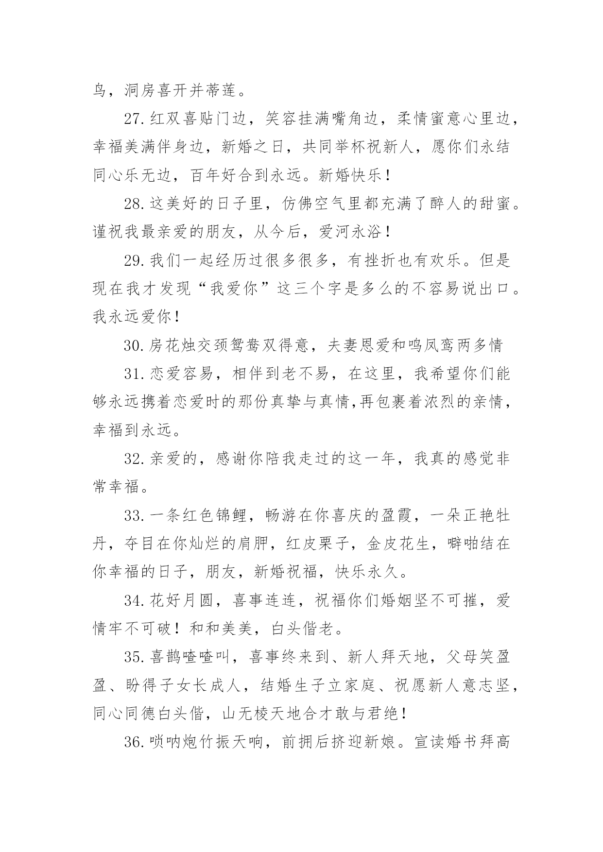 考试祝福语句子有关考试祝福语句子大全无论是在学校还是在社会中,要用到祝福语的地方还是很多的,祝福语是指寄托美好祝福的话语。写起祝福语来就毫无头绪?下面是小编帮大家整理的有关考试祝福语句子大全,欢迎阅读与收藏。1.真心祝福你们,在这个喜庆的日子,为你们送上最真诚的祝福,祝你们恩恩爱爱,长长久久。2.结婚可以成为某些人一跃龙门的“跳板”,但是没有幸福的婚姻,会让人欲上天堂却入地狱。3.你们的相知相恋,洋溢着温馨的喜悦;你们的相亲相爱,呈现着浪漫的味道;你们的相濡以沫,散发着爱情的芬芳;你们的新婚吉日,传递着幸福的氛围。祝你新婚快乐,百年好合!4.能走一起算三生有幸,能过一生算前世姻缘;朋友,恭喜你今日迎得美人归,一辈子的幸福进家门;真诚祝福新婚快乐!做一对相爱一生的美鸳鸯。5.愿你俩如染色体、DNA一般,用爱去缠着对方,彼此互相体谅和关怀,共同分享今后的苦与乐。敬祝百年好合永结同心。6.遇见你,是我一生的幸运,喜欢你,是我做过的事。7.生活加点关心,温馨随处可见;生活加点贴心,浪漫指尖流转;生活加点细心,幸福渐渐弥漫;生活加点爱心,未来更加顺坦。祝新婚愉快,幸福满满!8.人生有你,阳光灿烂;人生有你,四季温暖;人生有你,不畏艰险;人生有你,期待永远。9.天喜地喜红梅放,主欢宾欢新人来,映日红莲开并蒂,同心伴侣喜双飞,一世良缘同地久,百年佳偶共天长,只愿今生情缘常相伴,今世姻缘常相守,新婚快乐。10.但愿你的眼睛,只看得到笑容,但愿你流下每一滴泪,都让人感动,但愿你以后每一场梦,都让人感动!11.执手花前月下相偎风花雪月柔柔一眸情切切深深一吻莫渐渐;红毯结同心,爱似鸳鸯戏水,情比蝴蝶双飞;祝福白头偕老,但愿爱海滔滔,永住鱼水乐。12.戒指上璀璨的光芒,是爱情闪烁的时间,走到今天,婚纱上丝质的细腻,是爱情梳理的距离,亲密无间,祝福小公主,新婚快乐,一生幸福。13.在你新婚喜庆的日子,没能当面表达我的祝福,特表歉意。祝你和夫人家庭和睦、幸福美满!14.用满怀真挚的友谊给你祝福千万千的贺礼!15.真诚的爱情的结合是一切结合中最纯洁的,祝福你们祝你们永远相爱,携手共渡美丽人生!16.我们一路一起成长了太多太多,今天看到你站在婚姻的主舞台上还有些不适应。既然如此,往后也要继续努力哦,对着你的他撒娇笑闹,祝你们永远相爱,永远幸福。17.佳偶天成,郎才女貌。18.无论我们相隔多远,我心与你心始终相牵。19.玉树交柯正繁茂,并蒂花开多娇艳。凤冠霞披舞红妆,玳瑁锦缎着新颜。春光沐浴新人笑,宴酣正欢宾客闹。一席婚宴终身爱,两颗真心比翼飞。恭祝结婚纪念日快乐,恩爱百年。20.茫茫人海寻寻觅觅,遇到天真可爱烂漫的你,也许是一见钟情,也许是后来喜欢的你,总之我就是爱上了你,想和你一起慢慢变老,想和你讲最浪漫的事,你要是问我还想干嘛,我会激动地说想娶你,嫁给我吧!21.女+子=好,愿你们在以后的风雨路途中,好好的恩爱,好好的相携,好好地体谅,好好的相待,好好地宽容,好好的情深四海!恭祝新婚快乐!22.愿你是风,鼓起白色的帆;愿你是船,剪开蓝色的波澜。生活正在你的前方微笑,勇敢地走上前去,将彩色的人生拥抱。23.新婚愉快!非常感谢你们邀请我参加婚礼,但是因为工作脱不开身,实在没办法到场,请见谅。再次祝你们白头偕老,永结同心!!24.幸福的婚姻是天时,地利,人和,错误的选择是没完没了的冲撞,不愿为对方付出,痛苦大于快乐!25.用温情的眼神执笔,画你羞涩清纯的笑颜;用甜蜜的语气写词,谱人生幸福快乐的乐章。亲爱的,我爱你此生不移!阳光与风雨都不分离!26.相亲相爱好伴侣,同心同德美姻缘。花烛笑迎鸳鸯鸟,洞房喜开并蒂莲。27.红双喜贴门边,笑容挂满嘴角边,柔情蜜意心里边,幸福美满伴身边,新婚之日,共同举杯祝新人,愿你们永结同心乐无边,百年好合到永远。新婚快乐!28.这美好的日子里,仿佛空气里都充满了醉人的甜蜜。谨祝我最亲爱的朋友,从今后,爱河永浴!29.我们一起经历过很多很多,有挫折也有欢乐。但是现在我才发现“我爱你”这三个字是多么的不容易说出口。我永远爱你!30.房花烛交颈鸳鸯双得意,夫妻恩爱和鸣凤鸾两多情31.恋爱容易,相伴到老不易,在这里,我希望你们能够永远携着恋爱时的那份真挚与真情,再包裹着浓烈的亲情,幸福到永远。32.亲爱的,感谢你陪我走过的这一年,我真的感觉非常幸福。33.一条红色锦鲤,畅游在你喜庆的盈霞,一朵正艳牡丹,夺目在你灿烂的肩胛,红皮栗子,金皮花生,噼啪结在你幸福的日子,朋友,新婚祝福,快乐永久。34.花好月圆,喜事连连,祝福你们婚姻坚不可摧,爱情牢不可破!和和美美,白头偕老。35.喜鹊喳喳叫,喜事终来到、新人拜天地,父母笑盈盈、盼得子女长成人,结婚生子立家庭、祝愿新人意志坚,同心同德白头偕,山无棱天地合才敢与君绝!36.唢呐炮竹振天响,前拥后