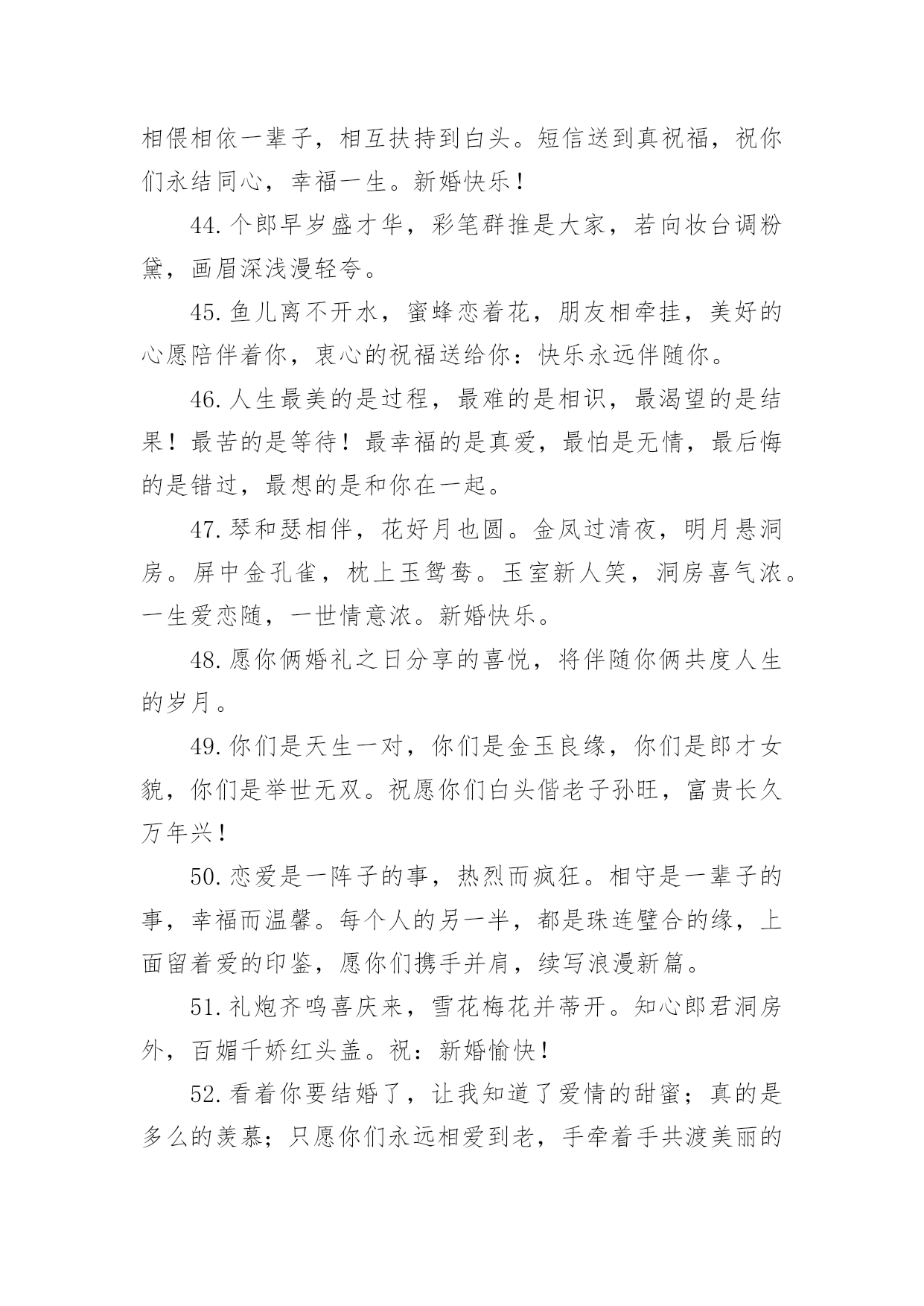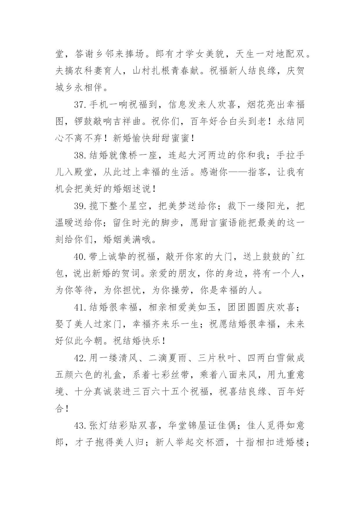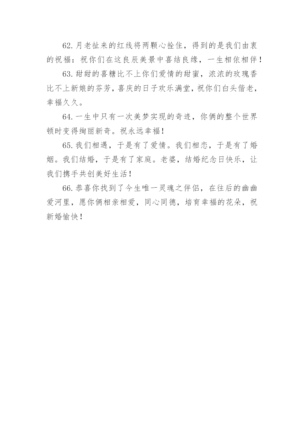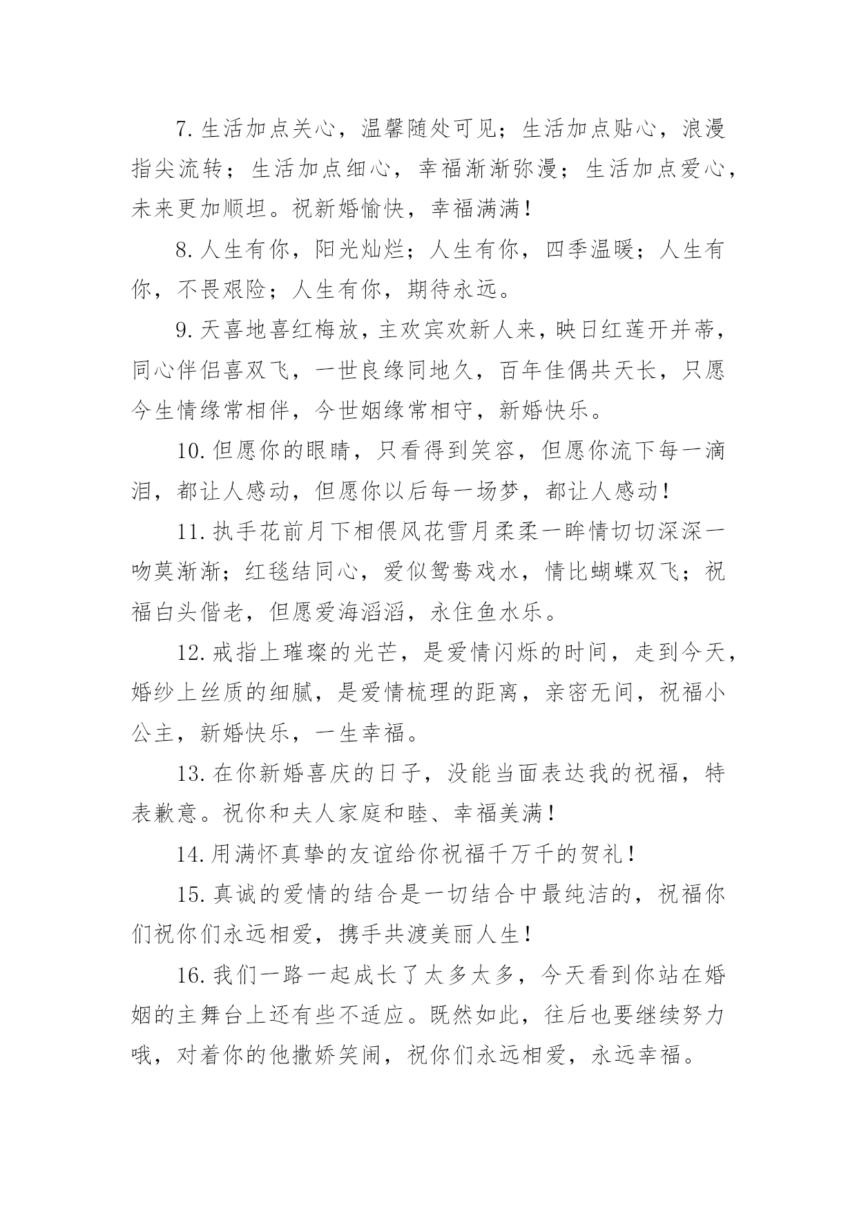 考试祝福语句子有关考试祝福语句子大全无论是在学校还是在社会中,要用到祝福语的地方还是很多的,祝福语是指寄托美好祝福的话语。写起祝福语来就毫无头绪?下面是小编帮大家整理的有关考试祝福语句子大全,欢迎阅读与收藏。1.真心祝福你们,在这个喜庆的日子,为你们送上最真诚的祝福,祝你们恩恩爱爱,长长久久。2.结婚可以成为某些人一跃龙门的“跳板”,但是没有幸福的婚姻,会让人欲上天堂却入地狱。3.你们的相知相恋,洋溢着温馨的喜悦;你们的相亲相爱,呈现着浪漫的味道;你们的相濡以沫,散发着爱情的芬芳;你们的新婚吉日,传递着幸福的氛围。祝你新婚快乐,百年好合!4.能走一起算三生有幸,能过一生算前世姻缘;朋友,恭喜你今日迎得美人归,一辈子的幸福进家门;真诚祝福新婚快乐!做一对相爱一生的美鸳鸯。5.愿你俩如染色体、DNA一般,用爱去缠着对方,彼此互相体谅和关怀,共同分享今后的苦与乐。敬祝百年好合永结同心。6.遇见你,是我一生的幸运,喜欢你,是我做过的事。7.生活加点关心,温馨随处可见;生活加点贴心,浪漫指尖流转;生活加点细心,幸福渐渐弥漫;生活加点爱心,未来更加顺坦。祝新婚愉快,幸福满满!8.人生有你,阳光灿烂;人生有你,四季温暖;人生有你,不畏艰险;人生有你,期待永远。9.天喜地喜红梅放,主欢宾欢新人来,映日红莲开并蒂,同心伴侣喜双飞,一世良缘同地久,百年佳偶共天长,只愿今生情缘常相伴,今世姻缘常相守,新婚快乐。10.但愿你的眼睛,只看得到笑容,但愿你流下每一滴泪,都让人感动,但愿你以后每一场梦,都让人感动!11.执手花前月下相偎风花雪月柔柔一眸情切切深深一吻莫渐渐;红毯结同心,爱似鸳鸯戏水,情比蝴蝶双飞;祝福白头偕老,但愿爱海滔滔,永住鱼水乐。12.戒指上璀璨的光芒,是爱情闪烁的时间,走到今天,婚纱上丝质的细腻,是爱情梳理的距离,亲密无间,祝福小公主,新婚快乐,一生幸福。13.在你新婚喜庆的日子,没能当面表达我的祝福,特表歉意。祝你和夫人家庭和睦、幸福美满!14.用满怀真挚的友谊给你祝福千万千的贺礼!15.真诚的爱情的结合是一切结合中最纯洁的,祝福你们祝你们永远相爱,携手共渡美丽人生!16.我们一路一起成长了太多太多,今天看到你站在婚姻的主舞台上还有些不适应。既然如此,往后也要继续努力哦,对着你的他撒娇笑闹,祝你们永远相爱,永远幸福。17.佳偶天成,郎才女貌。18.无论我们相隔多远,我心与你心始终相牵。19.玉树交柯正繁茂,并蒂花开多娇艳。凤冠霞披舞红妆,玳瑁锦缎着新颜。春光沐浴新人笑,宴酣正欢宾客闹。一席婚宴终身爱,两颗真心比翼飞。恭祝结婚纪念日快乐,恩爱百年。20.茫茫人海寻寻觅觅,遇到天真可爱烂漫的你,也许是一见钟情,也许是后来喜欢的你,总之我就是爱上了你,想和你一起慢慢变老,想和你讲最浪漫的事,你要是问我还想干嘛,我会激动地说想娶你,嫁给我吧!21.女+子=好,愿你们在以后的风雨路途中,好好的恩爱,好好的相携,好好地体谅,好好的相待,好好地宽容,好好的情深四海!恭祝新婚快乐!22.愿你是风,鼓起白色的帆;愿你是船,剪开蓝色的波澜。生活正在你的前方微笑,勇敢地走上前去,将彩色的人生拥抱。23.新婚愉快!非常感谢你们邀请我参加婚礼,但是因为工作脱不开身,实在没办法到场,请见谅。再次祝你们白头偕老,永结同心!!24.幸福的婚姻是天时,地利,人和,错误的选择是没完没了的冲撞,不愿为对方付出,痛苦大于快乐!25.用温情的眼神执笔,画你羞涩清纯的笑颜;用甜蜜的语气写词,谱人生幸福快乐的乐章。亲爱的,我爱你此生不移!阳光与风雨都不分离!26.相亲相爱好伴侣,同心同德美姻缘。花烛笑迎鸳鸯鸟,洞房喜开并蒂莲。27.红双喜贴门边,笑容挂满嘴角边,柔情蜜意心里边,幸福美满伴身边,新婚之日,共同举杯祝新人,愿你们永结同心乐无边,百年好合到永远。新婚快乐!28.这美好的日子里,仿佛空气里都充满了醉人的甜蜜。谨祝我最亲爱的朋友,从今后,爱河永浴!29.我们一起经历过很多很多,有挫折也有欢乐。但是现在我才发现“我爱你”这三个字是多么的不容易说出口。我永远爱你!30.房花烛交颈鸳鸯双得意,夫妻恩爱和鸣凤鸾两多情31.恋爱容易,相伴到老不易,在这里,我希望你们能够永远携着恋爱时的那份真挚与真情,再包裹着浓烈的亲情,幸福到永远。32.亲爱的,感谢你陪我走过的这一年,我真的感觉非常幸福。33.一条红色锦鲤,畅游在你喜庆的盈霞,一朵正艳牡丹,夺目在你灿烂的肩胛,红皮栗子,金皮花生,噼啪结在你幸福的日子,朋友,新婚祝福,快乐永久。34.花好月圆,喜事连连,祝福你们婚姻坚不可摧,爱情牢不可破!和和美美,白头偕老。35.喜鹊喳喳叫,喜事终来到、新人拜天地,父母笑盈盈、盼得子女长成人,结婚生子立家庭、祝愿新人意志坚,同心同德白头偕,山无棱天地合才敢与君绝!36.唢呐炮竹振天响,前拥后