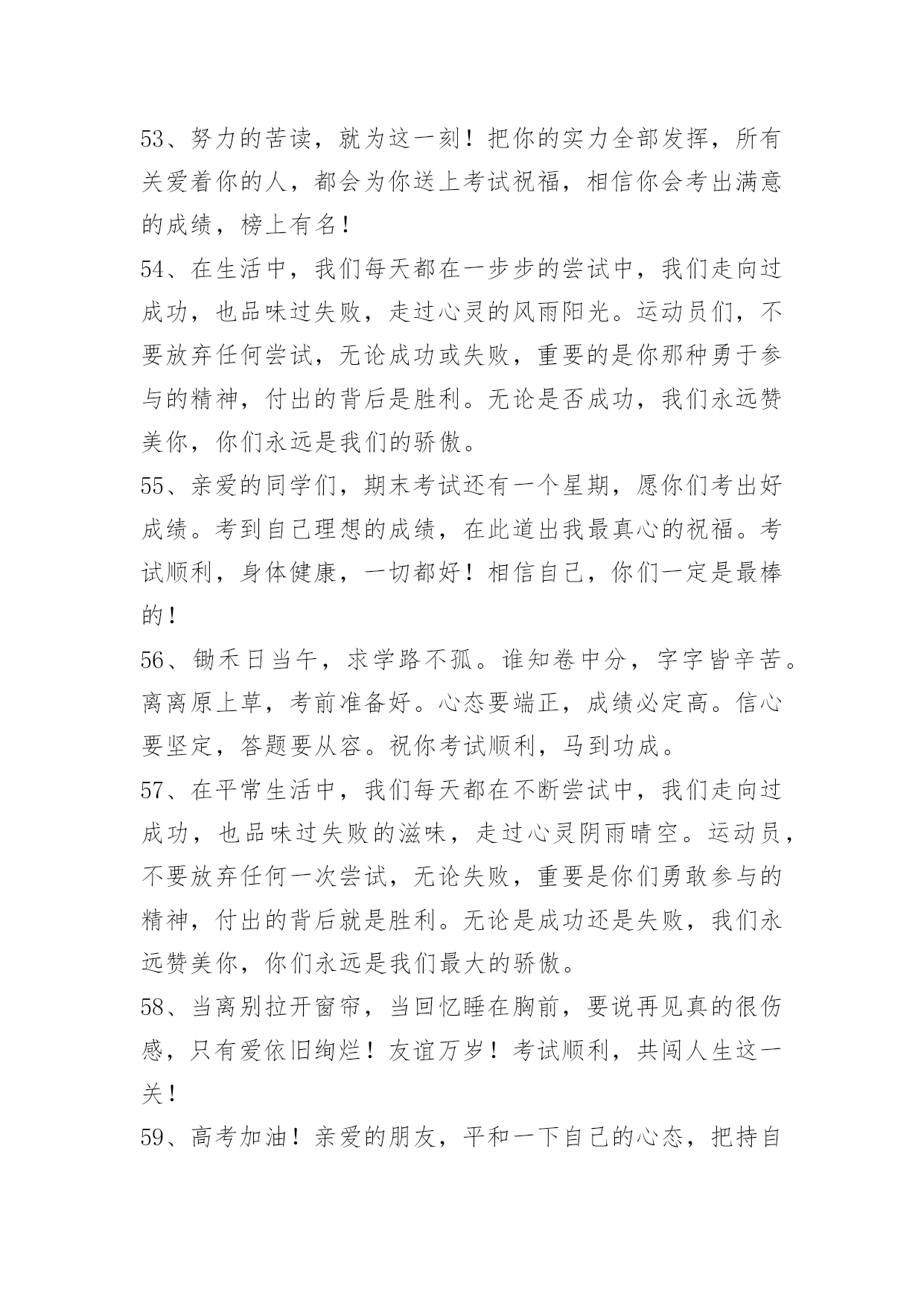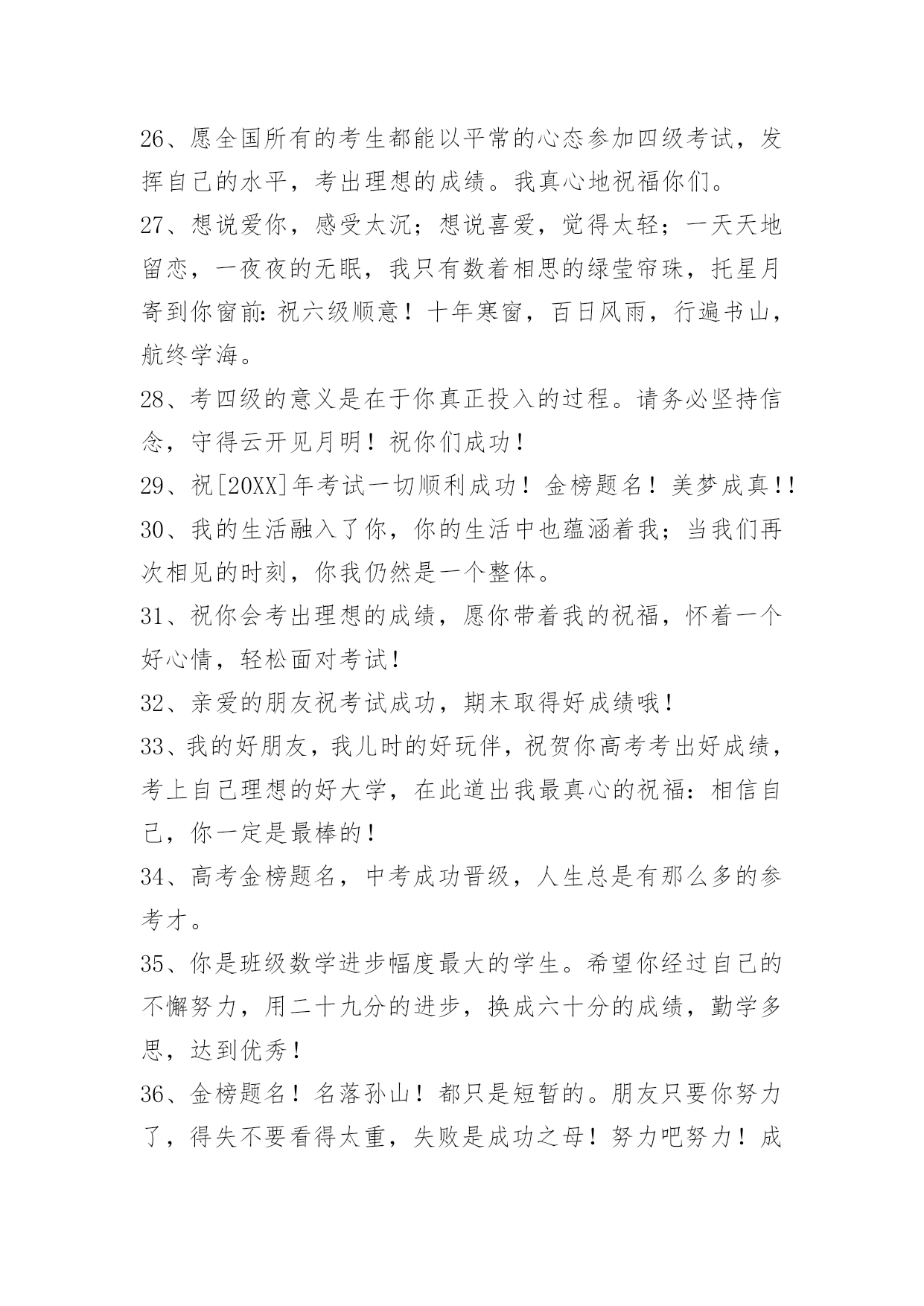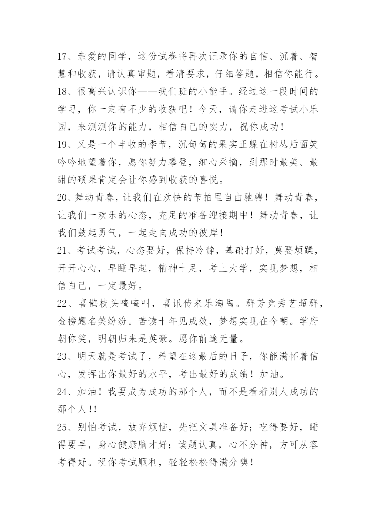 经典考试顺利祝福寄语经典考试顺利祝福寄语大全60句我坚信,我们付出了汗水,经受了考验,理想中大学殿堂的大门就一定会为我们而敞开,让我们继续艰辛却快乐的求学之路!这篇文章是小编给各位读者分享的一些考试顺利祝福寄语,欢迎阅读与收藏。1、量变到质变,努力奠定基础;开花到结果,坚持终能收获;过程到成功,态度决定一切。高考到,饭吃好,觉睡好,才能考的更好2、高考的舞台,见证你的精彩;挥洒的汗水,成就你的豪迈。宝剑锋从磨砺出,梅花香自苦寒来。愿你高考顺利,金榜题名,人生路上永不败。3、你可以跌倒100次,但是并不妨碍你第101次爬起来。相信自己,你将如此坚强,忘却曾经的失败,义无反顾地去争取未来更大的建树。祝高考成功,蟾宫折桂。4、小妹,明天就要考试了,祝你发挥出自己的真实水平,考个好成绩。我相信你一定行的!哥哥为你祈祷!5、一年一考年年考,考试并非华容道。人生大考多在后,全力拼搏有精彩!6、努力了,就无怨无悔!有道是:天道筹勤!相信自己吧!你是最棒的!我会永远支持你的!祝你期末大考取得好成绩!7、愿你今年考上心中的大学。考试顺利!8、祝愿天下所有考生开心度过期中考试。祝福你们旗开得胜,取得美好佳绩。平心对待,你们是最棒的!仁慈的上帝会祝福你们的,相信自己,一定能行!9、开启专八考试成功之门,钥匙有三。其一:勤奋的精神;其二:科学的方法;其三:良好的心态。10、第一行歪斜的脚印,已被岁月的风尘抹平;而生活的道路呀,还在你的脚下延伸。我祝愿你考得好成绩。11、期中考试是一个实现人生的省力杠杆,此时是你撬动它的最佳时机,并且以后你的人生会呈弧线上升!12、期中考试的你请听好,一切都要准备好;橡皮铅笔小纸条,不会偶尔瞟一瞟;寒窗十载很艰苦,一朝机遇要抓牢;我说的话要记好,金榜提名在今朝;祝期中考试大捷!13、期中考试考的不只是知识,更重要的是对心理素质的考验,只有不抛弃不放弃,才能获得成功。要记住,即便你只剩下一份钟,你还有六十秒!加油!14、自己选择的路,跪着也要把它走完。人生只有走出来的美丽,没有等出来的辉煌。15、小朋友,有人夸你品质好,有人夸你学习棒;有人夸你头脑灵,有人夸你计算准;有人夸你心细,有人夸你志高这都是书本给予你的,希望你能继续好好学习,取得更好的成绩。16、同学们,时间过得真快啊,一转眼又学完一个单元,你们一定迫不及待得想检验自己的学习情况吧!行,那我们就来笔试一下吧!17、亲爱的同学,这份试卷将再次记录你的自信、沉着、智慧和收获,请认真审题,看清要求,仔细答题,相信你能行。18、很高兴认识你——我们班的小能手。经过这一段时间的学习,你一定有不少的收获吧!今天,请你走进这考试小乐园,来测测你的能力,相信自己的实力,祝你成功!19、又是一个丰收的季节,沉甸甸的果实正躲在树丛后面笑吟吟地望着你,愿你努力攀登,细心采摘,到那时最美、最甜的硕果肯定会让你感到收获的喜悦。20、舞动青春,让我们在欢快的节拍里自由驰骋!舞动青春,让我们一欢乐的心态,充足的准备迎接期中!舞动青春,让我们鼓起勇气,一起走向成功的彼岸!21、考试考试,心态要好,保持冷静,基础打好,莫要烦躁,开开心心,早睡早起,精神十足,考上大学,实现梦想,相信自己,一定最好。22、喜鹊枝头喳喳叫,喜讯传来乐淘陶。群芳竞秀艺超群,金榜题名笑纷纷。苦读十年见成效,梦想实现在今朝。学府朝你笑,明朝归来是英豪。愿你前途无量。23、明天就是考试了,希望在这最后的日子,你能满怀着信心,发挥出你最好的水平,考出最好的成绩!加油。24、加油!我要成为成功的那个人,而不是看着别人成功的那个人!!25、别怕考试,放弃烦恼,先把文具准备好;吃得要好,睡得要早,身心健康脑才好;读题认真,心不分神,方可从容考得好。祝你考试顺利,轻轻松松得满分噢!26、愿全国所有的考生都能以平常的心态参加四级考试,发挥自己的水平,考出理想的成绩。我真心地祝福你们。27、想说爱你,感受太沉;想说喜爱,觉得太轻;一天天地留恋,一夜夜的无眠,我只有数着相思的绿莹帘珠,托星月寄到你窗前:祝六级顺意!十年寒窗,百日风雨,行遍书山,航终学海。28、考四级的意义是在于你真正投入的过程。请务必坚持信念,守得云开见月明!祝你们成功!29、祝[20XX]年考试一切顺利成功!金榜题名!美梦成真!!30、我的生活融入了你,你的生活中也蕴涵着我;当我们再次相见的时刻,你我仍然是一个整体。31、祝你会考出理想的成绩,愿你带着我的祝福,怀着一个好心情,轻松面对考试!32、亲爱的朋友祝考试成功,期末取得好成绩哦!33、我的好朋友,我儿时的好玩伴,祝贺你高考考出好成绩,考上自己理想的好大学,在此道出我最真心的祝福:相信自己,你一定是最棒的!34、高考金榜题名,中考成功晋级,人生总是有那么多的参考才。35、你是班级数学进步幅度最大的学生。希望你经过