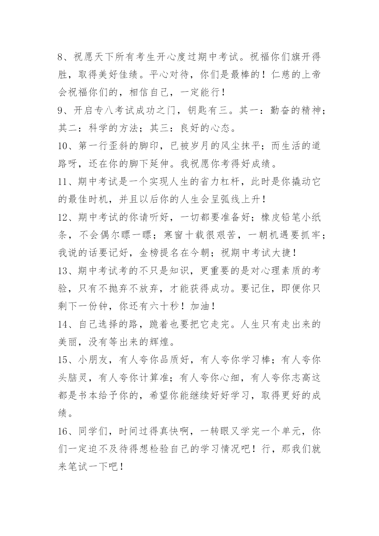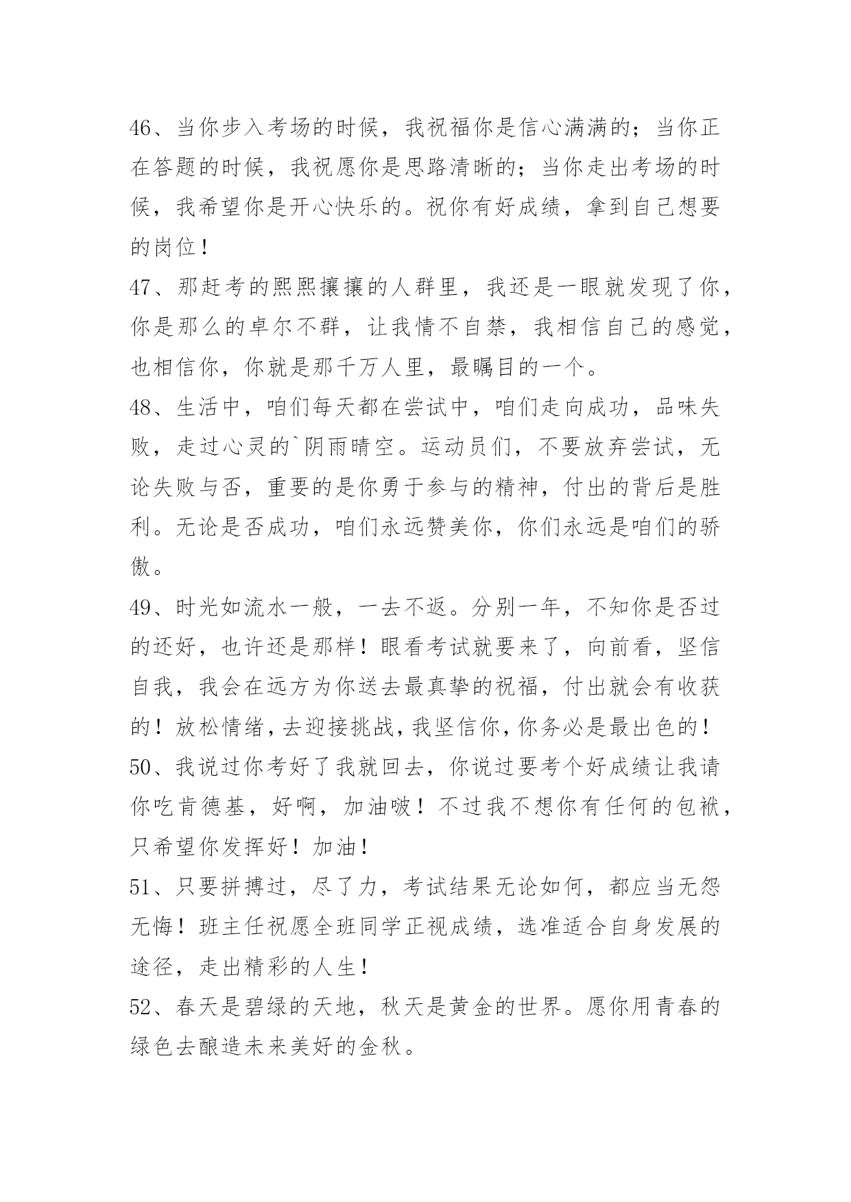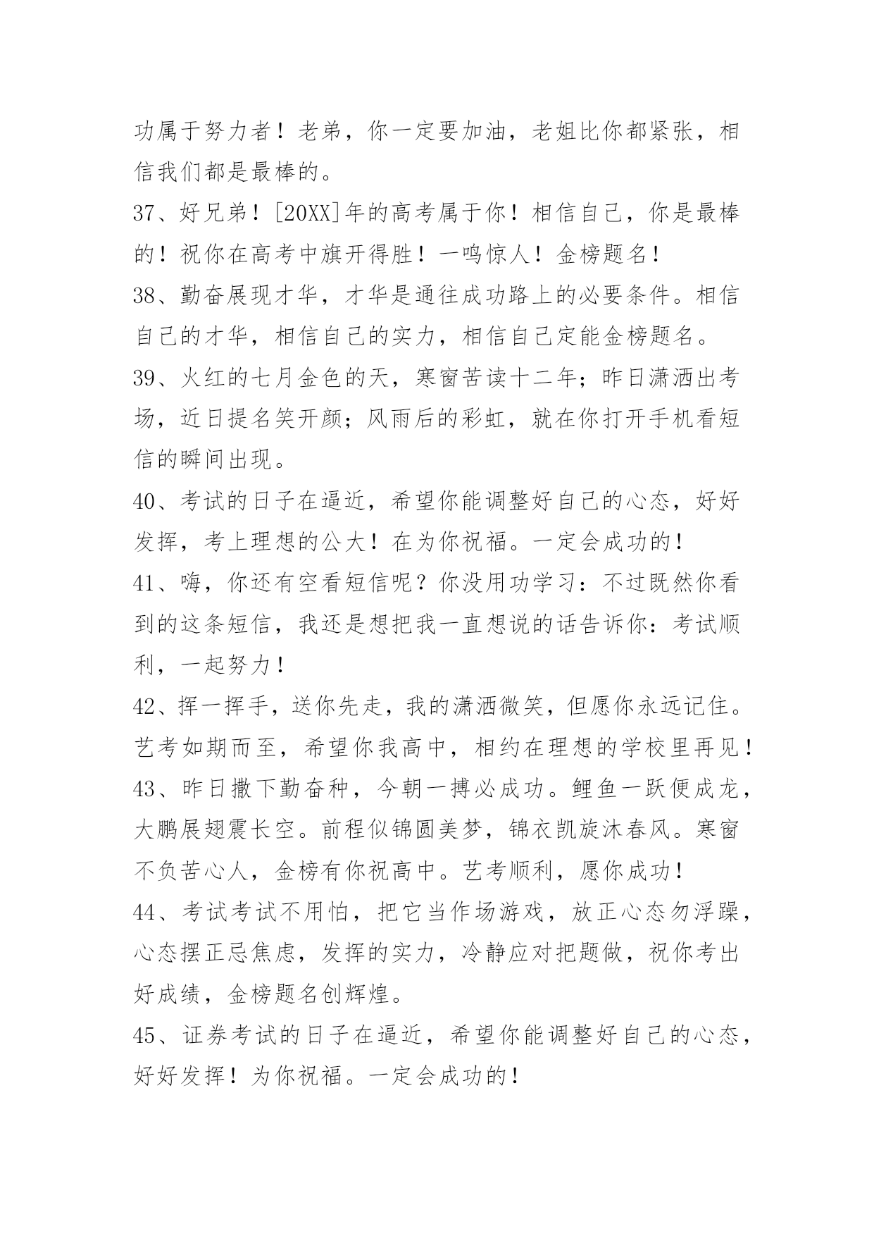 经典考试顺利祝福寄语经典考试顺利祝福寄语大全60句我坚信,我们付出了汗水,经受了考验,理想中大学殿堂的大门就一定会为我们而敞开,让我们继续艰辛却快乐的求学之路!这篇文章是小编给各位读者分享的一些考试顺利祝福寄语,欢迎阅读与收藏。1、量变到质变,努力奠定基础;开花到结果,坚持终能收获;过程到成功,态度决定一切。高考到,饭吃好,觉睡好,才能考的更好2、高考的舞台,见证你的精彩;挥洒的汗水,成就你的豪迈。宝剑锋从磨砺出,梅花香自苦寒来。愿你高考顺利,金榜题名,人生路上永不败。3、你可以跌倒100次,但是并不妨碍你第101次爬起来。相信自己,你将如此坚强,忘却曾经的失败,义无反顾地去争取未来更大的建树。祝高考成功,蟾宫折桂。4、小妹,明天就要考试了,祝你发挥出自己的真实水平,考个好成绩。我相信你一定行的!哥哥为你祈祷!5、一年一考年年考,考试并非华容道。人生大考多在后,全力拼搏有精彩!6、努力了,就无怨无悔!有道是:天道筹勤!相信自己吧!你是最棒的!我会永远支持你的!祝你期末大考取得好成绩!7、愿你今年考上心中的大学。考试顺利!8、祝愿天下所有考生开心度过期中考试。祝福你们旗开得胜,取得美好佳绩。平心对待,你们是最棒的!仁慈的上帝会祝福你们的,相信自己,一定能行!9、开启专八考试成功之门,钥匙有三。其一:勤奋的精神;其二:科学的方法;其三:良好的心态。10、第一行歪斜的脚印,已被岁月的风尘抹平;而生活的道路呀,还在你的脚下延伸。我祝愿你考得好成绩。11、期中考试是一个实现人生的省力杠杆,此时是你撬动它的最佳时机,并且以后你的人生会呈弧线上升!12、期中考试的你请听好,一切都要准备好;橡皮铅笔小纸条,不会偶尔瞟一瞟;寒窗十载很艰苦,一朝机遇要抓牢;我说的话要记好,金榜提名在今朝;祝期中考试大捷!13、期中考试考的不只是知识,更重要的是对心理素质的考验,只有不抛弃不放弃,才能获得成功。要记住,即便你只剩下一份钟,你还有六十秒!加油!14、自己选择的路,跪着也要把它走完。人生只有走出来的美丽,没有等出来的辉煌。15、小朋友,有人夸你品质好,有人夸你学习棒;有人夸你头脑灵,有人夸你计算准;有人夸你心细,有人夸你志高这都是书本给予你的,希望你能继续好好学习,取得更好的成绩。16、同学们,时间过得真快啊,一转眼又学完一个单元,你们一定迫不及待得想检验自己的学习情况吧!行,那我们就来笔试一下吧!17、亲爱的同学,这份试卷将再次记录你的自信、沉着、智慧和收获,请认真审题,看清要求,仔细答题,相信你能行。18、很高兴认识你——我们班的小能手。经过这一段时间的学习,你一定有不少的收获吧!今天,请你走进这考试小乐园,来测测你的能力,相信自己的实力,祝你成功!19、又是一个丰收的季节,沉甸甸的果实正躲在树丛后面笑吟吟地望着你,愿你努力攀登,细心采摘,到那时最美、最甜的硕果肯定会让你感到收获的喜悦。20、舞动青春,让我们在欢快的节拍里自由驰骋!舞动青春,让我们一欢乐的心态,充足的准备迎接期中!舞动青春,让我们鼓起勇气,一起走向成功的彼岸!21、考试考试,心态要好,保持冷静,基础打好,莫要烦躁,开开心心,早睡早起,精神十足,考上大学,实现梦想,相信自己,一定最好。22、喜鹊枝头喳喳叫,喜讯传来乐淘陶。群芳竞秀艺超群,金榜题名笑纷纷。苦读十年见成效,梦想实现在今朝。学府朝你笑,明朝归来是英豪。愿你前途无量。23、明天就是考试了,希望在这最后的日子,你能满怀着信心,发挥出你最好的水平,考出最好的成绩!加油。24、加油!我要成为成功的那个人,而不是看着别人成功的那个人!!25、别怕考试,放弃烦恼,先把文具准备好;吃得要好,睡得要早,身心健康脑才好;读题认真,心不分神,方可从容考得好。祝你考试顺利,轻轻松松得满分噢!26、愿全国所有的考生都能以平常的心态参加四级考试,发挥自己的水平,考出理想的成绩。我真心地祝福你们。27、想说爱你,感受太沉;想说喜爱,觉得太轻;一天天地留恋,一夜夜的无眠,我只有数着相思的绿莹帘珠,托星月寄到你窗前:祝六级顺意!十年寒窗,百日风雨,行遍书山,航终学海。28、考四级的意义是在于你真正投入的过程。请务必坚持信念,守得云开见月明!祝你们成功!29、祝[20XX]年考试一切顺利成功!金榜题名!美梦成真!!30、我的生活融入了你,你的生活中也蕴涵着我;当我们再次相见的时刻,你我仍然是一个整体。31、祝你会考出理想的成绩,愿你带着我的祝福,怀着一个好心情,轻松面对考试!32、亲爱的朋友祝考试成功,期末取得好成绩哦!33、我的好朋友,我儿时的好玩伴,祝贺你高考考出好成绩,考上自己理想的好大学,在此道出我最真心的祝福:相信自己,你一定是最棒的!34、高考金榜题名,中考成功晋级,人生总是有那么多的参考才。35、你是班级数学进步幅度最大的学生。希望你经过