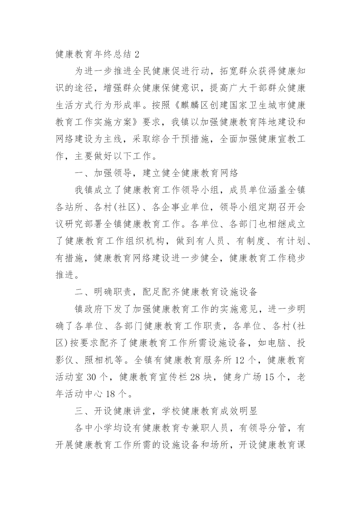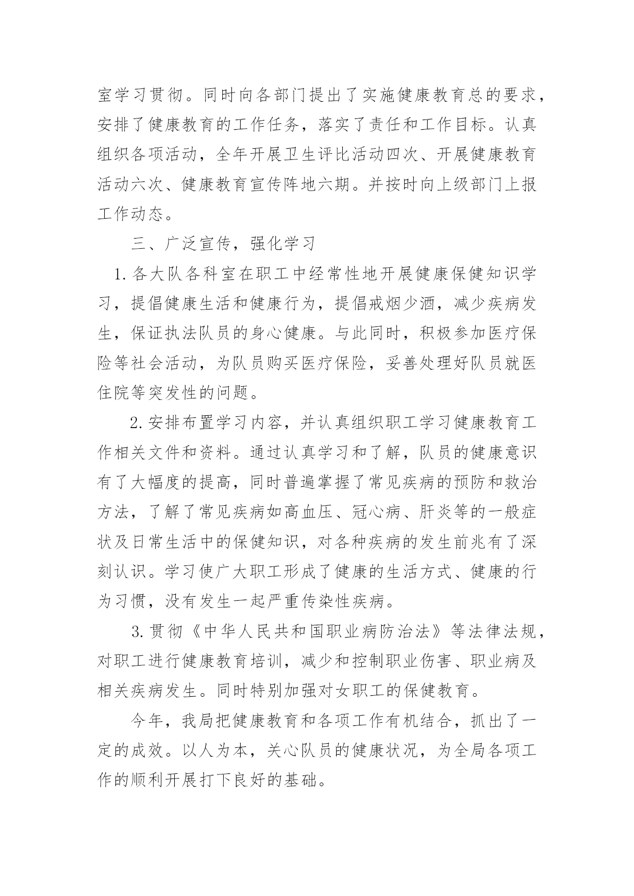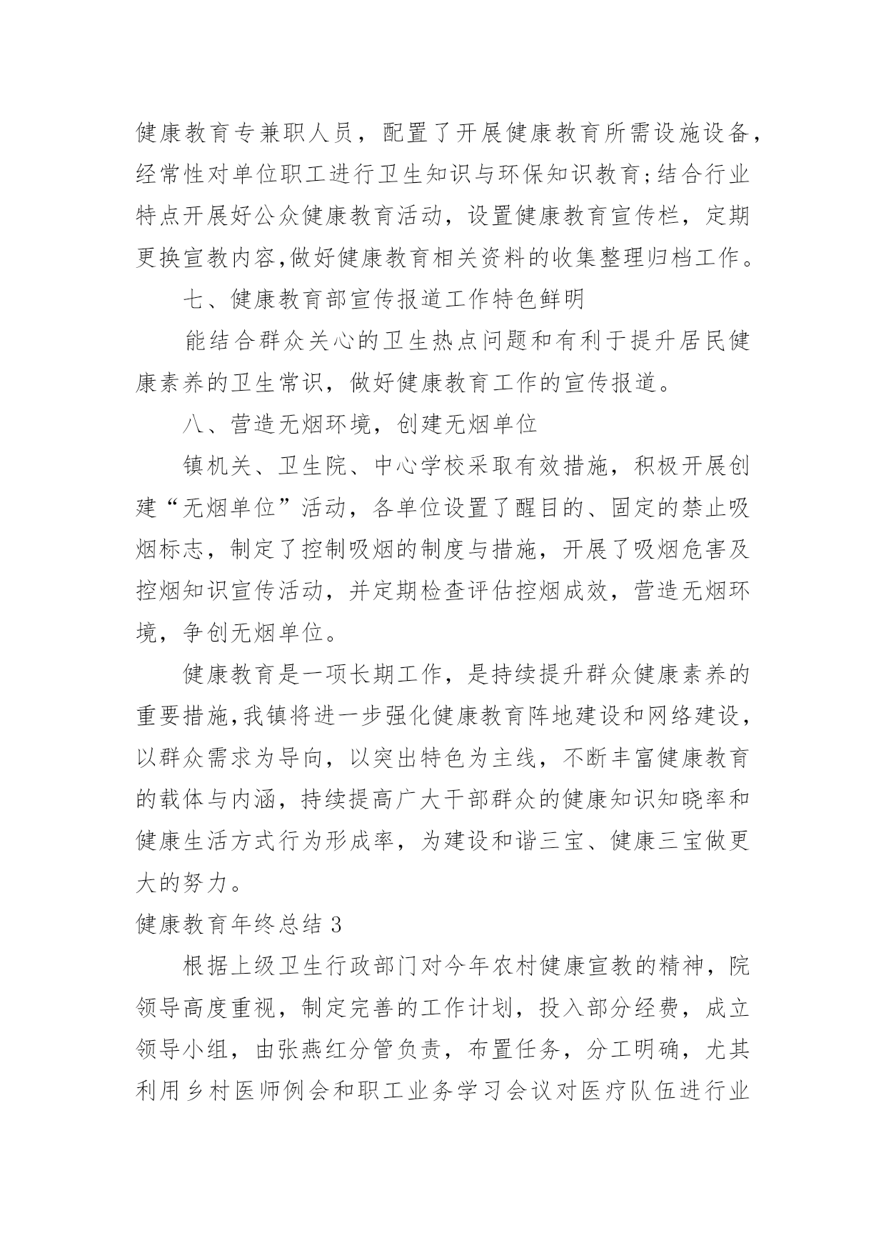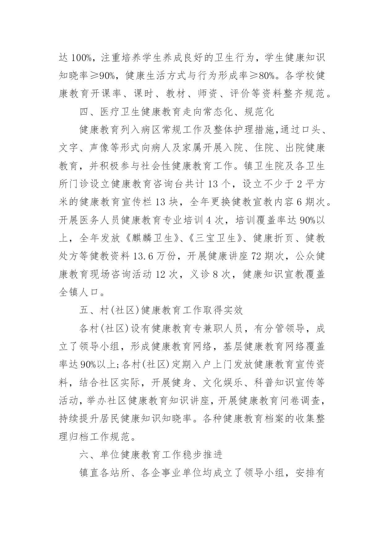 健康教育年终总结健康教育年终总结总结就是对一个时期的学习、工作或其完成情况进行一次全面系统的回顾和分析的书面材料,它能够使头脑更加清醒,目标更加明确,不如我们来制定一份总结吧。总结怎么写才不会流于形式呢?下面是小编精心整理的健康教育年终总结,仅供参考,欢迎大家阅读。健康教育年终总结1xxxx年,我局继续深化健康教育工作,切实将干部职工的健康教育工作纳入本局的目标管理,调整完善健康教育工作领导小组,拟定健康教育工作计划,在干部职工中普及健康知识,使该项工作取得了良好的成绩。一、高度重视,加强领导局领导历来十分重视健康教育工作,为认真实施健康教育工作,切实做好我区国家卫生城市复查工作,大队对原健康教育领导小组成员进行了调整,加强对健康教育工作的统一领导和安排部署,确保各项工作的组织实施和顺利落实。二、制定计划,落实责任根据东胜区爱卫办的有关文件精神,为加强我局干部职工的医疗卫生意识,普及健康保健知识,局健康领导小组制定了xxxx年健康教育工作计划,并以文件下发各大队各科室学习贯彻。同时向各部门提出了实施健康教育总的要求,安排了健康教育的工作任务,落实了责任和工作目标。认真组织各项活动,全年开展卫生评比活动四次、开展健康教育活动六次、健康教育宣传阵地六期。并按时向上级部门上报工作动态。三、广泛宣传,强化学习1.各大队各科室在职工中经常性地开展健康保健知识学习,提倡健康生活和健康行为,提倡戒烟少酒,减少疾病发生,保证执法队员的身心健康。与此同时,积极参加医疗保险等社会活动,为队员购买医疗保险,妥善处理好队员就医住院等突发性的问题。2.安排布置学习内容,并认真组织职工学习健康教育工作相关文件和资料。通过认真学习和了解,队员的健康意识有了大幅度的提高,同时普遍掌握了常见疾病的预防和救治方法,了解了常见疾病如高血压、冠心病、肝炎等的一般症状及日常生活中的保健知识,对各种疾病的发生前兆有了深刻认识。学习使广大职工形成了健康的生活方式、健康的行为习惯,没有发生一起严重传染性疾病。3.贯彻《中华人民共和国职业病防治法》等法律法规,对职工进行健康教育培训,减少和控制职业伤害、职业病及相关疾病发生。同时特别加强对女职工的保健教育。今年,我局把健康教育和各项工作有机结合,抓出了一定的成效。以人为本,关心队员的健康状况,为全局各项工作的顺利开展打下良好的基础。健康教育年终总结2为进一步推进全民健康促进行动,拓宽群众获得健康知识的途径,增强群众健康保健意识,提高广大干部群众健康生活方式行为形成率。按照《麒麟区创建国家卫生城市健康教育工作实施方案》要求,我镇以加强健康教育阵地建设和网络建设为主线,采取综合干预措施,全面加强健康宣教工作,主要做好以下工作。一、加强领导,建立健全健康教育网络我镇成立了健康教育工作领导小组,成员单位涵盖全镇各站所、各村(社区)、各企事业单位,领导小组定期召开会议研究部署全镇健康教育工作。各单位、各部门也相继成立了健康教育工作组织机构,做到有人员、有制度、有计划、有措施,健康教育网络建设进一步健全,健康教育工作稳步推进。二、明确职责,配足配齐健康教育设施设备镇政府下发了加强健康教育工作的实施意见,进一步明确了各单位、各部门健康教育工作职责,各单位、各村(社区)按要求配齐了健康教育工作所需设施设备,如电脑、投影仪、照相机等。全镇有健康教育服务所12个,健康教育活动室30个,健康教育宣传栏28块,健身广场15个,老年活动中心18个。三、开设健康讲堂,学校健康教育成效明显各中小学均设有健康教育专兼职人员,有领导分管,有开展健康教育工作所需的设施设备和场所,开设健康教育课达100%,注重培养学生养成良好的卫生行为,学生健康知识知晓率≥90%,健康生活方式与行为形成率≥80%。各学校健康教育开课率、课时、教材、师资、评价等资料整齐规范。四、医疗卫生健康教育走向常态化、规范化健康教育列入病区常规工作及整体护理措施,通过口头、文字、声像等形式向病人及家属开展入院、住院、出院健康教育,并积极参与社会性健康教育工作。镇卫生院及各卫生所门诊设立健康教育咨询台共计13个,设立不少于2平方米的健康教育宣传栏13块,全年更换健教宣教内容6期次。开展医务人员健康教育专业培训4次,培训覆盖率达90%以上,全年发放《麒麟卫生》、《三宝卫生》、健康折页、健教处方等健教资料13.6万份,开展健康讲座72期次,公众健康教育现场咨询活动12次,义诊8次,健康知识宣教覆盖全镇人口。五、村(社区)健康教育工作取得实效各村(社区)设有健康教育专兼职人员,有分管领导,成立了领导小组,形成健康教育网络,基层健康教育网络覆盖率达90%以上;各村(社区)定期入户上门发放健康教育宣传资料,结合社区实际,开展健身、文化娱乐、科普知识宣传等活动,举办社区健康教育知识讲座,开展健康教育问卷