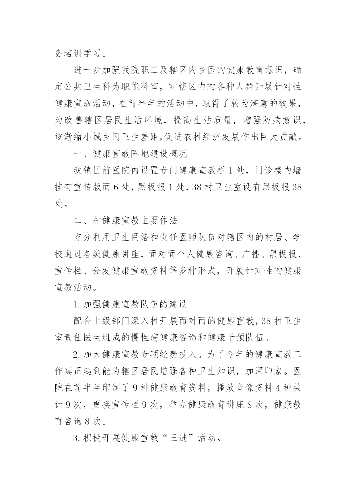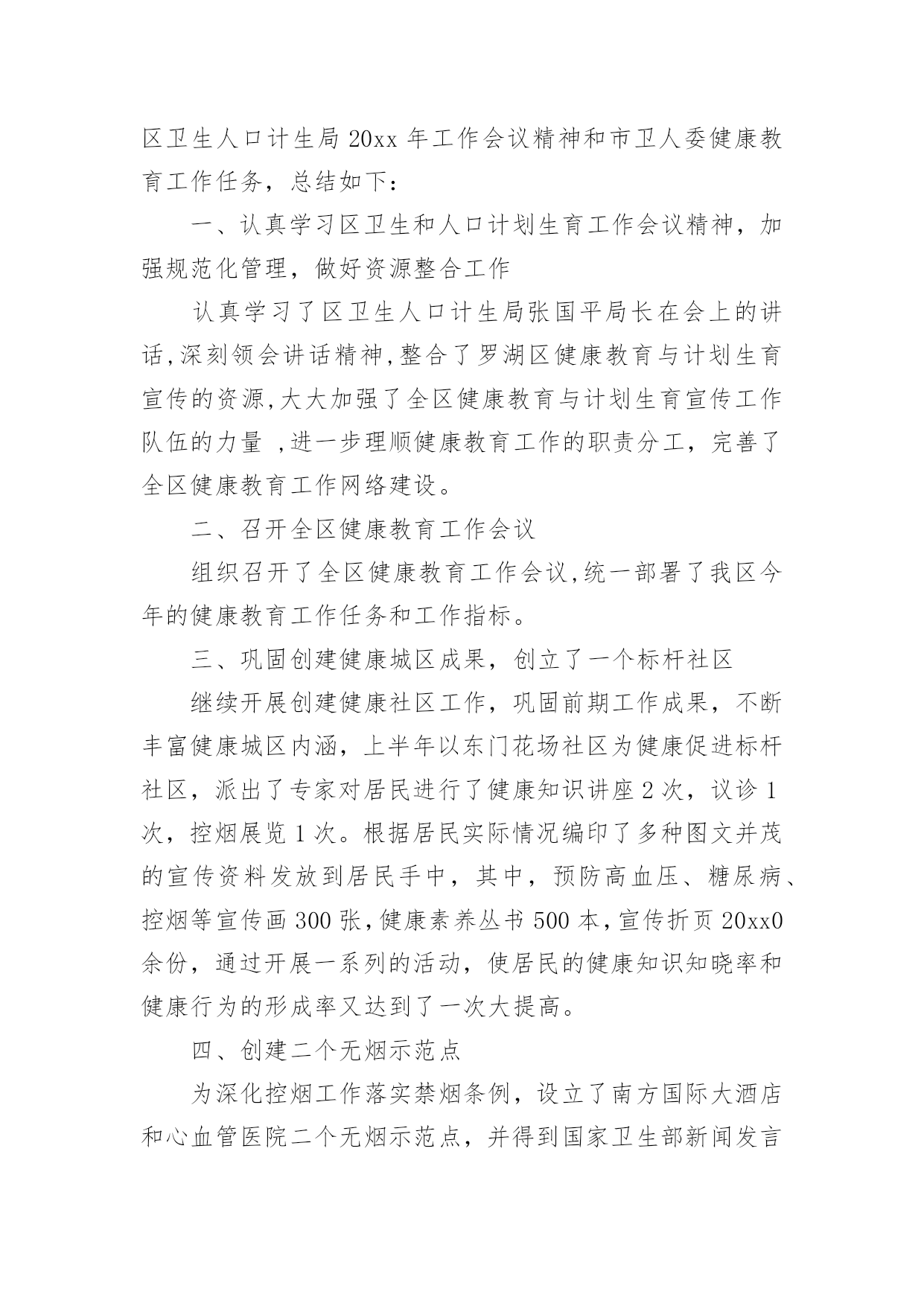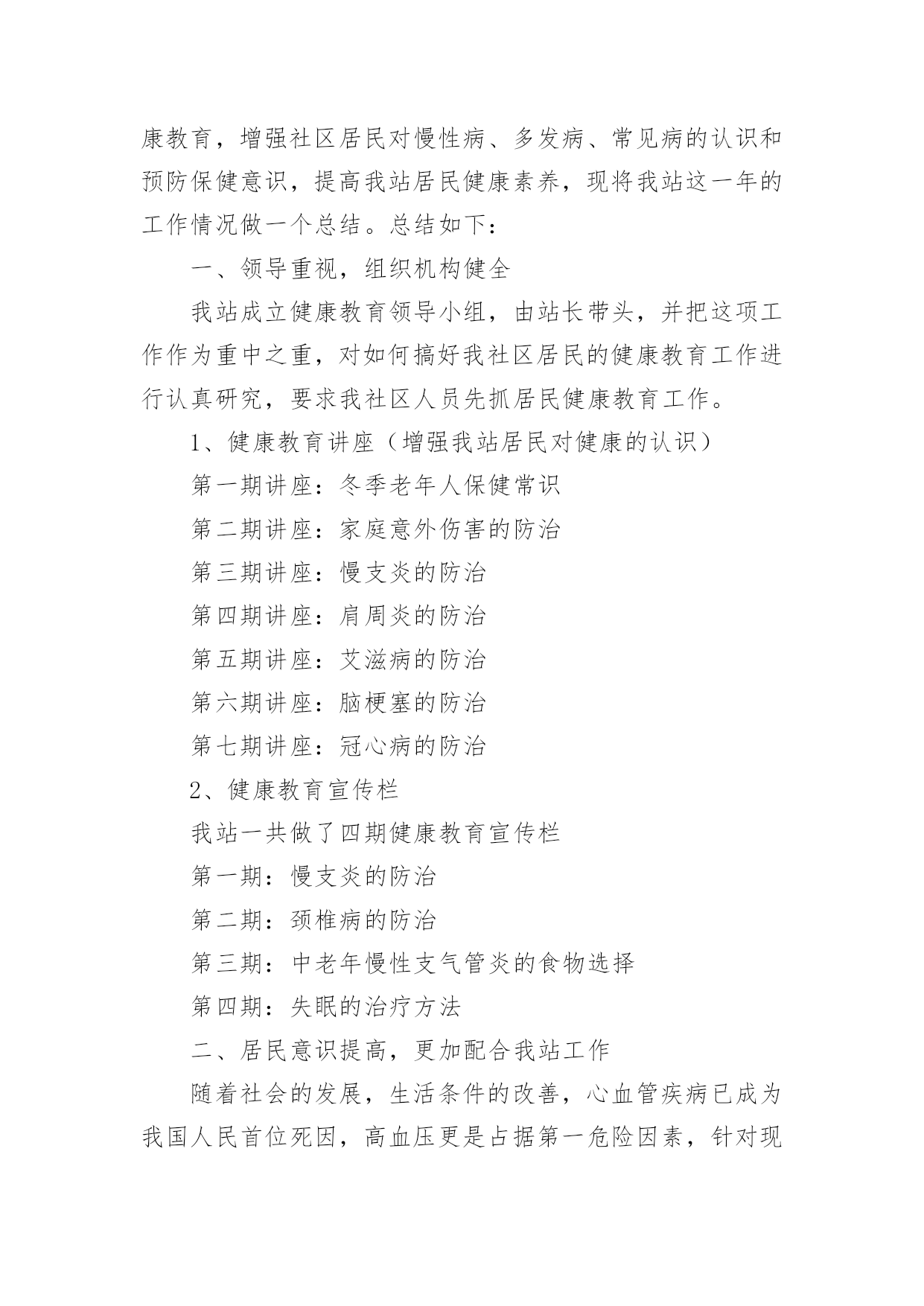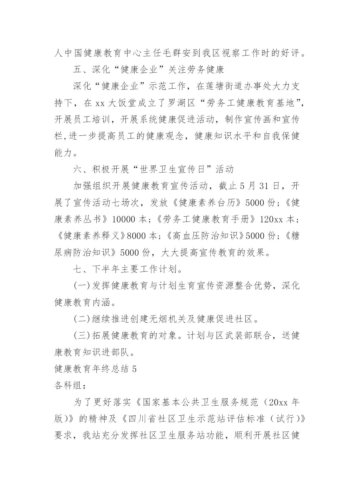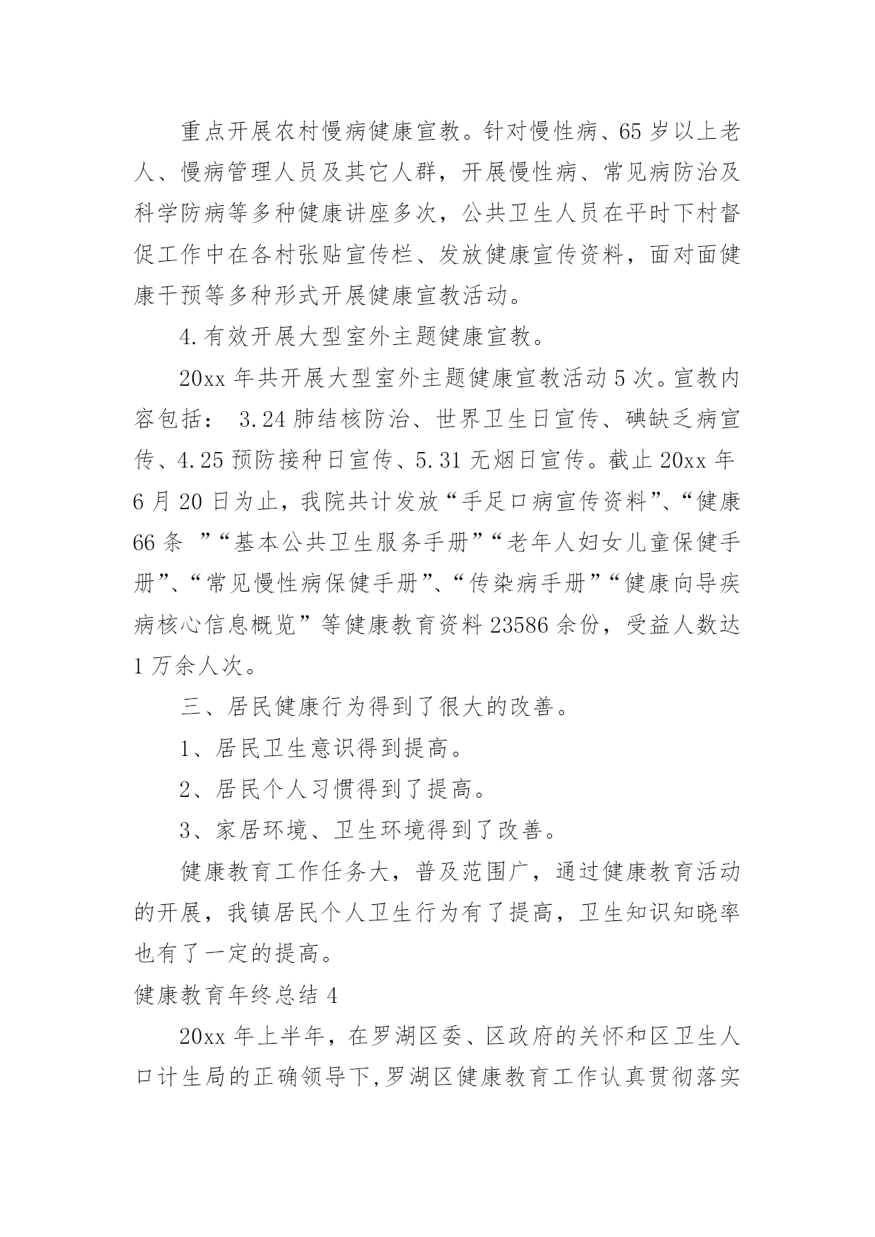 健康教育年终总结健康教育年终总结总结就是对一个时期的学习、工作或其完成情况进行一次全面系统的回顾和分析的书面材料,它能够使头脑更加清醒,目标更加明确,不如我们来制定一份总结吧。总结怎么写才不会流于形式呢?下面是小编精心整理的健康教育年终总结,仅供参考,欢迎大家阅读。健康教育年终总结1xxxx年,我局继续深化健康教育工作,切实将干部职工的健康教育工作纳入本局的目标管理,调整完善健康教育工作领导小组,拟定健康教育工作计划,在干部职工中普及健康知识,使该项工作取得了良好的成绩。一、高度重视,加强领导局领导历来十分重视健康教育工作,为认真实施健康教育工作,切实做好我区国家卫生城市复查工作,大队对原健康教育领导小组成员进行了调整,加强对健康教育工作的统一领导和安排部署,确保各项工作的组织实施和顺利落实。二、制定计划,落实责任根据东胜区爱卫办的有关文件精神,为加强我局干部职工的医疗卫生意识,普及健康保健知识,局健康领导小组制定了xxxx年健康教育工作计划,并以文件下发各大队各科室学习贯彻。同时向各部门提出了实施健康教育总的要求,安排了健康教育的工作任务,落实了责任和工作目标。认真组织各项活动,全年开展卫生评比活动四次、开展健康教育活动六次、健康教育宣传阵地六期。并按时向上级部门上报工作动态。三、广泛宣传,强化学习1.各大队各科室在职工中经常性地开展健康保健知识学习,提倡健康生活和健康行为,提倡戒烟少酒,减少疾病发生,保证执法队员的身心健康。与此同时,积极参加医疗保险等社会活动,为队员购买医疗保险,妥善处理好队员就医住院等突发性的问题。2.安排布置学习内容,并认真组织职工学习健康教育工作相关文件和资料。通过认真学习和了解,队员的健康意识有了大幅度的提高,同时普遍掌握了常见疾病的预防和救治方法,了解了常见疾病如高血压、冠心病、肝炎等的一般症状及日常生活中的保健知识,对各种疾病的发生前兆有了深刻认识。学习使广大职工形成了健康的生活方式、健康的行为习惯,没有发生一起严重传染性疾病。3.贯彻《中华人民共和国职业病防治法》等法律法规,对职工进行健康教育培训,减少和控制职业伤害、职业病及相关疾病发生。同时特别加强对女职工的保健教育。今年,我局把健康教育和各项工作有机结合,抓出了一定的成效。以人为本,关心队员的健康状况,为全局各项工作的顺利开展打下良好的基础。健康教育年终总结2为进一步推进全民健康促进行动,拓宽群众获得健康知识的途径,增强群众健康保健意识,提高广大干部群众健康生活方式行为形成率。按照《麒麟区创建国家卫生城市健康教育工作实施方案》要求,我镇以加强健康教育阵地建设和网络建设为主线,采取综合干预措施,全面加强健康宣教工作,主要做好以下工作。一、加强领导,建立健全健康教育网络我镇成立了健康教育工作领导小组,成员单位涵盖全镇各站所、各村(社区)、各企事业单位,领导小组定期召开会议研究部署全镇健康教育工作。各单位、各部门也相继成立了健康教育工作组织机构,做到有人员、有制度、有计划、有措施,健康教育网络建设进一步健全,健康教育工作稳步推进。二、明确职责,配足配齐健康教育设施设备镇政府下发了加强健康教育工作的实施意见,进一步明确了各单位、各部门健康教育工作职责,各单位、各村(社区)按要求配齐了健康教育工作所需设施设备,如电脑、投影仪、照相机等。全镇有健康教育服务所12个,健康教育活动室30个,健康教育宣传栏28块,健身广场15个,老年活动中心18个。三、开设健康讲堂,学校健康教育成效明显各中小学均设有健康教育专兼职人员,有领导分管,有开展健康教育工作所需的设施设备和场所,开设健康教育课达100%,注重培养学生养成良好的卫生行为,学生健康知识知晓率≥90%,健康生活方式与行为形成率≥80%。各学校健康教育开课率、课时、教材、师资、评价等资料整齐规范。四、医疗卫生健康教育走向常态化、规范化健康教育列入病区常规工作及整体护理措施,通过口头、文字、声像等形式向病人及家属开展入院、住院、出院健康教育,并积极参与社会性健康教育工作。镇卫生院及各卫生所门诊设立健康教育咨询台共计13个,设立不少于2平方米的健康教育宣传栏13块,全年更换健教宣教内容6期次。开展医务人员健康教育专业培训4次,培训覆盖率达90%以上,全年发放《麒麟卫生》、《三宝卫生》、健康折页、健教处方等健教资料13.6万份,开展健康讲座72期次,公众健康教育现场咨询活动12次,义诊8次,健康知识宣教覆盖全镇人口。五、村(社区)健康教育工作取得实效各村(社区)设有健康教育专兼职人员,有分管领导,成立了领导小组,形成健康教育网络,基层健康教育网络覆盖率达90%以上;各村(社区)定期入户上门发放健康教育宣传资料,结合社区实际,开展健身、文化娱乐、科普知识宣传等活动,举办社区健康教育知识讲座,开展健康教育问卷