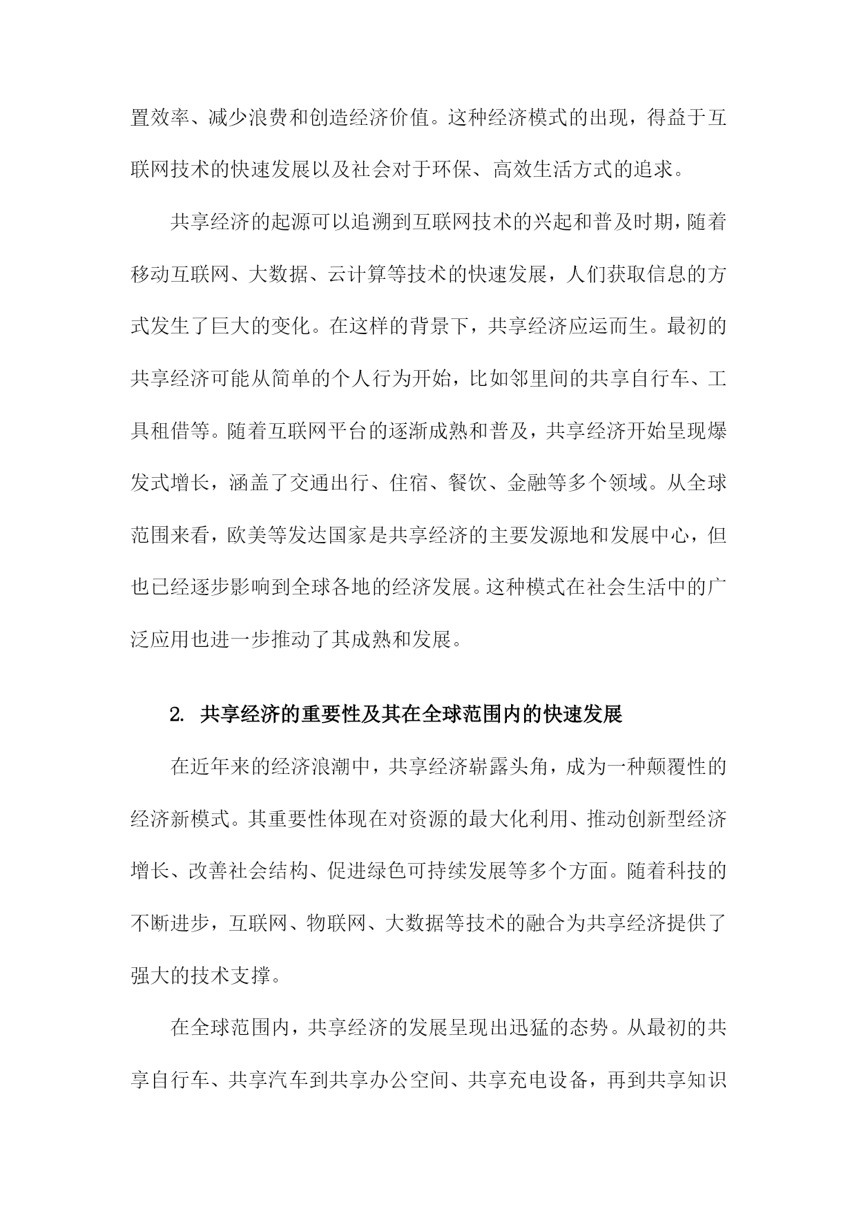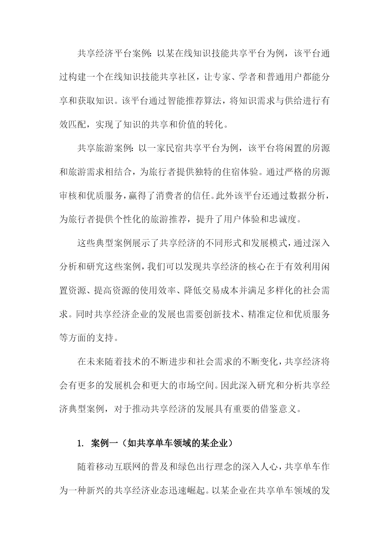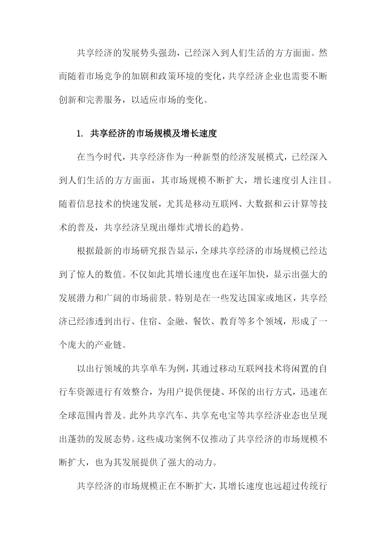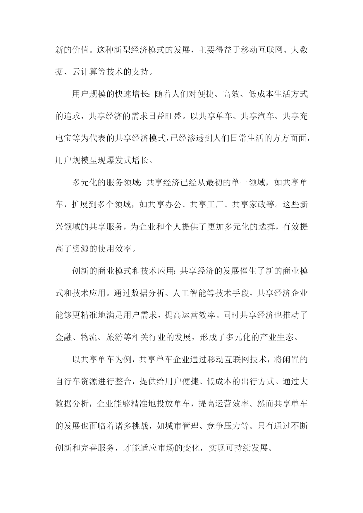 共享经济发展及典型案例分析一、简述随着信息技术的快速发展和普及,共享经济作为一种新型的经济模式在全球范围内迅速崛起。共享经济也被称为协作消费或合作消费,它主要依赖现代科技手段实现资源的快速匹配和优化配置,让闲置的物品或服务产生价值的同时,也为需求者带来便利。通过共享经济,人们能够更有效地利用资源,降低社会成本,提升经济效益。本文主要探讨了共享经济的发展现状、趋势及其典型案例分析。通过分析和研究,旨在为读者提供一个全面而深入的共享经济的理解与洞察。1.共享经济的概念及起源共享经济作为一种新型的经济模式,正逐步渗透到人们日常生活的各个领域。首先我们来探究一下共享经济的概念及其起源。共享经济简单来说,是一种以互联网技术为平台,通过整合和分享社会闲置资源,创造额外价值并为经济贡献新型价值的经济活动模式。在这一经济形态下,使用权的重要性被提升到了前所未有的高度,相较于传统的所有权观念,共享经济鼓励的是资源的共享与复用。从个人消费领域扩展至企业生产和服务等多个领域,共享经济呈现出极大的活力和潜力。其核心特点是有效利用社会存量资源、提升资源配置效率、减少浪费和创造经济价值。这种经济模式的出现,得益于互联网技术的快速发展以及社会对于环保、高效生活方式的追求。共享经济的起源可以追溯到互联网技术的兴起和普及时期,随着移动互联网、大数据、云计算等技术的快速发展,人们获取信息的方式发生了巨大的变化。在这样的背景下,共享经济应运而生。最初的共享经济可能从简单的个人行为开始,比如邻里间的共享自行车、工具租借等。随着互联网平台的逐渐成熟和普及,共享经济开始呈现爆发式增长,涵盖了交通出行、住宿、餐饮、金融等多个领域。从全球范围来看,欧美等发达国家是共享经济的主要发源地和发展中心,但也已经逐步影响到全球各地的经济发展。这种模式在社会生活中的广泛应用也进一步推动了其成熟和发展。2.共享经济的重要性及其在全球范围内的快速发展在近年来的经济浪潮中,共享经济崭露头角,成为一种颠覆性的经济新模式。其重要性体现在对资源的最大化利用、推动创新型经济增长、改善社会结构、促进绿色可持续发展等多个方面。随着科技的不断进步,互联网、物联网、大数据等技术的融合为共享经济提供了强大的技术支撑。在全球范围内,共享经济的发展呈现出迅猛的态势。从最初的共享自行车、共享汽车到共享办公空间、共享充电设备,再到共享知识技能等多元化领域,共享经济不断拓宽其边界。在全球范围内,各大城市的人们都在享受共享经济带来的便利,其在全球范围内的普及率和使用率持续上升。特别是在一些发达国家,共享经济已经成为一种新的生活方式,改变了人们对资源的传统依赖模式。人们不再需要拥有某些资源或服务,只需要通过互联网平台,便可以享受所需的资源和服务。同时共享经济也为创业者提供了新的机会,催生了大量的创新型企业和业务模式。在全球范围内,共享经济的迅速发展也引发了各种典型的案例分析。一些成功的企业在全球范围内取得了显著的成功,并在行业内树立了良好的标杆。通过对这些典型案例的分析,我们可以深入了解共享经济的发展趋势、面临的挑战以及未来的发展方向。共享经济的重要性及其在全球范围内的快速发展已经成为不可逆转的趋势。它不仅改变了人们的生活方式,也推动了全球经济的创新和发展。二、共享经济的发展随着数字化时代的来临,共享经济逐渐崭露头角,以其独特的优势在全球范围内迅速发展。共享经济是一种基于互联网技术的经济模式,它使得个人或组织能够共享他们的资源、服务或技能,从而创造新的价值。这种新型经济模式的发展,主要得益于移动互联网、大数据、云计算等技术的支持。用户规模的快速增长:随着人们对便捷、高效、低成本生活方式的追求,共享经济的需求日益旺盛。以共享单车、共享汽车、共享充电宝等为代表的共享经济模式,已经渗透到人们日常生活的方方面面,用户规模呈现爆发式增长。多元化的服务领域:共享经济已经从最初的单一领域,如共享单车,扩展到多个领域,如共享办公、共享工厂、共享家政等。这些新兴领域的共享服务,为企业和个人提供了更加多元化的选择,有效提高了资源的使用效率。创新的商业模式和技术应用:共享经济的发展催生了新的商业模式和技术应用。通过数据分析、人工智能等技术手段,共享经济企业能够更精准地满足用户需求,提高运营效率。同时共享经济也推动了金融、物流、旅游等相关行业的发展,形成了多元化的产业生态。以共享单车为例,共享单车企业通过移动互联网技术,将闲置的自行车资源进行整合,提供给用户便捷、低成本的出行方式。通过大数据分析,企业能够精准地投放单车,提高运营效率。然而共享单车的发展也面临着诸多挑战,如城市管理、竞争压力等。只有通过不断创新和完善服务,才能适应市场的变化,实现可持续发展。共享经济的发展势头强劲,已经深入到人们生活的方方面面。