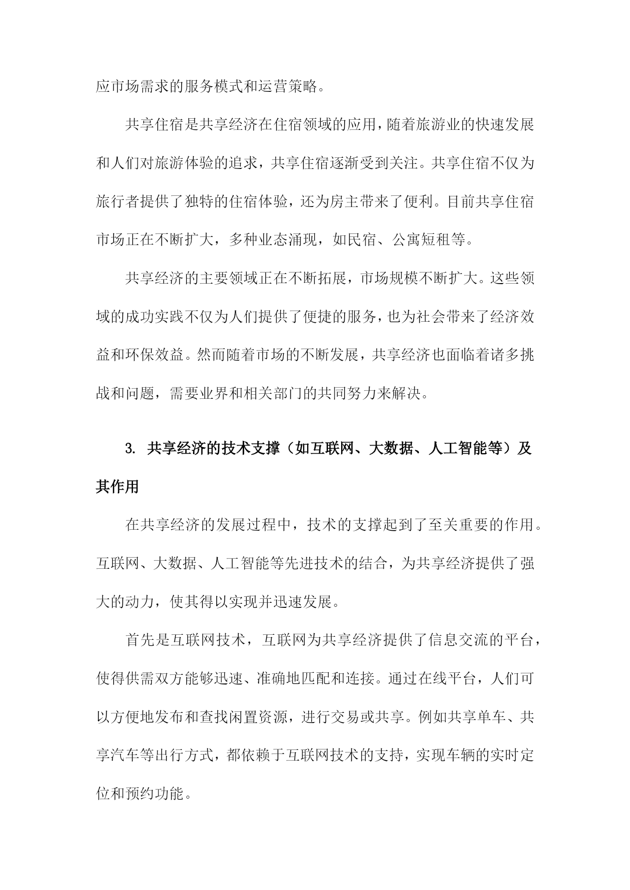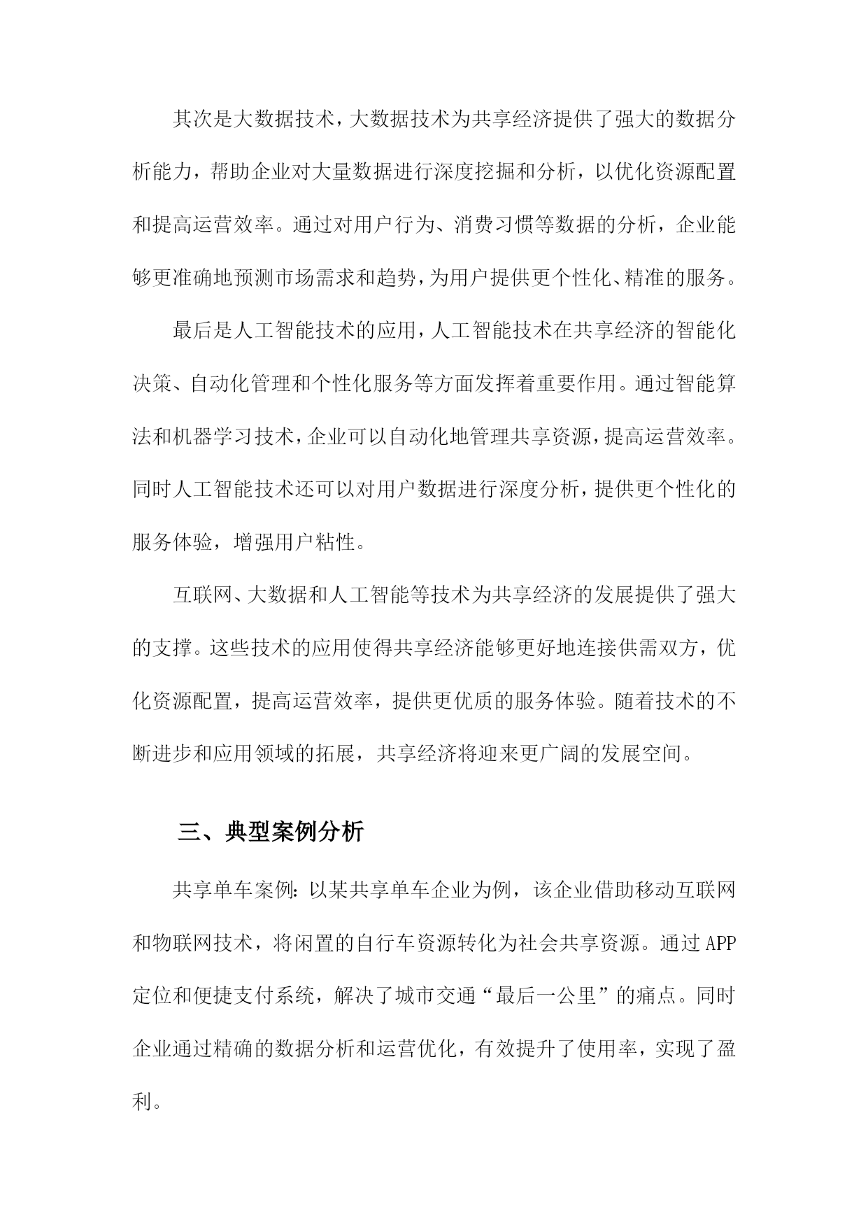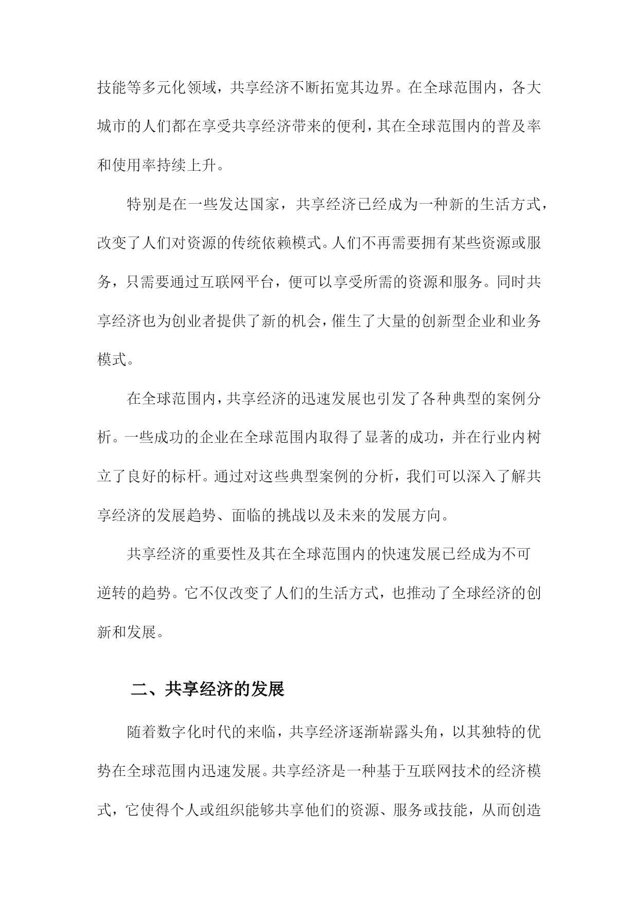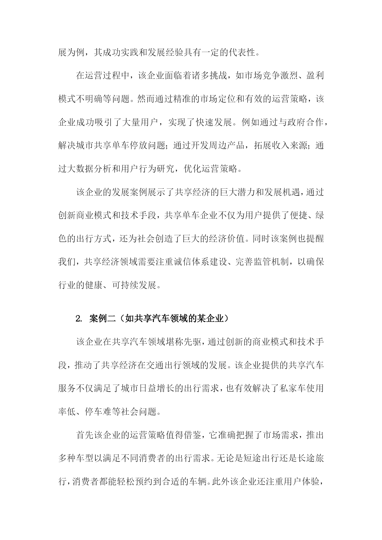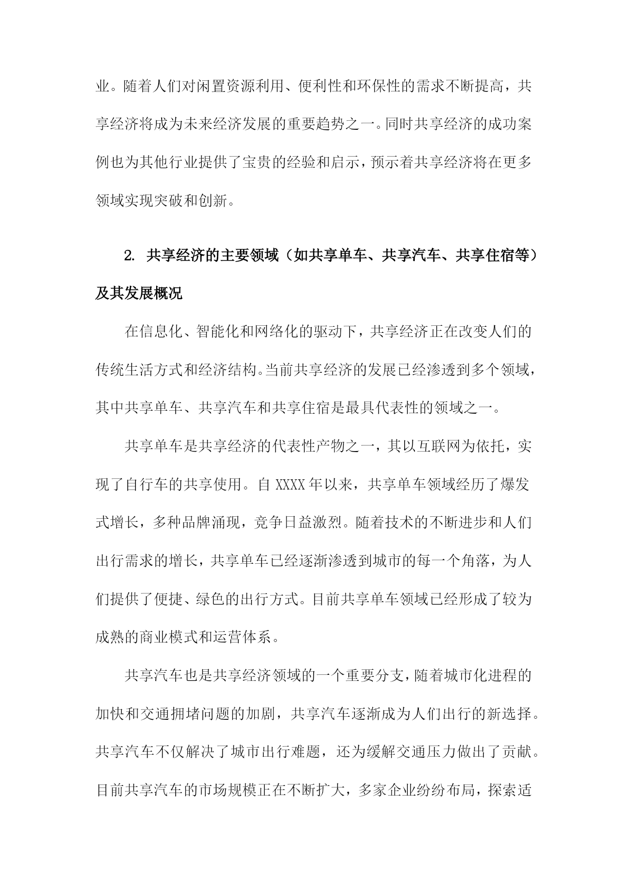 共享经济发展及典型案例分析一、简述随着信息技术的快速发展和普及,共享经济作为一种新型的经济模式在全球范围内迅速崛起。共享经济也被称为协作消费或合作消费,它主要依赖现代科技手段实现资源的快速匹配和优化配置,让闲置的物品或服务产生价值的同时,也为需求者带来便利。通过共享经济,人们能够更有效地利用资源,降低社会成本,提升经济效益。本文主要探讨了共享经济的发展现状、趋势及其典型案例分析。通过分析和研究,旨在为读者提供一个全面而深入的共享经济的理解与洞察。1.共享经济的概念及起源共享经济作为一种新型的经济模式,正逐步渗透到人们日常生活的各个领域。首先我们来探究一下共享经济的概念及其起源。共享经济简单来说,是一种以互联网技术为平台,通过整合和分享社会闲置资源,创造额外价值并为经济贡献新型价值的经济活动模式。在这一经济形态下,使用权的重要性被提升到了前所未有的高度,相较于传统的所有权观念,共享经济鼓励的是资源的共享与复用。从个人消费领域扩展至企业生产和服务等多个领域,共享经济呈现出极大的活力和潜力。其核心特点是有效利用社会存量资源、提升资源配置效率、减少浪费和创造经济价值。这种经济模式的出现,得益于互联网技术的快速发展以及社会对于环保、高效生活方式的追求。共享经济的起源可以追溯到互联网技术的兴起和普及时期,随着移动互联网、大数据、云计算等技术的快速发展,人们获取信息的方式发生了巨大的变化。在这样的背景下,共享经济应运而生。最初的共享经济可能从简单的个人行为开始,比如邻里间的共享自行车、工具租借等。随着互联网平台的逐渐成熟和普及,共享经济开始呈现爆发式增长,涵盖了交通出行、住宿、餐饮、金融等多个领域。从全球范围来看,欧美等发达国家是共享经济的主要发源地和发展中心,但也已经逐步影响到全球各地的经济发展。这种模式在社会生活中的广泛应用也进一步推动了其成熟和发展。2.共享经济的重要性及其在全球范围内的快速发展在近年来的经济浪潮中,共享经济崭露头角,成为一种颠覆性的经济新模式。其重要性体现在对资源的最大化利用、推动创新型经济增长、改善社会结构、促进绿色可持续发展等多个方面。随着科技的不断进步,互联网、物联网、大数据等技术的融合为共享经济提供了强大的技术支撑。在全球范围内,共享经济的发展呈现出迅猛的态势。从最初的共享自行车、共享汽车到共享办公空间、共享充电设备,再到共享知识技能等多元化领域,共享经济不断拓宽其边界。在全球范围内,各大城市的人们都在享受共享经济带来的便利,其在全球范围内的普及率和使用率持续上升。特别是在一些发达国家,共享经济已经成为一种新的生活方式,改变了人们对资源的传统依赖模式。人们不再需要拥有某些资源或服务,只需要通过互联网平台,便可以享受所需的资源和服务。同时共享经济也为创业者提供了新的机会,催生了大量的创新型企业和业务模式。在全球范围内,共享经济的迅速发展也引发了各种典型的案例分析。一些成功的企业在全球范围内取得了显著的成功,并在行业内树立了良好的标杆。通过对这些典型案例的分析,我们可以深入了解共享经济的发展趋势、面临的挑战以及未来的发展方向。共享经济的重要性及其在全球范围内的快速发展已经成为不可逆转的趋势。它不仅改变了人们的生活方式,也推动了全球经济的创新和发展。二、共享经济的发展随着数字化时代的来临,共享经济逐渐崭露头角,以其独特的优势在全球范围内迅速发展。共享经济是一种基于互联网技术的经济模式,它使得个人或组织能够共享他们的资源、服务或技能,从而创造新的价值。这种新型经济模式的发展,主要得益于移动互联网、大数据、云计算等技术的支持。用户规模的快速增长:随着人们对便捷、高效、低成本生活方式的追求,共享经济的需求日益旺盛。以共享单车、共享汽车、共享充电宝等为代表的共享经济模式,已经渗透到人们日常生活的方方面面,用户规模呈现爆发式增长。多元化的服务领域:共享经济已经从最初的单一领域,如共享单车,扩展到多个领域,如共享办公、共享工厂、共享家政等。这些新兴领域的共享服务,为企业和个人提供了更加多元化的选择,有效提高了资源的使用效率。创新的商业模式和技术应用:共享经济的发展催生了新的商业模式和技术应用。通过数据分析、人工智能等技术手段,共享经济企业能够更精准地满足用户需求,提高运营效率。同时共享经济也推动了金融、物流、旅游等相关行业的发展,形成了多元化的产业生态。以共享单车为例,共享单车企业通过移动互联网技术,将闲置的自行车资源进行整合,提供给用户便捷、低成本的出行方式。通过大数据分析,企业能够精准地投放单车,提高运营效率。然而共享单车的发展也面临着诸多挑战,如城市管理、竞争压力等。只有通过不断创新和完善服务,才能适应市场的变化,实现可持续发展。共享经济的发展势头强劲,已经深入到人们生活的方方面面。
