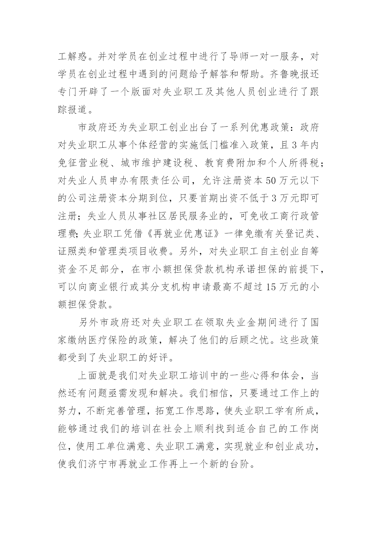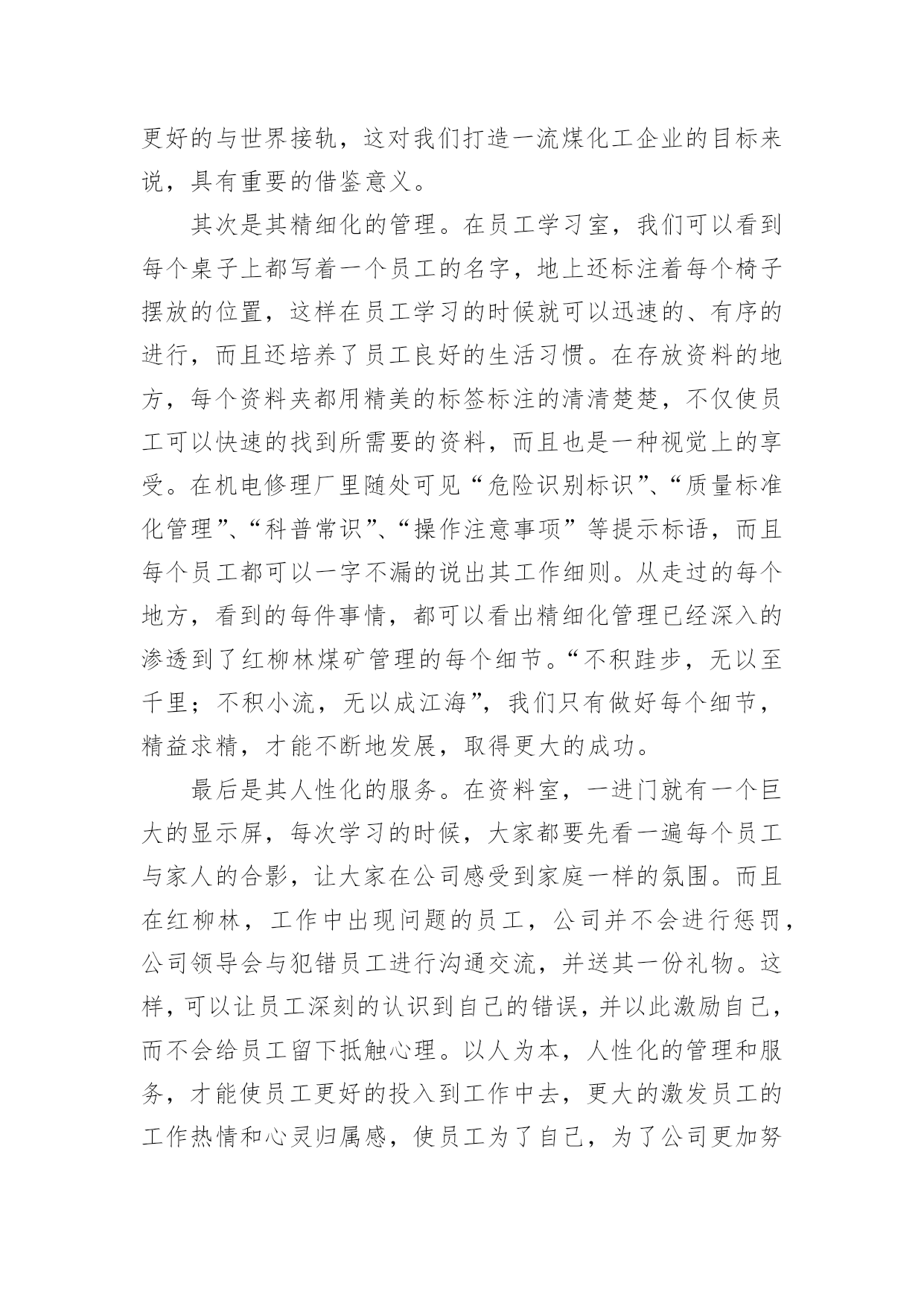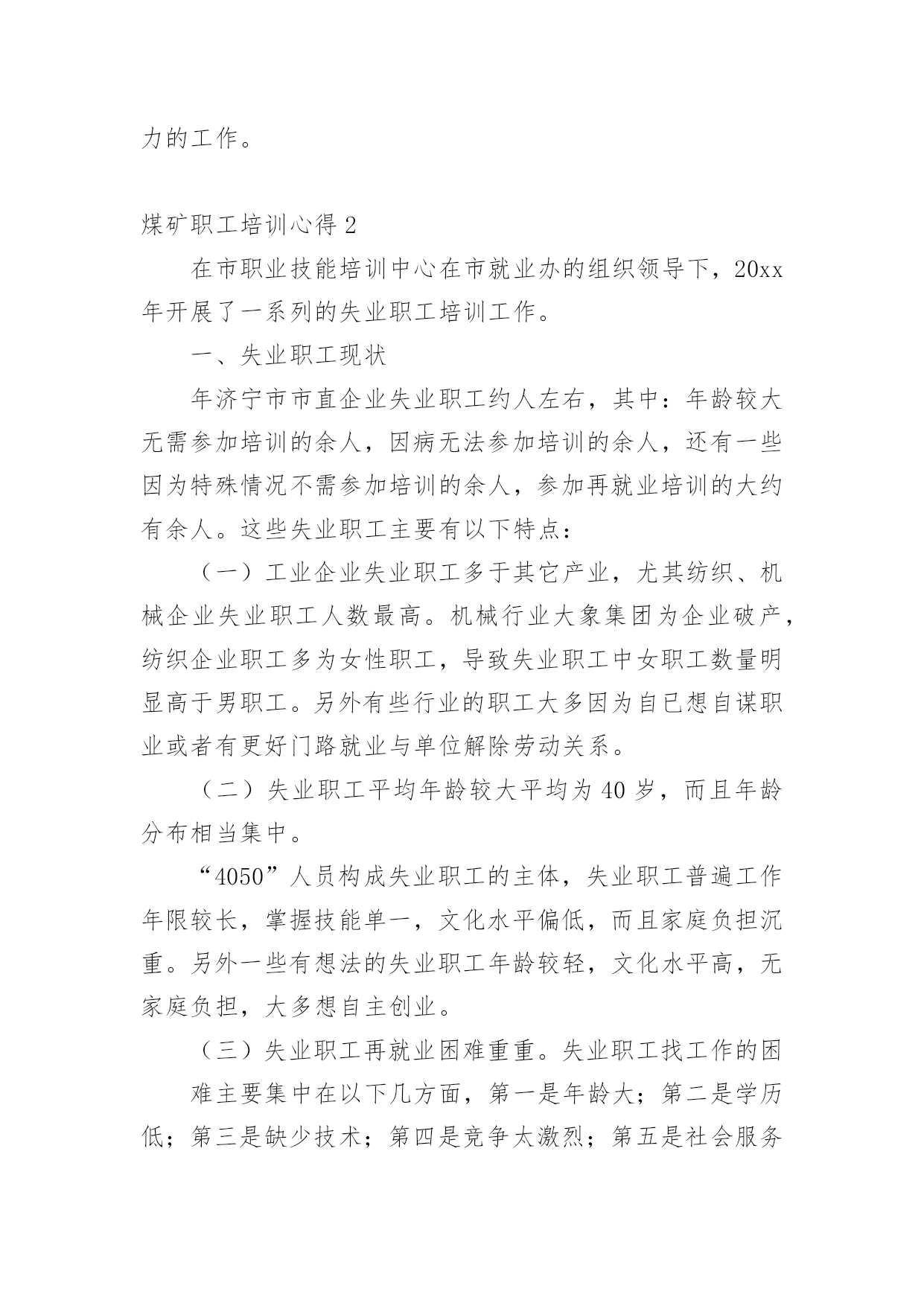 煤矿职工培训心得煤矿职工培训心得[实用]我们得到了一些心得体会以后,将其记录在心得体会里,让自己铭记于心,这样可以帮助我们分析出现问题的原因,从而找出解决问题的办法。那么要如何写呢?以下是小编为大家收集的煤矿职工培训心得,希望能够帮助到大家。煤矿职工培训心得110月30日早晨,在公司的组织下,我们一行30多人带着好奇和兴奋的心情来到陕煤集团神南红柳林矿业公司进行参观学习。虽然在红柳林煤矿只是待了短短的一个上午,但它带给我的惊奇和震撼却是前所未有的。首先是其专业化的队伍。刚进红柳林煤矿的大门,就可以看到一个个工作人员指挥着进出入的车辆,那专业的动作,简直可以与真正的交警媲美。在调度室,一排排的监控录像可以完整地观察到公司的每个角落,无论哪里出现问题,都可以及时的发现并解决问题。在机电修理厂,我们还现场观看了煤矿工作人员的技术表演,包括鸡蛋扩孔技术以及叉车“穿针引线”操作演示等,其高超、熟练的技术令人叹为观止。从红柳林的每个地方,每个工作人员,我们都可以看到、感受到其专业化的职业素养。在这里,我明白了为什么红柳林煤矿可以成为行业内的`标杆企业,为什么红柳林煤矿能不断地发展、壮大。只有专业化才能创造更大的价值,才能更好的与世界接轨,这对我们打造一流煤化工企业的目标来说,具有重要的借鉴意义。其次是其精细化的管理。在员工学习室,我们可以看到每个桌子上都写着一个员工的名字,地上还标注着每个椅子摆放的位置,这样在员工学习的时候就可以迅速的、有序的进行,而且还培养了员工良好的生活习惯。在存放资料的地方,每个资料夹都用精美的标签标注的清清楚楚,不仅使员工可以快速的找到所需要的资料,而且也是一种视觉上的享受。在机电修理厂里随处可见“危险识别标识”、“质量标准化管理”、“科普常识”、“操作注意事项”等提示标语,而且每个员工都可以一字不漏的说出其工作细则。从走过的每个地方,看到的每件事情,都可以看出精细化管理已经深入的渗透到了红柳林煤矿管理的每个细节。“不积跬步,无以至千里;不积小流,无以成江海”,我们只有做好每个细节,精益求精,才能不断地发展,取得更大的成功。最后是其人性化的服务。在资料室,一进门就有一个巨大的显示屏,每次学习的时候,大家都要先看一遍每个员工与家人的合影,让大家在公司感受到家庭一样的氛围。而且在红柳林,工作中出现问题的员工,公司并不会进行惩罚,公司领导会与犯错员工进行沟通交流,并送其一份礼物。这样,可以让员工深刻的认识到自己的错误,并以此激励自己,而不会给员工留下抵触心理。以人为本,人性化的管理和服务,才能使员工更好的投入到工作中去,更大的激发员工的工作热情和心灵归属感,使员工为了自己,为了公司更加努力的工作。煤矿职工培训心得2在市职业技能培训中心在市就业办的组织领导下,20xx年开展了一系列的失业职工培训工作。一、失业职工现状年济宁市市直企业失业职工约人左右,其中:年龄较大无需参加培训的余人,因病无法参加培训的余人,还有一些因为特殊情况不需参加培训的余人,参加再就业培训的大约有余人。这些失业职工主要有以下特点:(一)工业企业失业职工多于其它产业,尤其纺织、机械企业失业职工人数最高。机械行业大象集团为企业破产,纺织企业职工多为女性职工,导致失业职工中女职工数量明显高于男职工。另外有些行业的职工大多因为自已想自谋职业或者有更好门路就业与单位解除劳动关系。(二)失业职工平均年龄较大平均为40岁,而且年龄分布相当集中。“4050”人员构成失业职工的主体,失业职工普遍工作年限较长,掌握技能单一,文化水平偏低,而且家庭负担沉重。另外一些有想法的失业职工年龄较轻,文化水平高,无家庭负担,大多想自主创业。(三)失业职工再就业困难重重。失业职工找工作的困难主要集中在以下几方面,第一是年龄大;第二是学历低;第三是缺少技术;第四是竞争太激烈;第五是社会服务跟不上;最后是就业观念影响。通过座谈和调查,我们发现失业职工失业后,70%的失业职工都积极的寻找工作,期望通过自身努力解决生活上的困难和问题,只有30%的失业职工因为年龄偏大或照顾家庭等原因没有找工作。失业职工即使是找到工作,也很不稳定。经调查显示从失业至今始终在同一个地方工作的人不太多,只占15%,大部份人长期变更工作地点,究其原因:有46%的人因学历和年龄不适而被迫离开;有28%的人因工资太低不愿干;有11%的人因不签而离开;第四,有8%的人因劳动条件太差离开;第五,有7%的人因其他原因而离开。(四)失业职工对就业服务工作的评价1、对各再就业服务机构的工作大部分失业职工表示较好。大多数人愿意参加再就业培训机构组织的失业职工再就业培训,但时间不能保证,有的怕耽误好不容易找到的工作,有的又觉得培训内容不是很适用。2、失业职工对于失业救济金的发放工作非常满意。调查到的所有失业职工基本生活保障费全部按