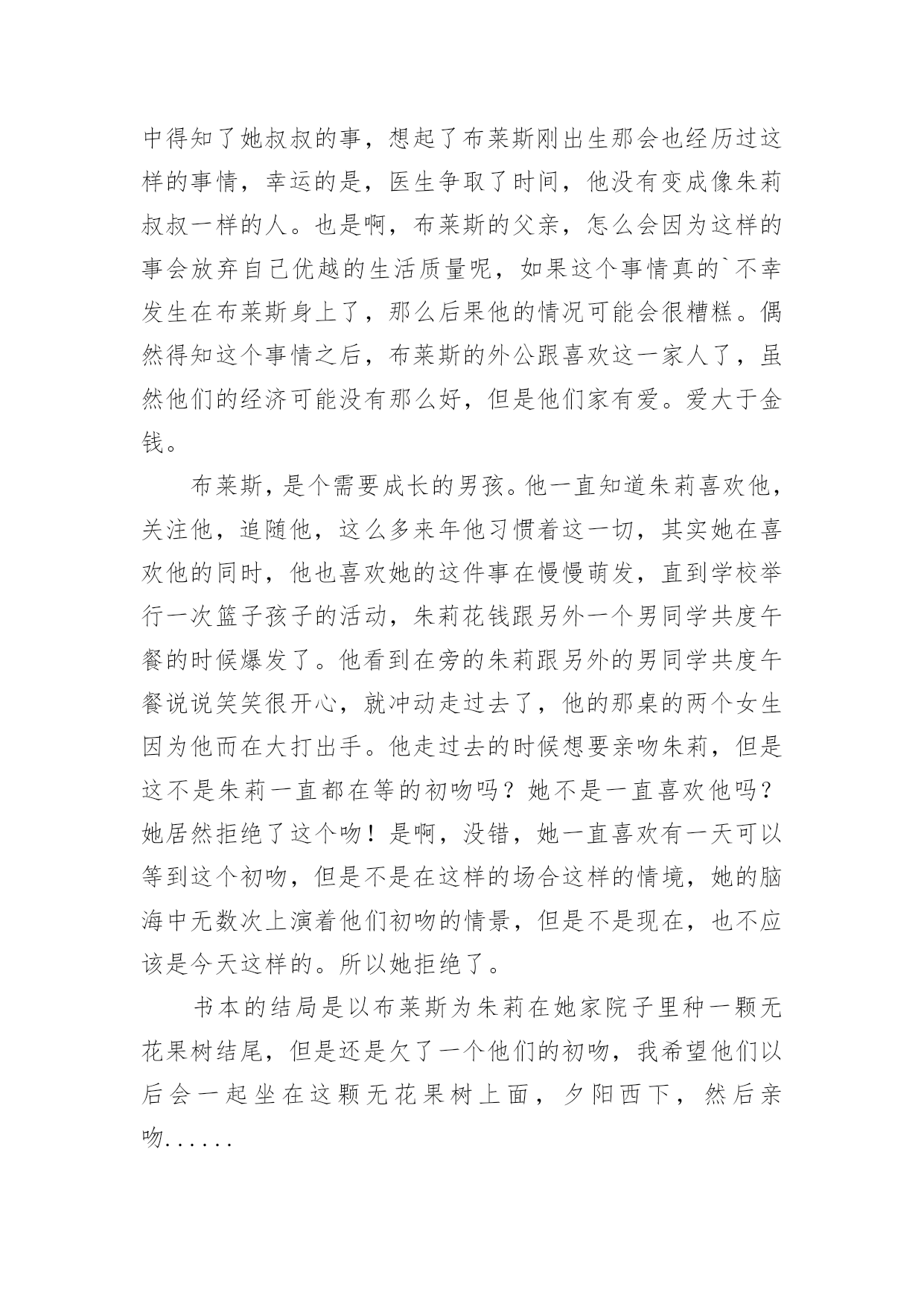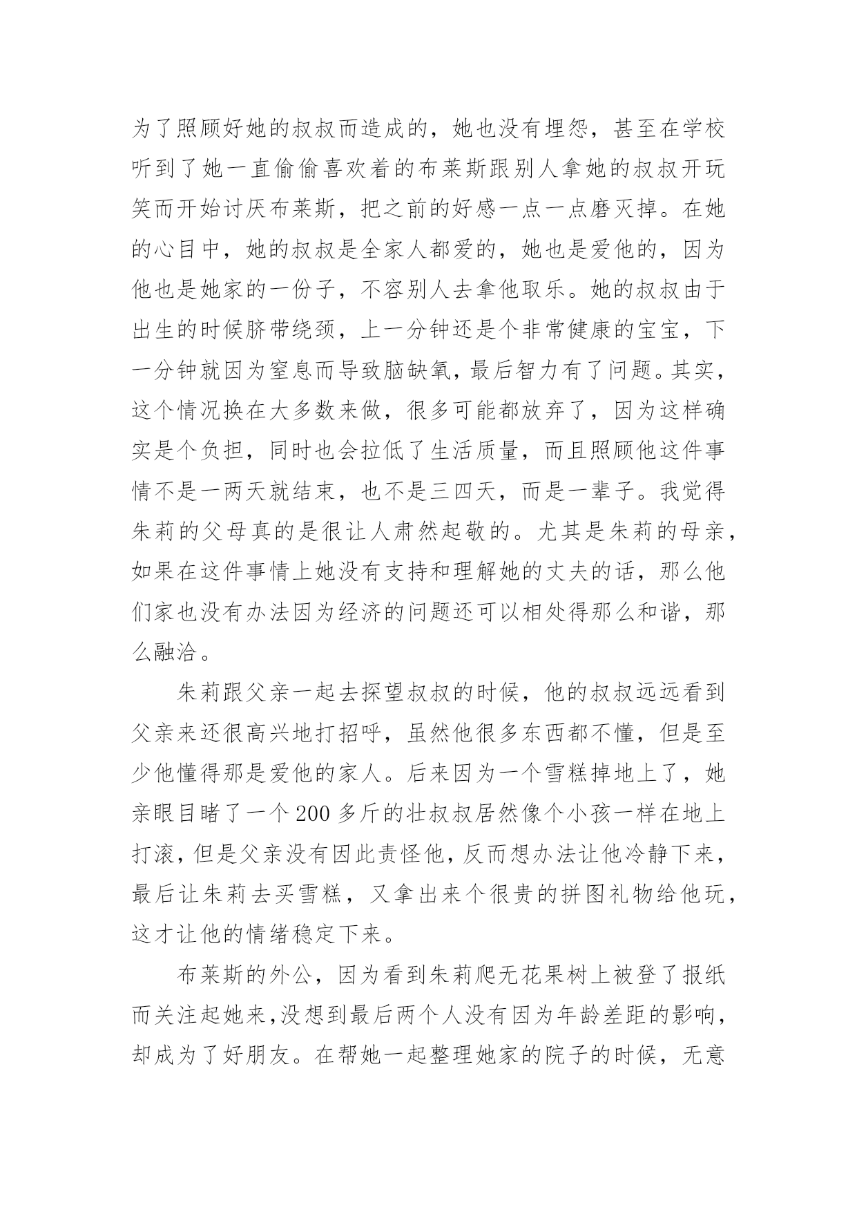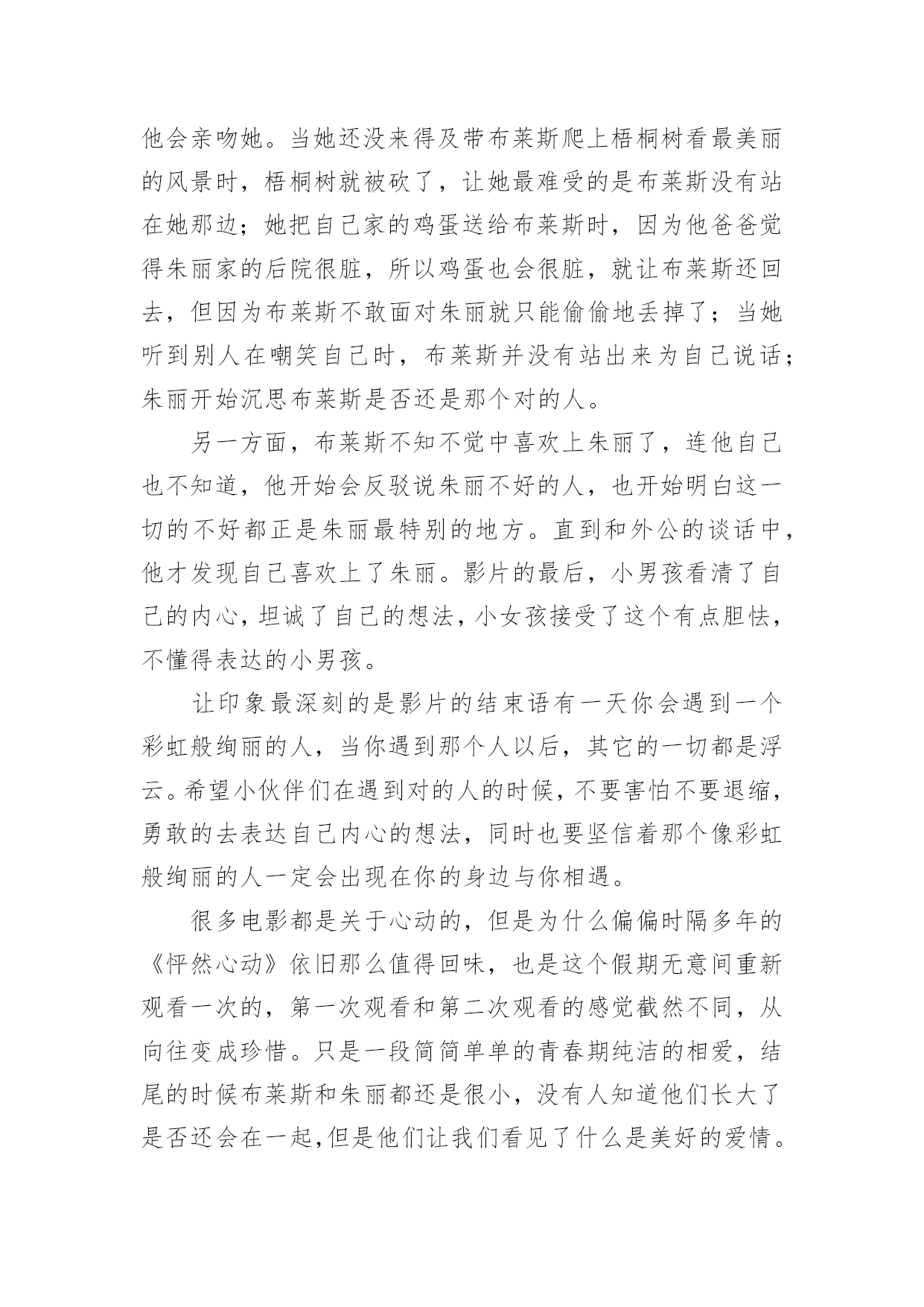 《怦然心动》观后感《怦然心动》观后感[荐]看完某一作品后,一定对生活有了新的感悟和看法吧,是时候静下心来好好写写观后感了。到底应如何写观后感呢?下面是小编精心整理的《怦然心动》观后感,希望能够帮助到大家。《怦然心动》观后感篇1刚刚阅读完一本书,名字叫《怦然心动》,这本书也被拍成了同名电影。纯真年代的单纯小美好,真的让人觉得世界真的很美好。很喜欢朱莉,是个很勇敢很能干很善良很单纯的小女孩。小孩子的世界,对金钱没什么概念,当她发现她的家是租回来的时候,除了惊讶之外,她还做出了个惊人的举动,动手把自己的院子的大整改。然而她的父亲告诉她,当时是房东承诺好要打理好院子的,可是这么多年房东却没有信守诺言,她的父亲认为房子是租回来的,院子的打理不在他们的义务范围之内。但是朱莉坚信,房子是租回来的,但是生活不是。是啊,在她心目中,这个房子早已经是她的家了,虽然现在才知道是租回来的。但是她并没有因此而抱怨,拿起工具就开始动手了。有一天她发现她的家里经济那么拮据是因为他的父亲为了照顾好她的叔叔而造成的,她也没有埋怨,甚至在学校听到了她一直偷偷喜欢着的布莱斯跟别人拿她的叔叔开玩笑而开始讨厌布莱斯,把之前的好感一点一点磨灭掉。在她的心目中,她的叔叔是全家人都爱的,她也是爱他的,因为他也是她家的一份子,不容别人去拿他取乐。她的叔叔由于出生的时候脐带绕颈,上一分钟还是个非常健康的宝宝,下一分钟就因为窒息而导致脑缺氧,最后智力有了问题。其实,这个情况换在大多数来做,很多可能都放弃了,因为这样确实是个负担,同时也会拉低了生活质量,而且照顾他这件事情不是一两天就结束,也不是三四天,而是一辈子。我觉得朱莉的父母真的是很让人肃然起敬的。尤其是朱莉的母亲,如果在这件事情上她没有支持和理解她的丈夫的话,那么他们家也没有办法因为经济的问题还可以相处得那么和谐,那么融洽。朱莉跟父亲一起去探望叔叔的时候,他的叔叔远远看到父亲来还很高兴地打招呼,虽然他很多东西都不懂,但是至少他懂得那是爱他的家人。后来因为一个雪糕掉地上了,她亲眼目睹了一个200多斤的壮叔叔居然像个小孩一样在地上打滚,但是父亲没有因此责怪他,反而想办法让他冷静下来,最后让朱莉去买雪糕,又拿出来个很贵的拼图礼物给他玩,这才让他的情绪稳定下来。布莱斯的外公,因为看到朱莉爬无花果树上被登了报纸而关注起她来,没想到最后两个人没有因为年龄差距的影响,却成为了好朋友。在帮她一起整理她家的院子的时候,无意中得知了她叔叔的事,想起了布莱斯刚出生那会也经历过这样的事情,幸运的是,医生争取了时间,他没有变成像朱莉叔叔一样的人。也是啊,布莱斯的父亲,怎么会因为这样的事会放弃自己优越的生活质量呢,如果这个事情真的`不幸发生在布莱斯身上了,那么后果他的情况可能会很糟糕。偶然得知这个事情之后,布莱斯的外公跟喜欢这一家人了,虽然他们的经济可能没有那么好,但是他们家有爱。爱大于金钱。布莱斯,是个需要成长的男孩。他一直知道朱莉喜欢他,关注他,追随他,这么多来年他习惯着这一切,其实她在喜欢他的同时,他也喜欢她的这件事在慢慢萌发,直到学校举行一次篮子孩子的活动,朱莉花钱跟另外一个男同学共度午餐的时候爆发了。他看到在旁的朱莉跟另外的男同学共度午餐说说笑笑很开心,就冲动走过去了,他的那桌的两个女生因为他而在大打出手。他走过去的时候想要亲吻朱莉,但是这不是朱莉一直都在等的初吻吗?她不是一直喜欢他吗?她居然拒绝了这个吻!是啊,没错,她一直喜欢有一天可以等到这个初吻,但是不是在这样的场合这样的情境,她的脑海中无数次上演着他们初吻的情景,但是不是现在,也不应该是今天这样的。所以她拒绝了。书本的结局是以布莱斯为朱莉在她家院子里种一颗无花果树结尾,但是还是欠了一个他们的初吻,我希望他们以后会一起坐在这颗无花果树上面,夕阳西下,然后亲吻......《怦然心动》观后感篇2看过的电影虽不甚多,但《怦然心动》,是迄今为止唯一一部让我百看不厌的影片。具体也说不上哪里吸引着我,但每每看完一遍,便会触及内心深处!影片是由罗伯·莱纳执导,主要讲的是一个初恋的故事,一开始女主朱莉对男主布莱恩一见倾心,怦然心动,之后以自己的方式默默地散发着爱意的光芒。而布莱恩起初对朱莉是害怕和厌恶的,而后渐渐的被她的光芒所吸引,最后也发现了自己内心深处对朱莉的感情,正如初恋般小心翼翼,又甜蜜悠长。有人拿《怦然心动》与中国的《山楂树之恋》做对比,两者有异曲同工之妙,但我觉得怦然心动更甚一筹,影片虽故事简单但内涵丰富,主讲两小无猜的初恋,但也讲了追求自己的梦想,尊重,勤劳,怎么看待贫穷,怎么接纳残障的家人,怎么维护自己的自尊等。在这个随口说爱的时代,爱情片更是层出不穷。爱情的美好在于其青涩、美好、懵懂。而银幕上至死不渝的爱情,大多剧本情节都是极其浮夸且不切实际的,像是温室里的花朵,是避开现实风雨的人