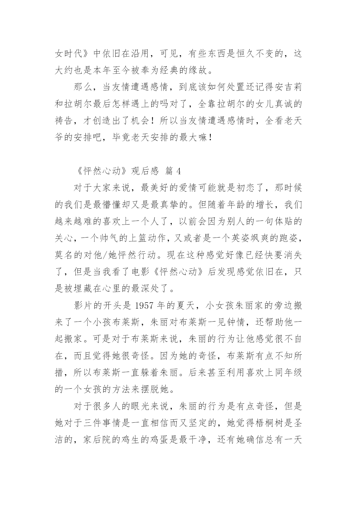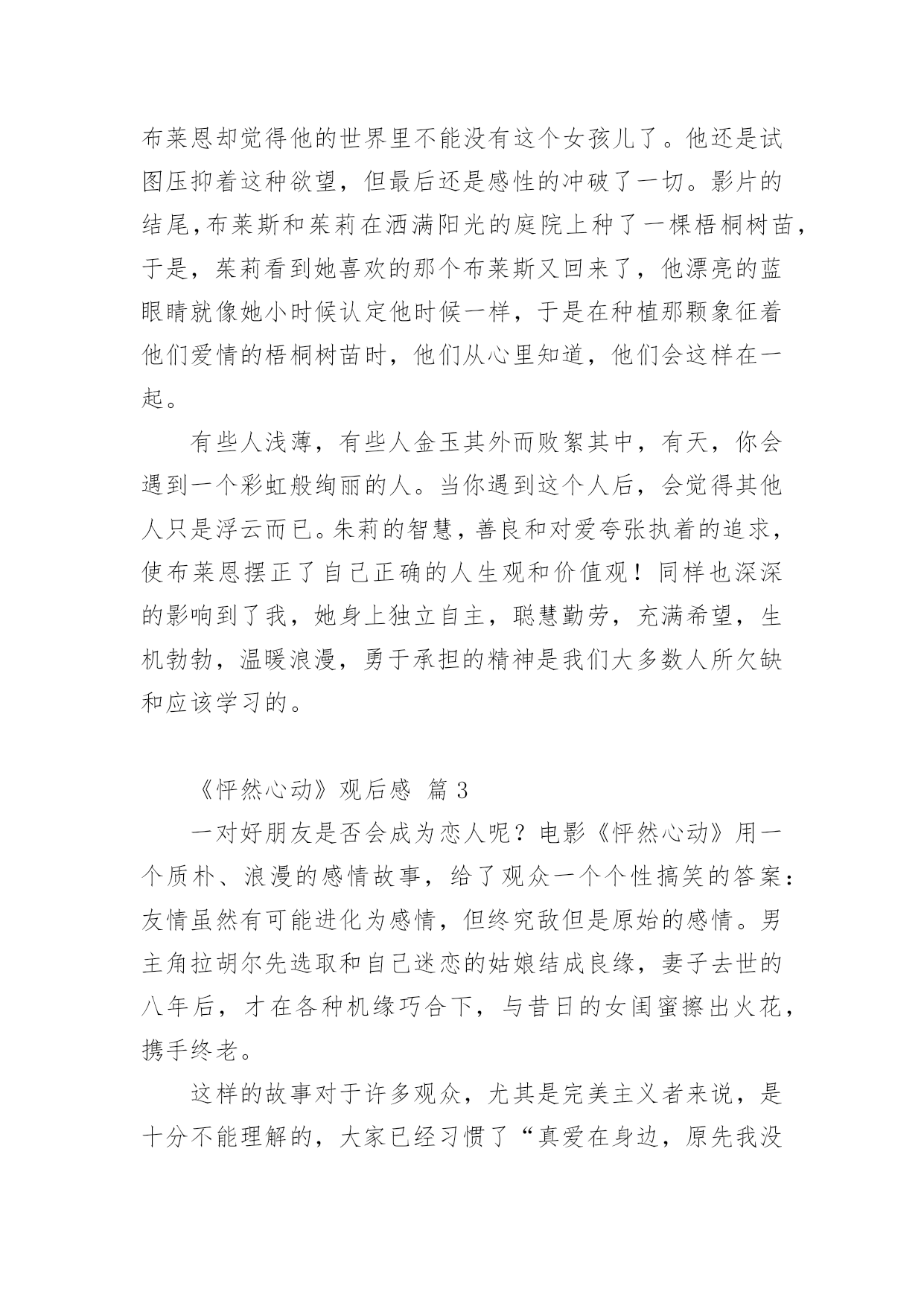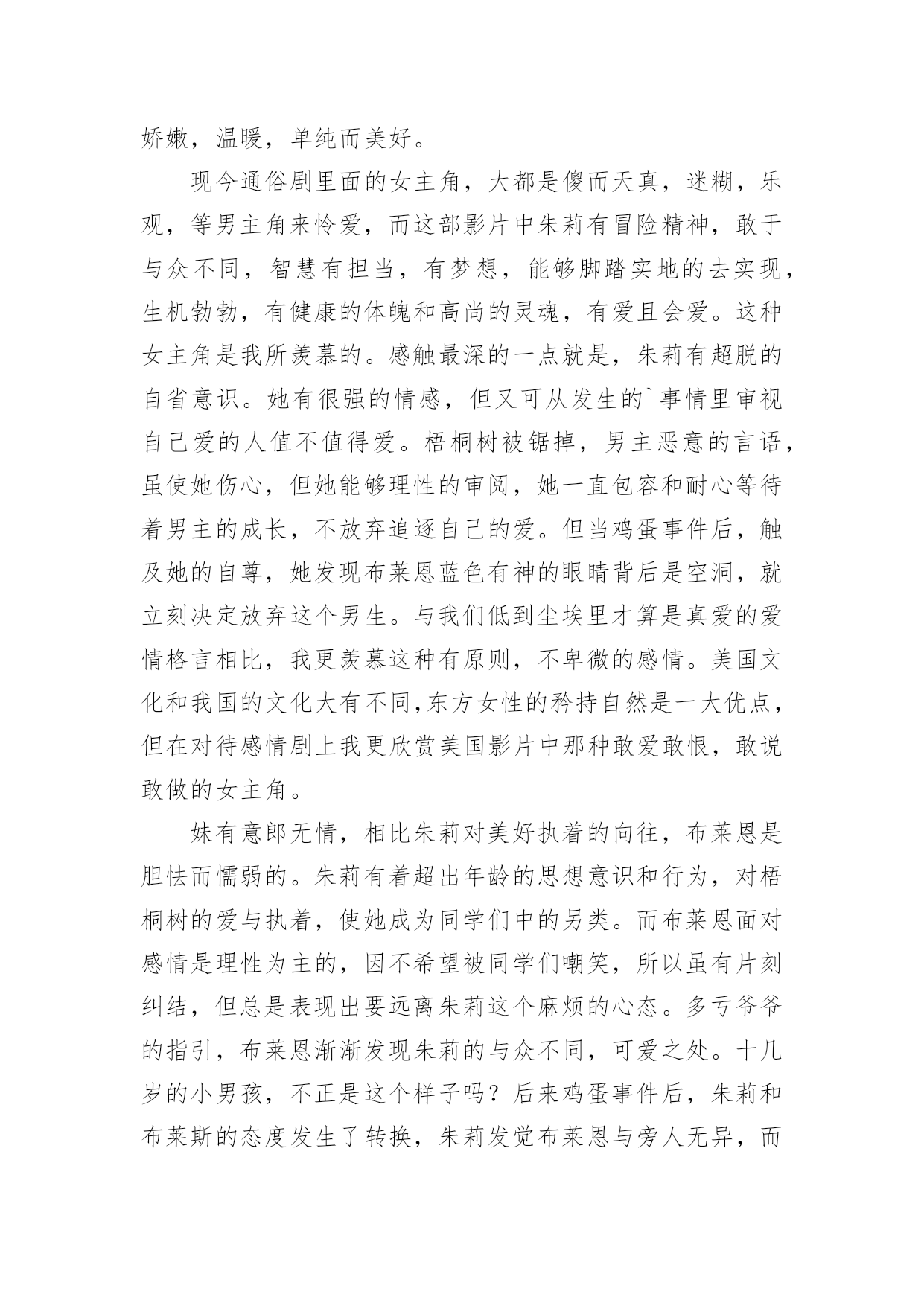 《怦然心动》观后感《怦然心动》观后感[荐]看完某一作品后,一定对生活有了新的感悟和看法吧,是时候静下心来好好写写观后感了。到底应如何写观后感呢?下面是小编精心整理的《怦然心动》观后感,希望能够帮助到大家。《怦然心动》观后感篇1刚刚阅读完一本书,名字叫《怦然心动》,这本书也被拍成了同名电影。纯真年代的单纯小美好,真的让人觉得世界真的很美好。很喜欢朱莉,是个很勇敢很能干很善良很单纯的小女孩。小孩子的世界,对金钱没什么概念,当她发现她的家是租回来的时候,除了惊讶之外,她还做出了个惊人的举动,动手把自己的院子的大整改。然而她的父亲告诉她,当时是房东承诺好要打理好院子的,可是这么多年房东却没有信守诺言,她的父亲认为房子是租回来的,院子的打理不在他们的义务范围之内。但是朱莉坚信,房子是租回来的,但是生活不是。是啊,在她心目中,这个房子早已经是她的家了,虽然现在才知道是租回来的。但是她并没有因此而抱怨,拿起工具就开始动手了。有一天她发现她的家里经济那么拮据是因为他的父亲为了照顾好她的叔叔而造成的,她也没有埋怨,甚至在学校听到了她一直偷偷喜欢着的布莱斯跟别人拿她的叔叔开玩笑而开始讨厌布莱斯,把之前的好感一点一点磨灭掉。在她的心目中,她的叔叔是全家人都爱的,她也是爱他的,因为他也是她家的一份子,不容别人去拿他取乐。她的叔叔由于出生的时候脐带绕颈,上一分钟还是个非常健康的宝宝,下一分钟就因为窒息而导致脑缺氧,最后智力有了问题。其实,这个情况换在大多数来做,很多可能都放弃了,因为这样确实是个负担,同时也会拉低了生活质量,而且照顾他这件事情不是一两天就结束,也不是三四天,而是一辈子。我觉得朱莉的父母真的是很让人肃然起敬的。尤其是朱莉的母亲,如果在这件事情上她没有支持和理解她的丈夫的话,那么他们家也没有办法因为经济的问题还可以相处得那么和谐,那么融洽。朱莉跟父亲一起去探望叔叔的时候,他的叔叔远远看到父亲来还很高兴地打招呼,虽然他很多东西都不懂,但是至少他懂得那是爱他的家人。后来因为一个雪糕掉地上了,她亲眼目睹了一个200多斤的壮叔叔居然像个小孩一样在地上打滚,但是父亲没有因此责怪他,反而想办法让他冷静下来,最后让朱莉去买雪糕,又拿出来个很贵的拼图礼物给他玩,这才让他的情绪稳定下来。布莱斯的外公,因为看到朱莉爬无花果树上被登了报纸而关注起她来,没想到最后两个人没有因为年龄差距的影响,却成为了好朋友。在帮她一起整理她家的院子的时候,无意中得知了她叔叔的事,想起了布莱斯刚出生那会也经历过这样的事情,幸运的是,医生争取了时间,他没有变成像朱莉叔叔一样的人。也是啊,布莱斯的父亲,怎么会因为这样的事会放弃自己优越的生活质量呢,如果这个事情真的`不幸发生在布莱斯身上了,那么后果他的情况可能会很糟糕。偶然得知这个事情之后,布莱斯的外公跟喜欢这一家人了,虽然他们的经济可能没有那么好,但是他们家有爱。爱大于金钱。布莱斯,是个需要成长的男孩。他一直知道朱莉喜欢他,关注他,追随他,这么多来年他习惯着这一切,其实她在喜欢他的同时,他也喜欢她的这件事在慢慢萌发,直到学校举行一次篮子孩子的活动,朱莉花钱跟另外一个男同学共度午餐的时候爆发了。他看到在旁的朱莉跟另外的男同学共度午餐说说笑笑很开心,就冲动走过去了,他的那桌的两个女生因为他而在大打出手。他走过去的时候想要亲吻朱莉,但是这不是朱莉一直都在等的初吻吗?她不是一直喜欢他吗?她居然拒绝了这个吻!是啊,没错,她一直喜欢有一天可以等到这个初吻,但是不是在这样的场合这样的情境,她的脑海中无数次上演着他们初吻的情景,但是不是现在,也不应该是今天这样的。所以她拒绝了。书本的结局是以布莱斯为朱莉在她家院子里种一颗无花果树结尾,但是还是欠了一个他们的初吻,我希望他们以后会一起坐在这颗无花果树上面,夕阳西下,然后亲吻......《怦然心动》观后感篇2看过的电影虽不甚多,但《怦然心动》,是迄今为止唯一一部让我百看不厌的影片。具体也说不上哪里吸引着我,但每每看完一遍,便会触及内心深处!影片是由罗伯·莱纳执导,主要讲的是一个初恋的故事,一开始女主朱莉对男主布莱恩一见倾心,怦然心动,之后以自己的方式默默地散发着爱意的光芒。而布莱恩起初对朱莉是害怕和厌恶的,而后渐渐的被她的光芒所吸引,最后也发现了自己内心深处对朱莉的感情,正如初恋般小心翼翼,又甜蜜悠长。有人拿《怦然心动》与中国的《山楂树之恋》做对比,两者有异曲同工之妙,但我觉得怦然心动更甚一筹,影片虽故事简单但内涵丰富,主讲两小无猜的初恋,但也讲了追求自己的梦想,尊重,勤劳,怎么看待贫穷,怎么接纳残障的家人,怎么维护自己的自尊等。在这个随口说爱的时代,爱情片更是层出不穷。爱情的美好在于其青涩、美好、懵懂。而银幕上至死不渝的爱情,大多剧本情节都是极其浮夸且不切实际的,像是温室里的花朵,是避开现实风雨的人